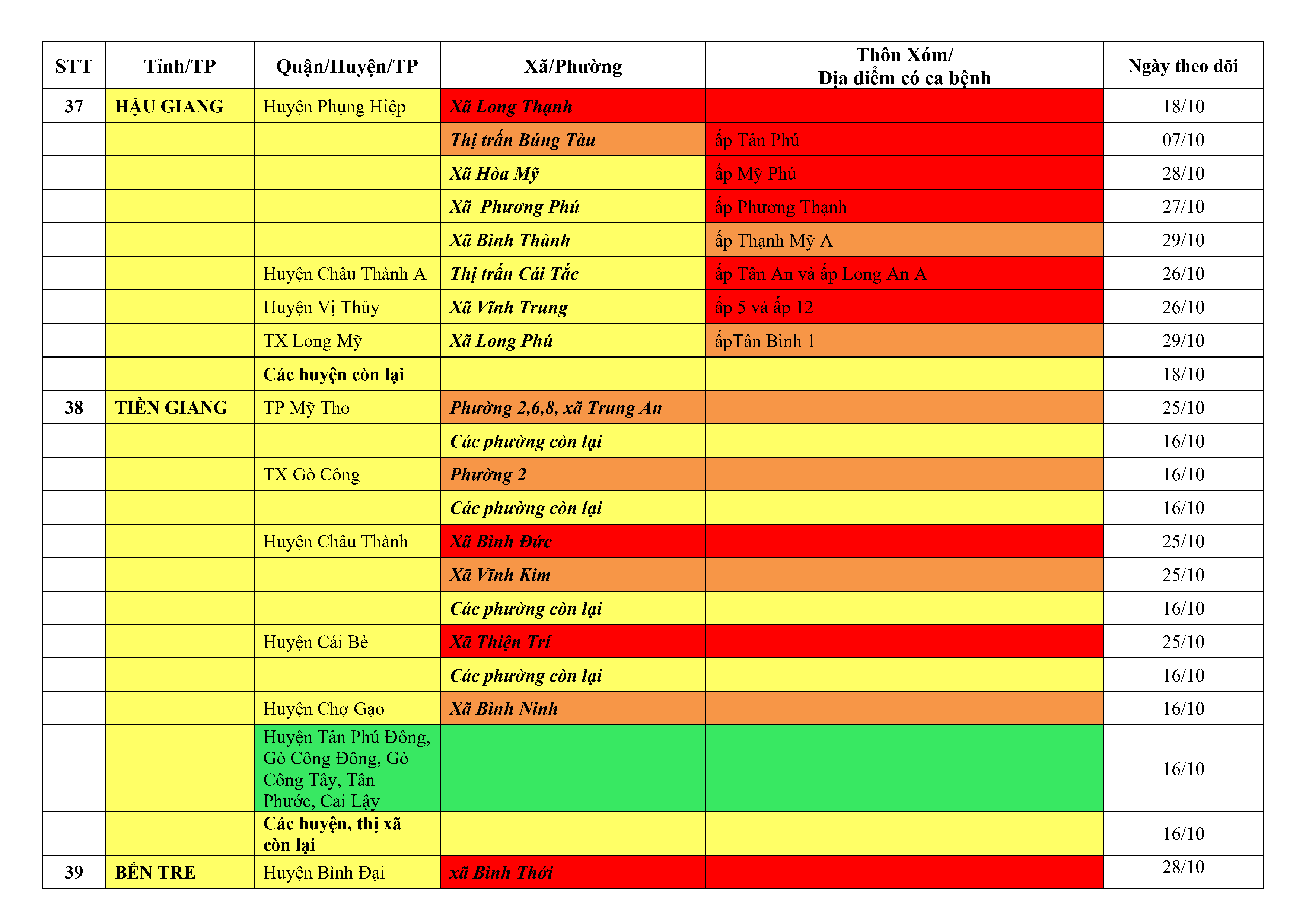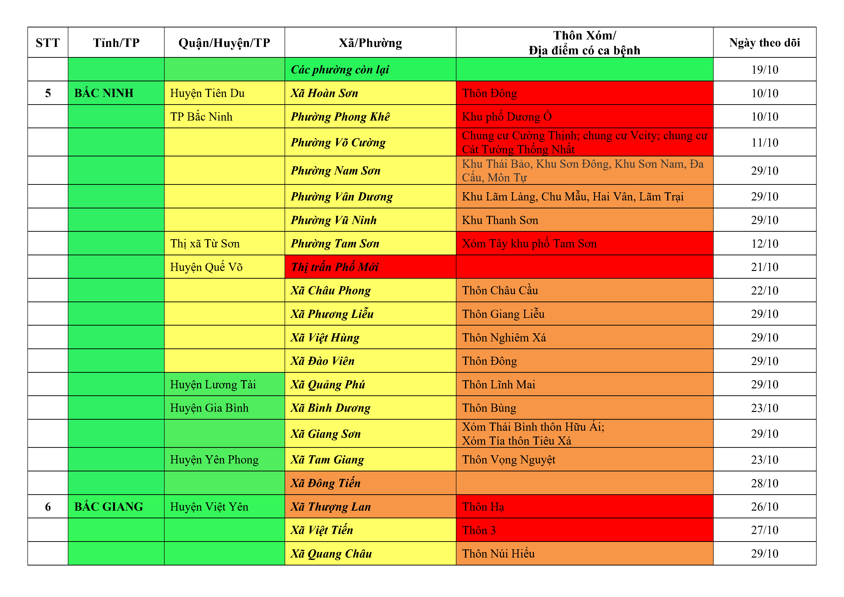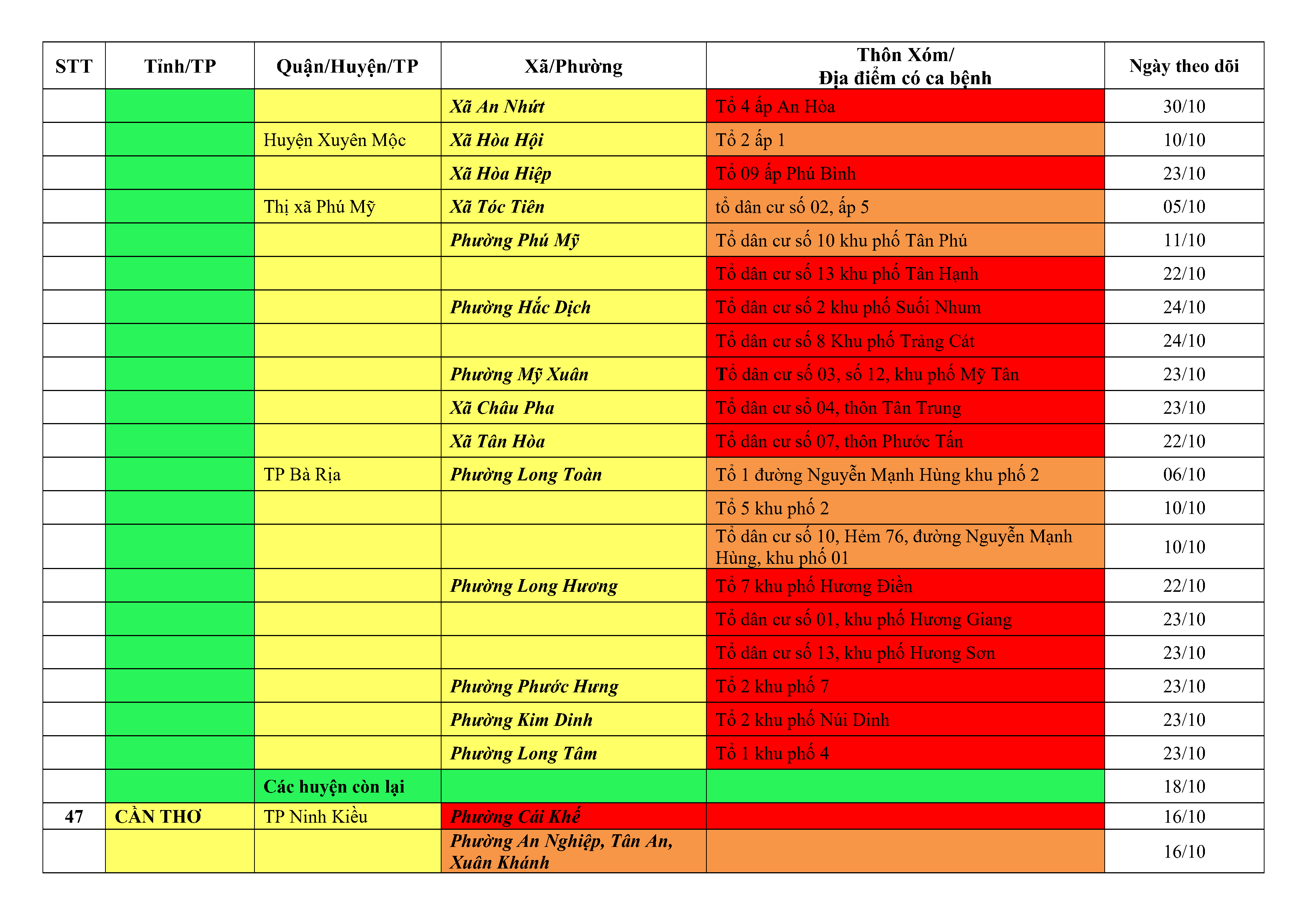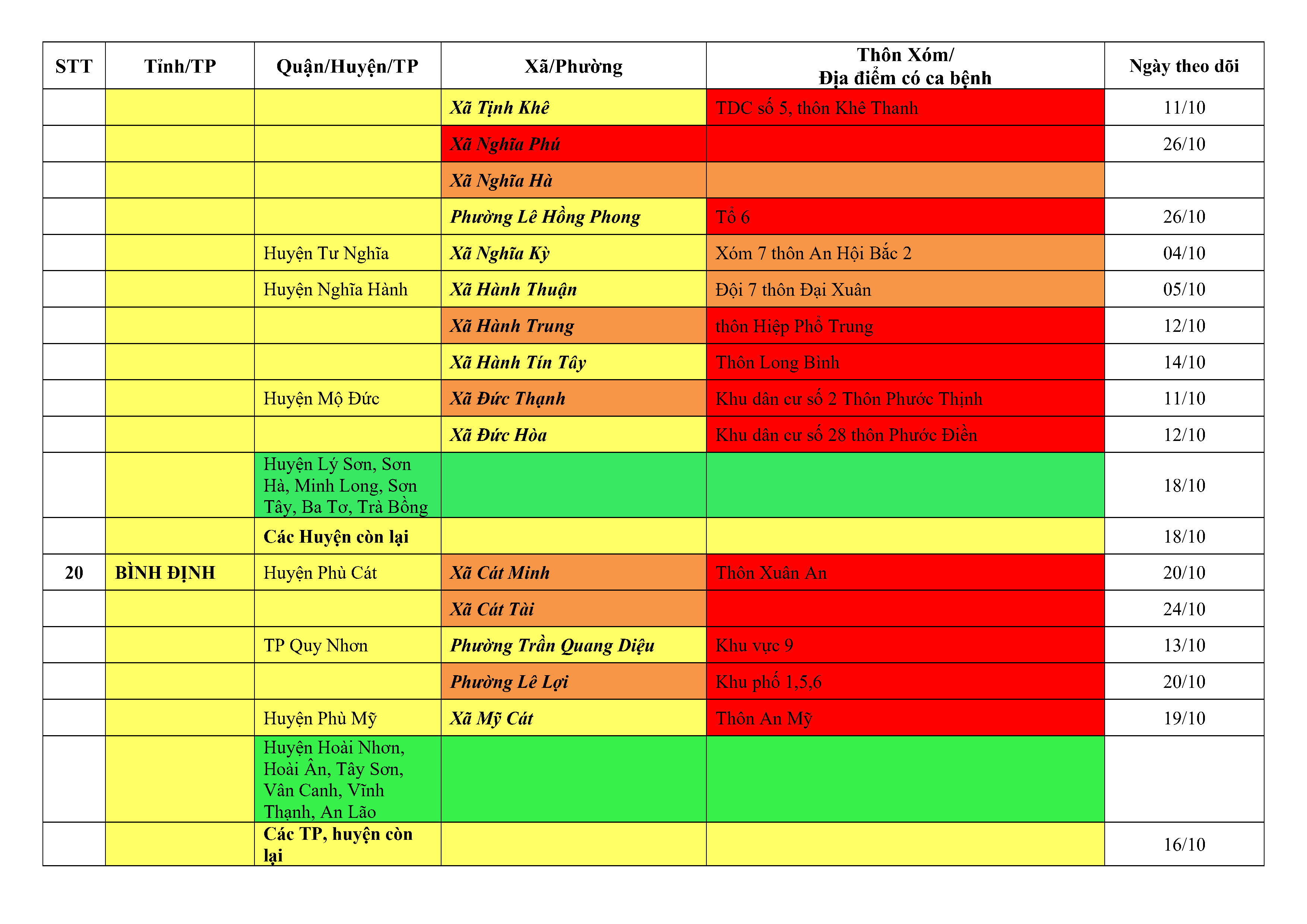 Áp dụng biện pháp tương ứng màu sắc ô cột theo thôn xóm; xã phường; quận huyện; tỉnh thành phố. Cách ly y tế dựa vào việc tiếp xúc, đi đến địa điểm và nơi cư trú có ca bệnh, theo Thông báo của Bộ Y tế, các tỉnh thành phố.