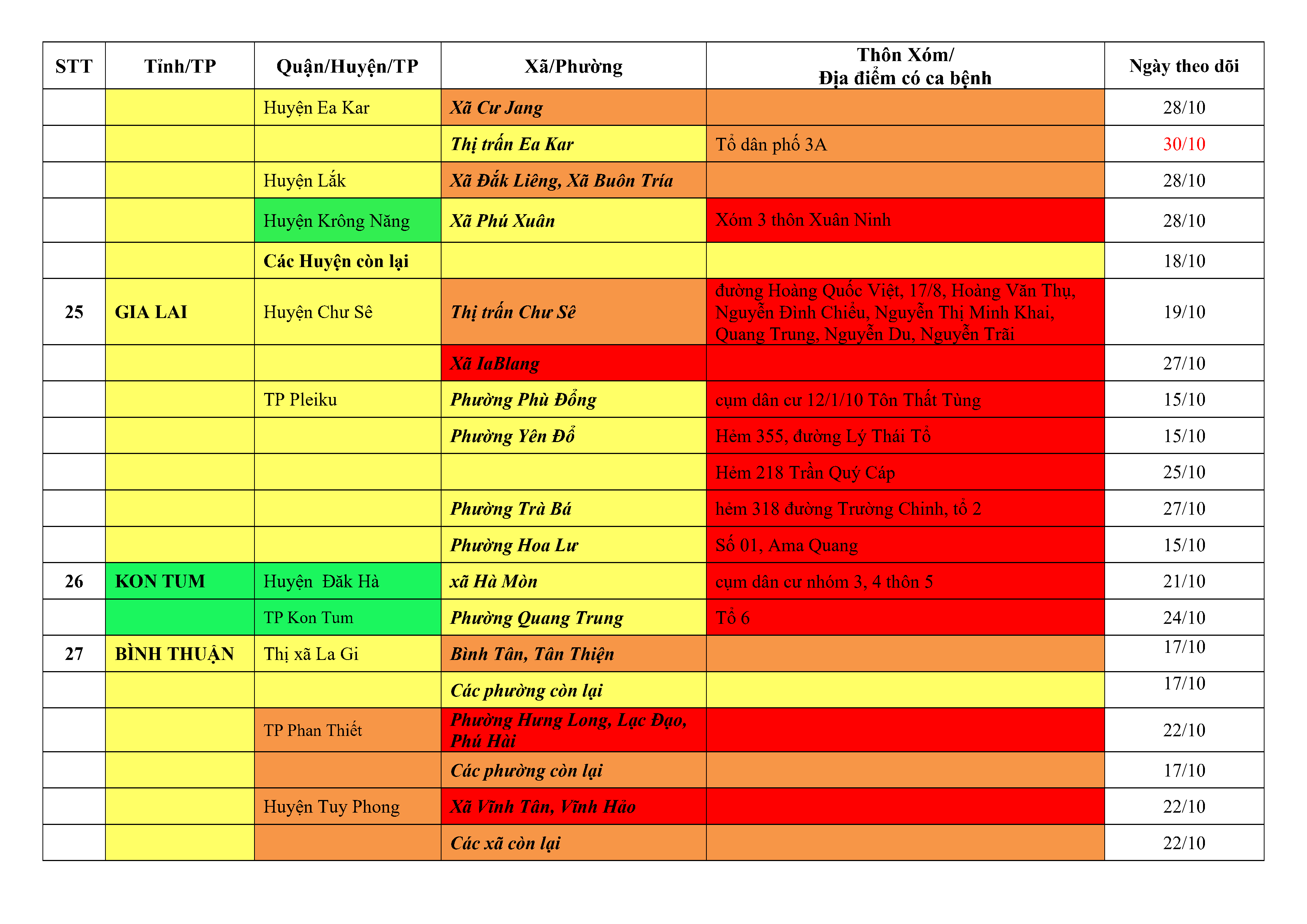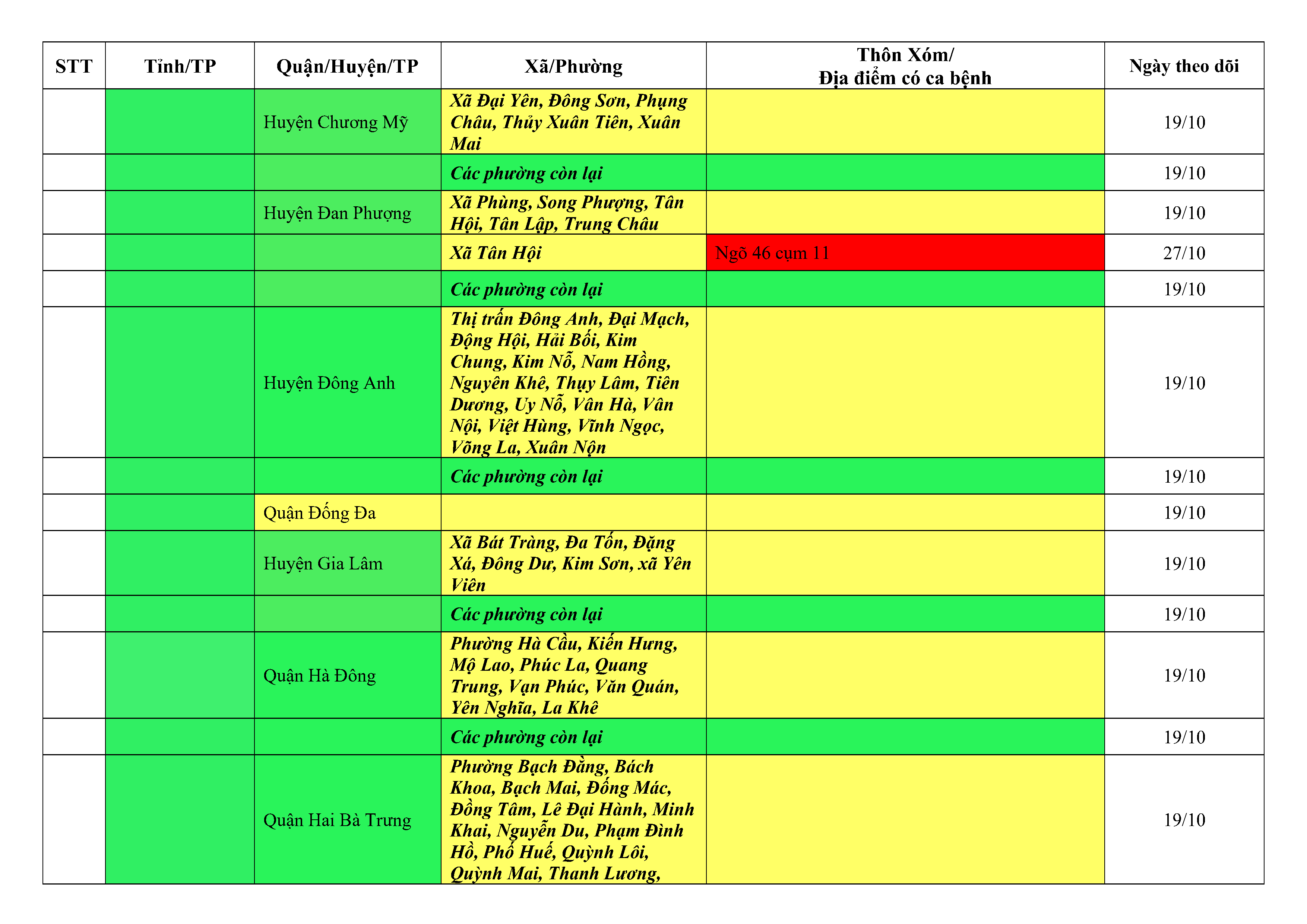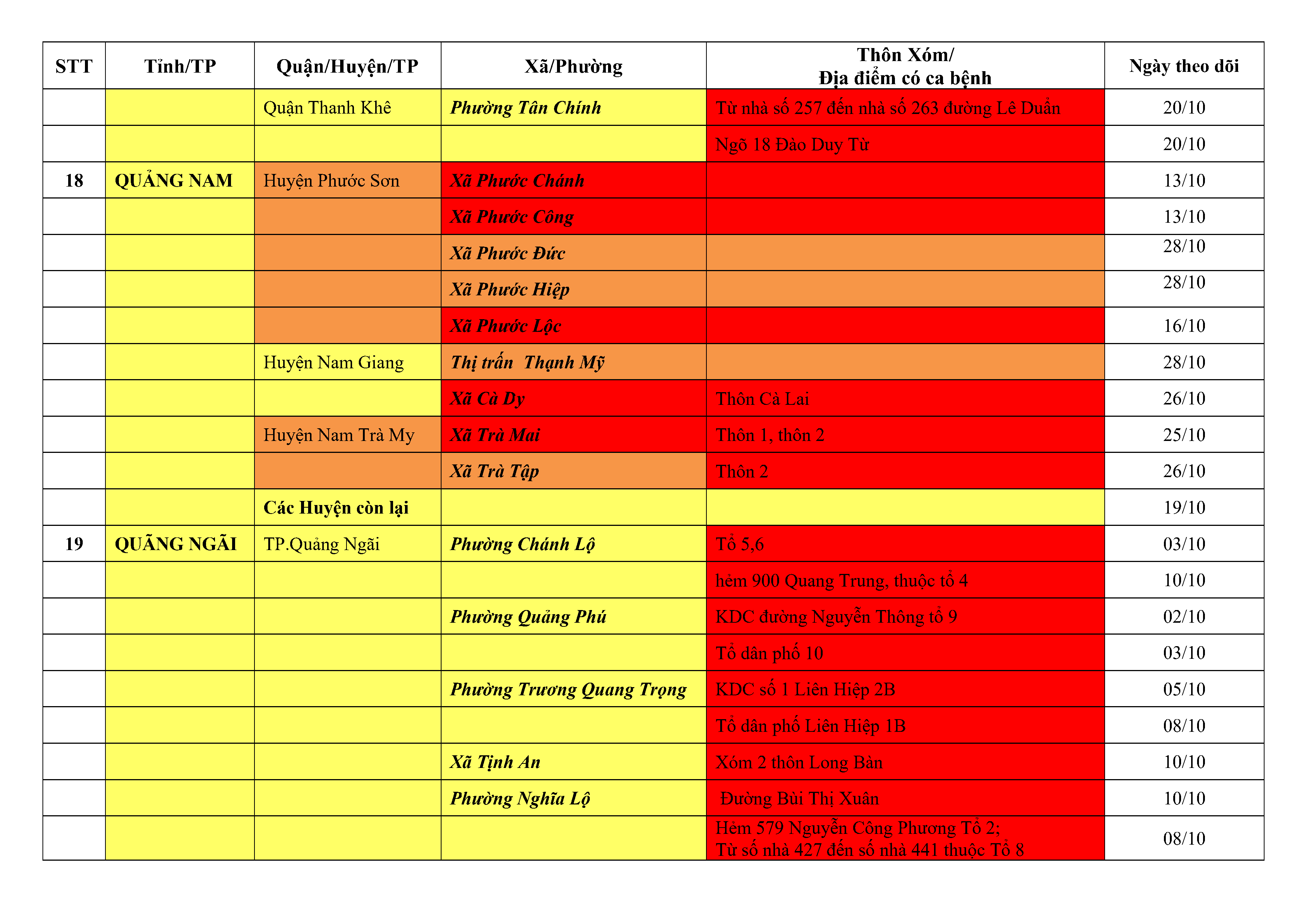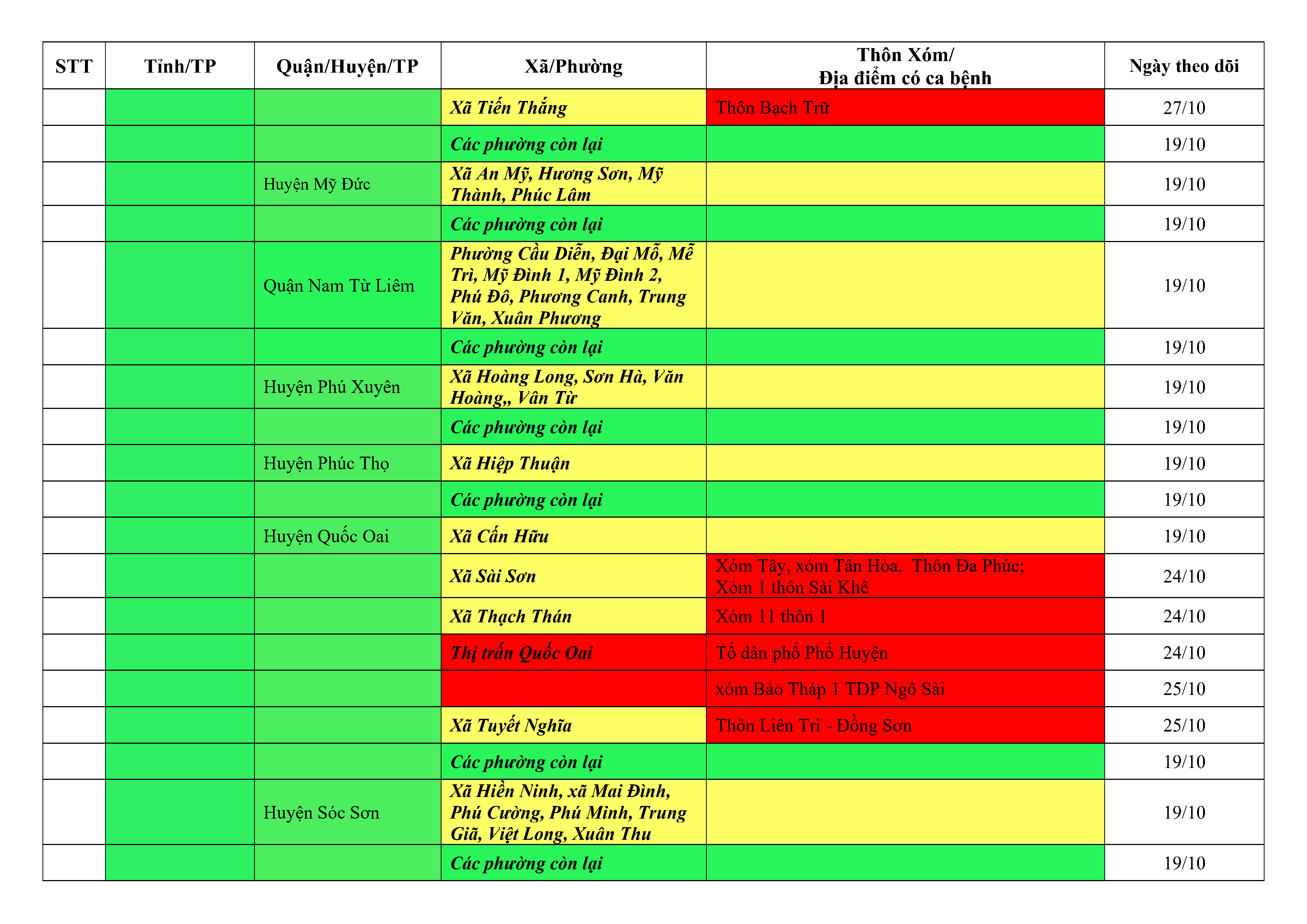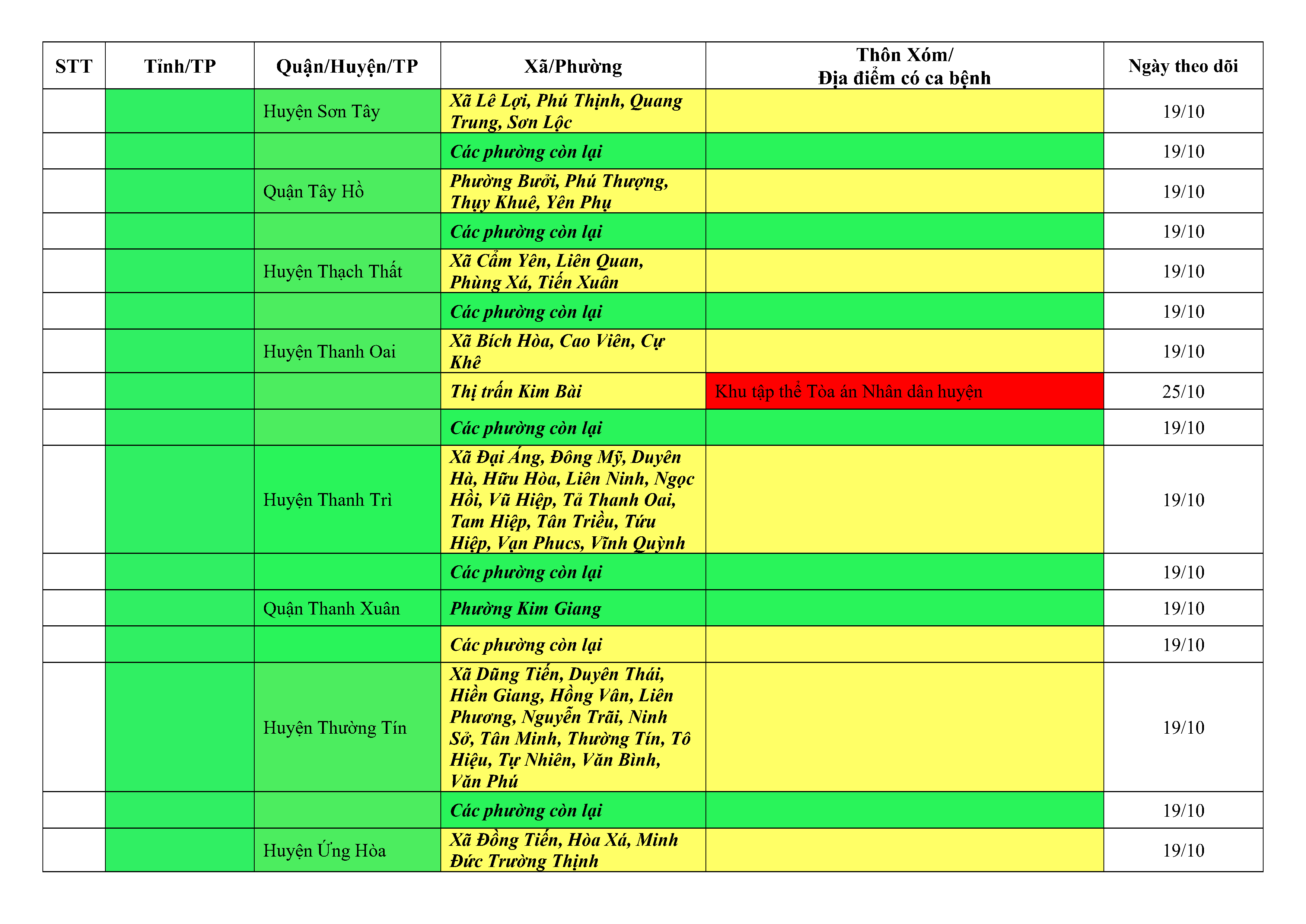 Áp dụng biện pháp tương ứng màu sắc ô cột theo thôn xóm; xã phường; quận huyện; tỉnh thành phố. Cách ly y tế dựa vào việc tiếp xúc, đi đến địa điểm và nơi cư trú có ca bệnh, theo Thông báo của Bộ Y tế, các tỉnh thành phố.