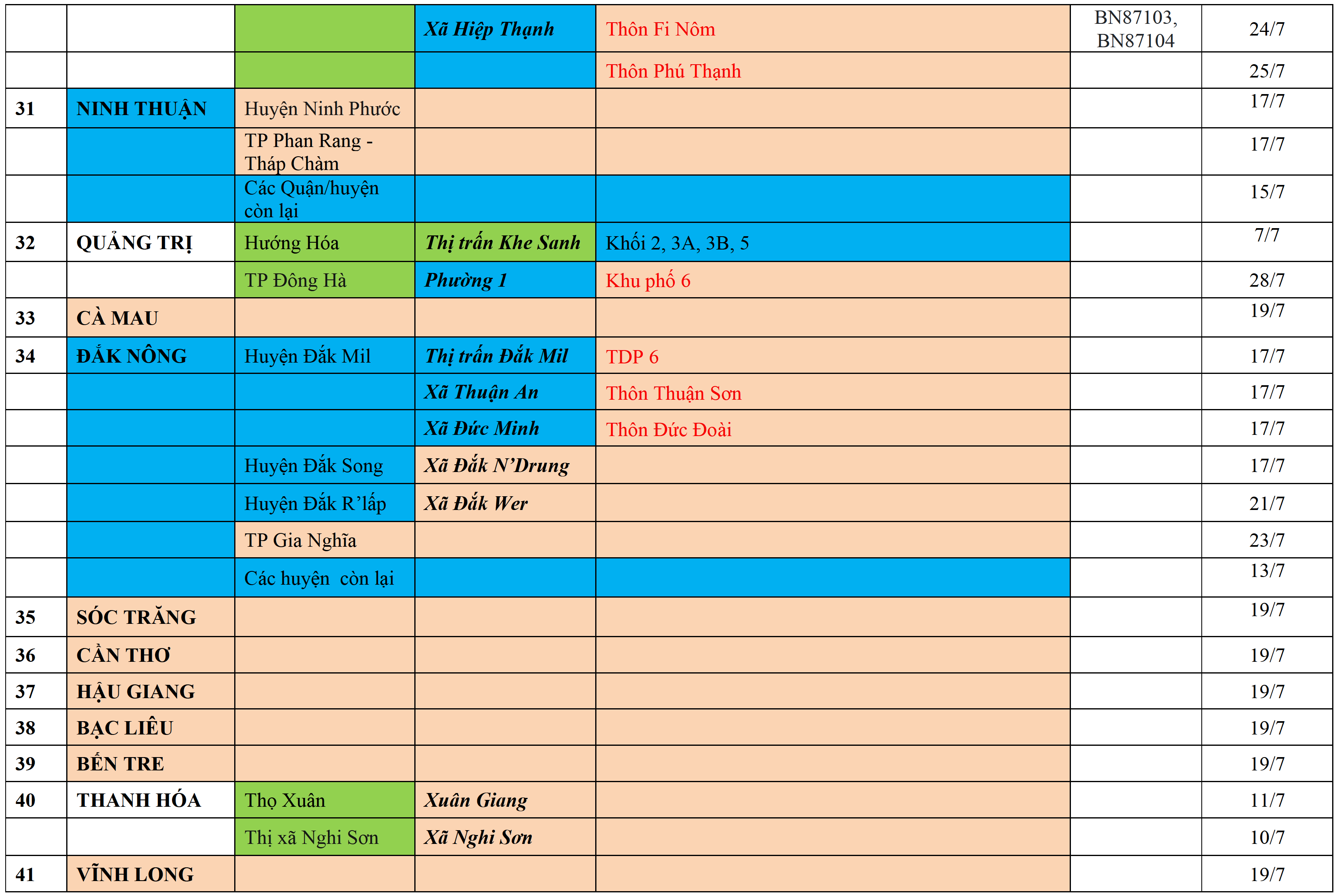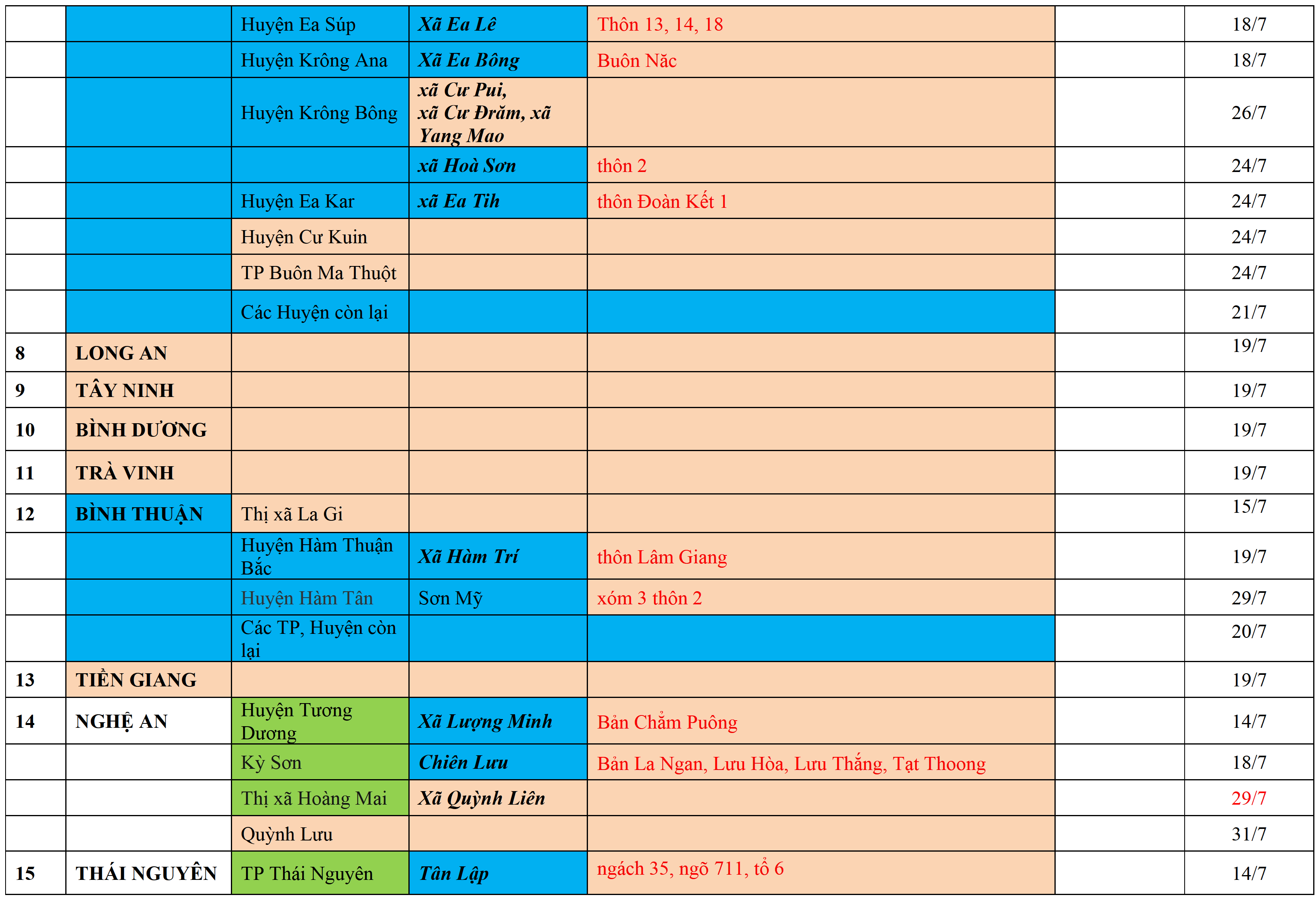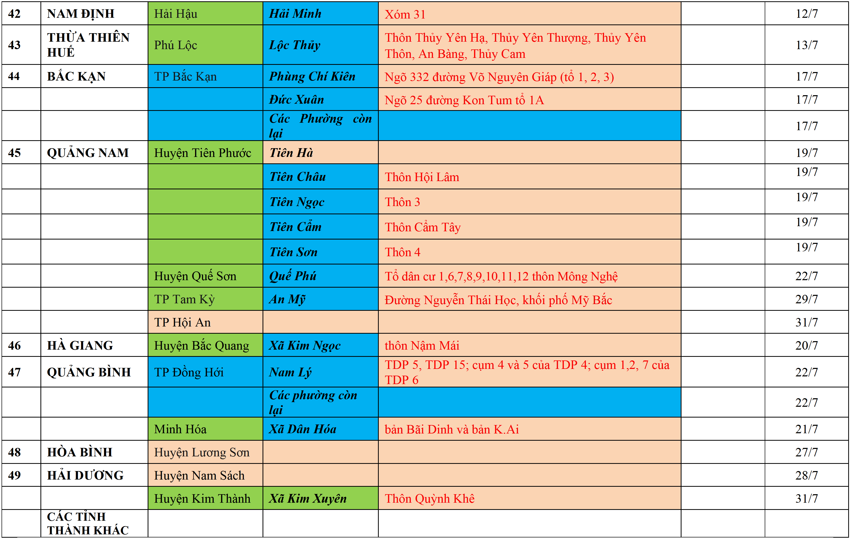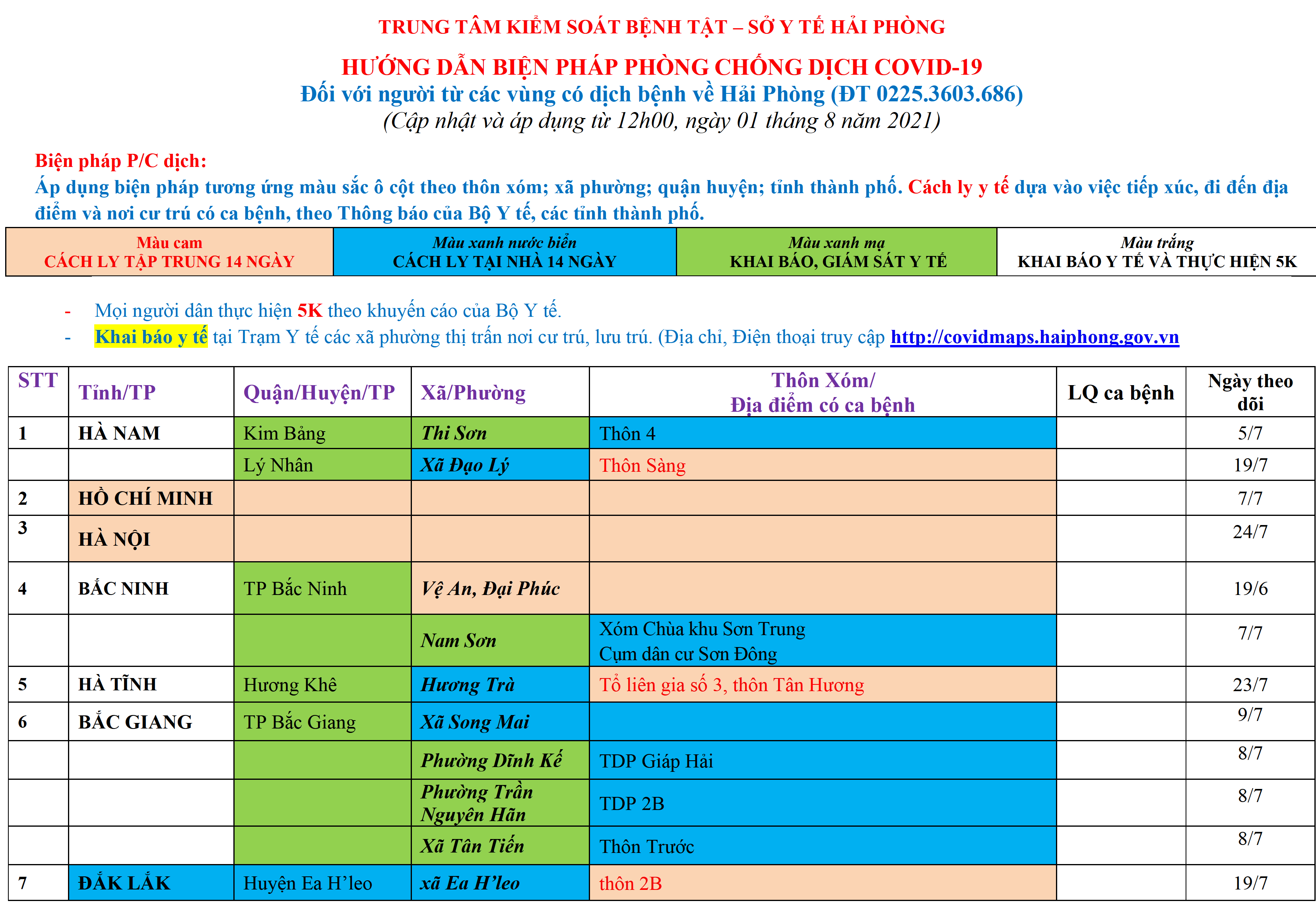 Màu cam: CÁCH LY TẬP TRUNG; Màu xanh nước biển: CÁCH LY TẠI NHÀ 14 NGÀY; Màu xanh mạ: KHAI BÁO, GIÁM SÁT Y TẾ; Màu trắng: KHAI BÁO Y TẾ VÀ THỰC HIỆN 5K.