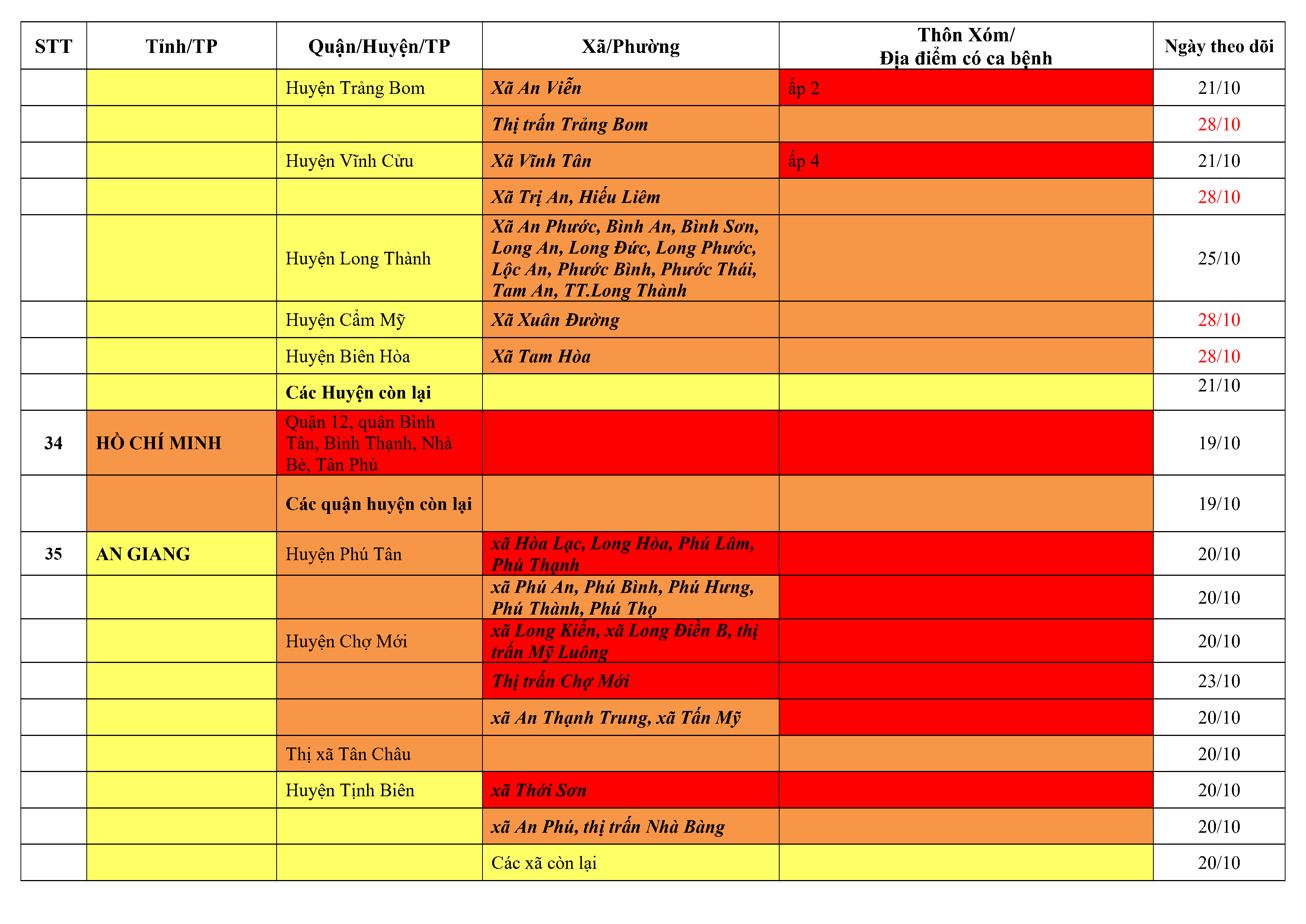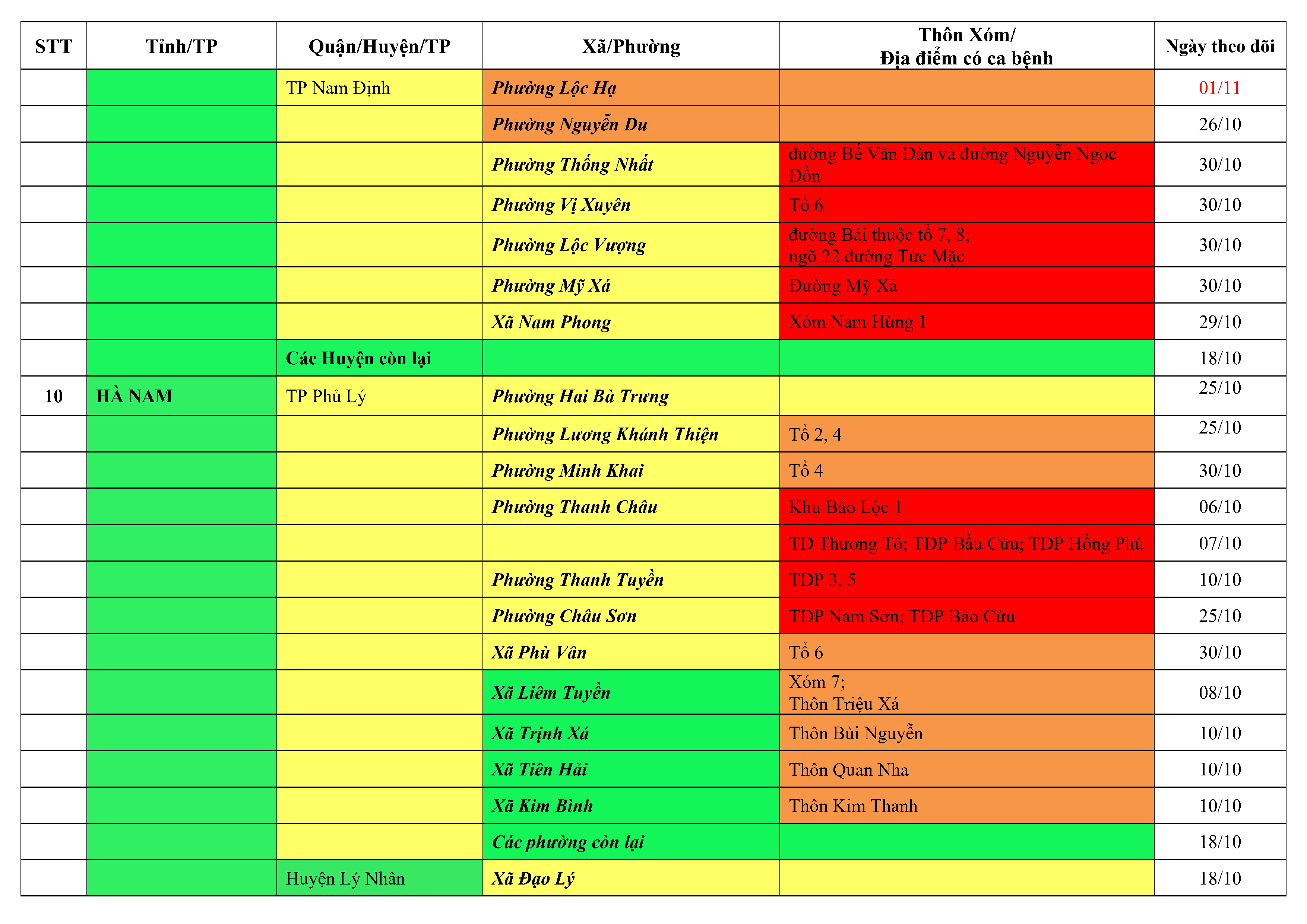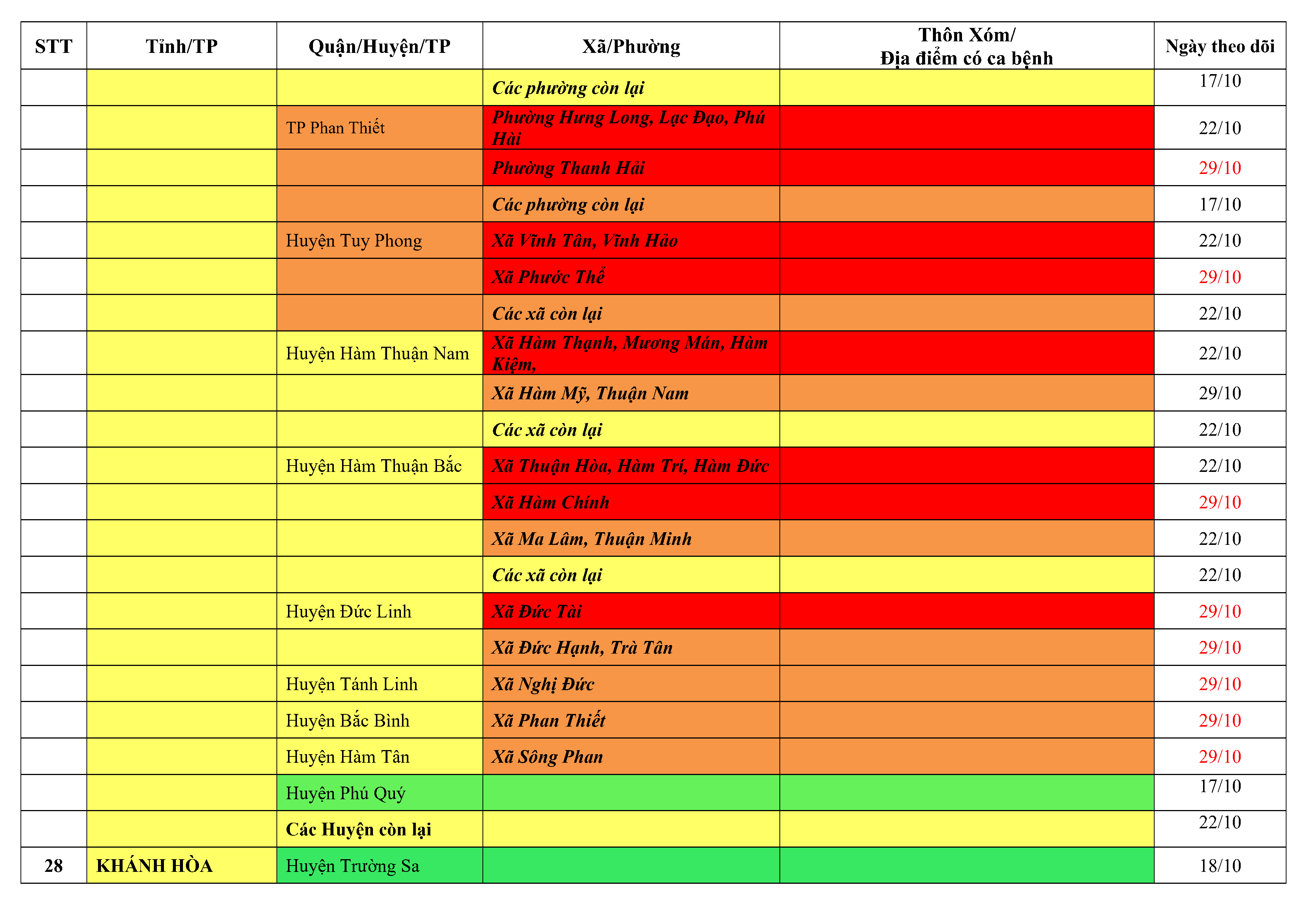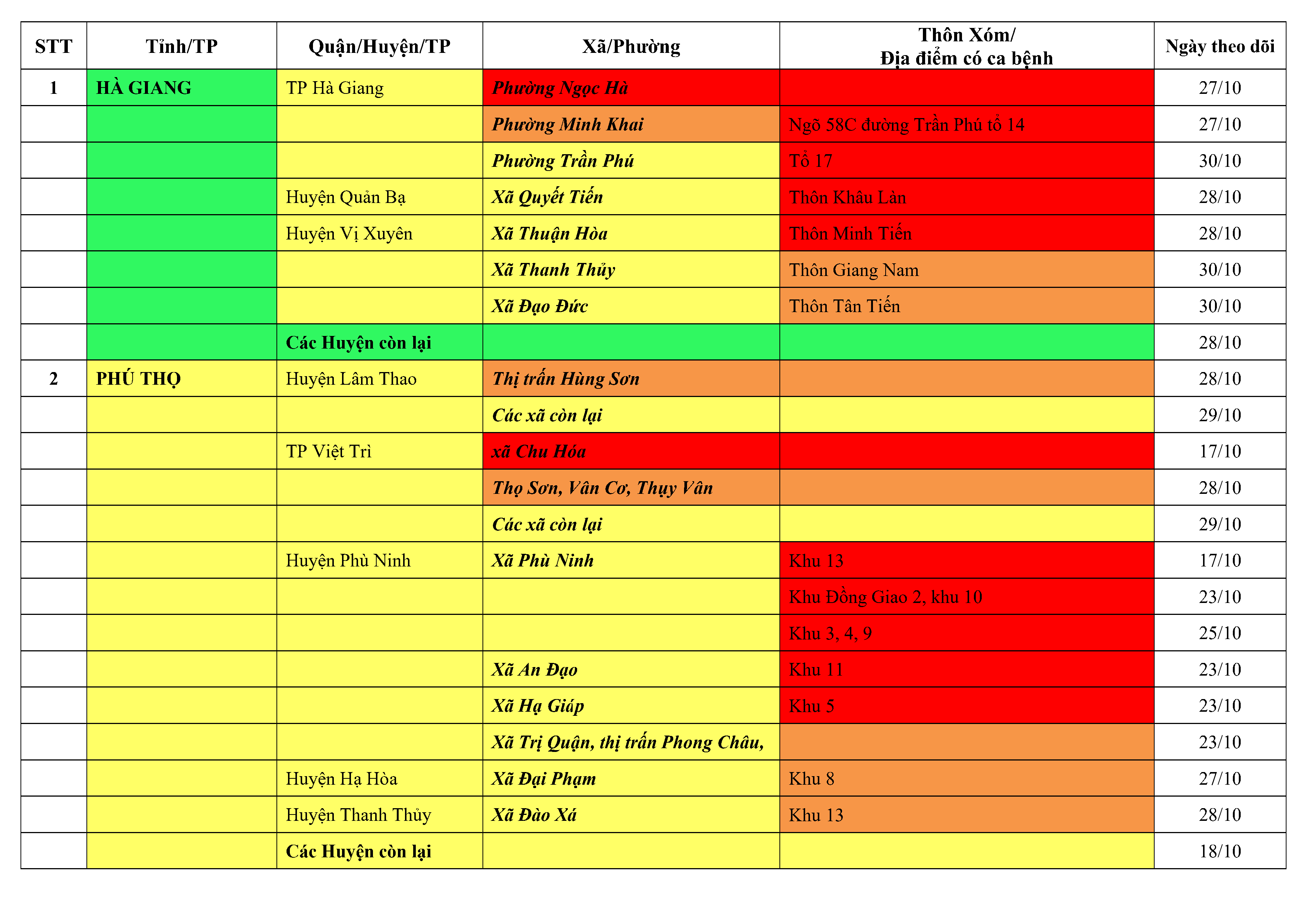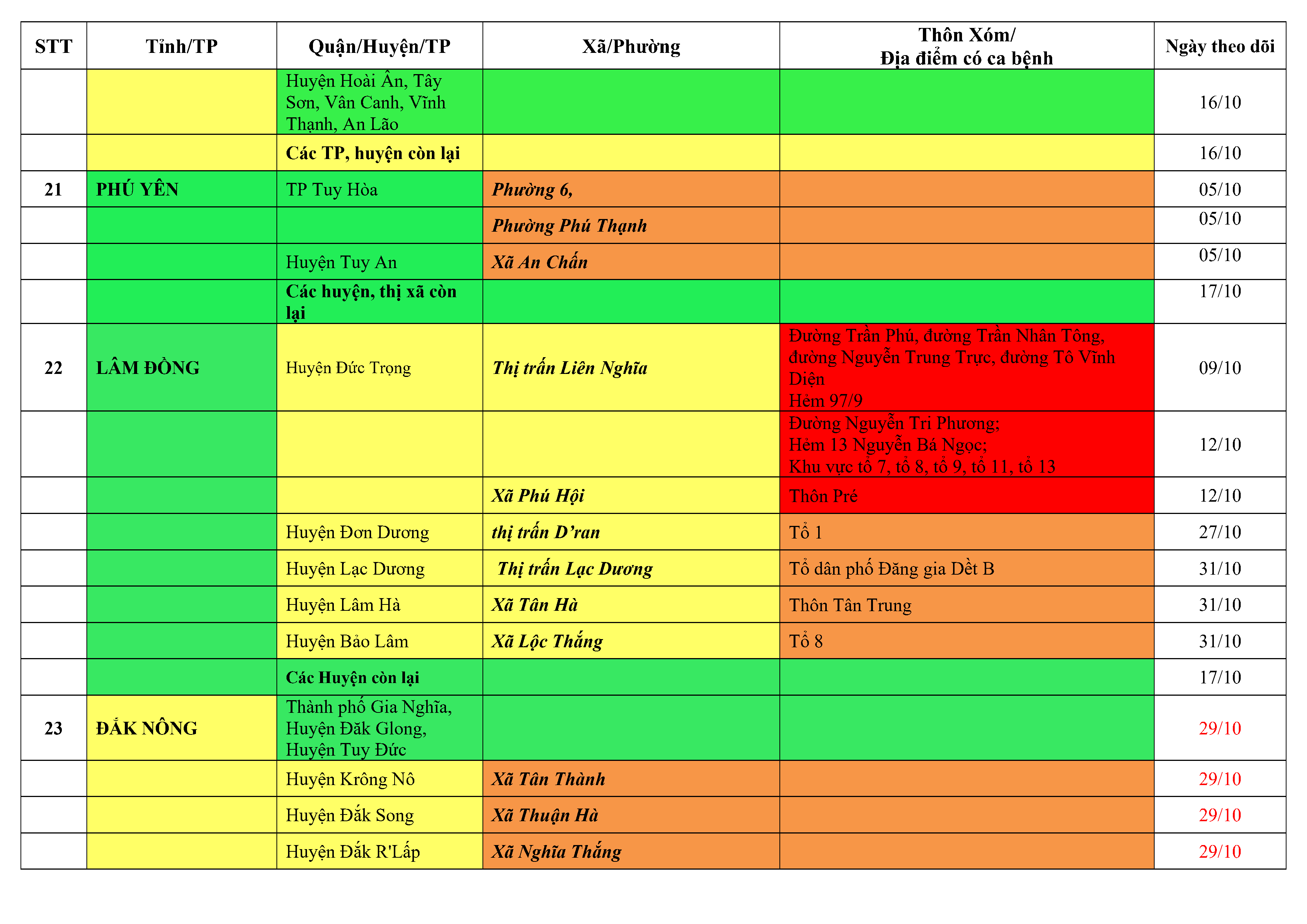 Lưu ý: Các tỉnh, thành phố không có tên trong bảng màu, đi lại bình thường, tuân thủ các biện pháp phòng chống dịch theo chỉ đạo của Bộ Y tế; khai báo y tế, thực hiện nghiêm 5K.