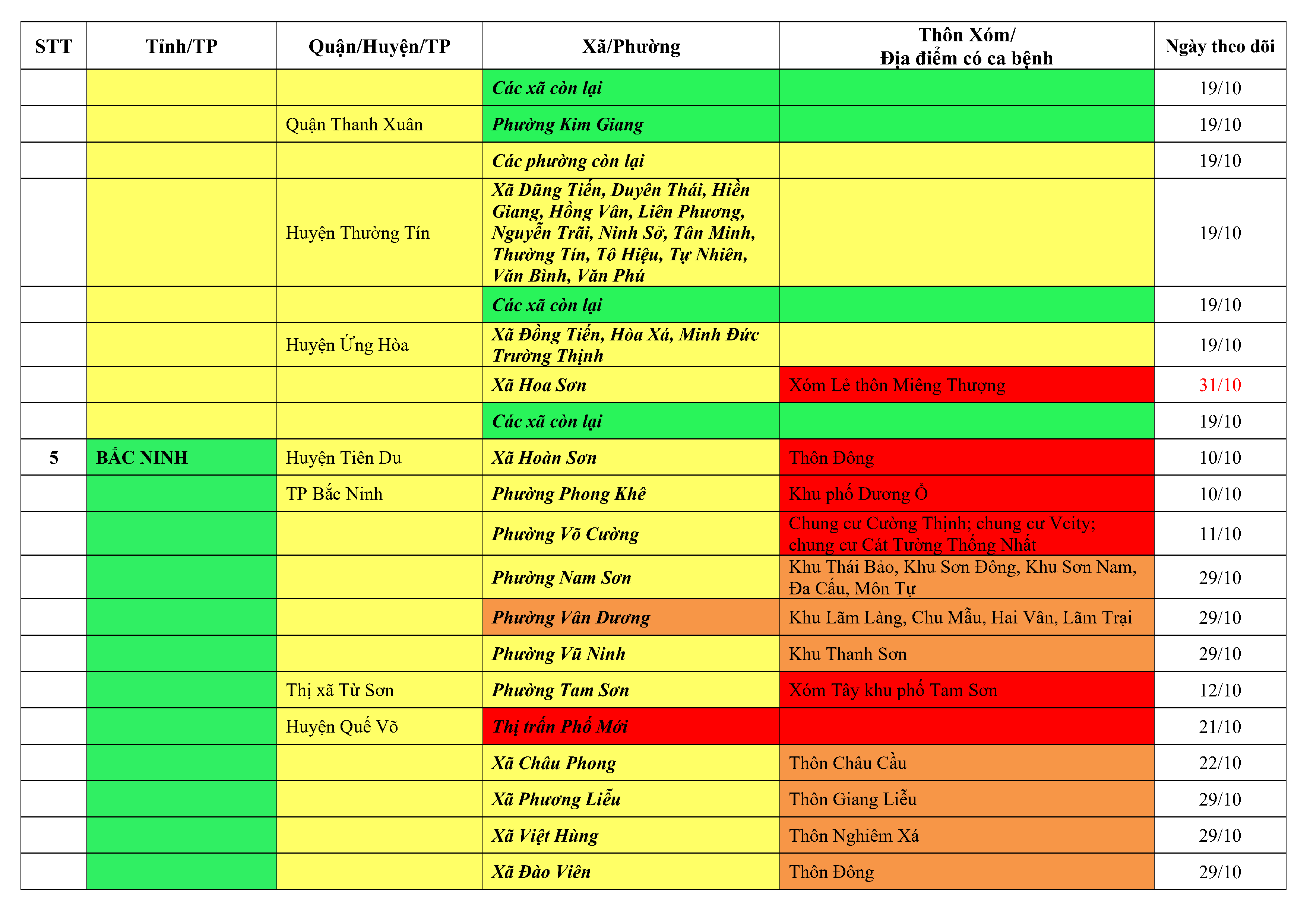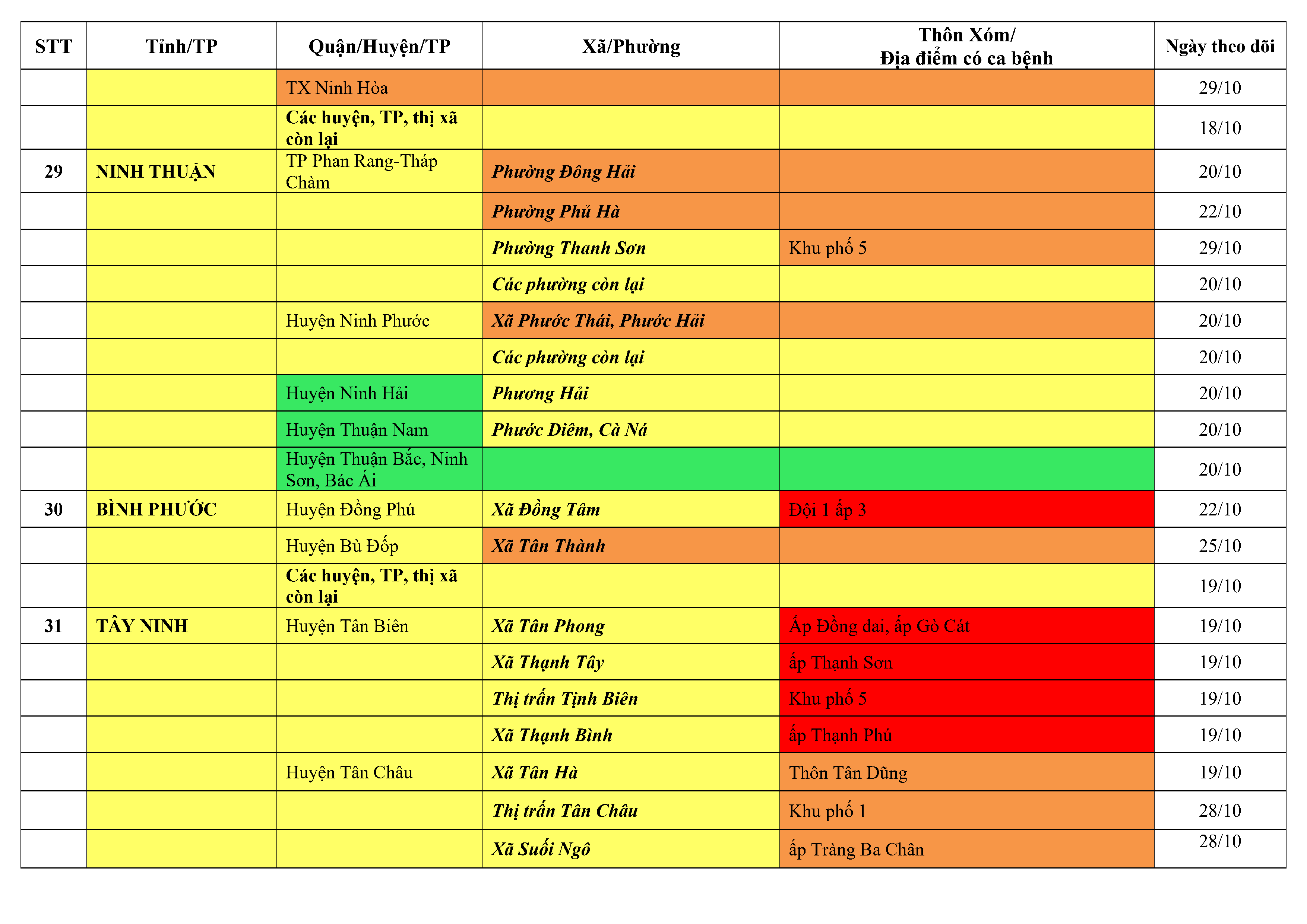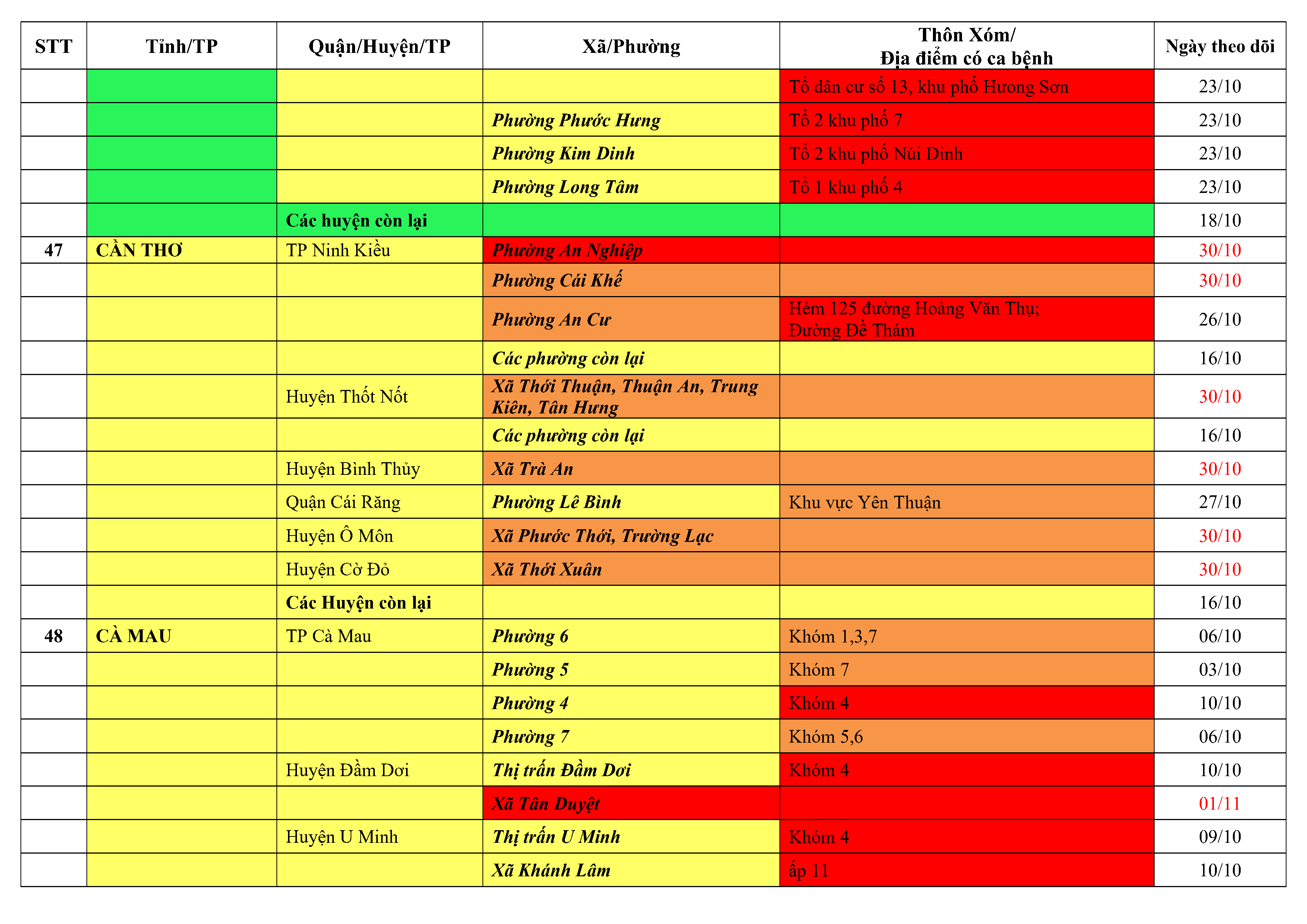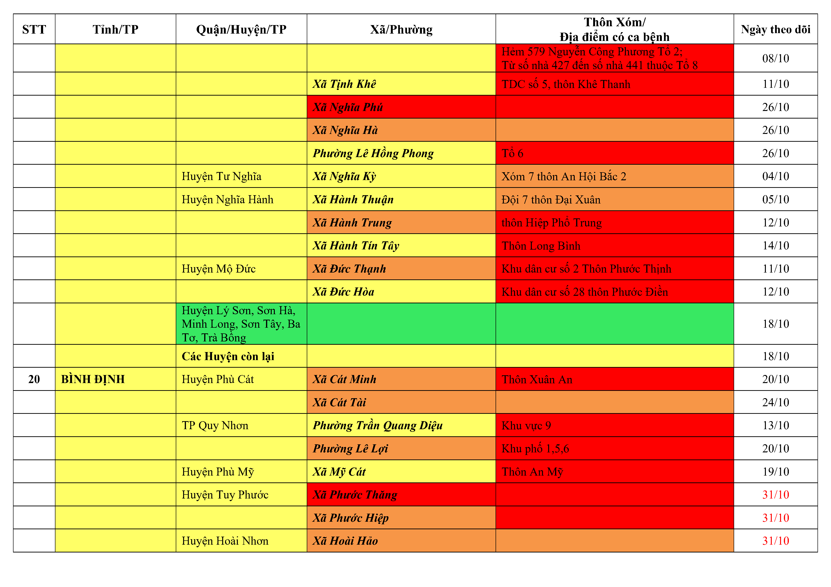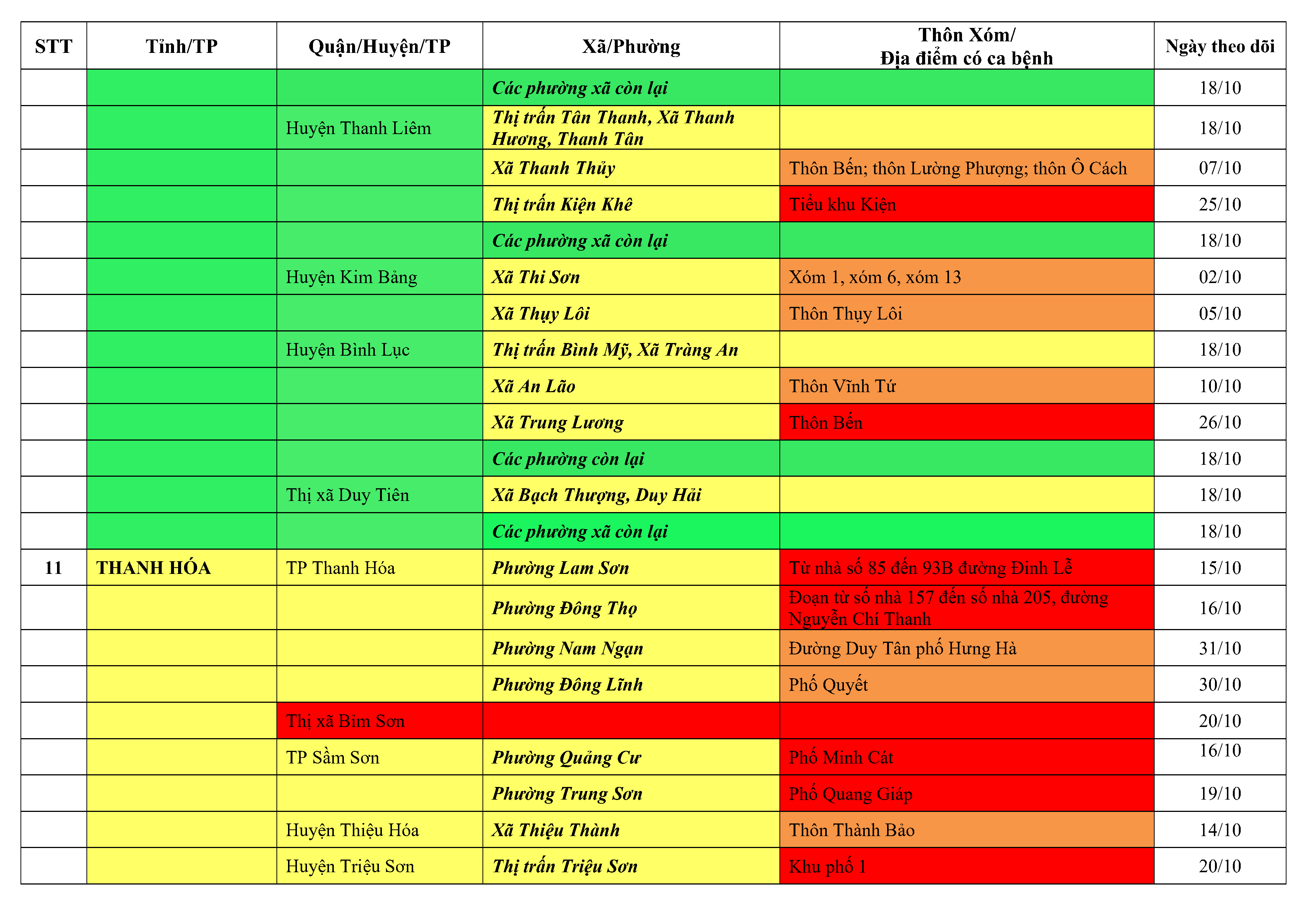 Lưu ý: Các tỉnh, thành phố không có tên trong bảng màu, đi lại bình thường, tuân thủ các biện pháp phòng chống dịch theo chỉ đạo của Bộ Y tế; khai báo y tế, thực hiện nghiêm 5K.