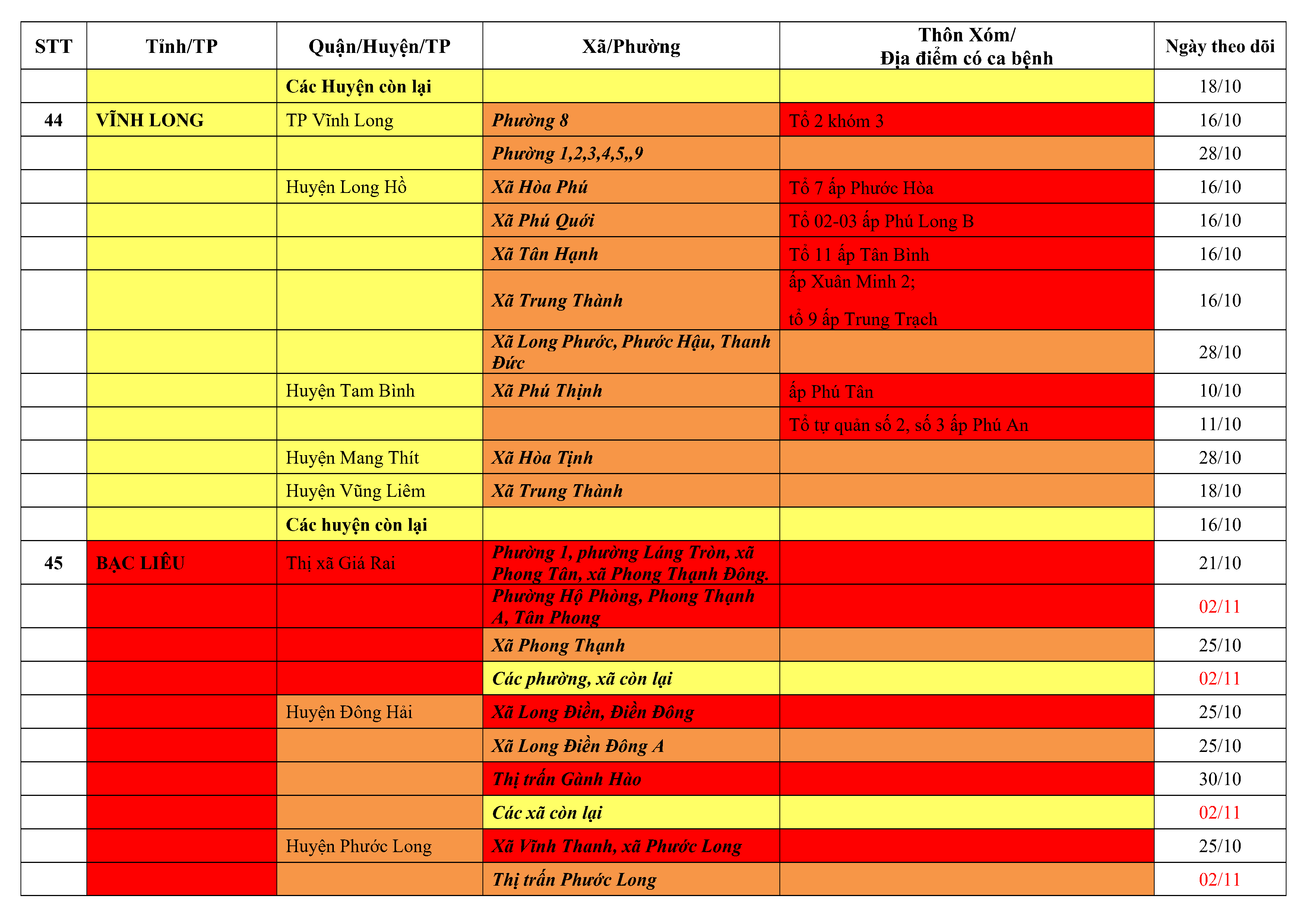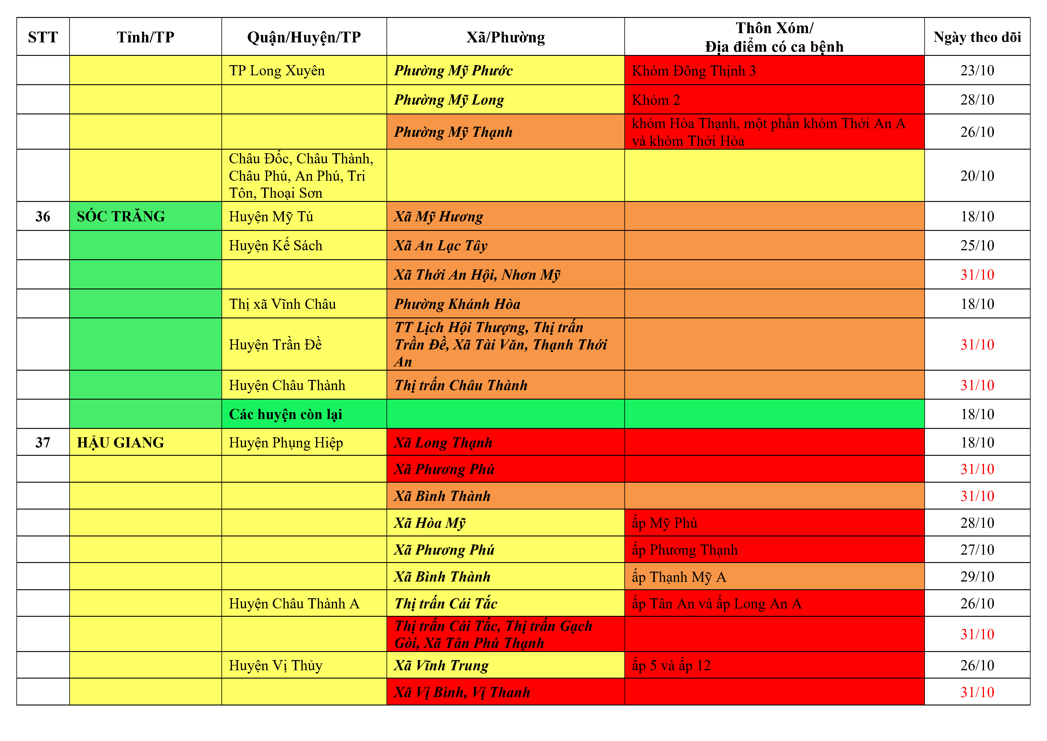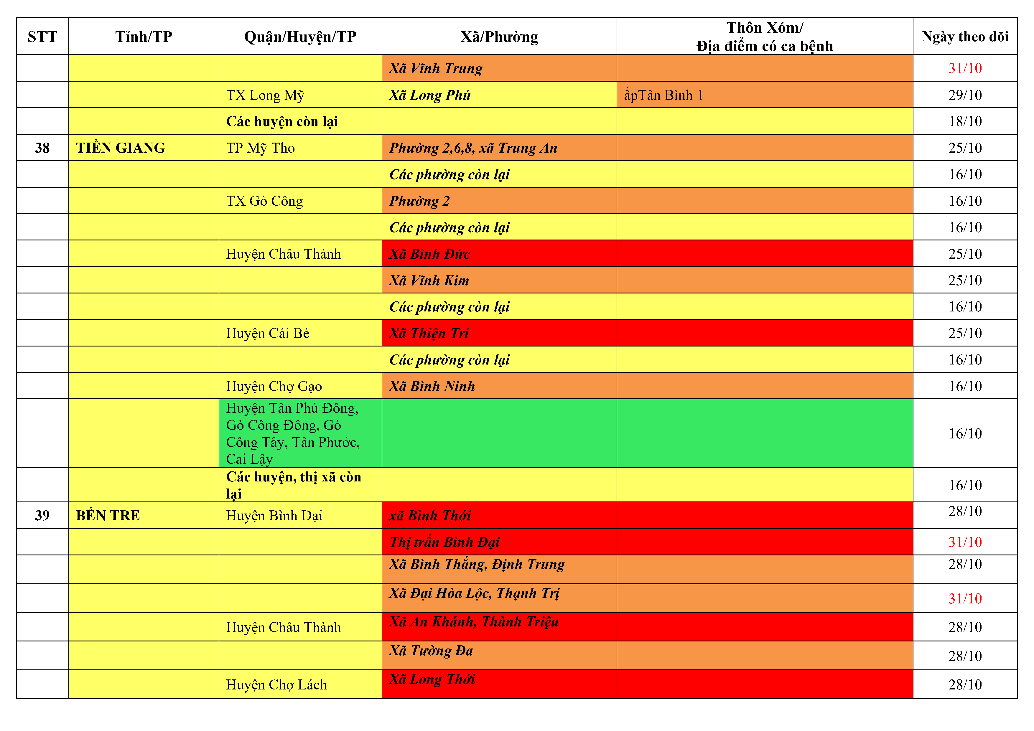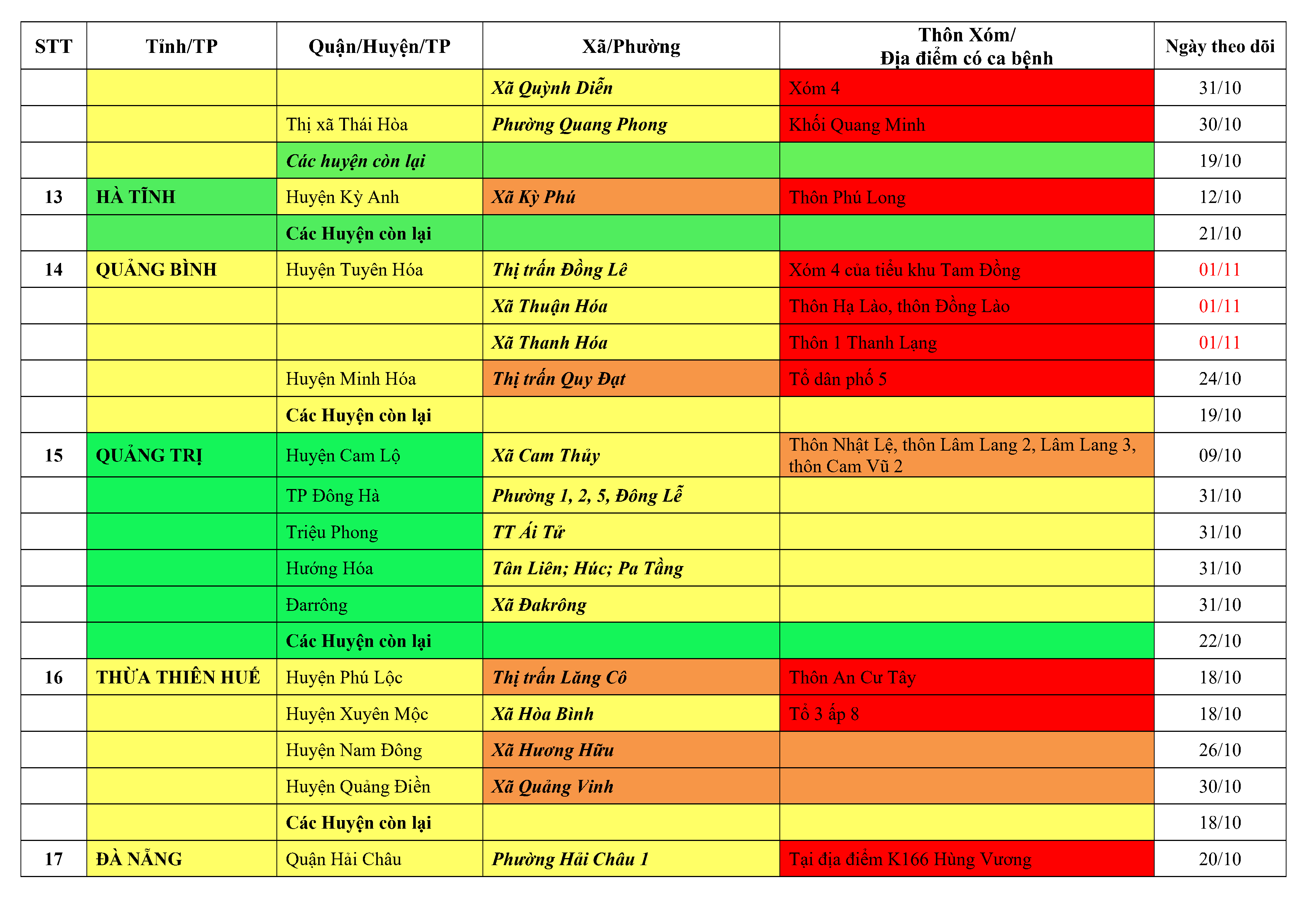Lưu ý: Các tỉnh, thành phố không có tên trong bảng màu, đi lại bình thường, tuân thủ các biện pháp phòng chống dịch theo chỉ đạo của Bộ Y tế; khai báo y tế, thực hiện nghiêm 5K.