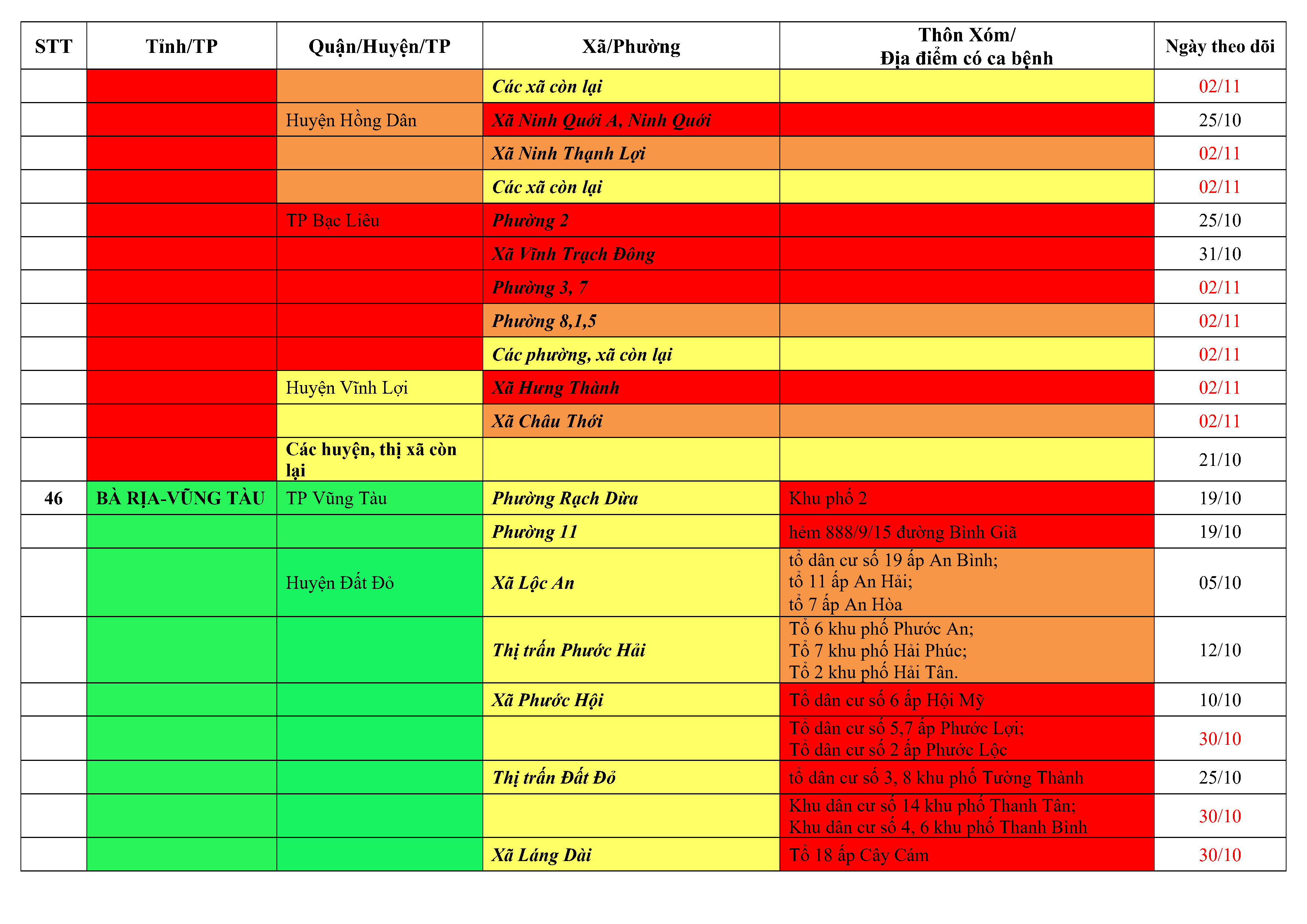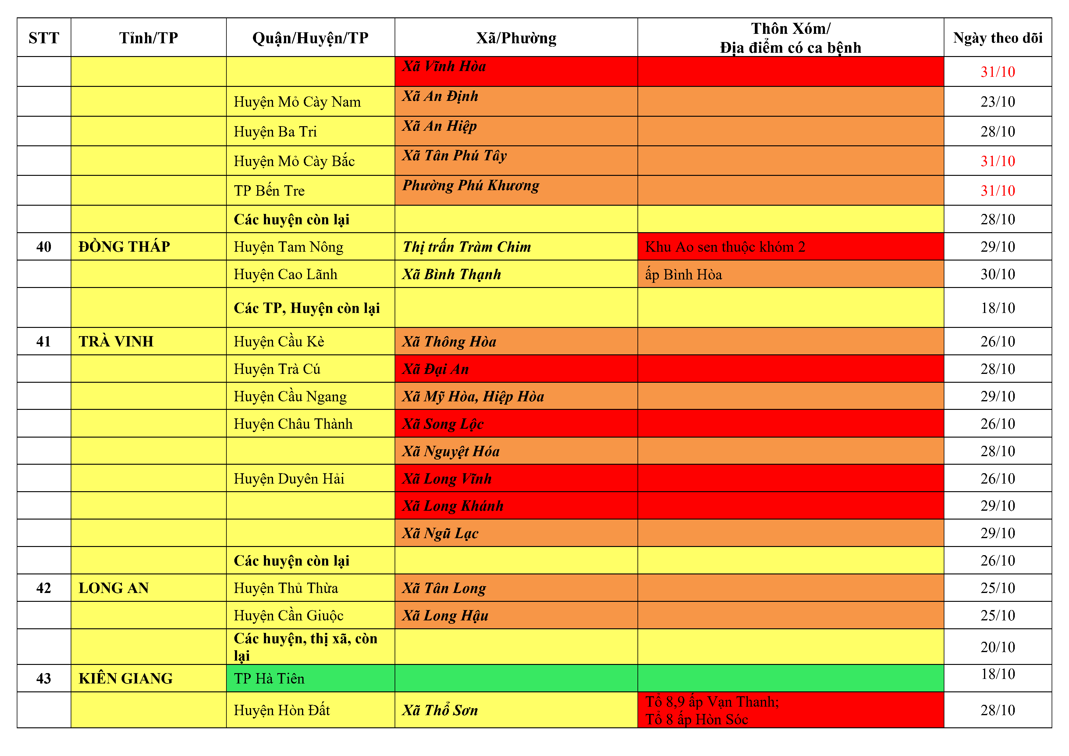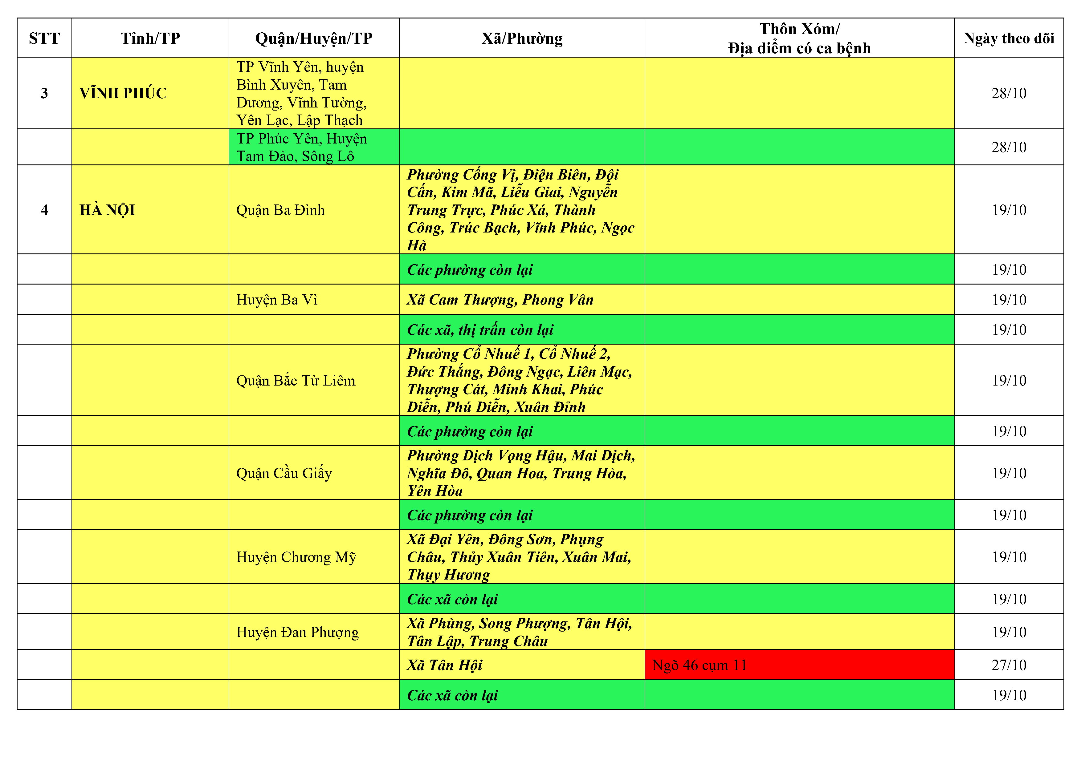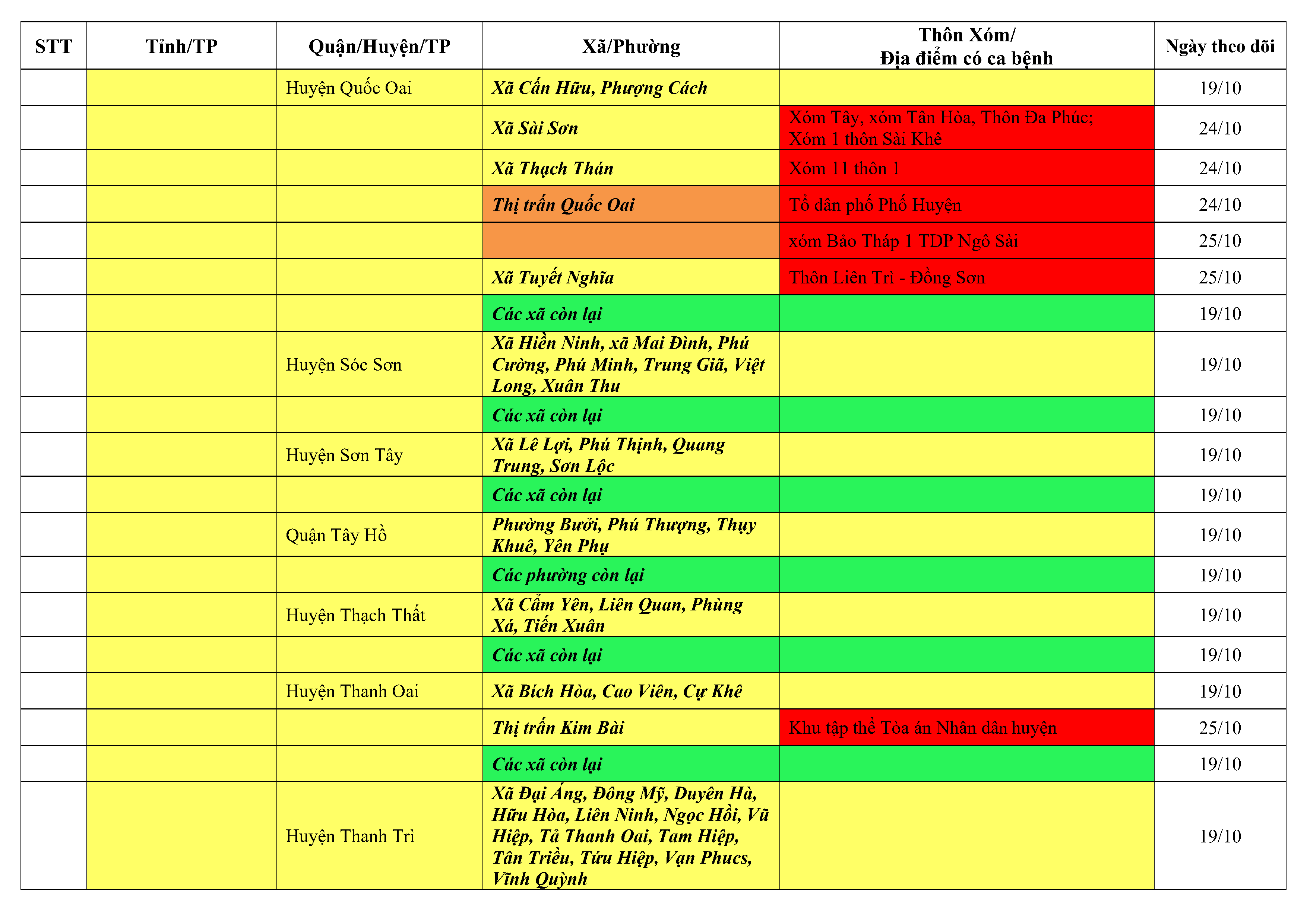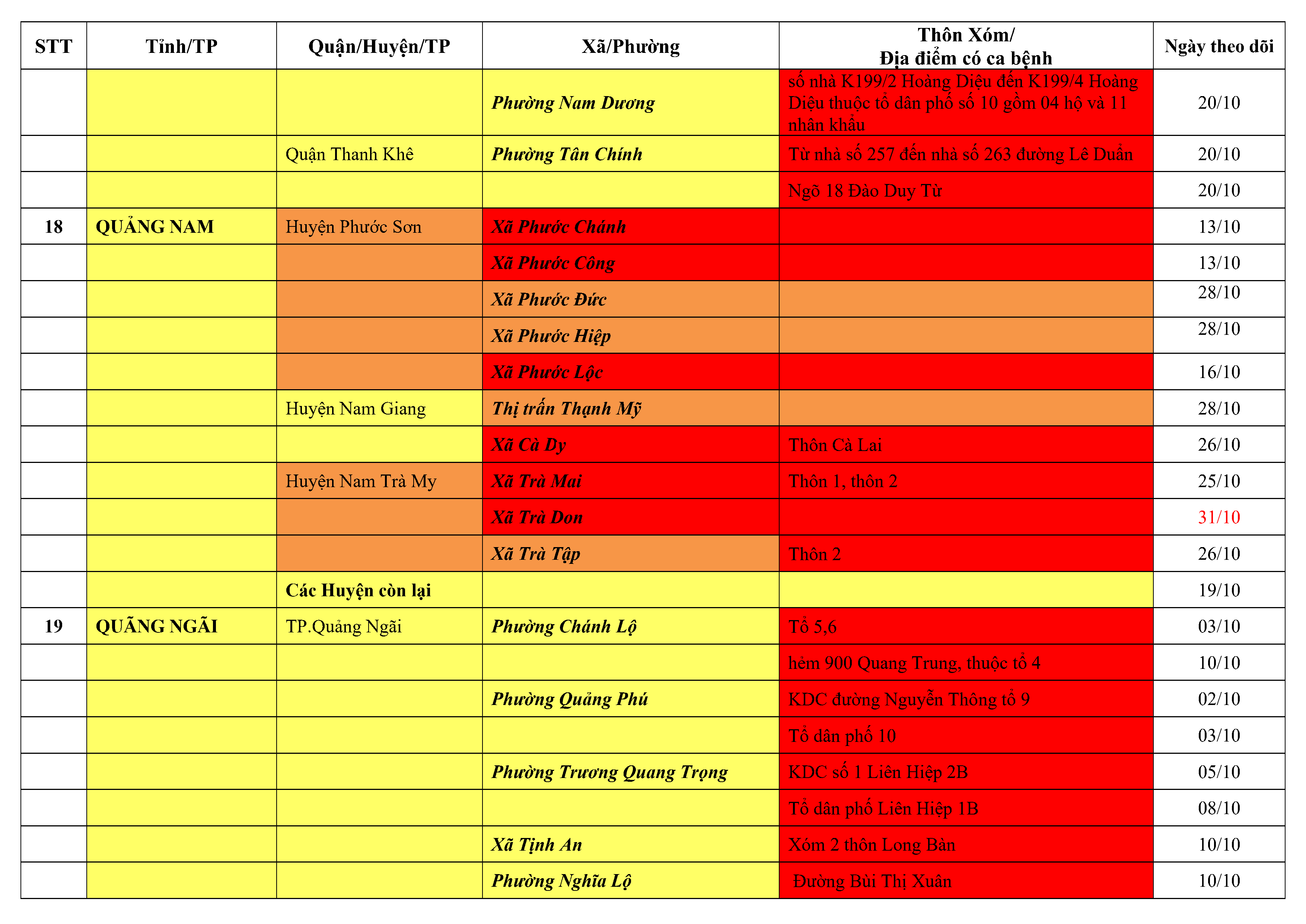Lưu ý: Các tỉnh, thành phố không có tên trong bảng màu, đi lại bình thường, tuân thủ các biện pháp phòng chống dịch theo chỉ đạo của Bộ Y tế; khai báo y tế, thực hiện nghiêm 5K.