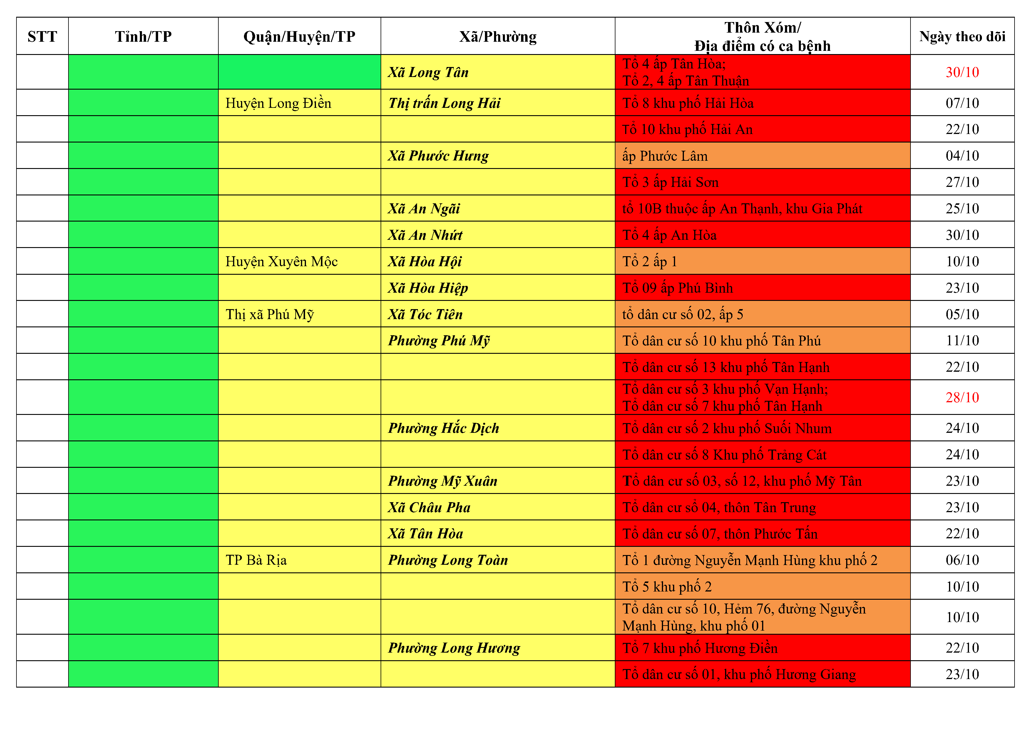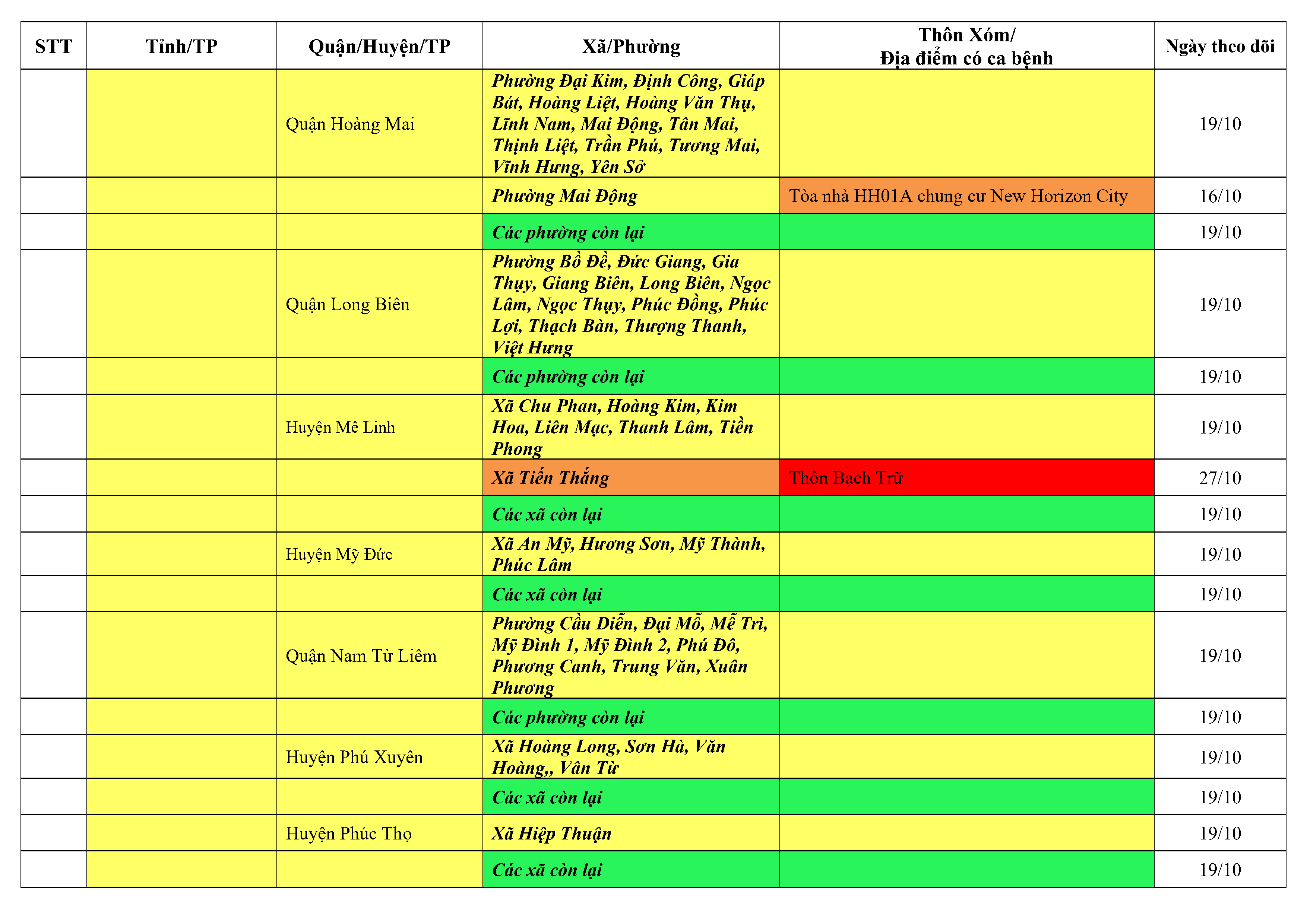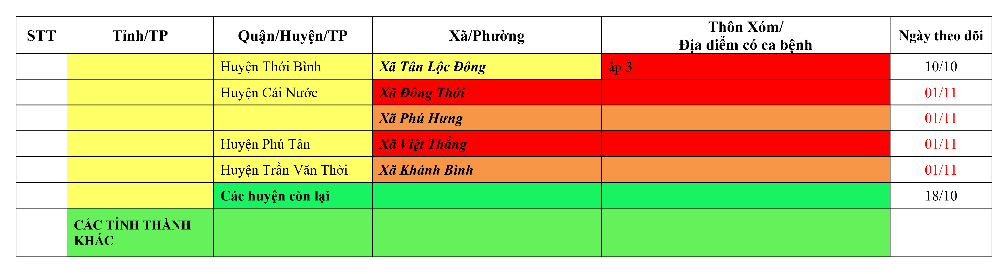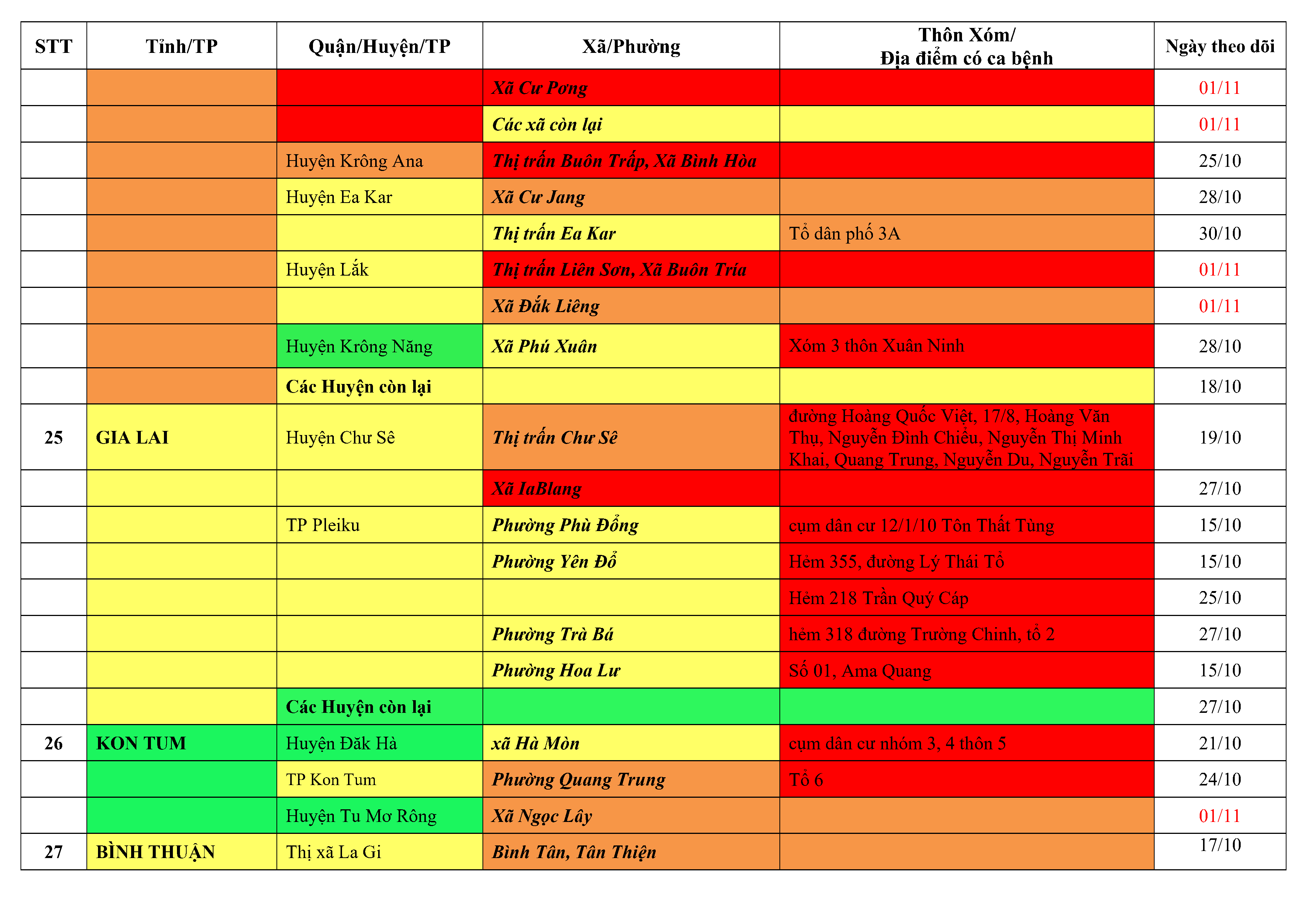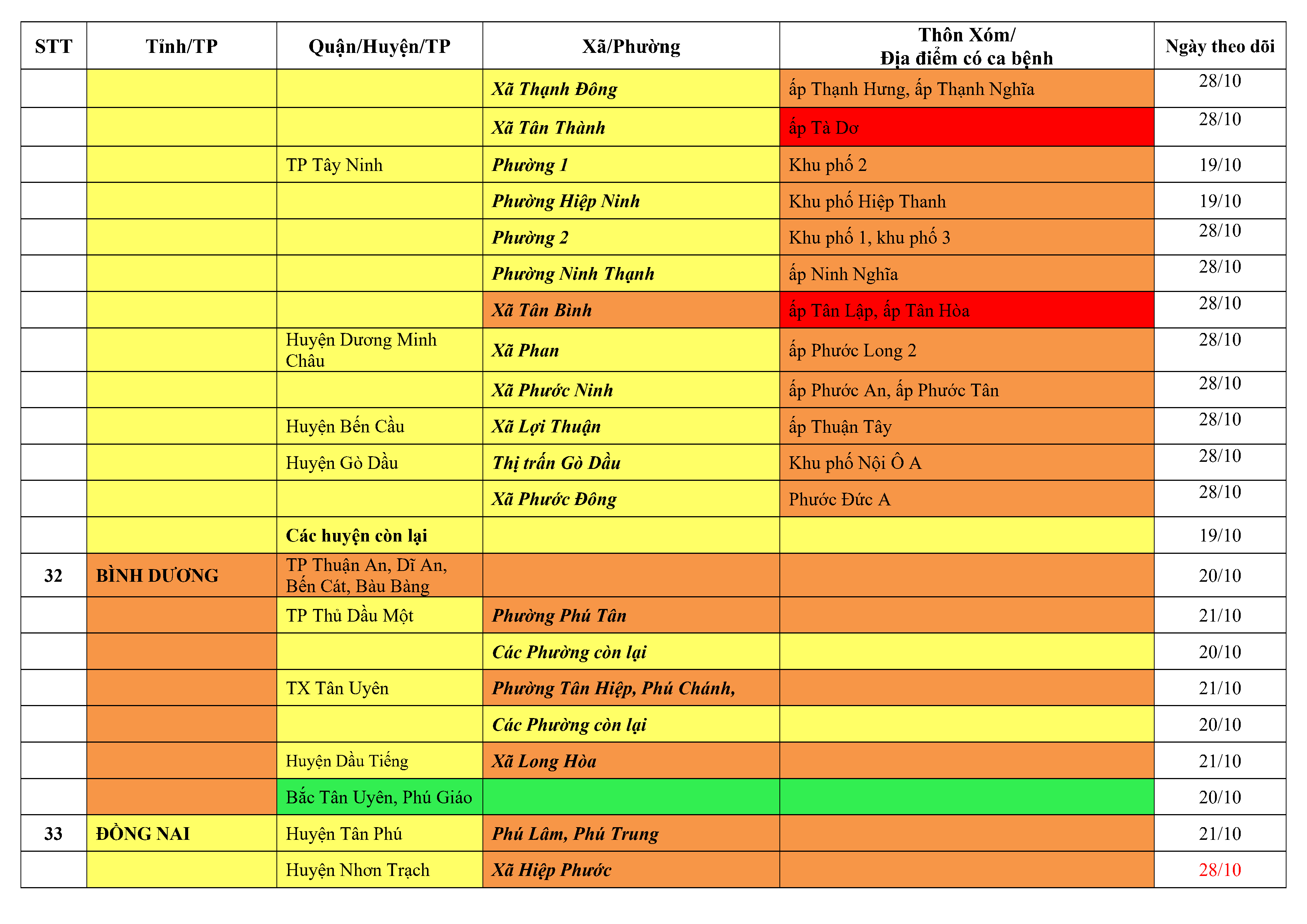 Lưu ý: Các tỉnh, thành phố không có tên trong bảng màu, đi lại bình thường, tuân thủ các biện pháp phòng chống dịch theo chỉ đạo của Bộ Y tế; khai báo y tế, thực hiện nghiêm 5K.