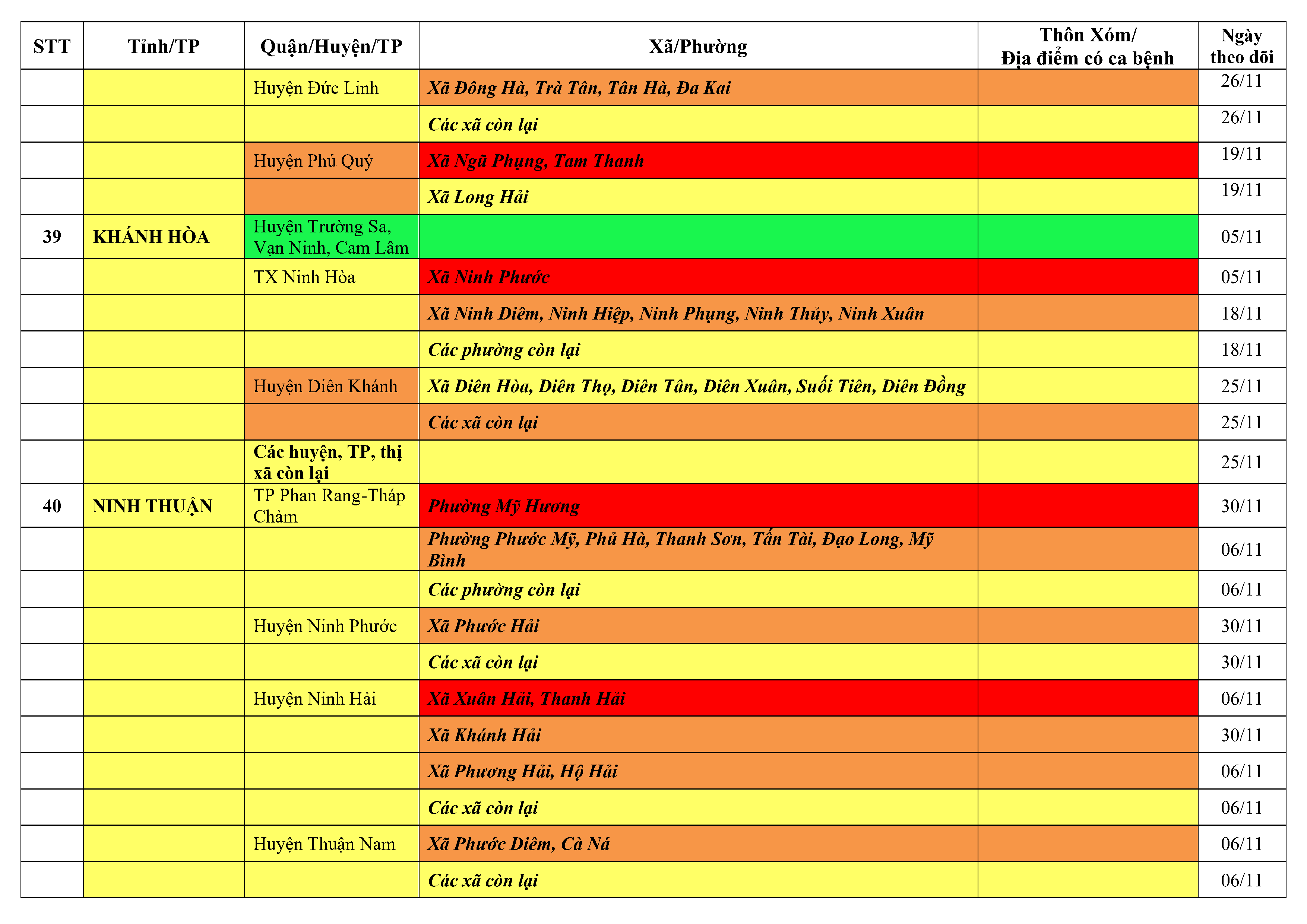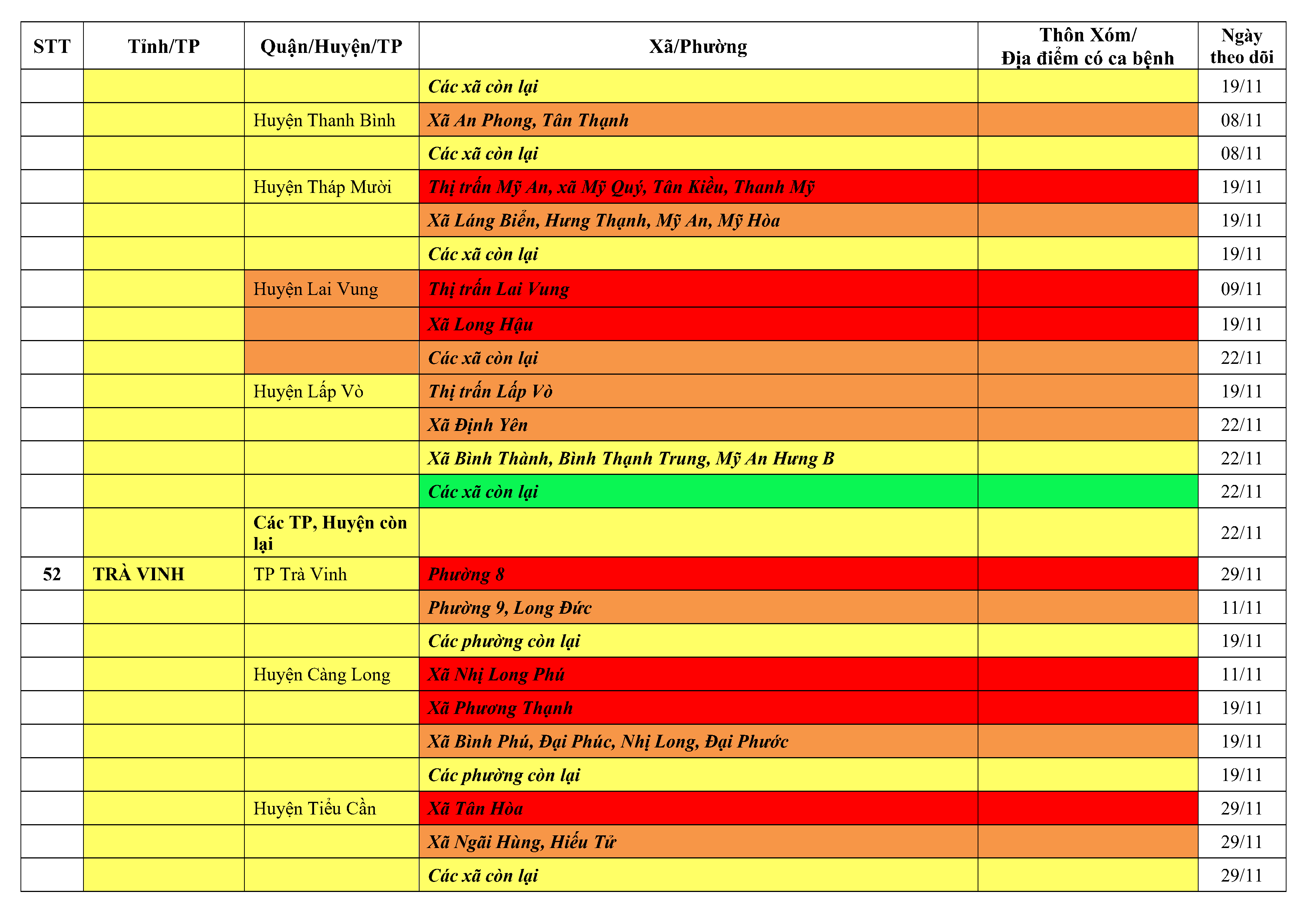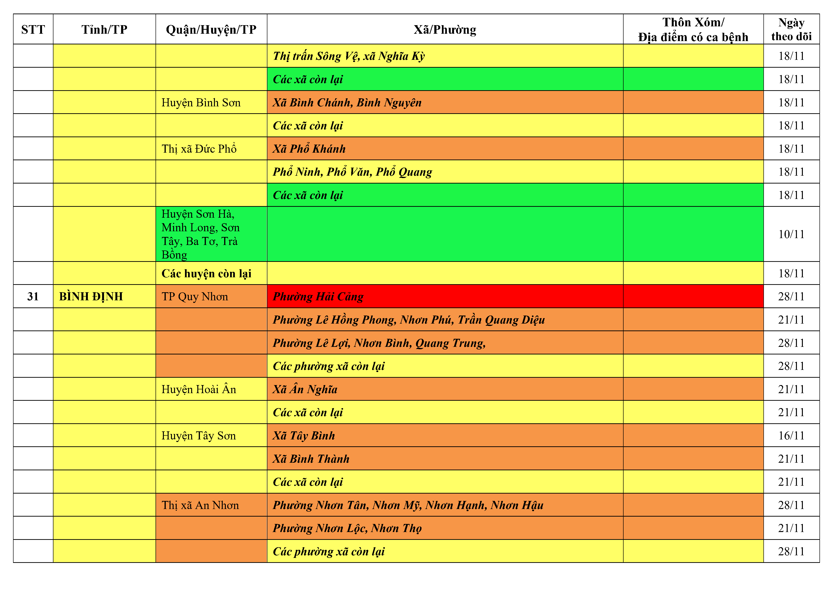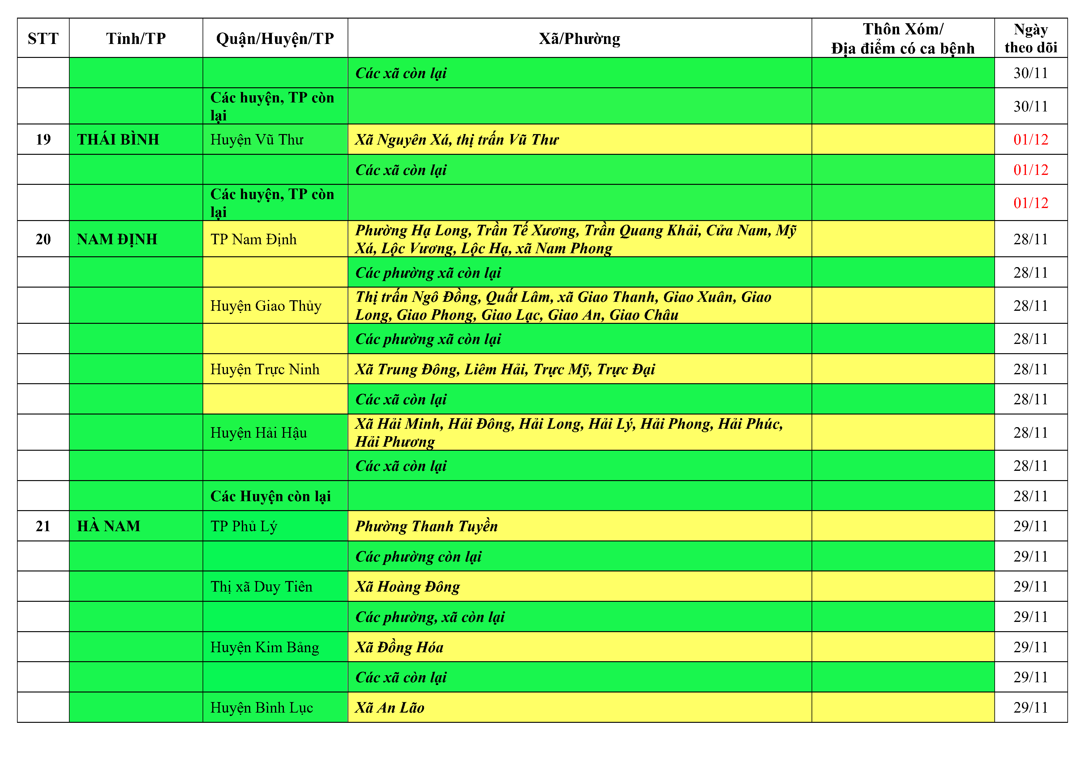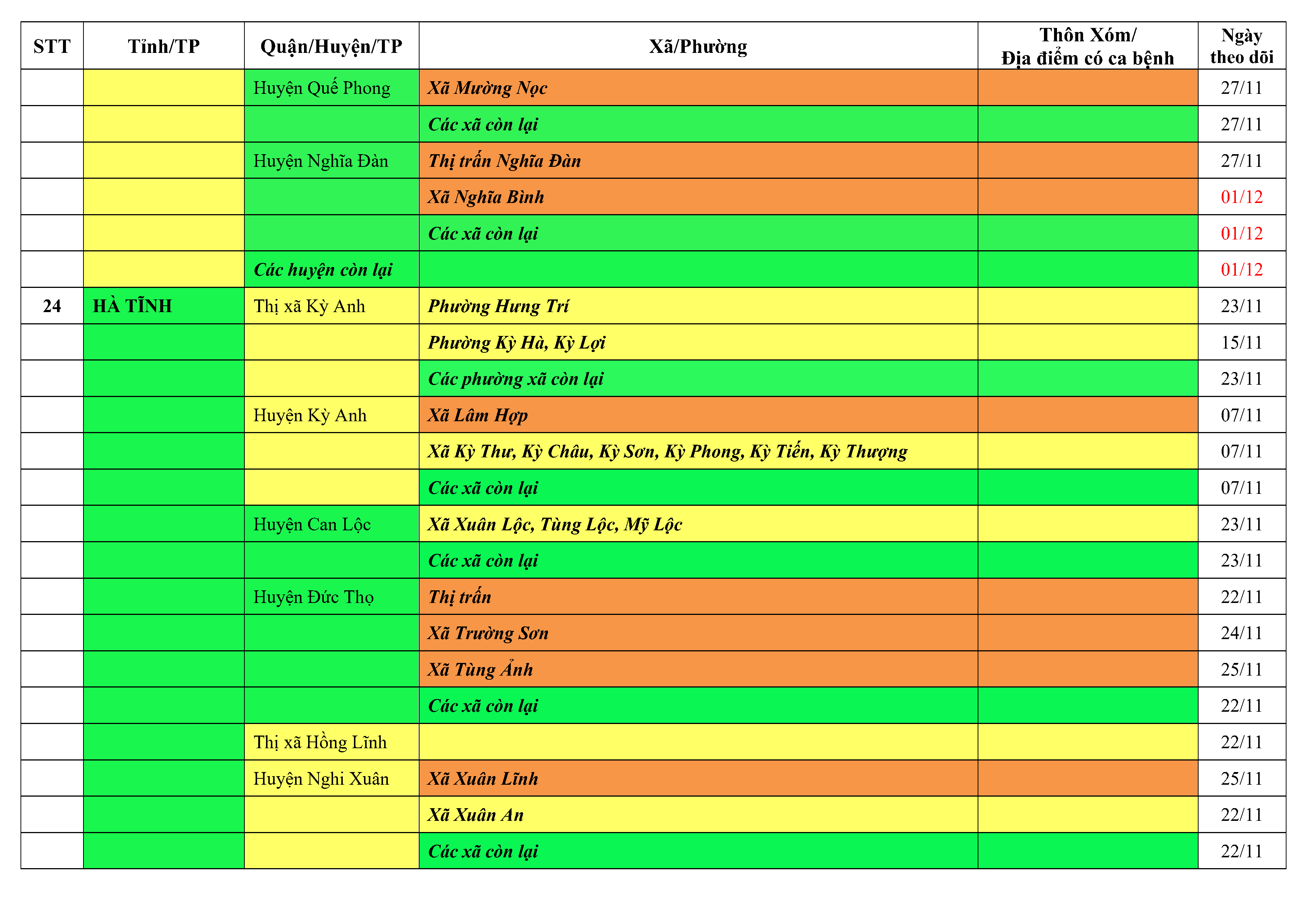 Lưu ý: Các tỉnh, thành phố không có tên trong bảng màu, đi lại bình thường, tuân thủ các biện pháp phòng chống dịch theo chỉ đạo của Bộ Y tế; khai báo y tế, thực hiện nghiêm 5K.
