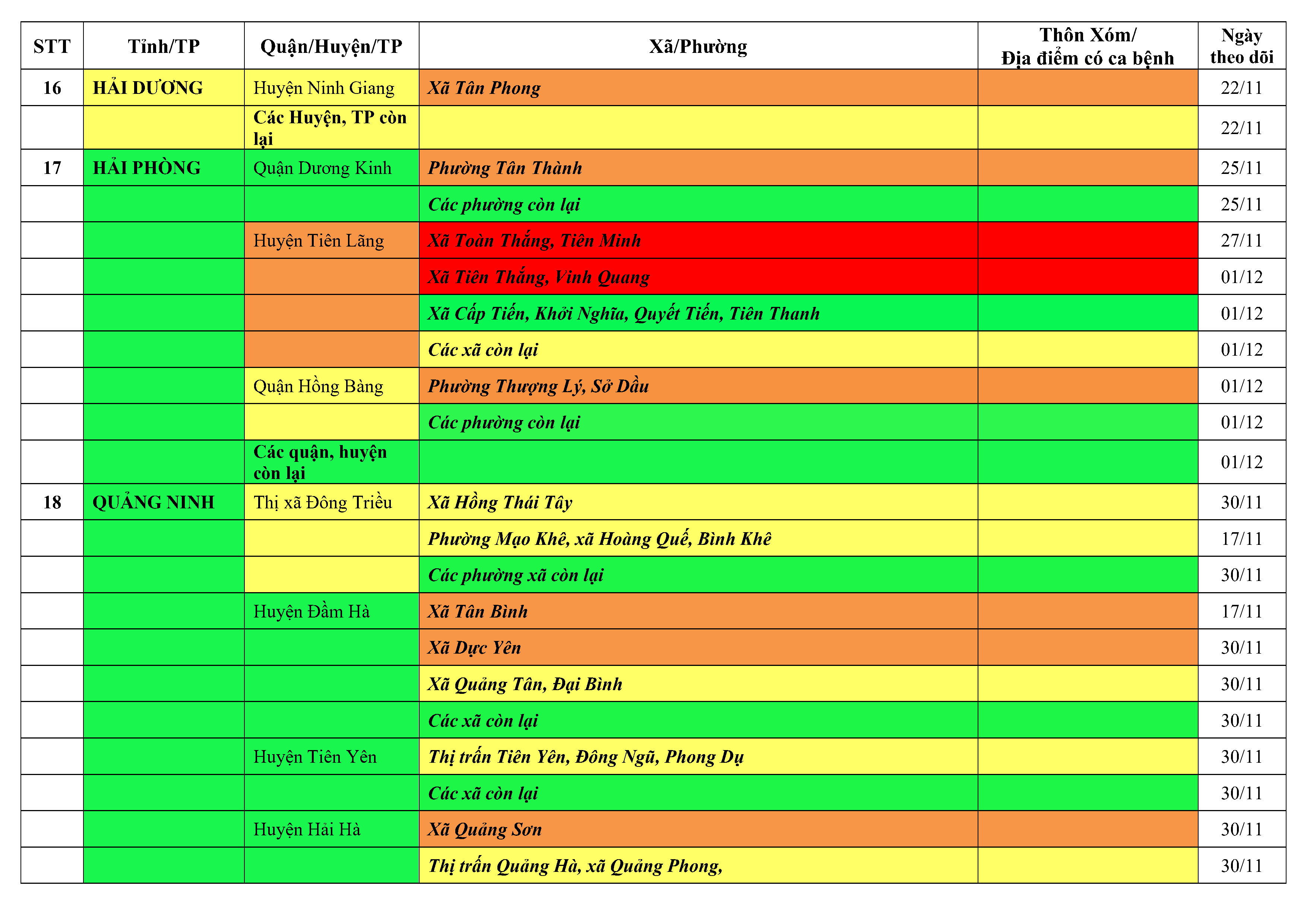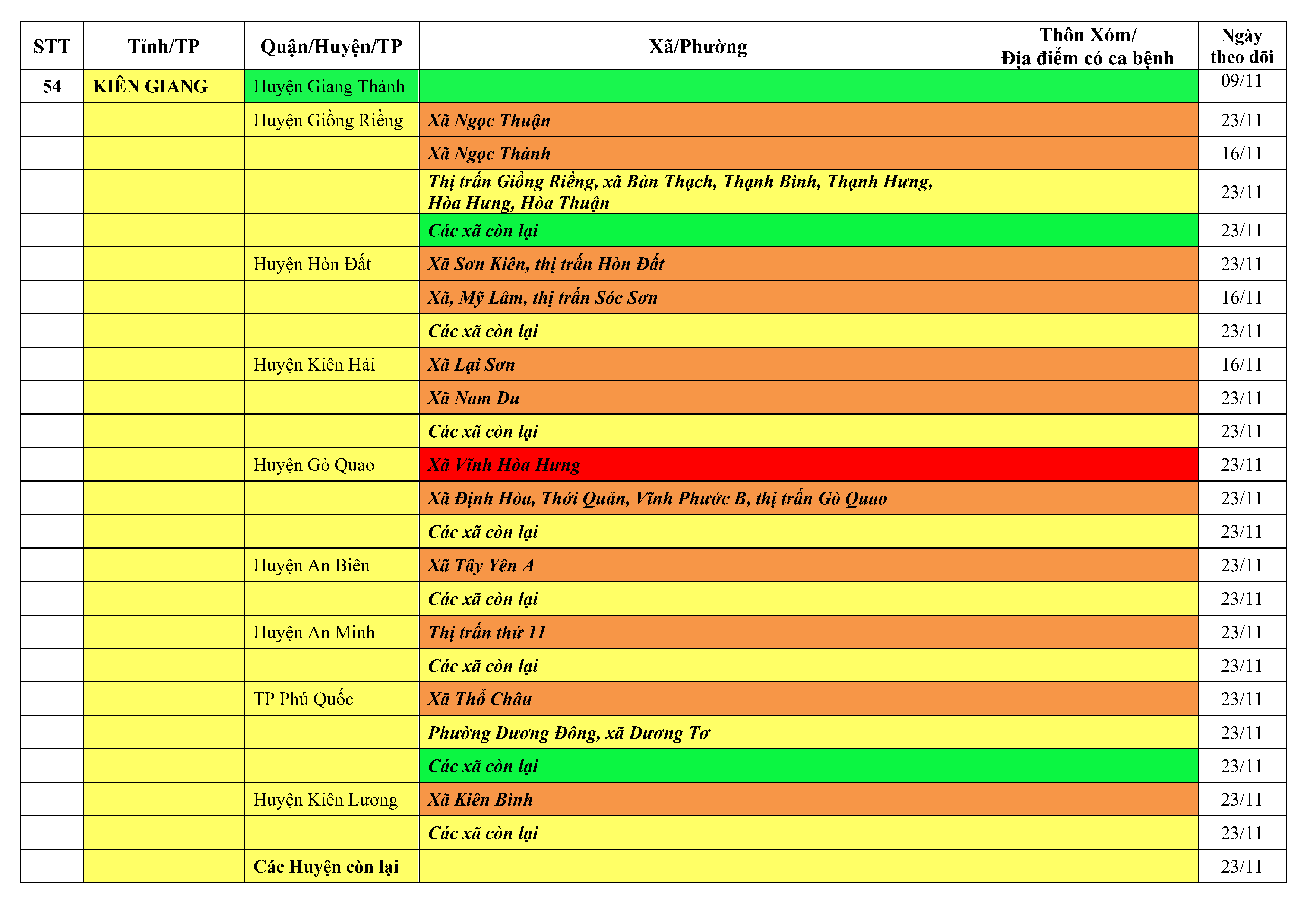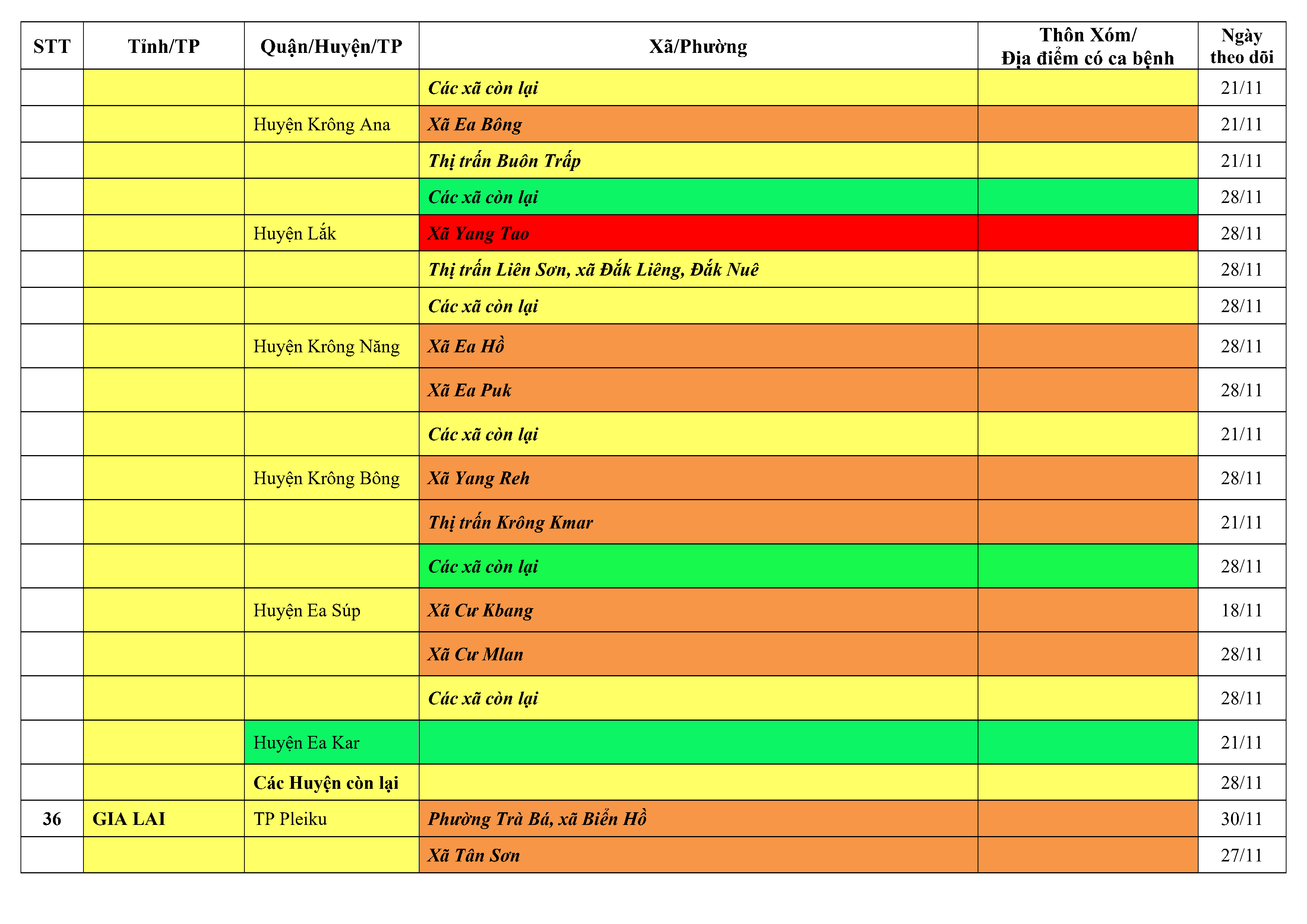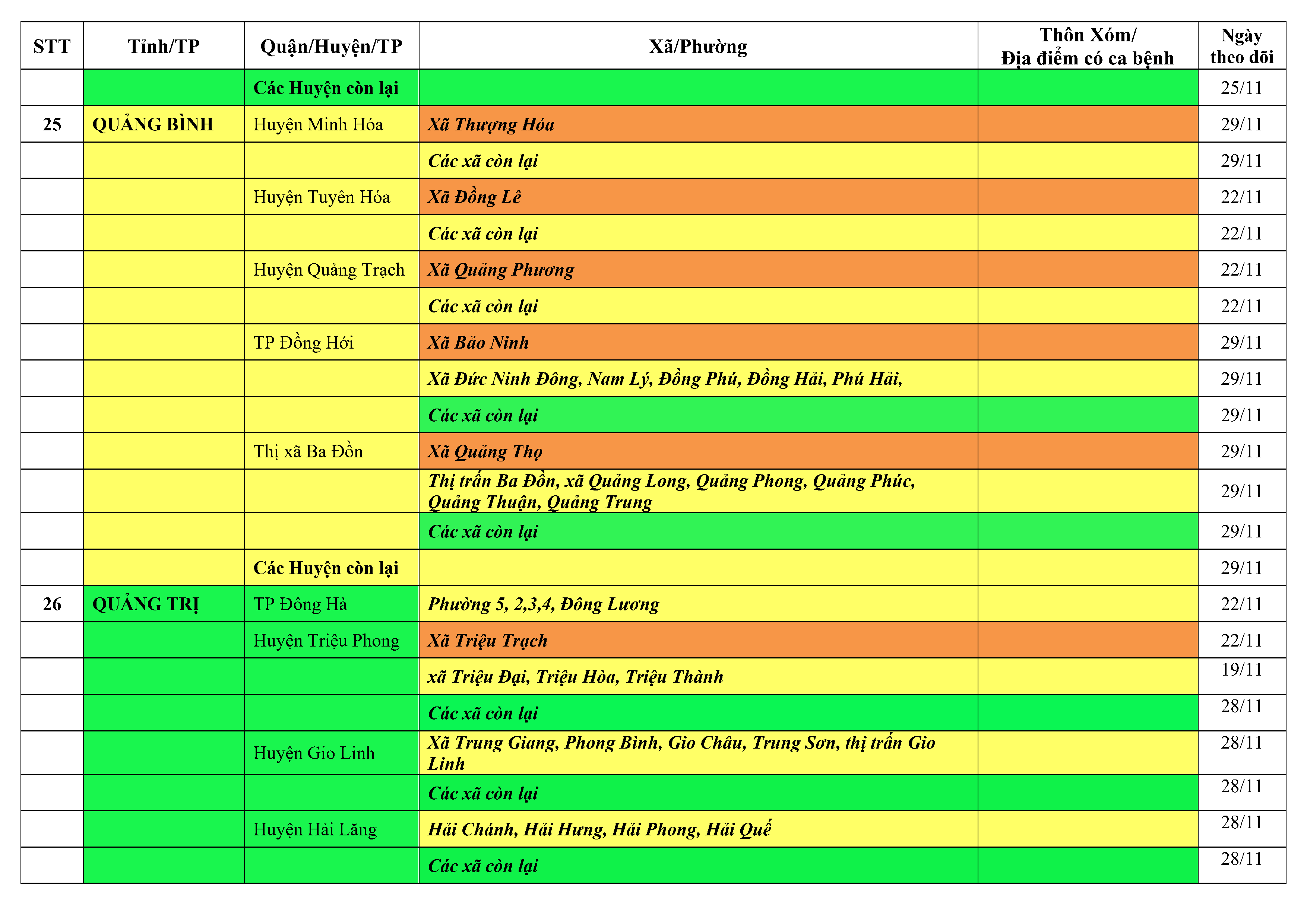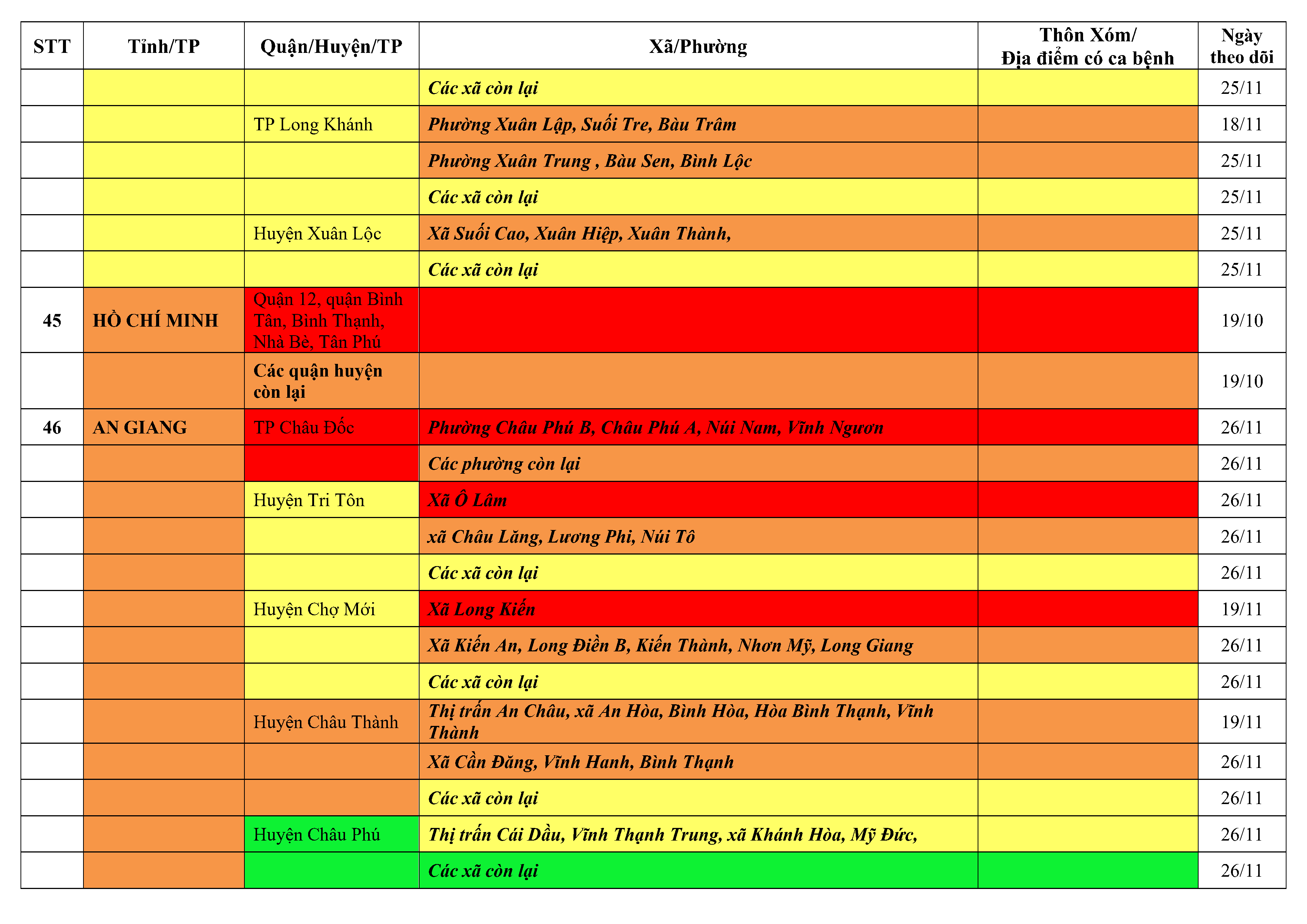 Lưu ý: Các tỉnh, thành phố không có tên trong bảng màu, đi lại bình thường, tuân thủ các biện pháp phòng chống dịch theo chỉ đạo của Bộ Y tế; khai báo y tế, thực hiện nghiêm 5K.