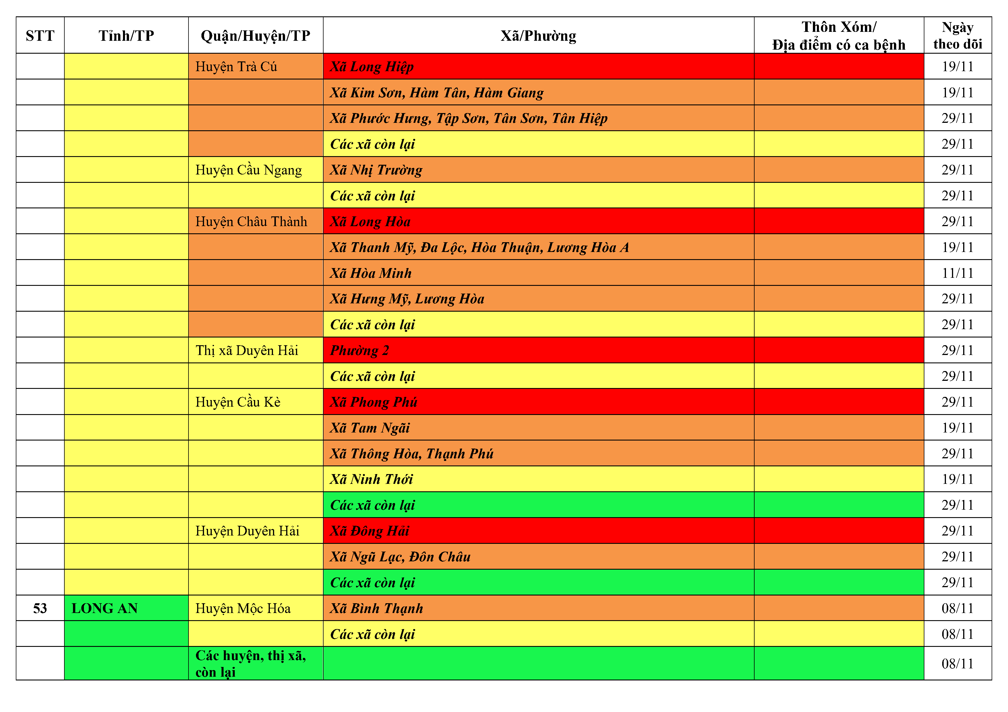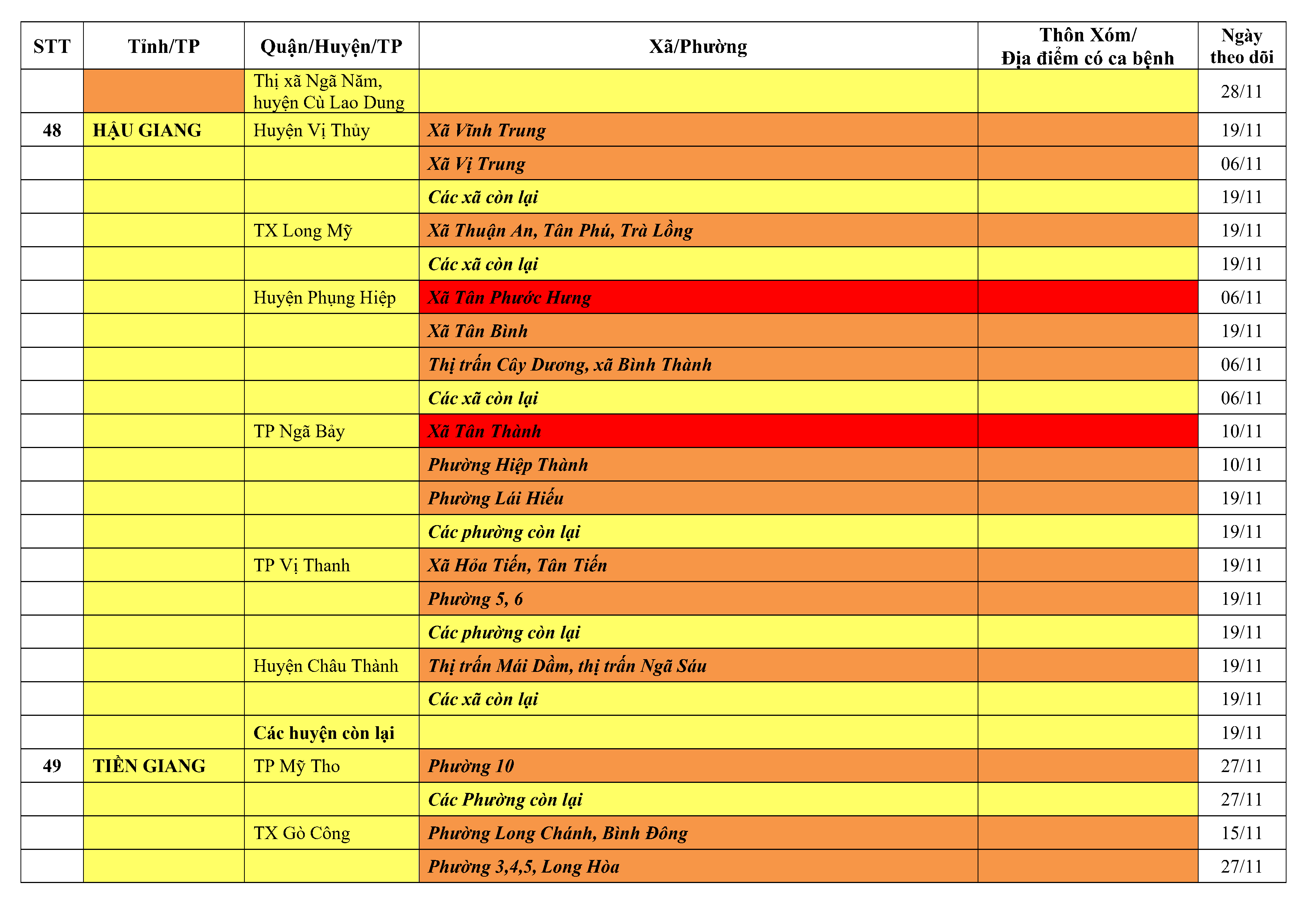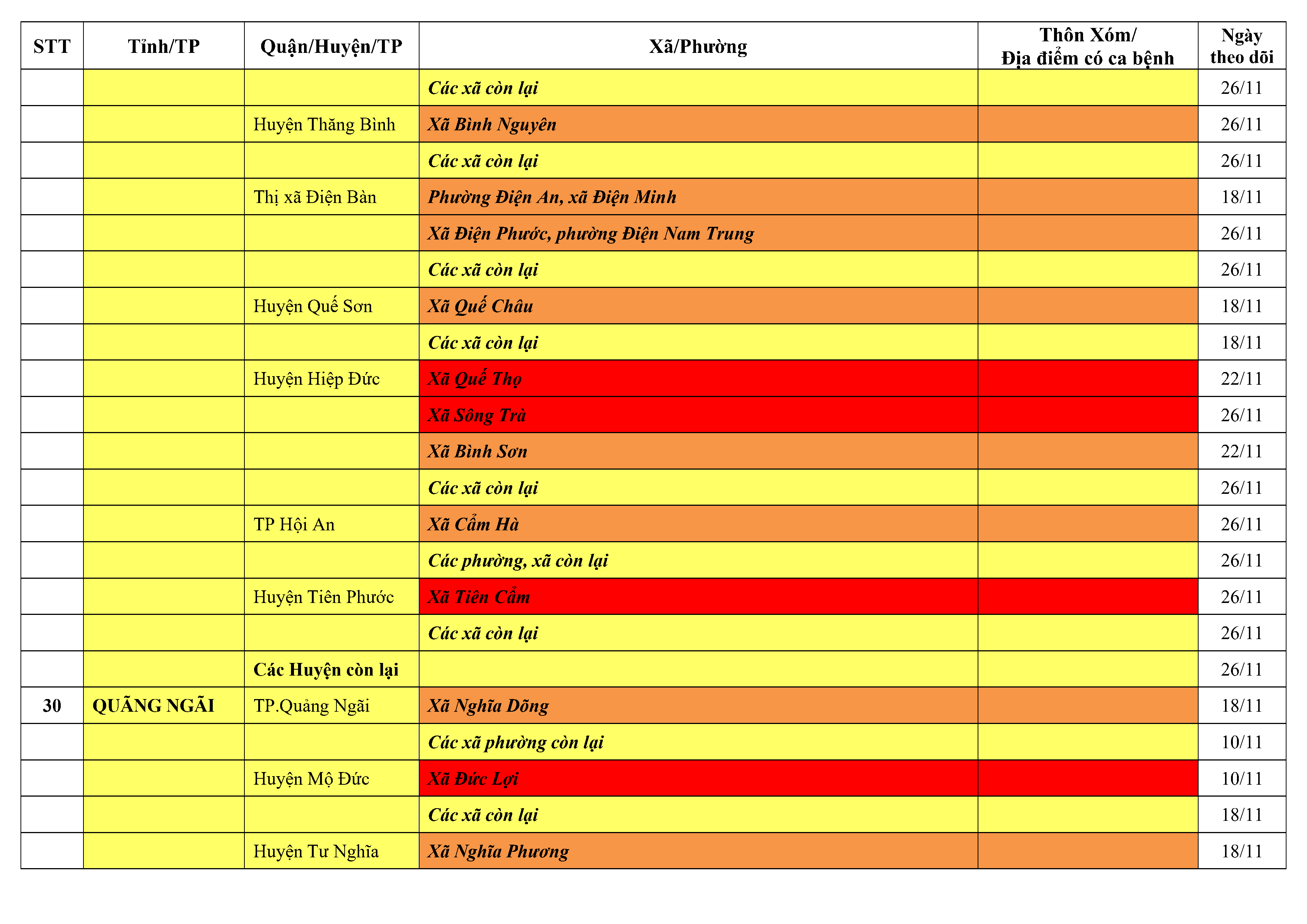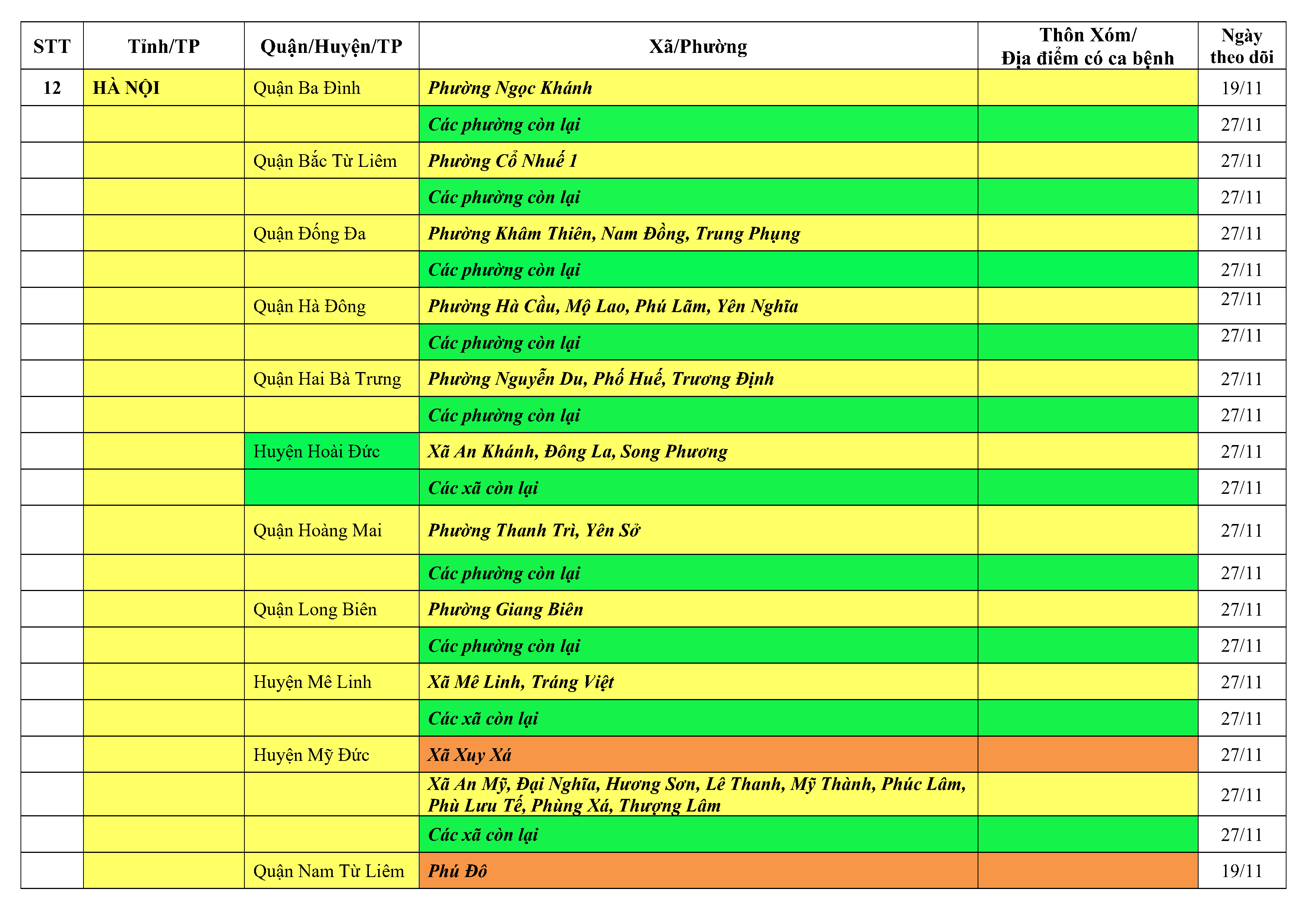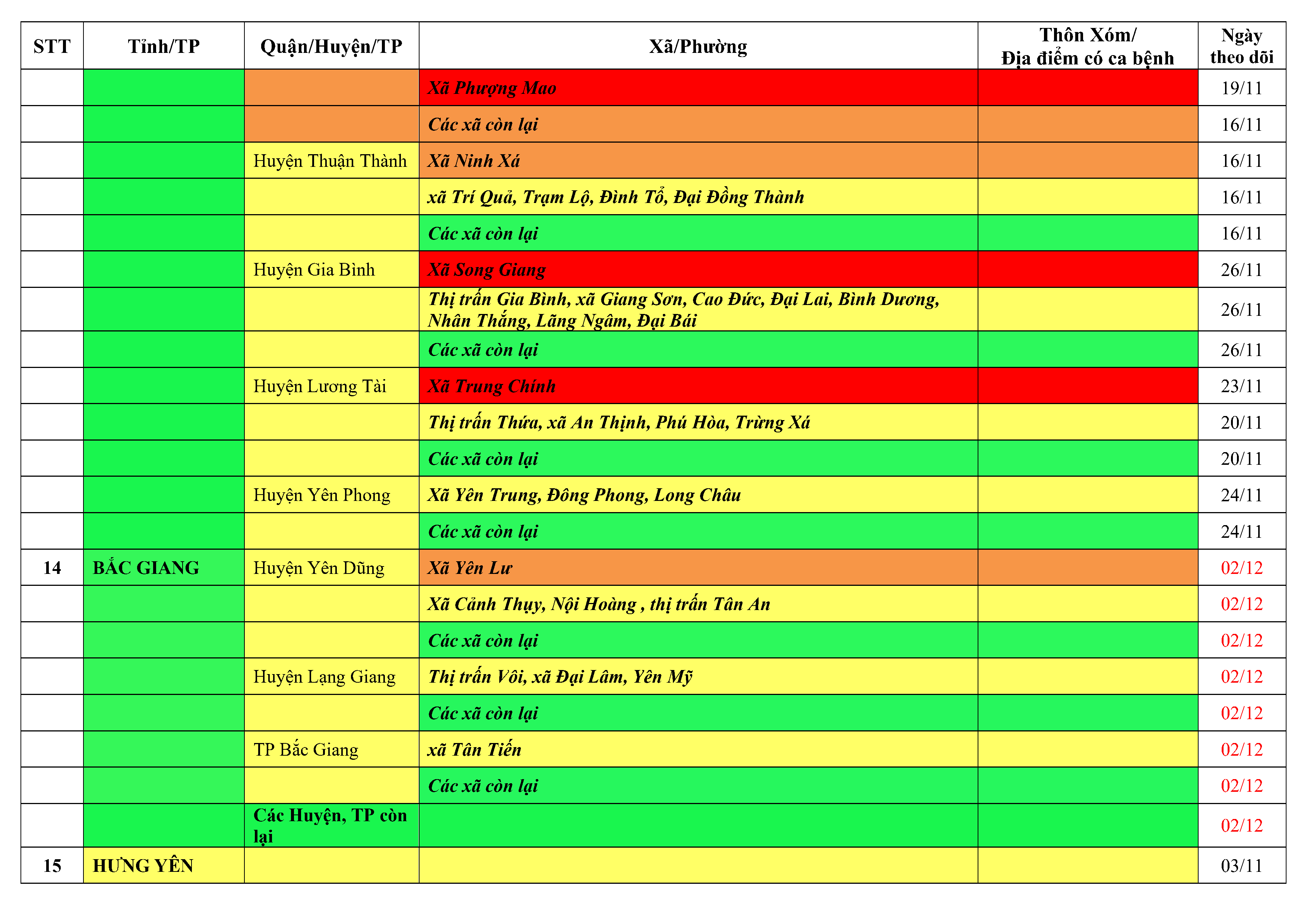 Lưu ý: Các tỉnh, thành phố không có tên trong bảng màu, đi lại bình thường, tuân thủ các biện pháp phòng chống dịch theo chỉ đạo của Bộ Y tế; khai báo y tế, thực hiện nghiêm 5K.