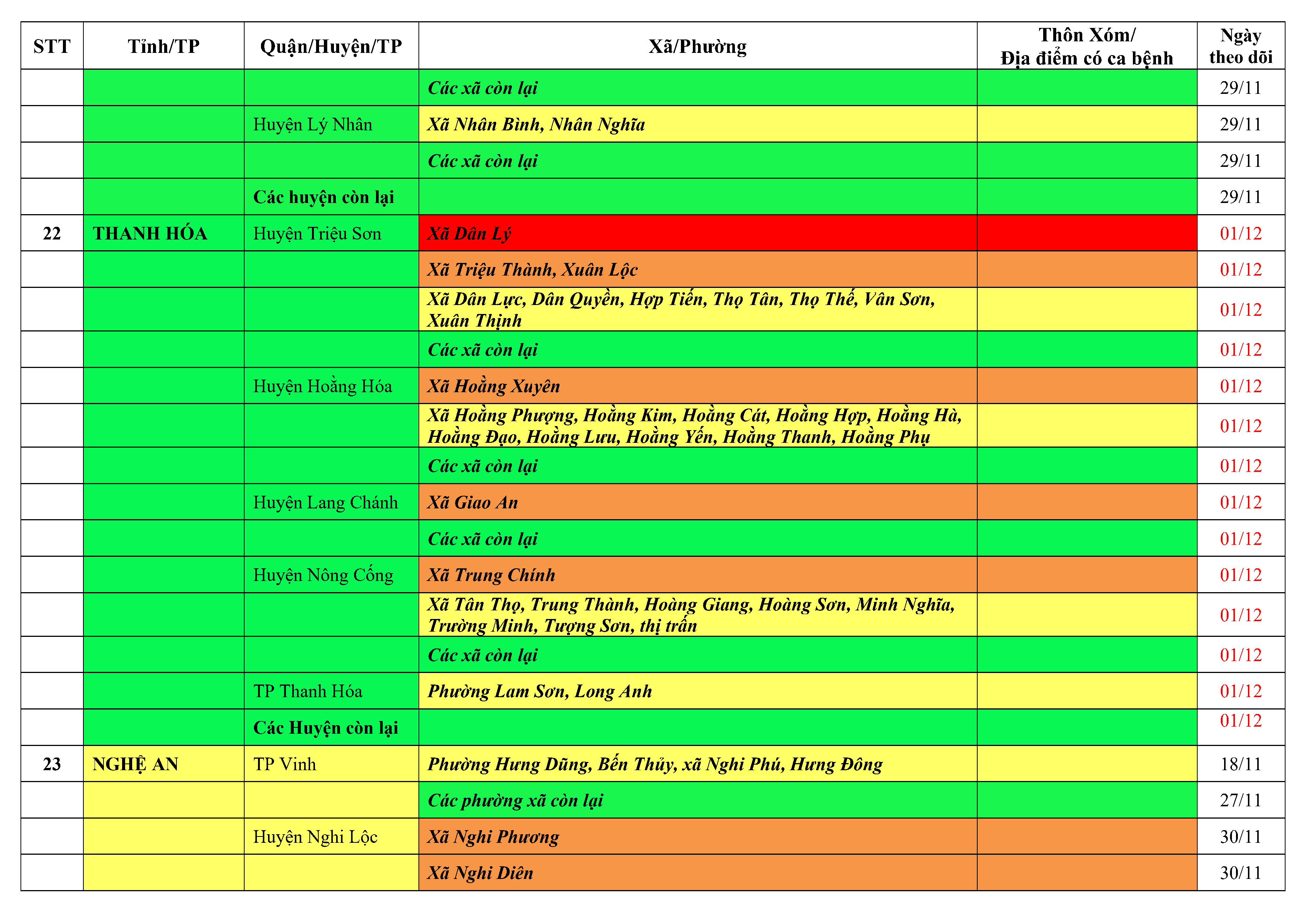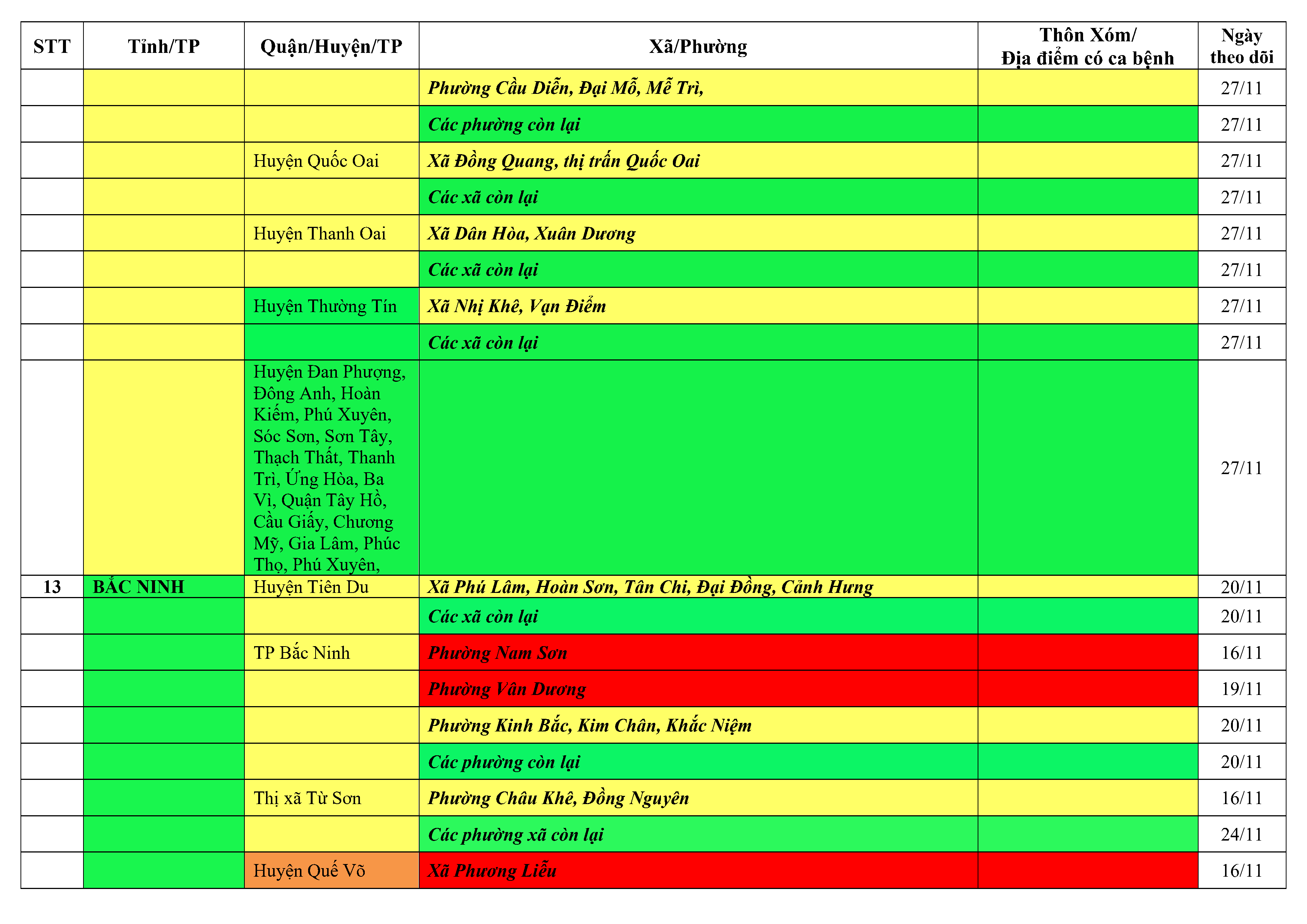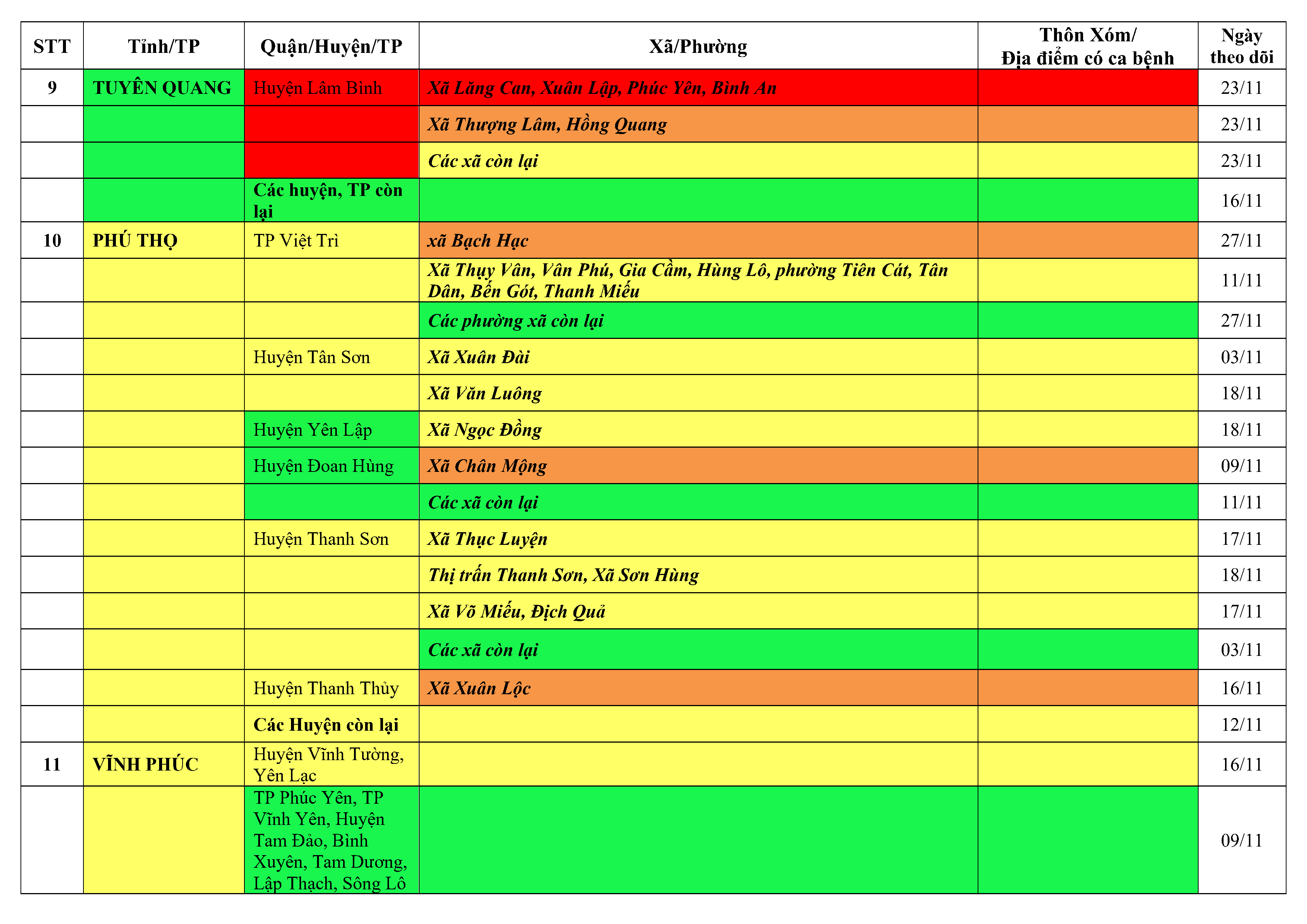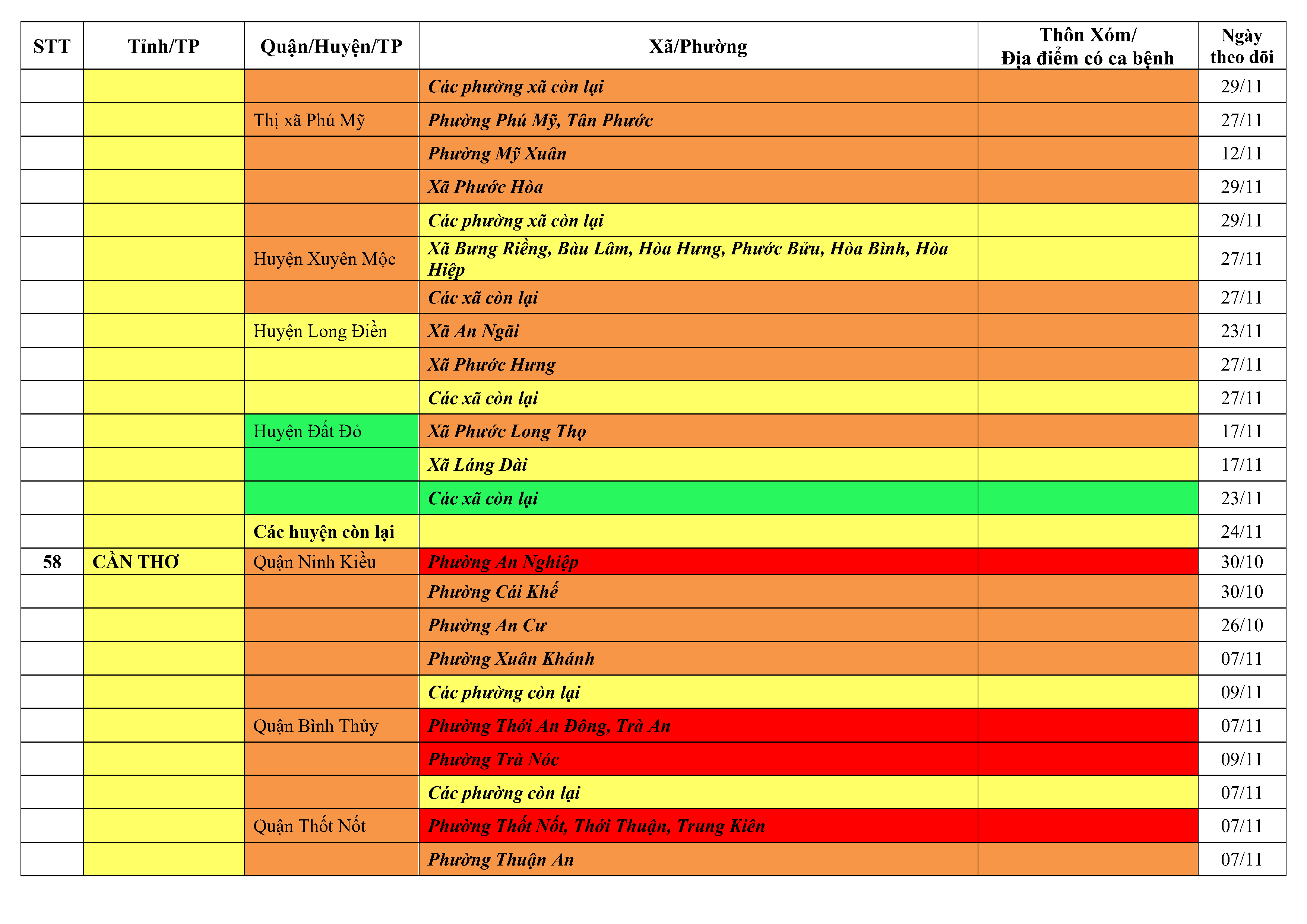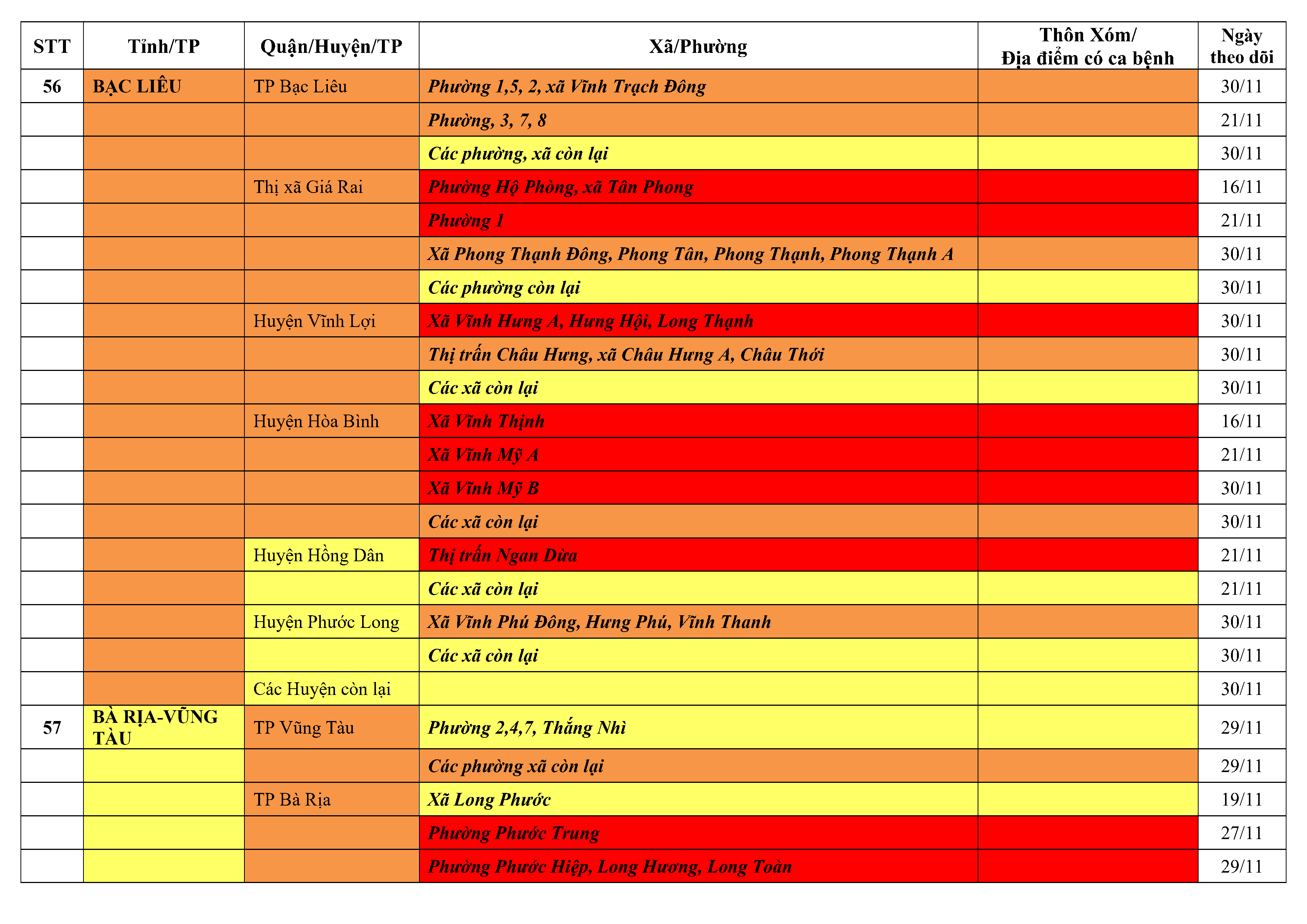 Lưu ý: Các tỉnh, thành phố không có tên trong bảng màu, đi lại bình thường, tuân thủ các biện pháp phòng chống dịch theo chỉ đạo của Bộ Y tế; khai báo y tế, thực hiện nghiêm 5K.