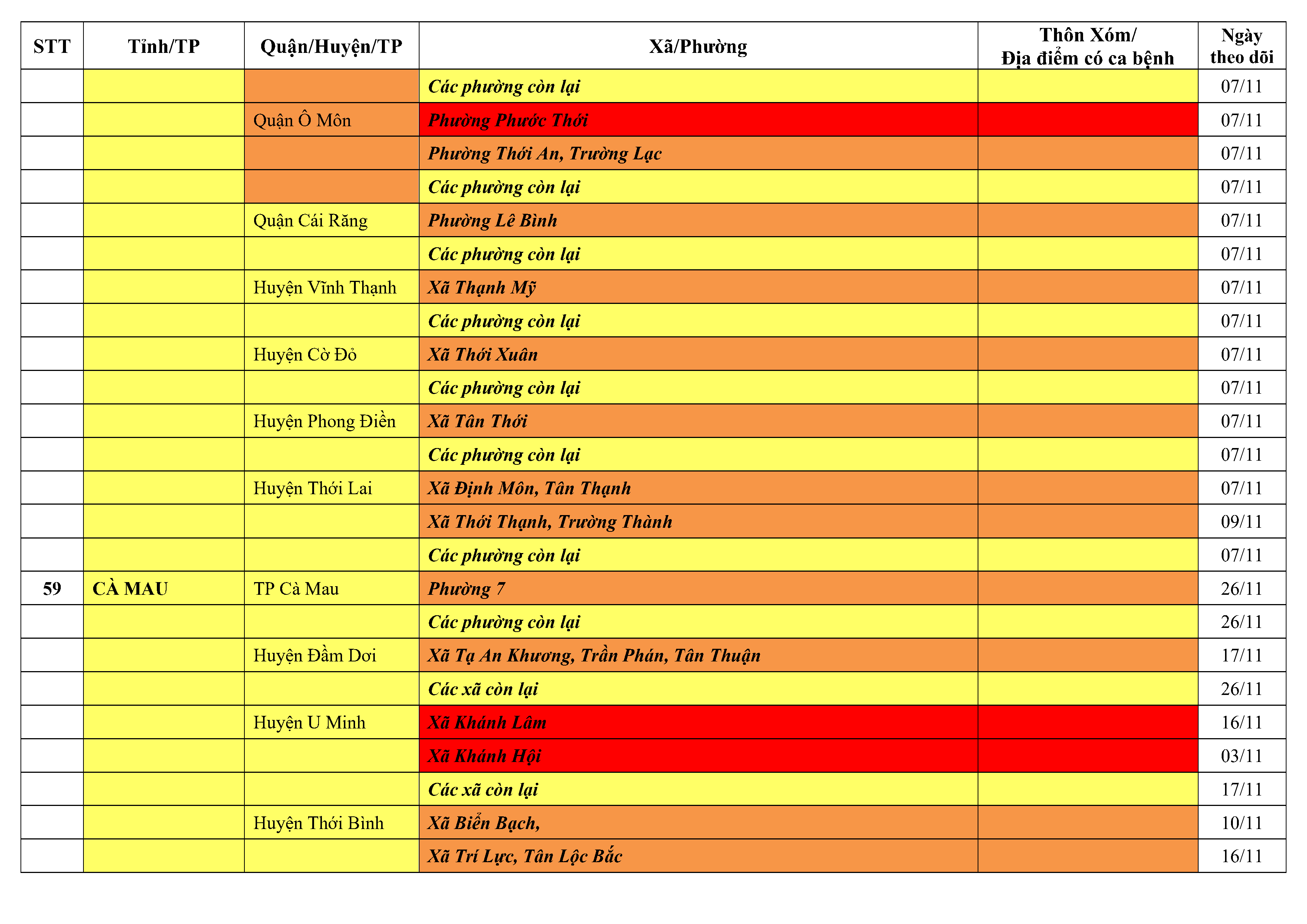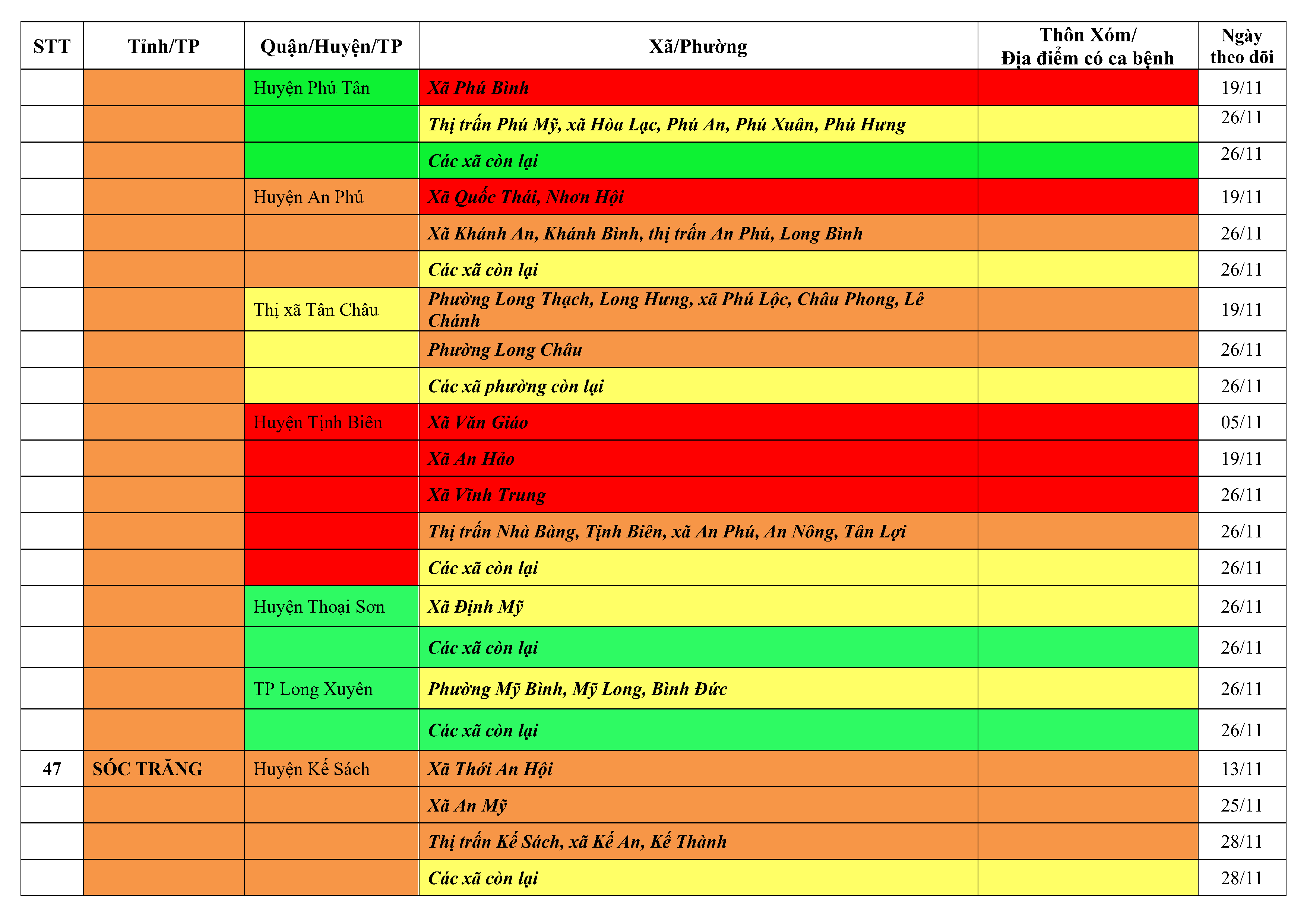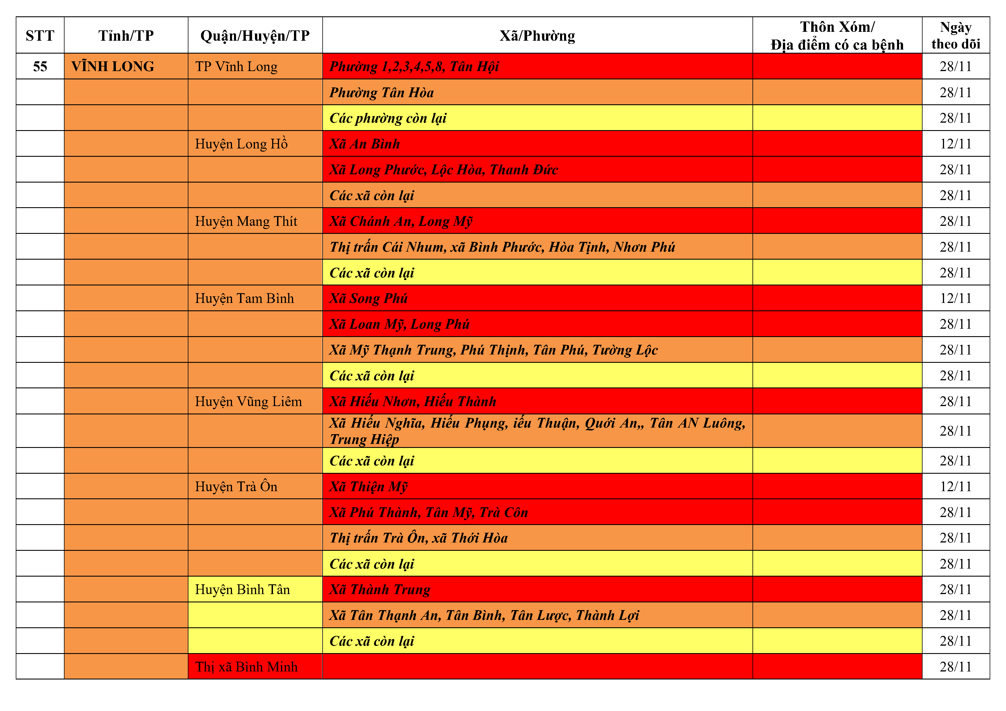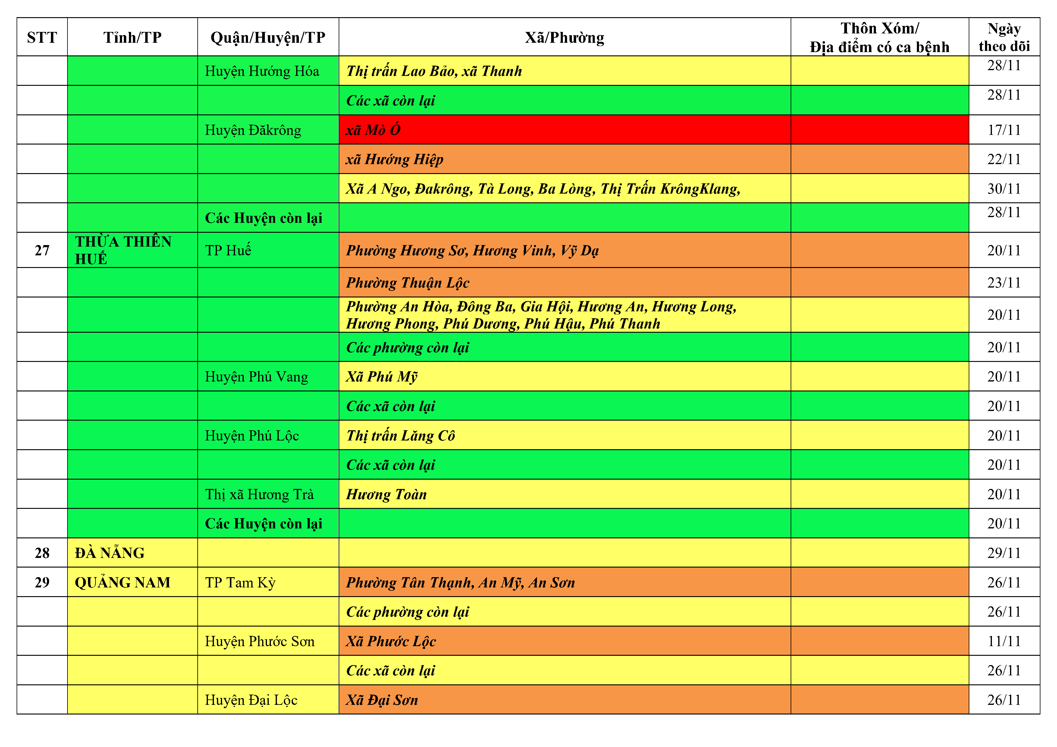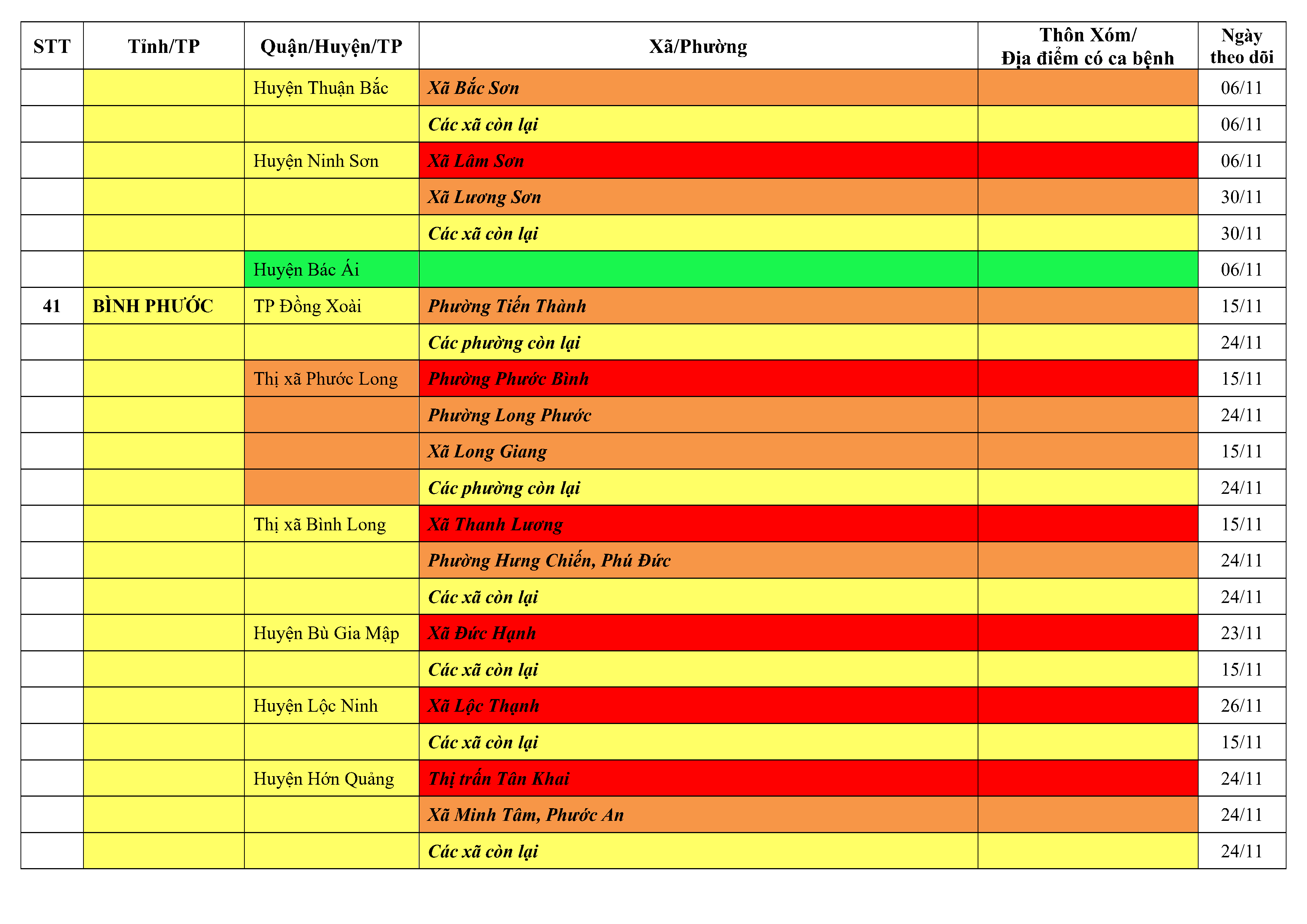 Lưu ý: Các tỉnh, thành phố không có tên trong bảng màu, đi lại bình thường, tuân thủ các biện pháp phòng chống dịch theo chỉ đạo của Bộ Y tế; khai báo y tế, thực hiện nghiêm 5K.