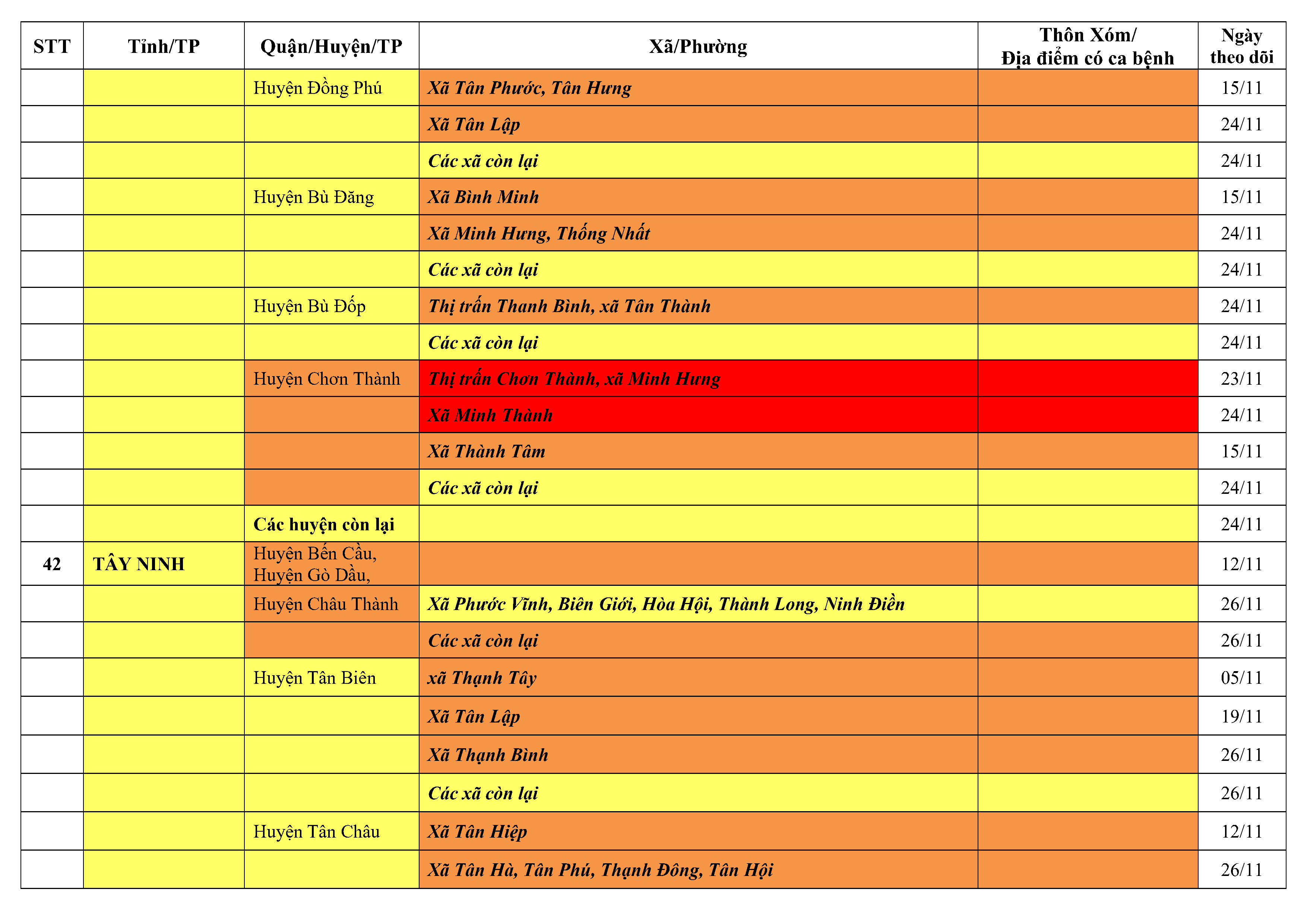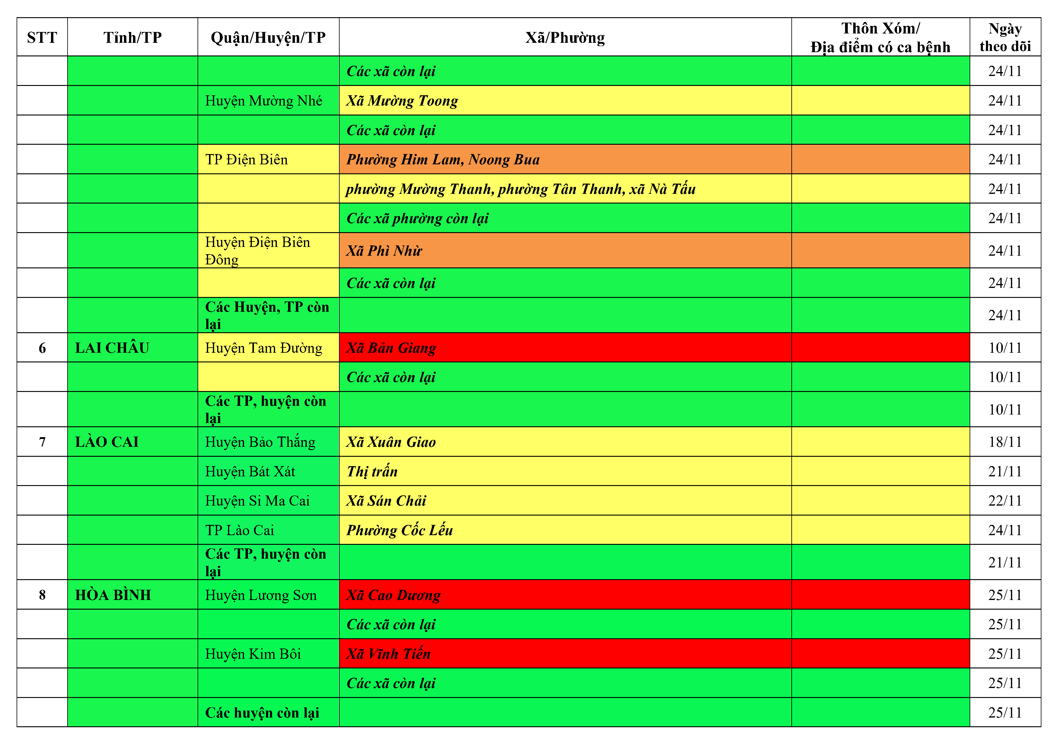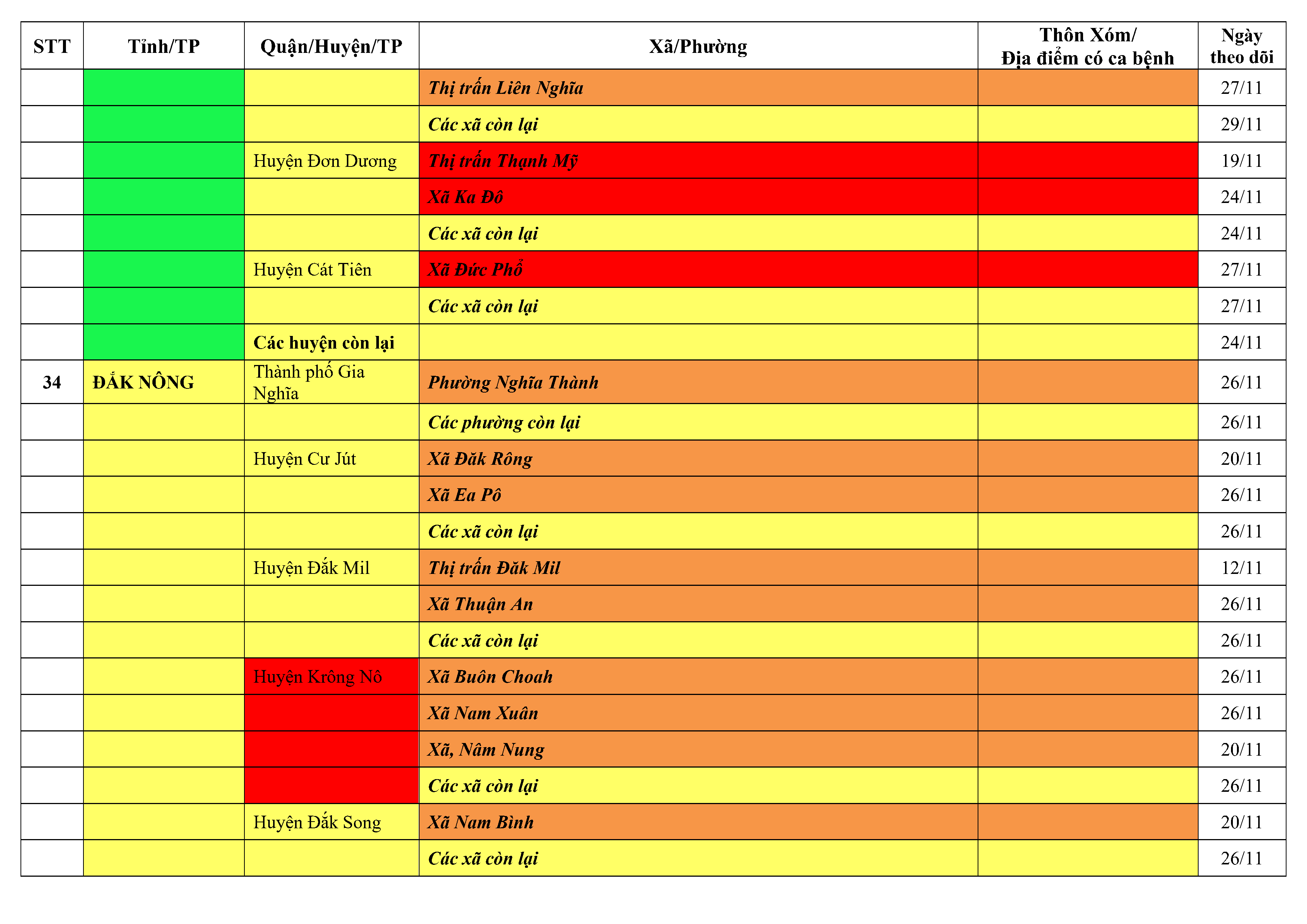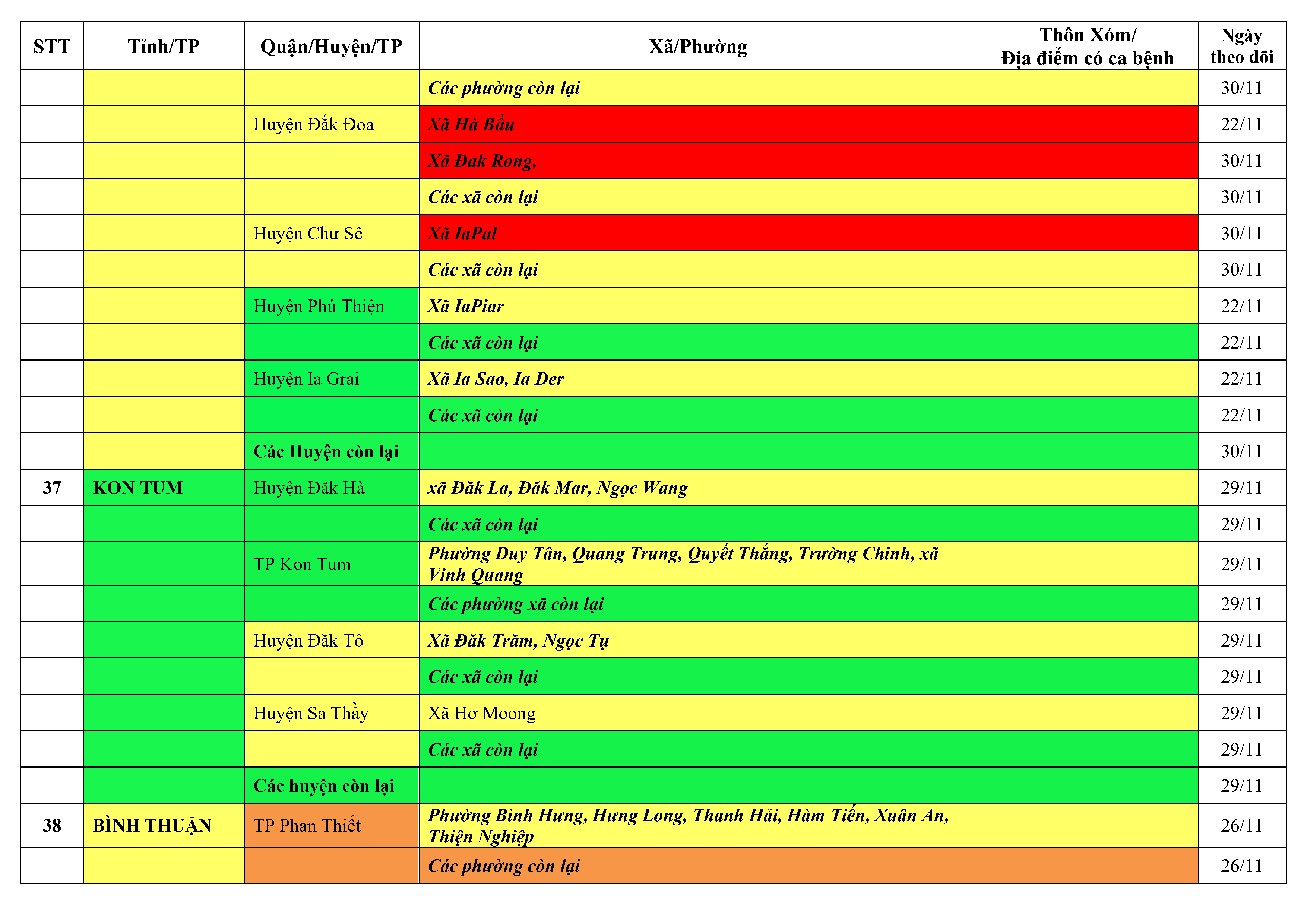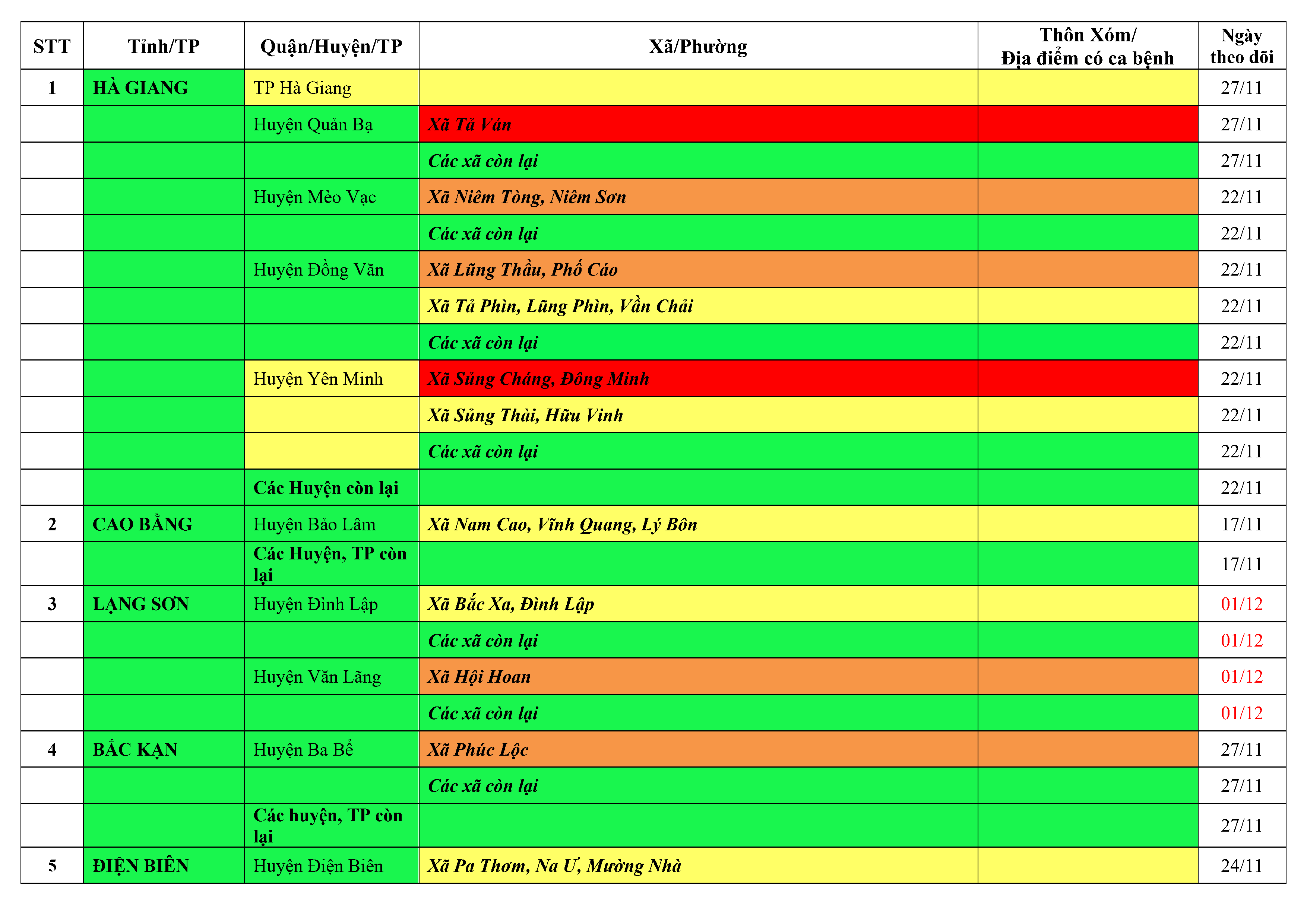 Lưu ý: Các tỉnh, thành phố không có tên trong bảng màu, đi lại bình thường, tuân thủ các biện pháp phòng chống dịch theo chỉ đạo của Bộ Y tế; khai báo y tế, thực hiện nghiêm 5K.