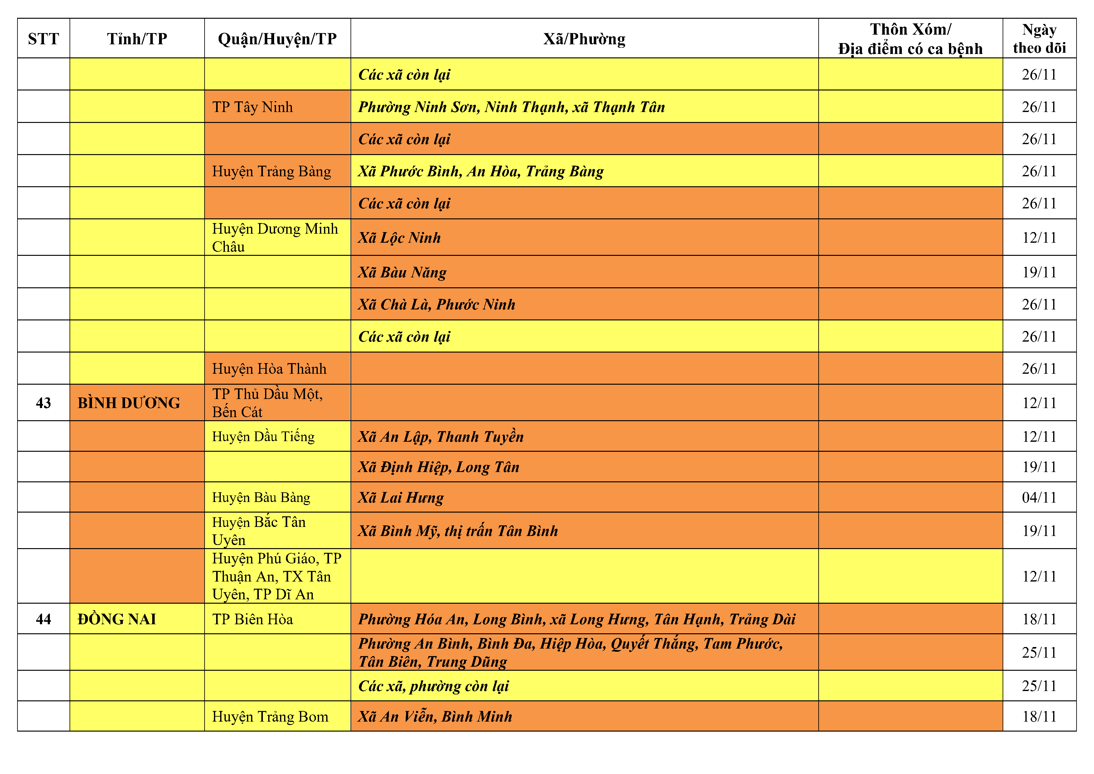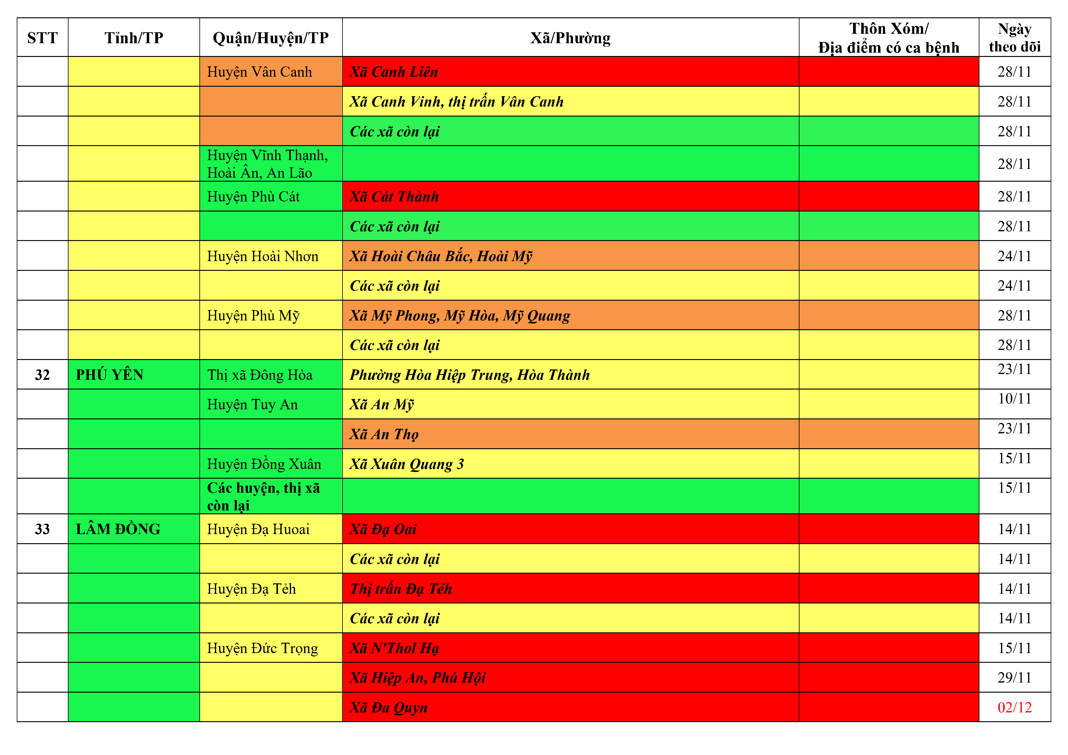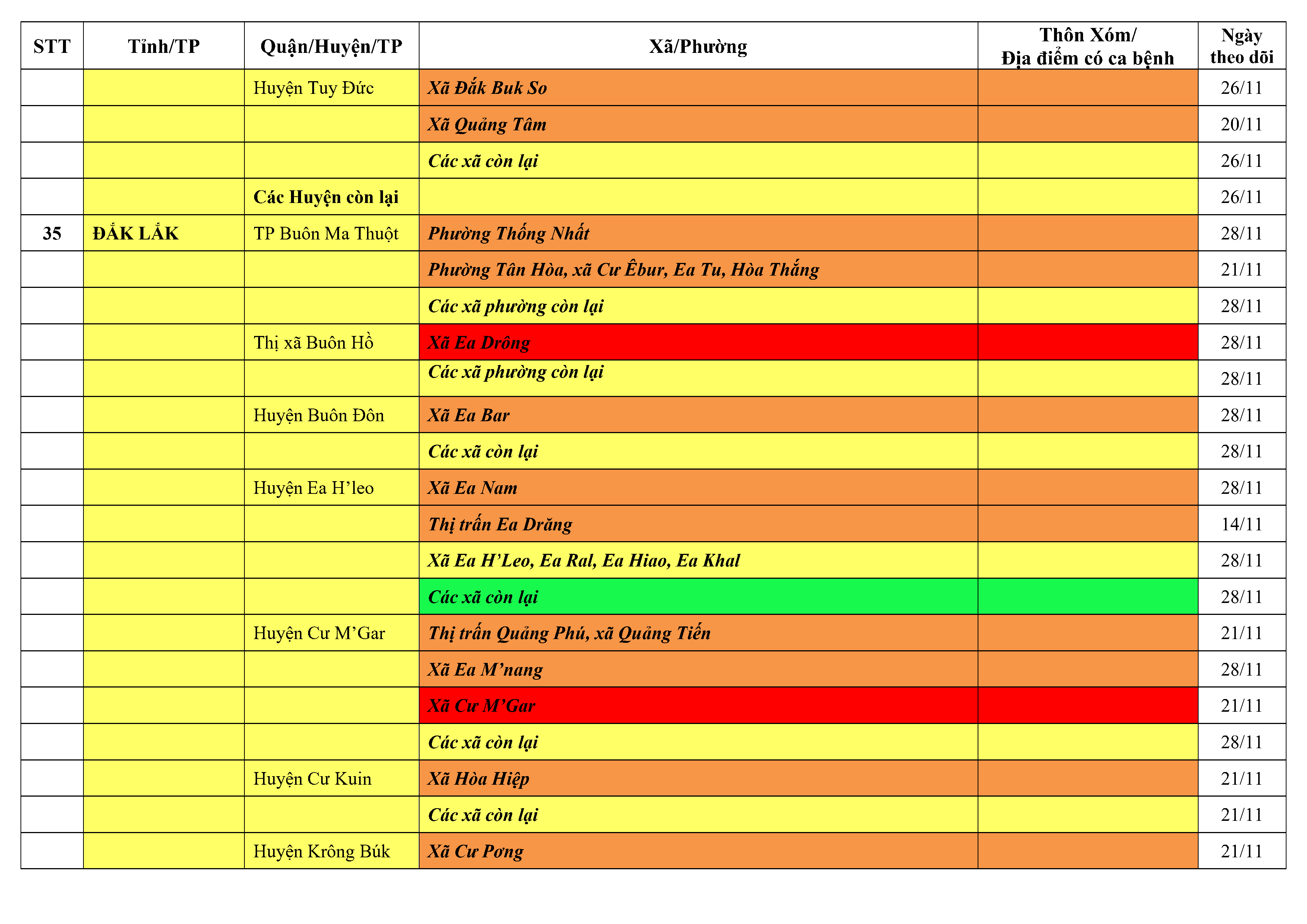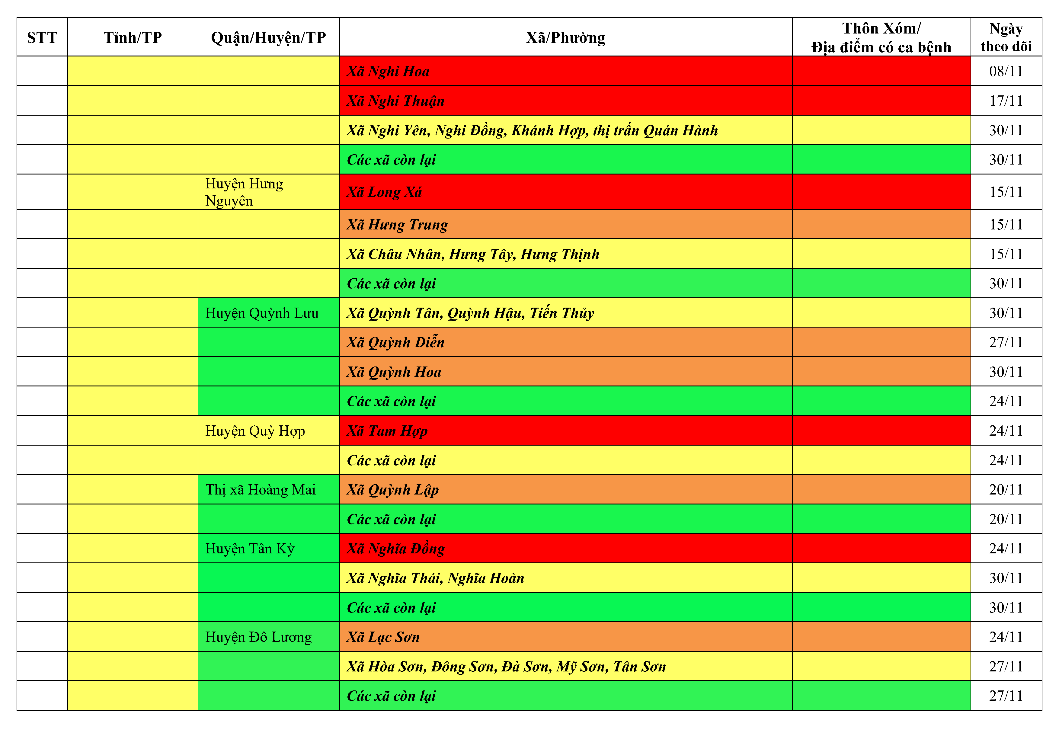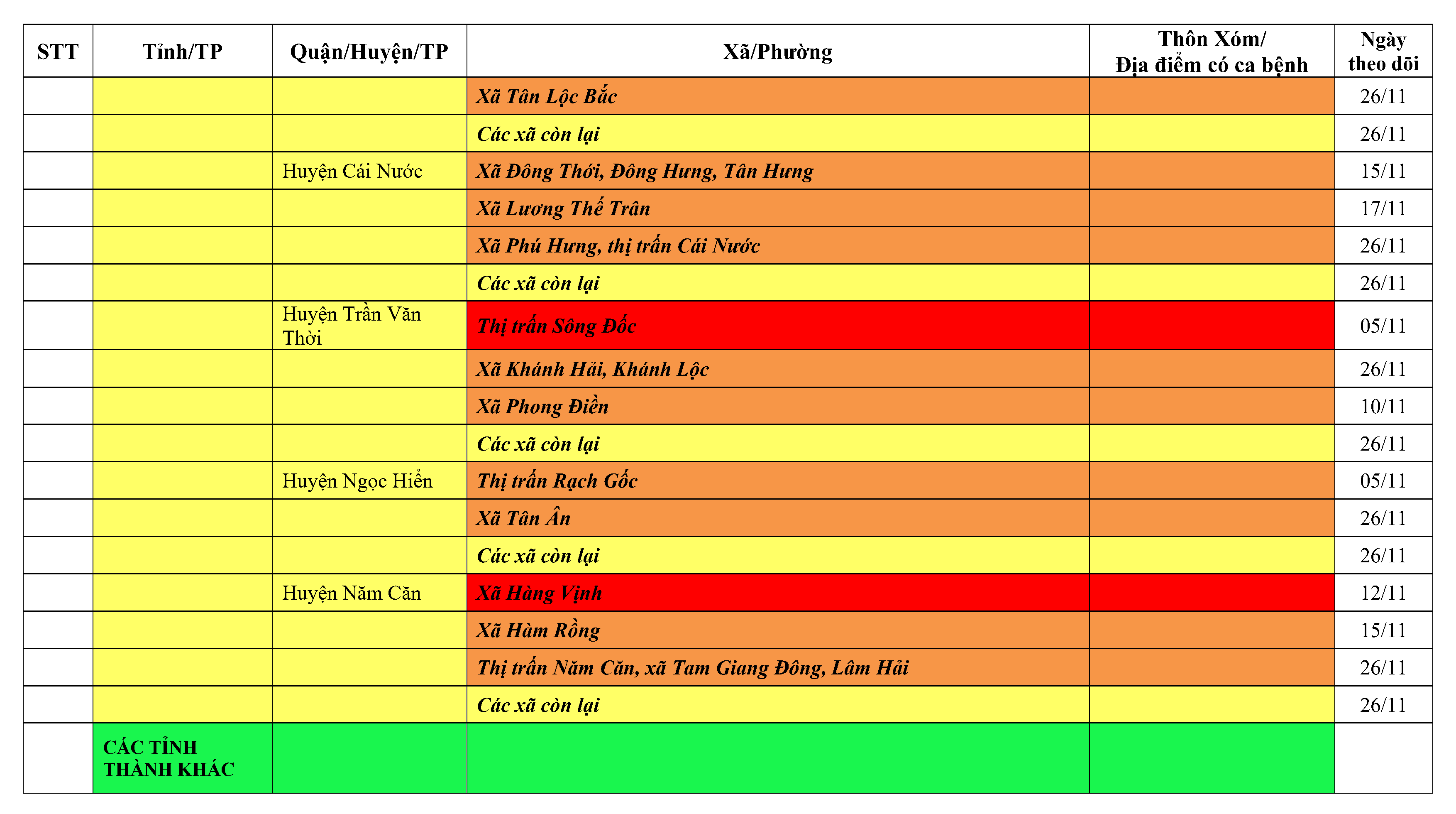 Lưu ý: Các tỉnh, thành phố không có tên trong bảng màu, đi lại bình thường, tuân thủ các biện pháp phòng chống dịch theo chỉ đạo của Bộ Y tế; khai báo y tế, thực hiện nghiêm 5K.