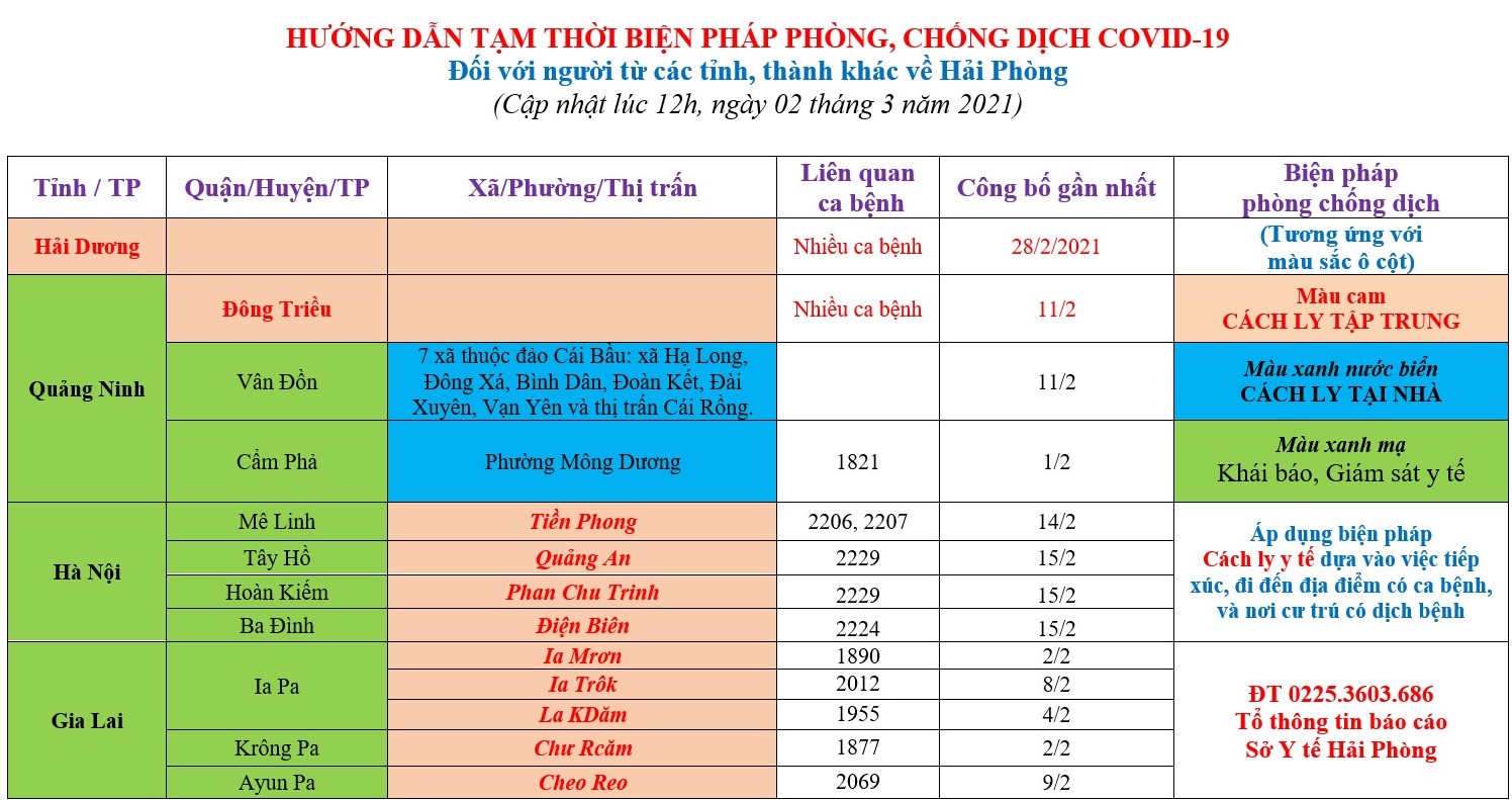 Sở Y tế Hải Phòng ban hành hướng dẫn tạm thời biện pháp phòng chống dịch COVID-19 đối với người từ các tỉnh, thành khác về thành phố như sau (thông tin cập nhật vào 12h00’ ngày 02/3/2021):