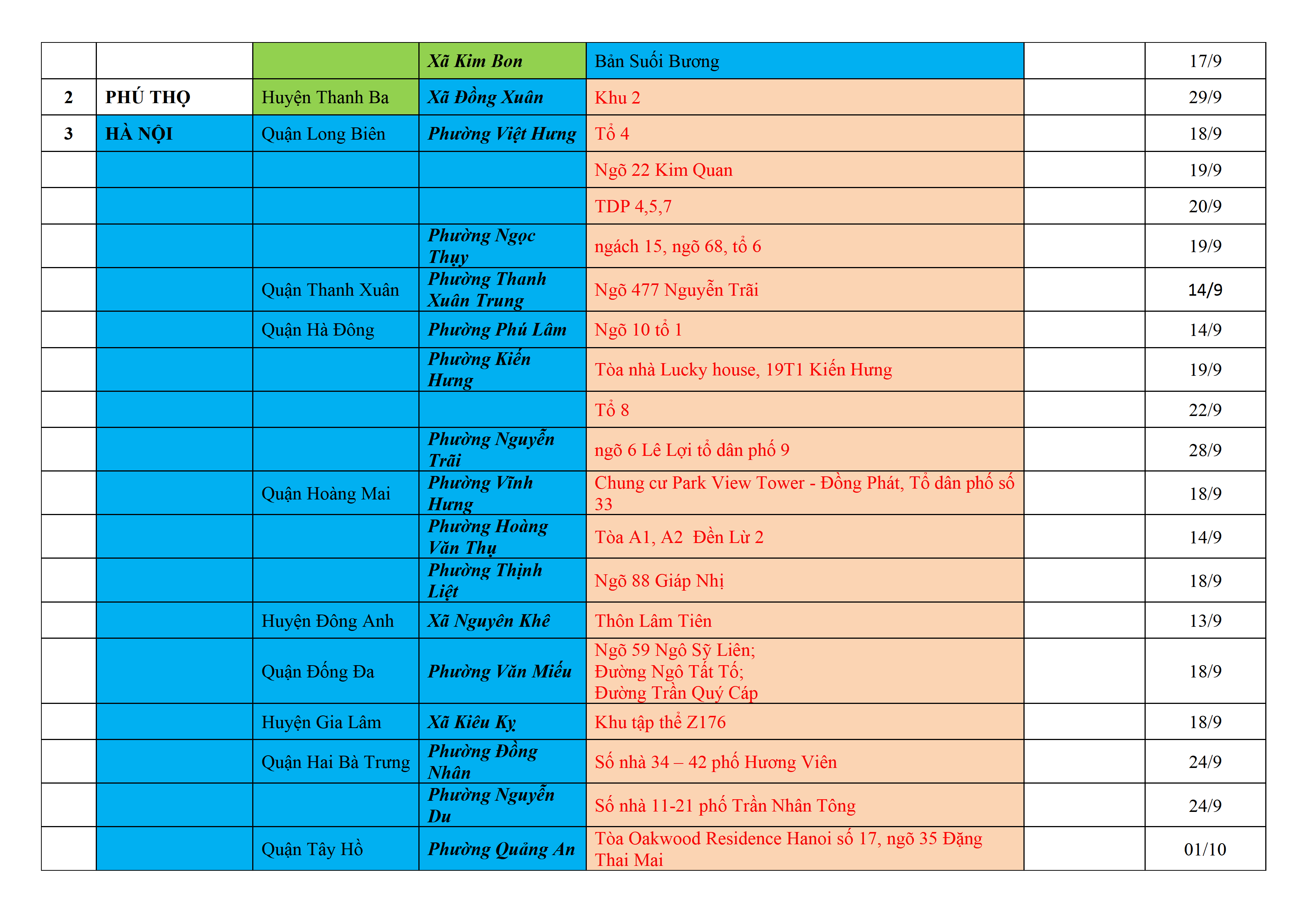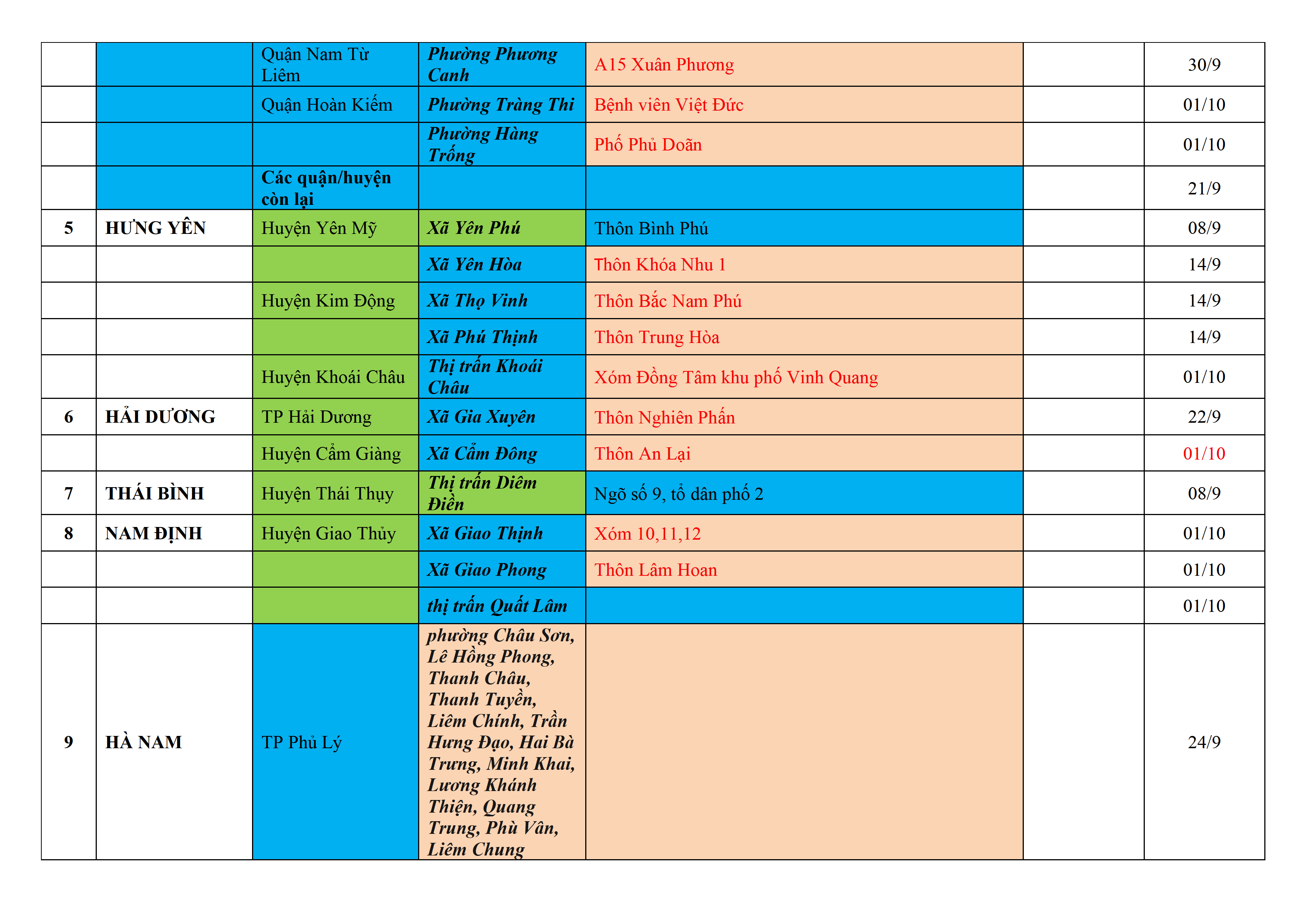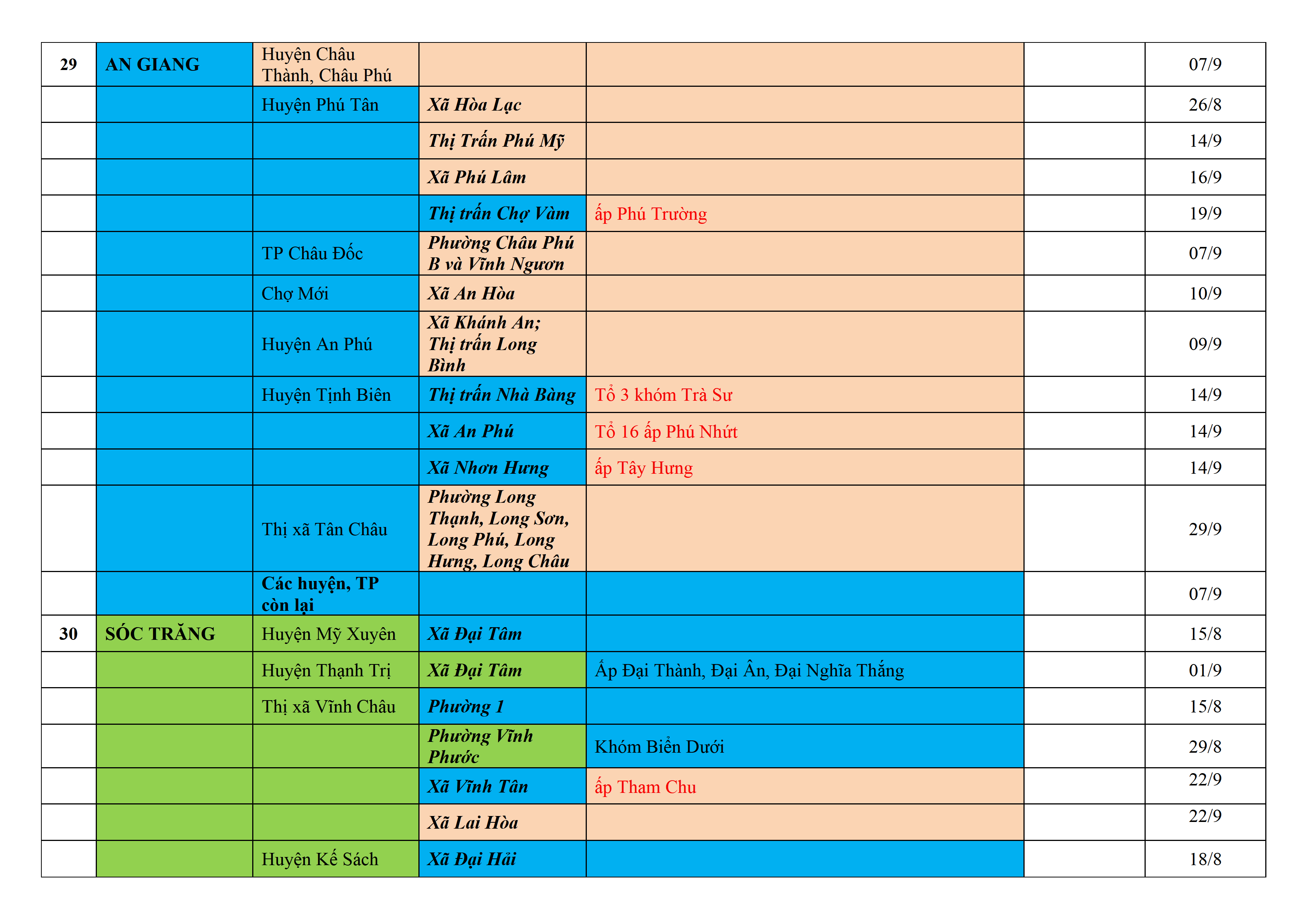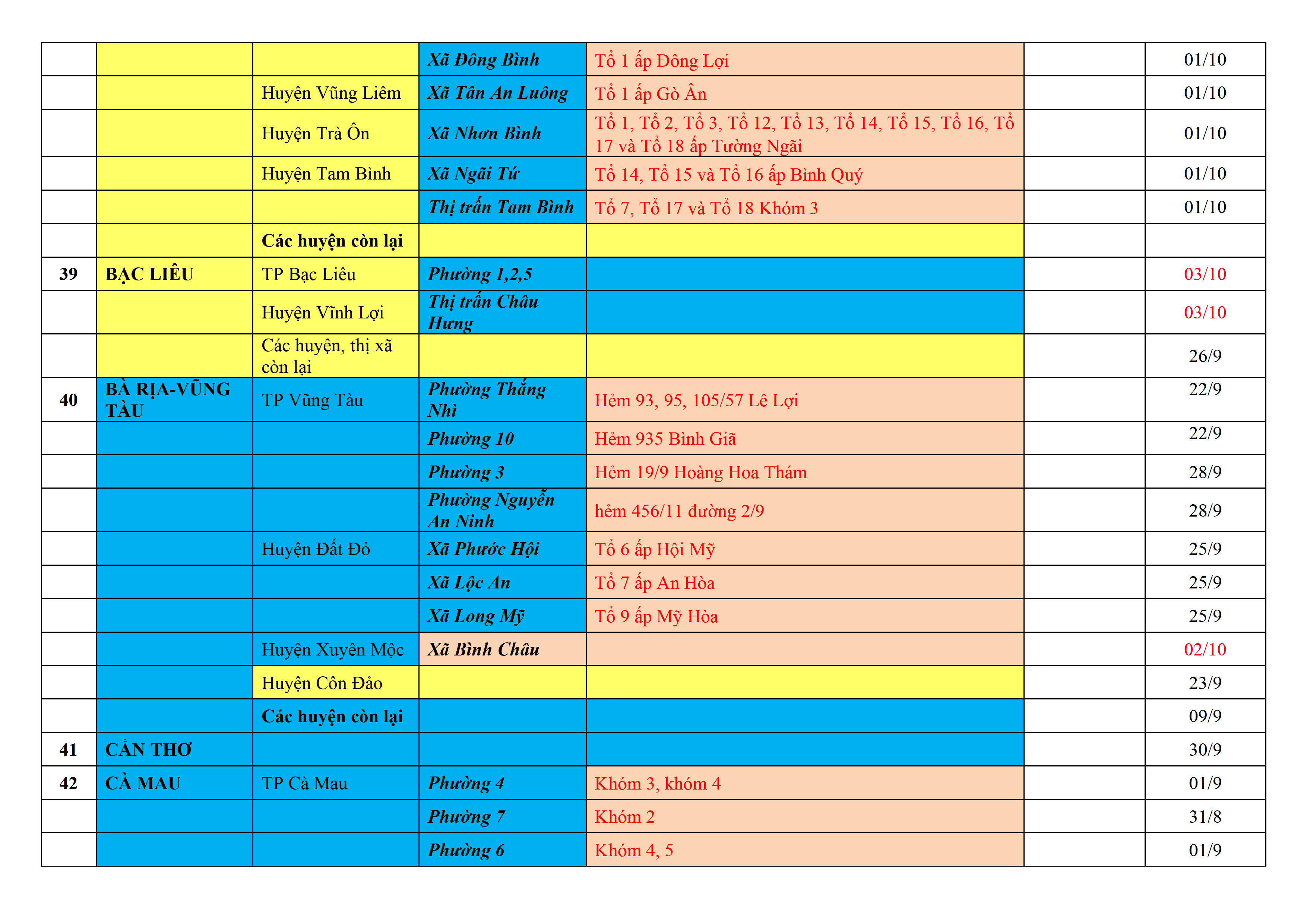 Biện pháp phòng, chống dịch COVID-19: Áp dụng biện pháp tương ứng màu sắc ô cột theo thôn xóm; xã phường; quận huyện; tỉnh thành phố. Cách ly y tế dựa vào việc tiếp xúc, đi đến địa điểm và nơi cư trú có ca bệnh, theo Thông báo của Bộ Y tế, các tỉnh thành phố.