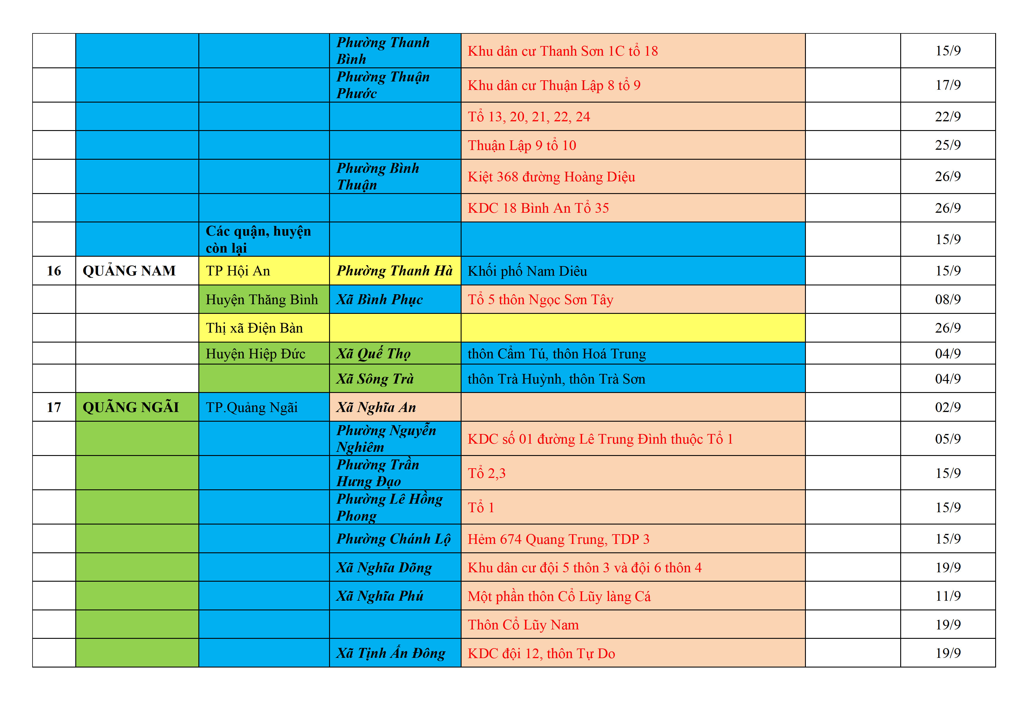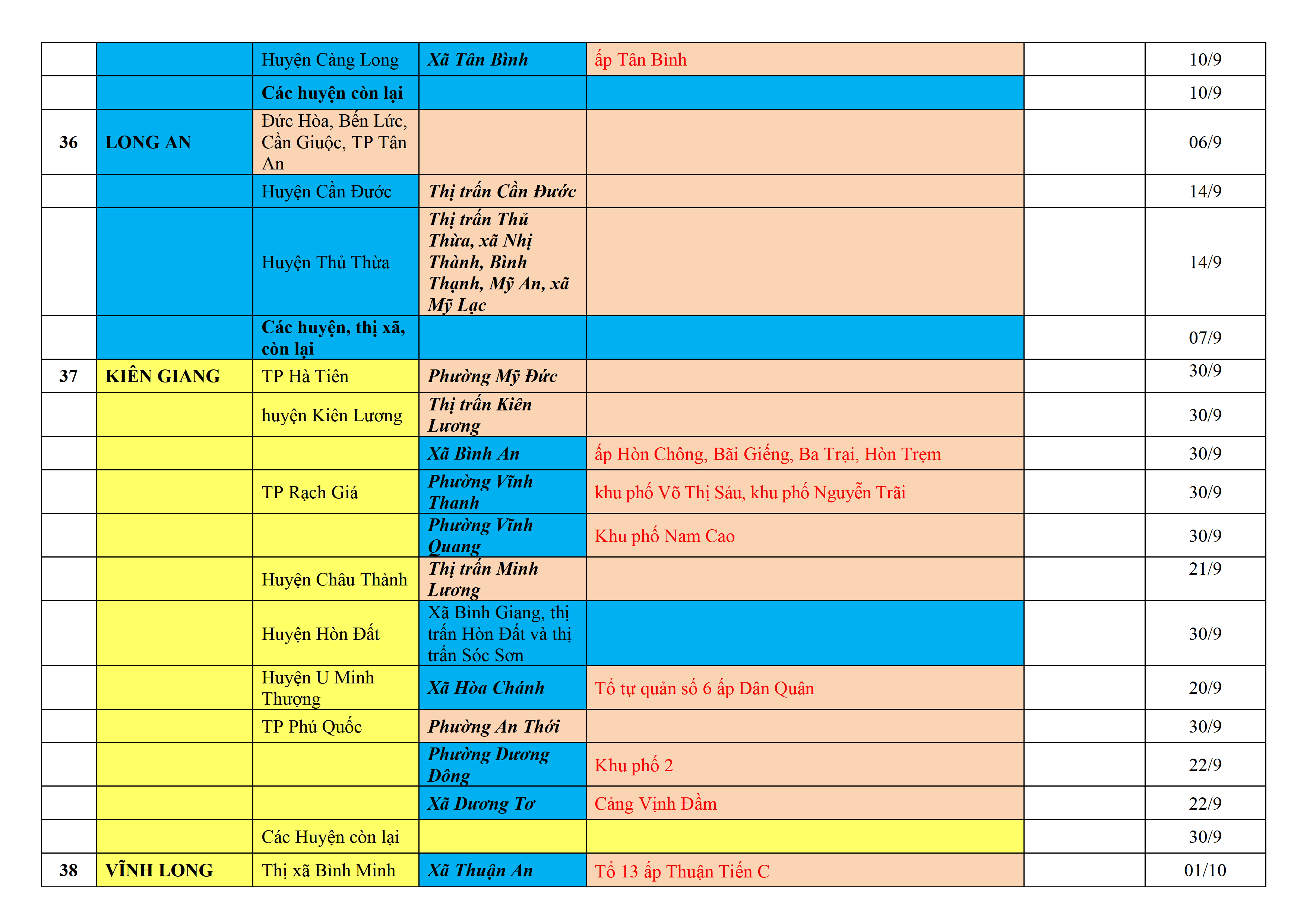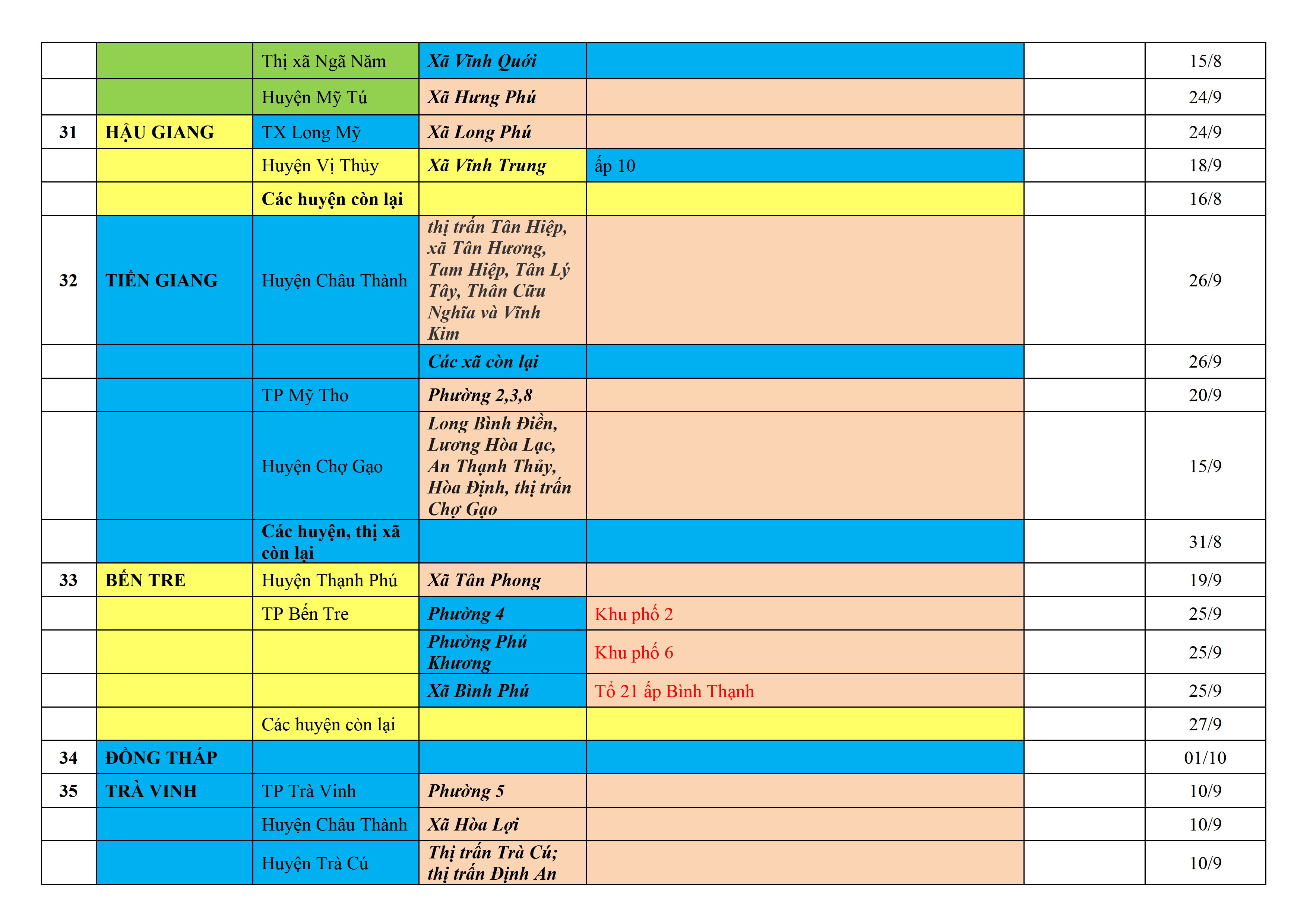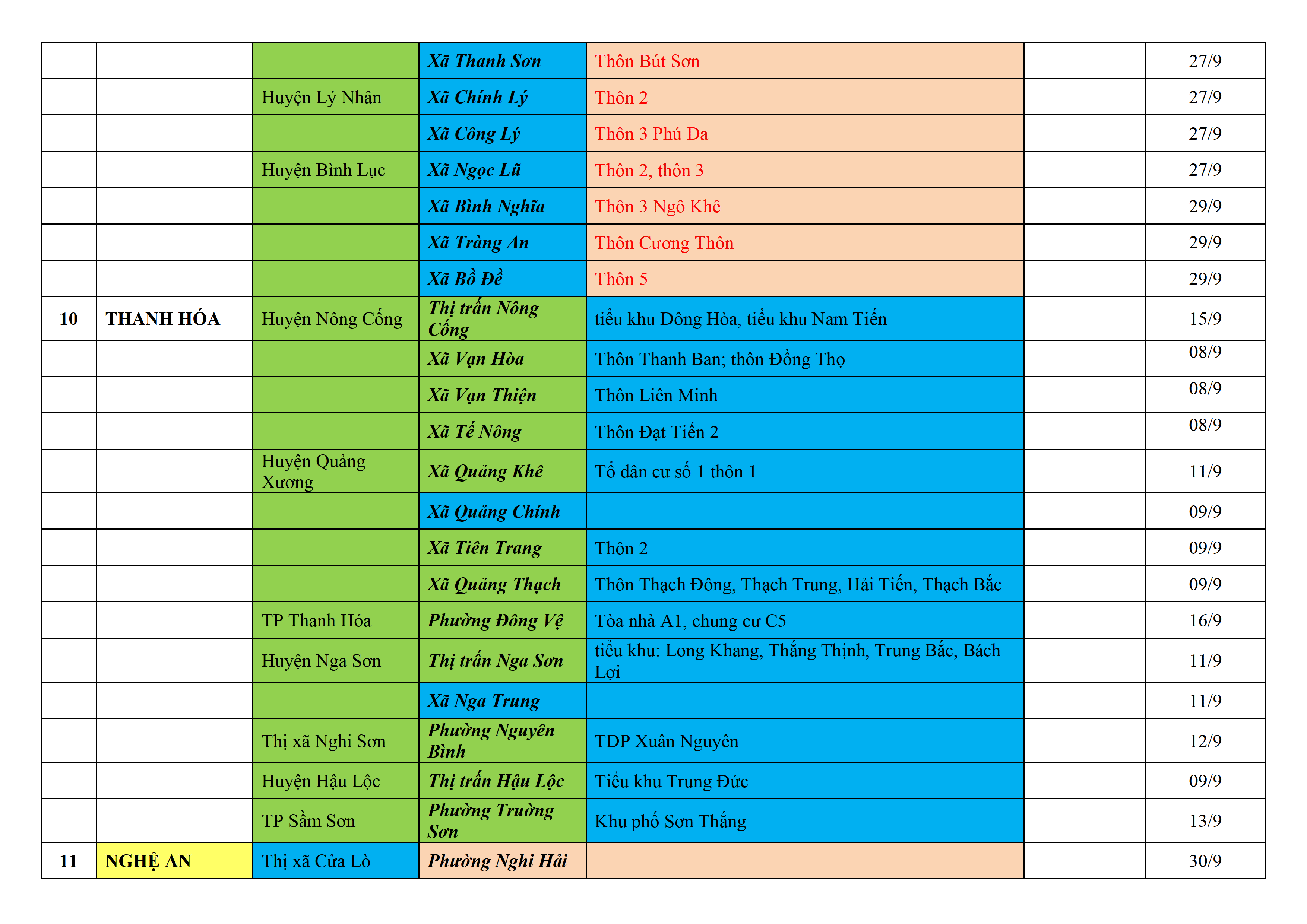 Biện pháp phòng, chống dịch COVID-19: Áp dụng biện pháp tương ứng màu sắc ô cột theo thôn xóm; xã phường; quận huyện; tỉnh thành phố. Cách ly y tế dựa vào việc tiếp xúc, đi đến địa điểm và nơi cư trú có ca bệnh, theo Thông báo của Bộ Y tế, các tỉnh thành phố.
