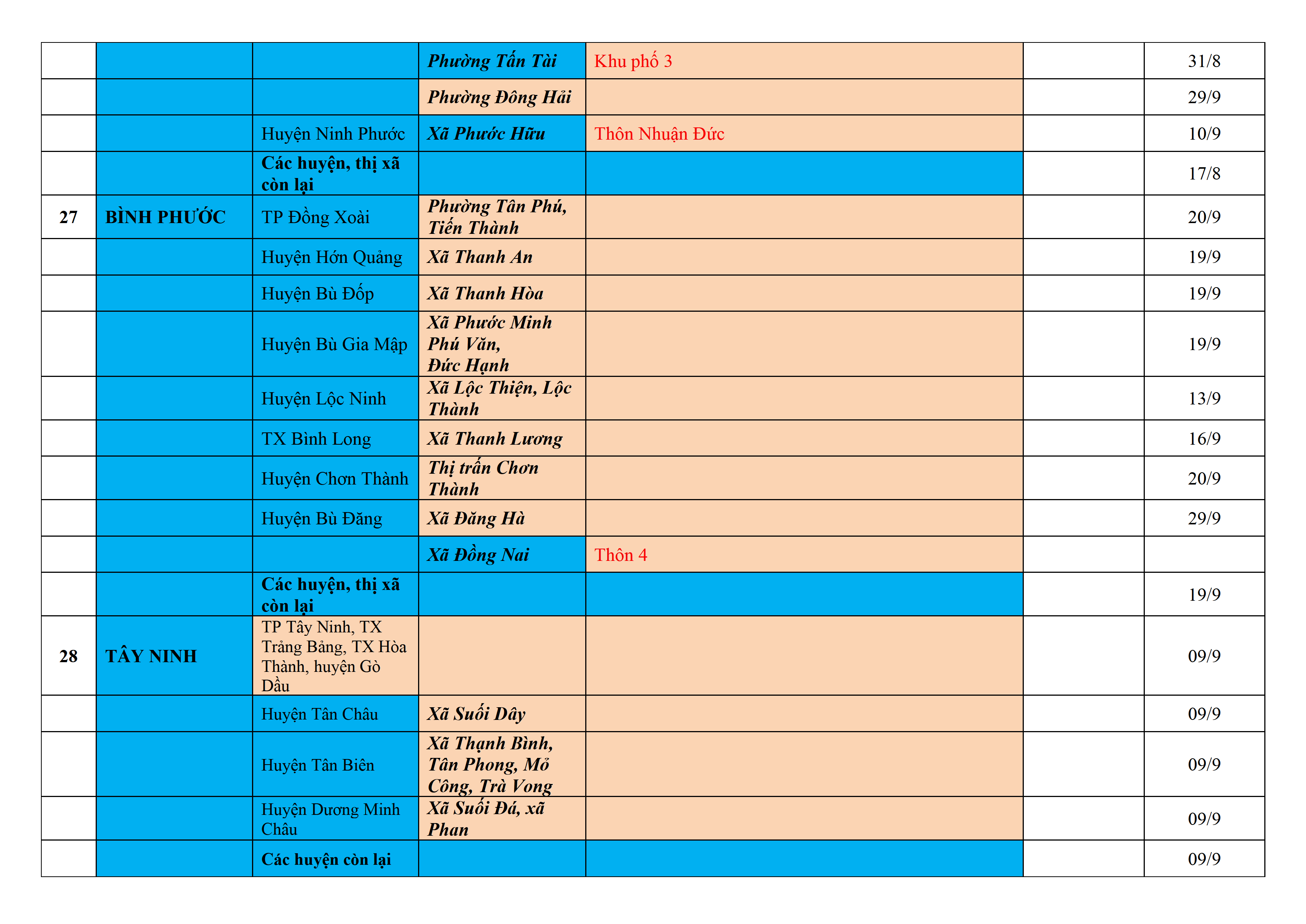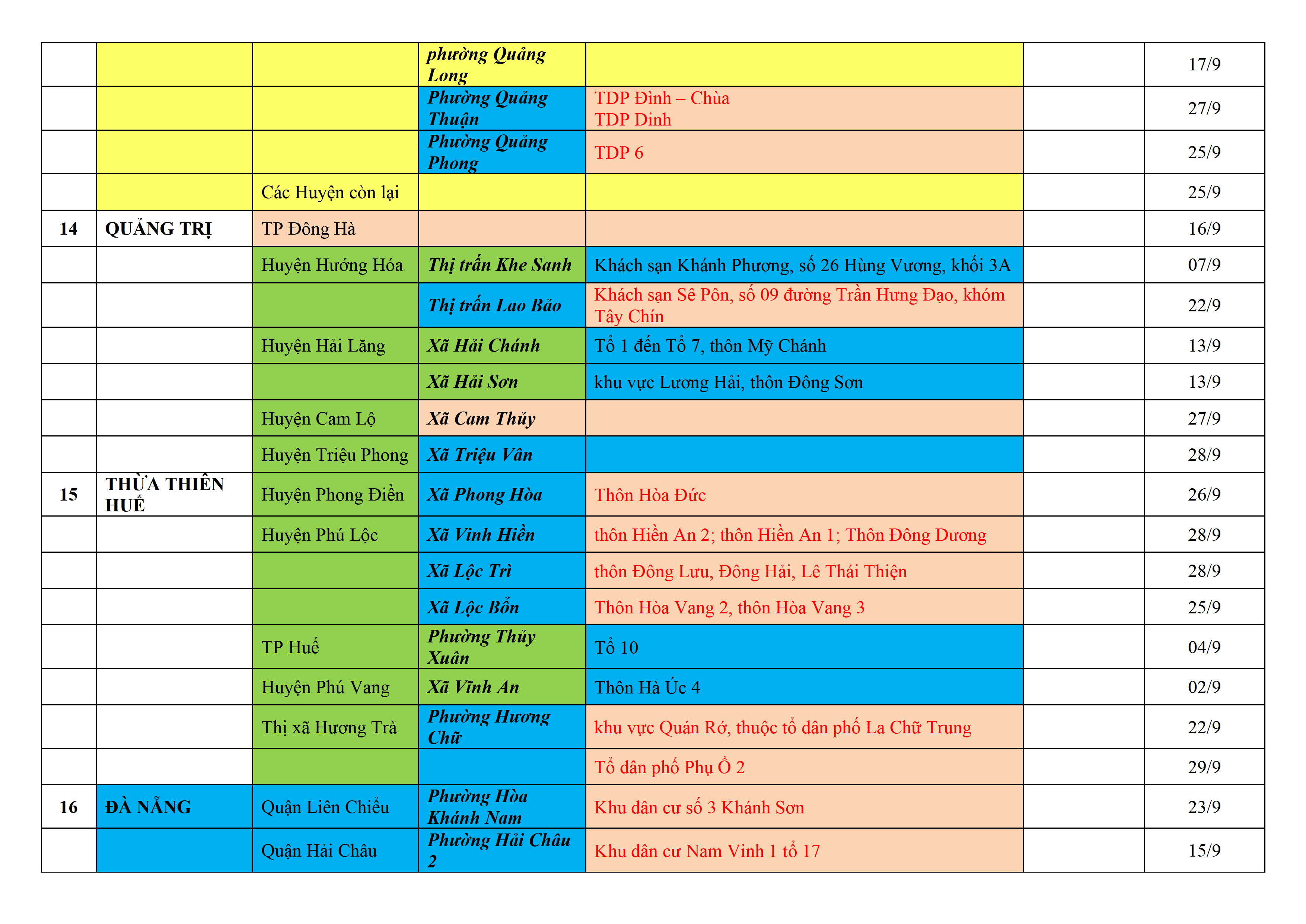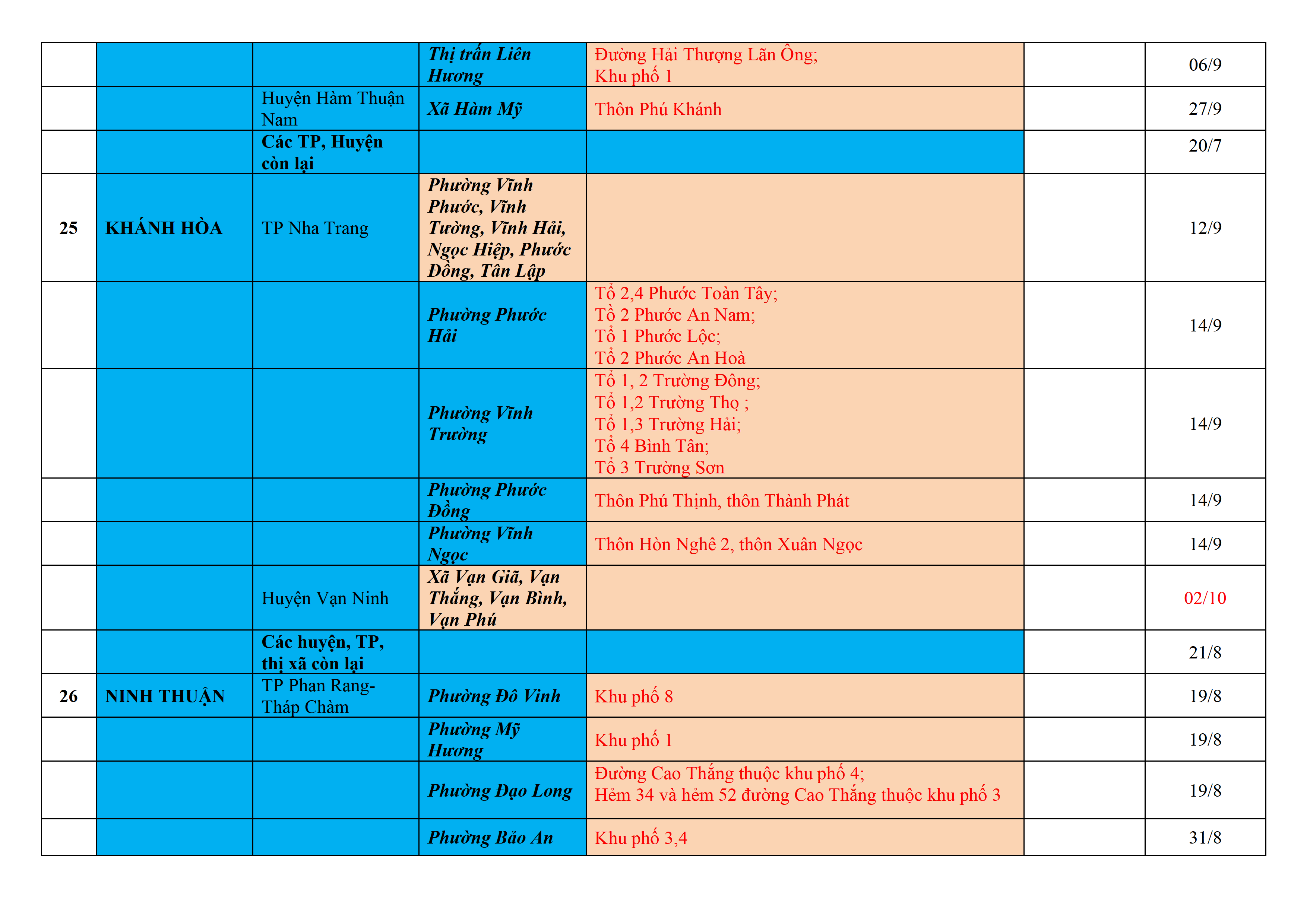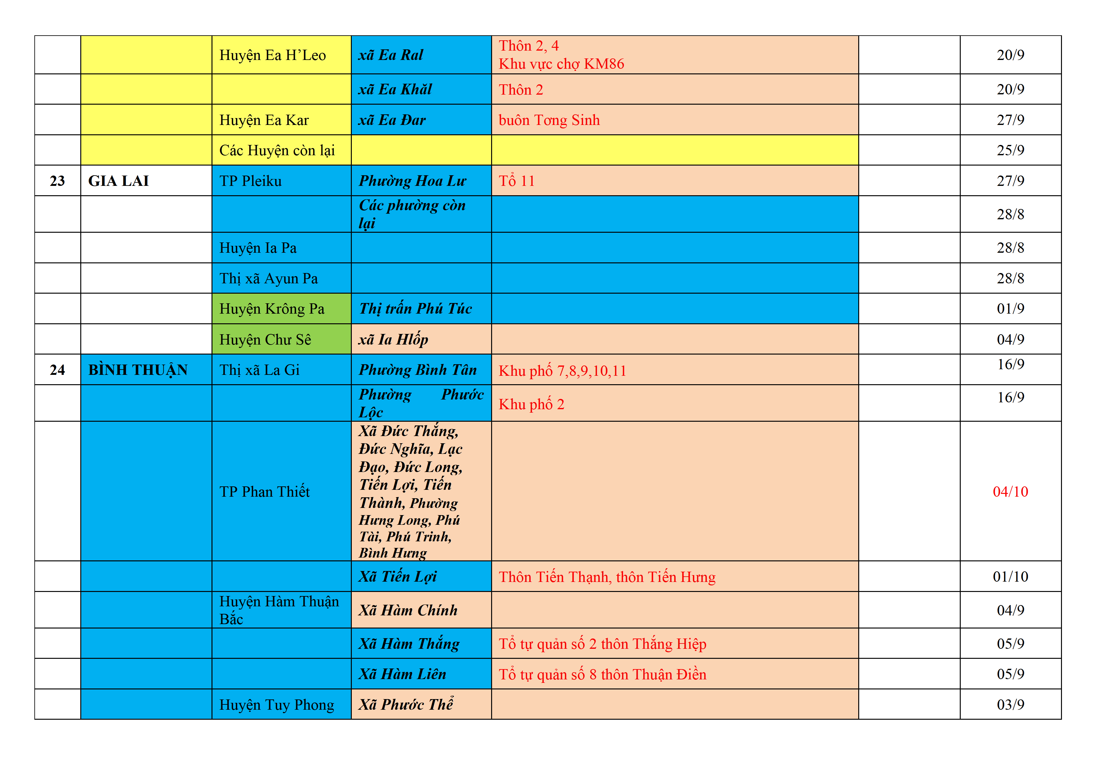 Biện pháp phòng, chống dịch COVID-19: Áp dụng biện pháp tương ứng màu sắc ô cột theo thôn xóm; xã phường; quận huyện; tỉnh thành phố. Cách ly y tế dựa vào việc tiếp xúc, đi đến địa điểm và nơi cư trú có ca bệnh, theo Thông báo của Bộ Y tế, các tỉnh thành phố.