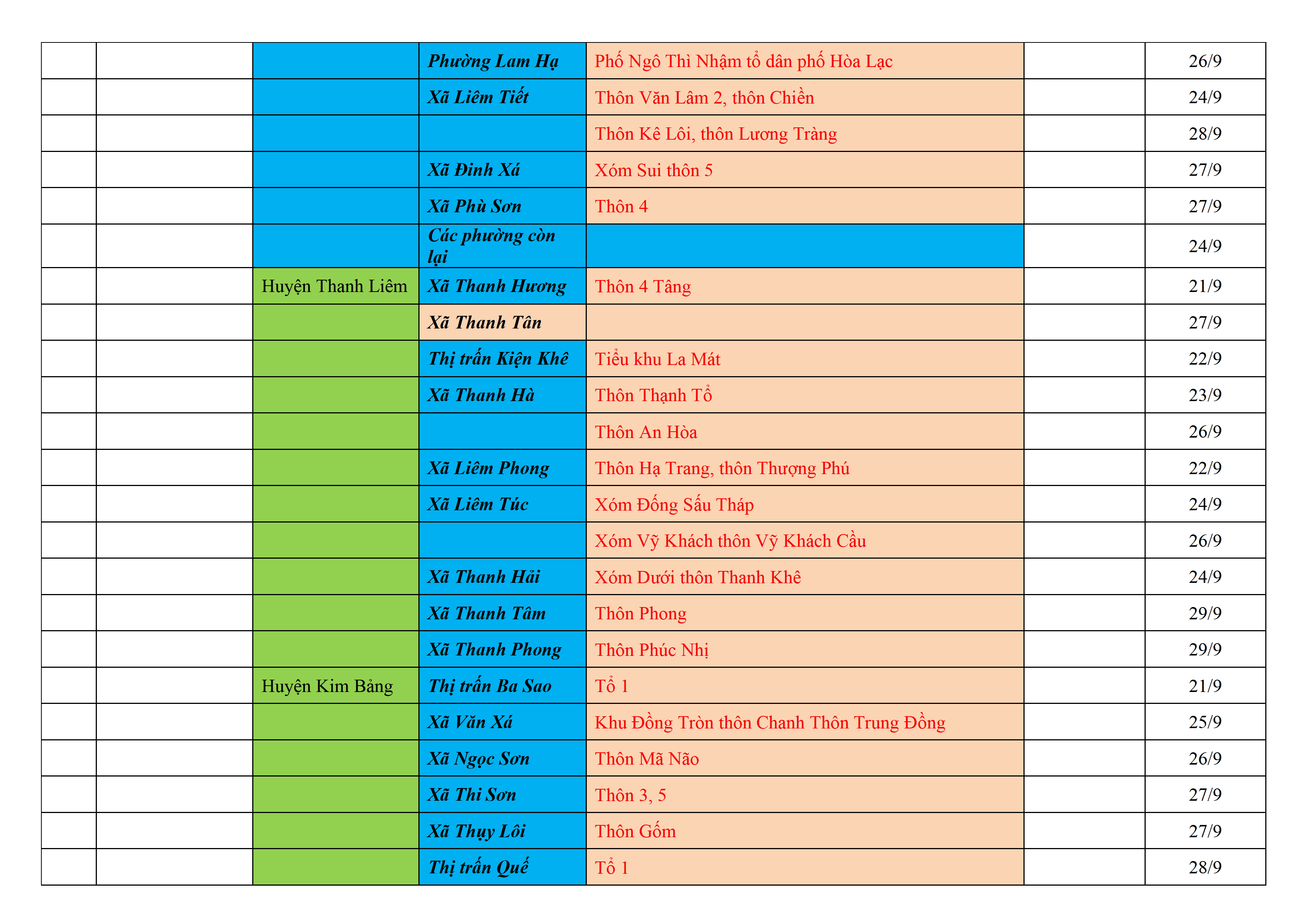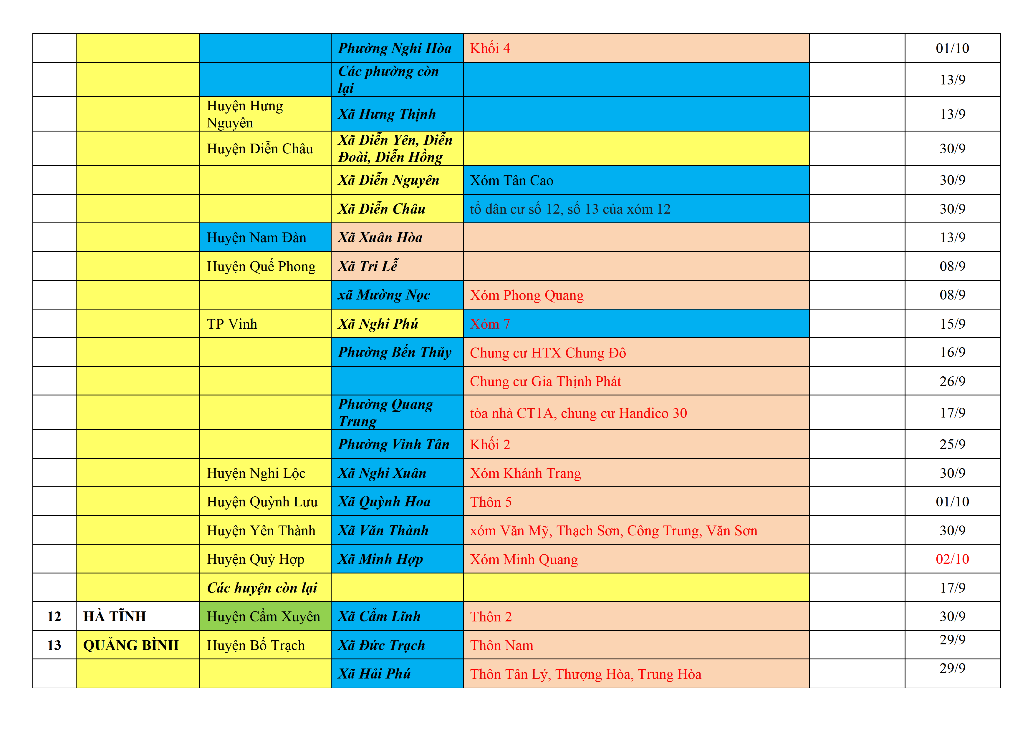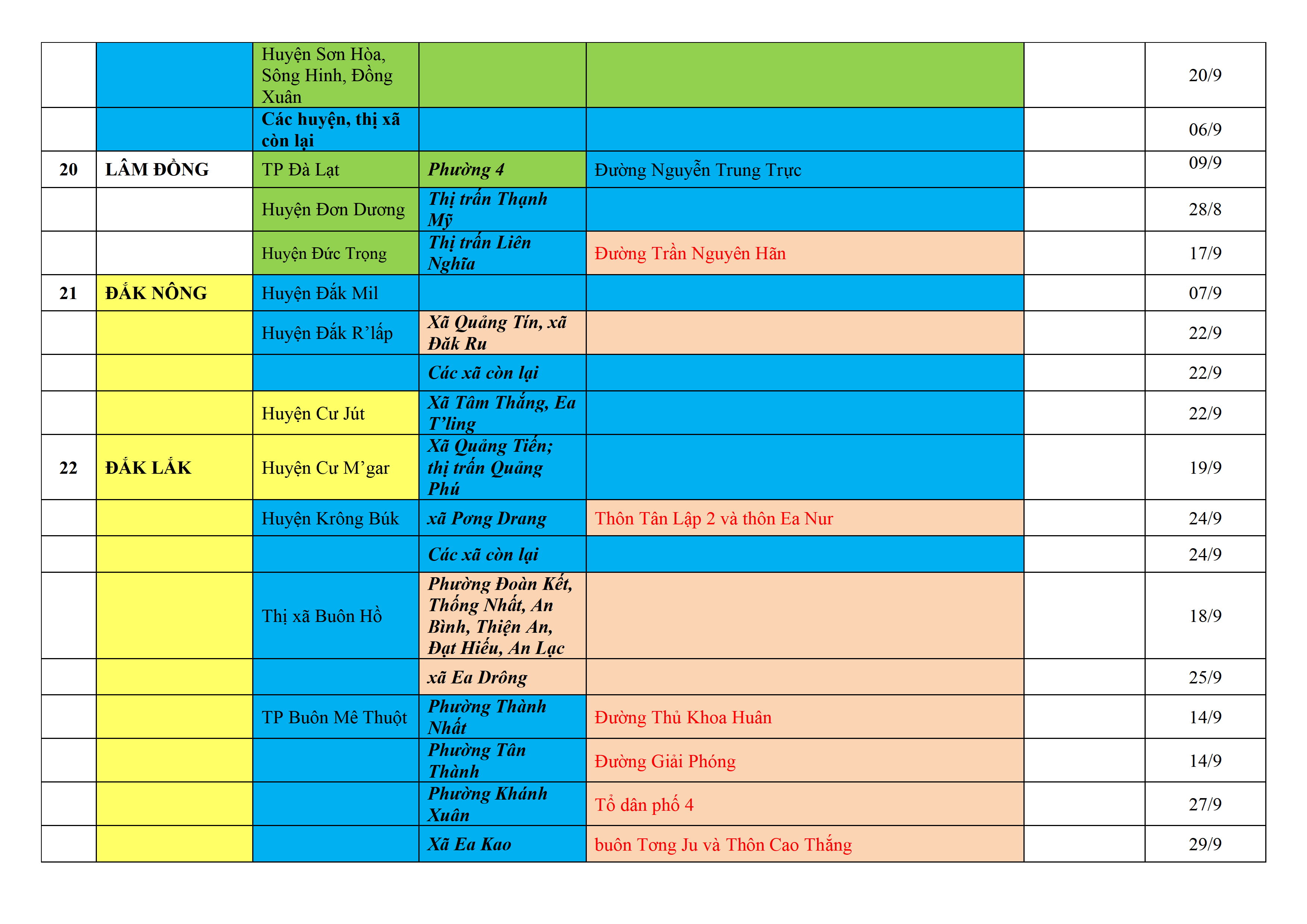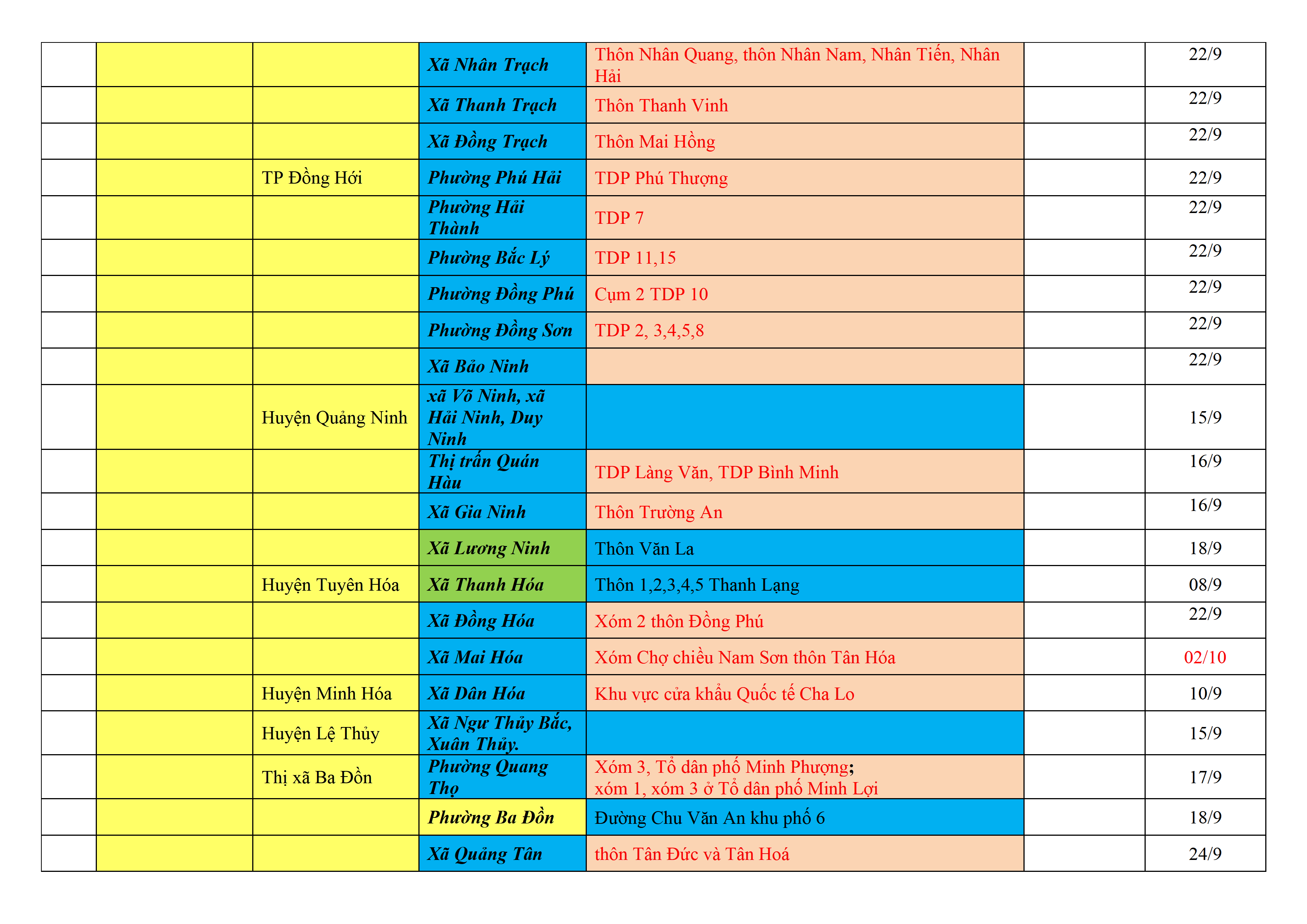 Biện pháp phòng, chống dịch COVID-19: Áp dụng biện pháp tương ứng màu sắc ô cột theo thôn xóm; xã phường; quận huyện; tỉnh thành phố. Cách ly y tế dựa vào việc tiếp xúc, đi đến địa điểm và nơi cư trú có ca bệnh, theo Thông báo của Bộ Y tế, các tỉnh thành phố.