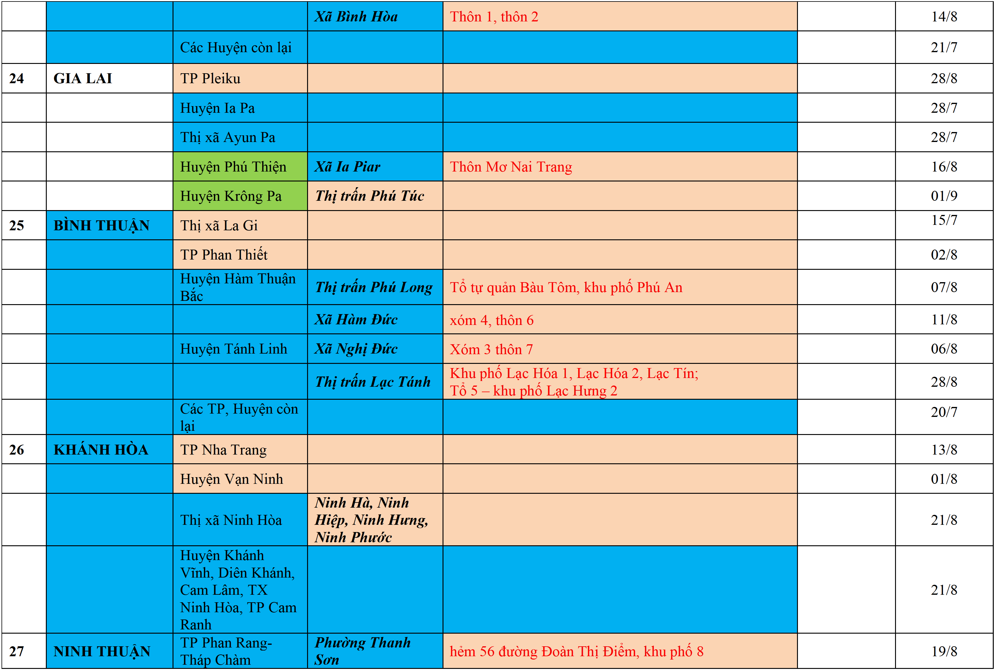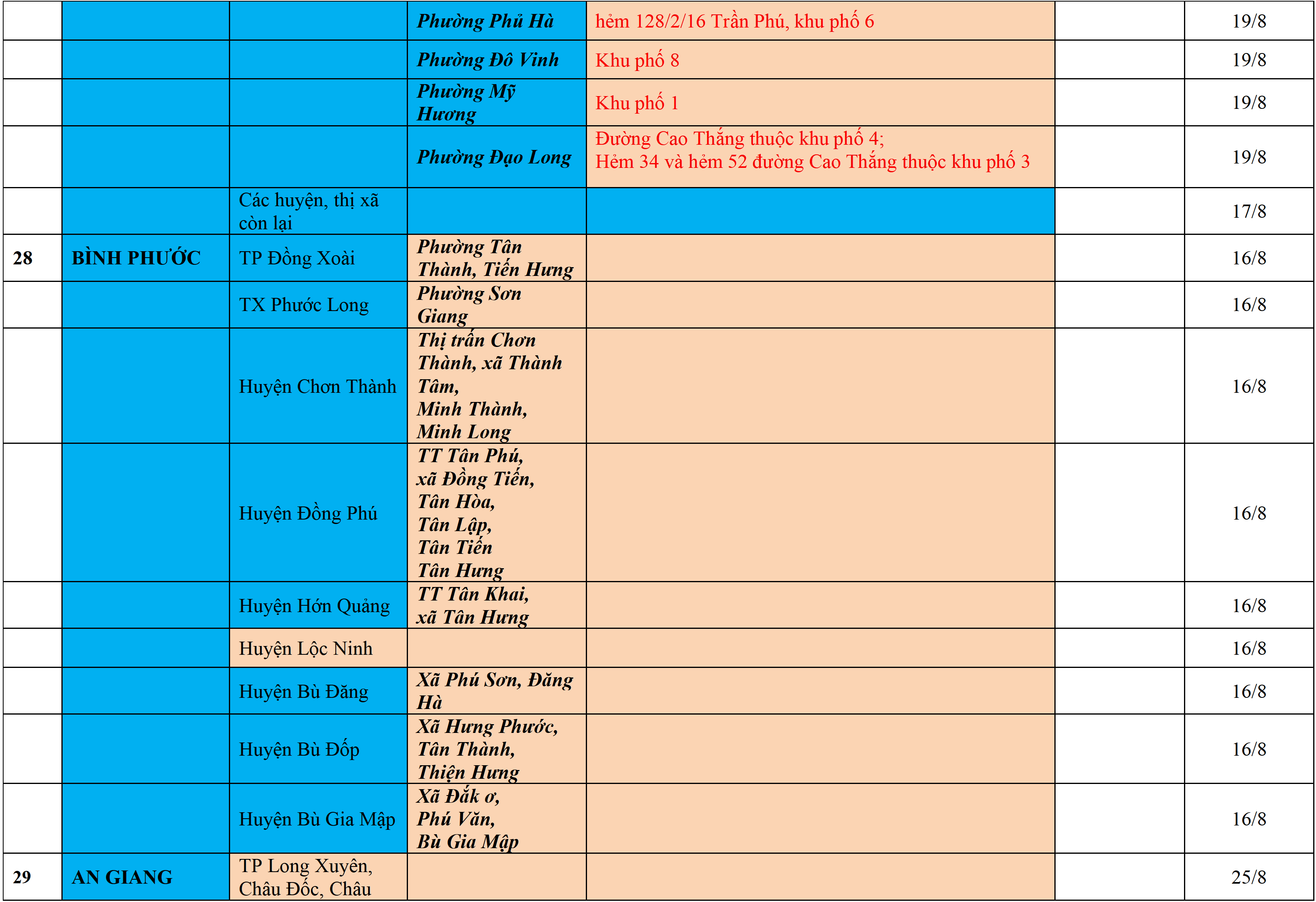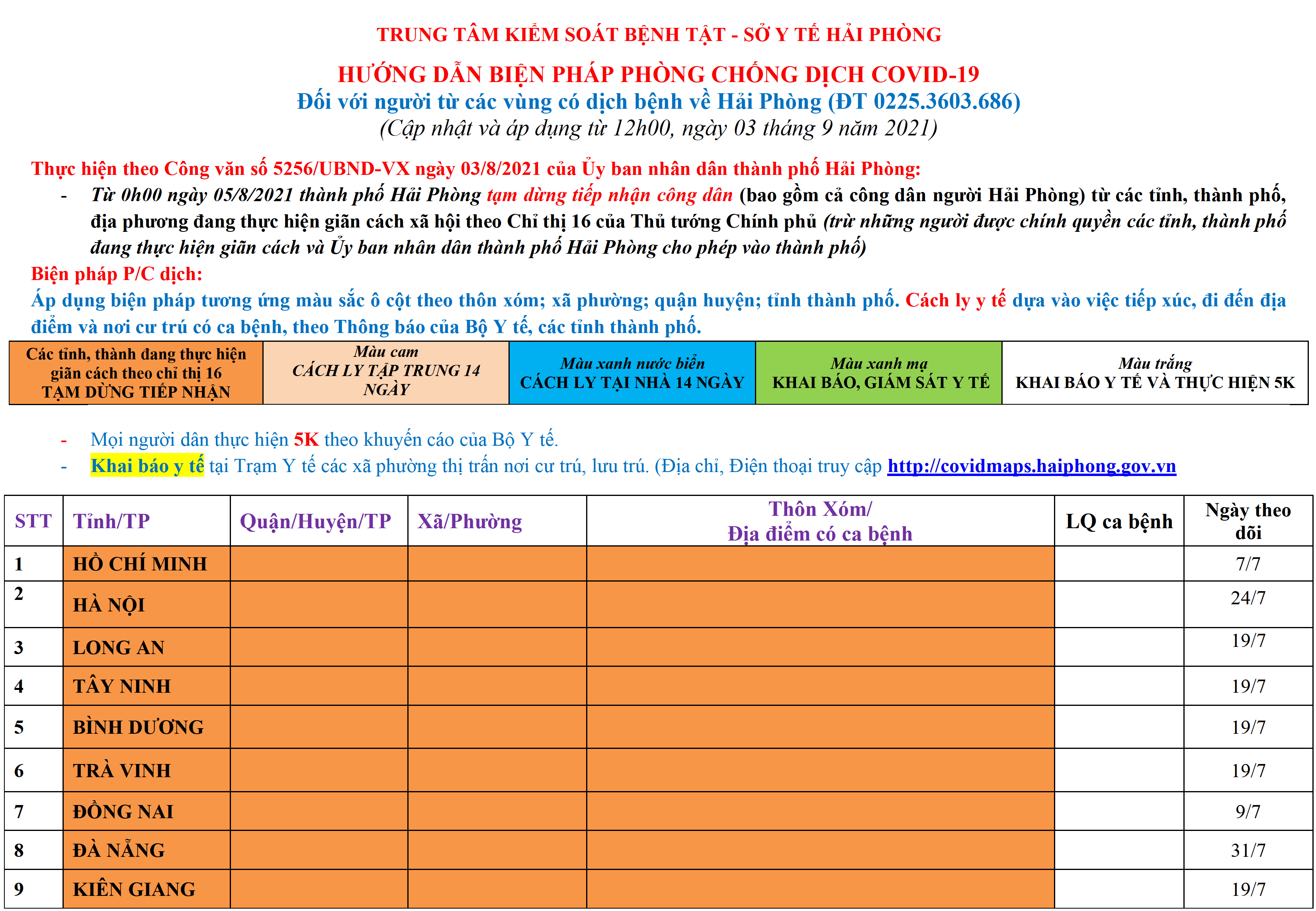 Màu nâu: TẠM DỪNG TIẾP NHẬN; Màu cam: CÁCH LY TẬP TRUNG 14 NGÀY; Màu xanh nước biển: CÁCH LY TẠI NHÀ 14 NGÀY; Màu xanh mạ: KHAI BÁO, GIÁM SÁT Y TẾ; Màu trắng: KHAI BÁO Y TẾ VÀ THỰC HIỆN 5K.