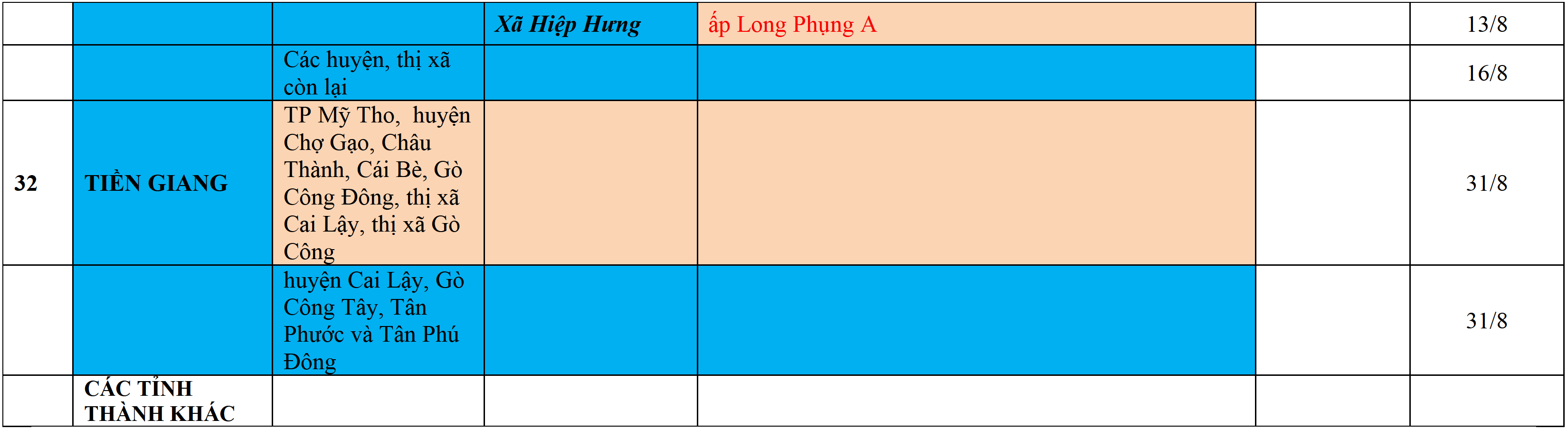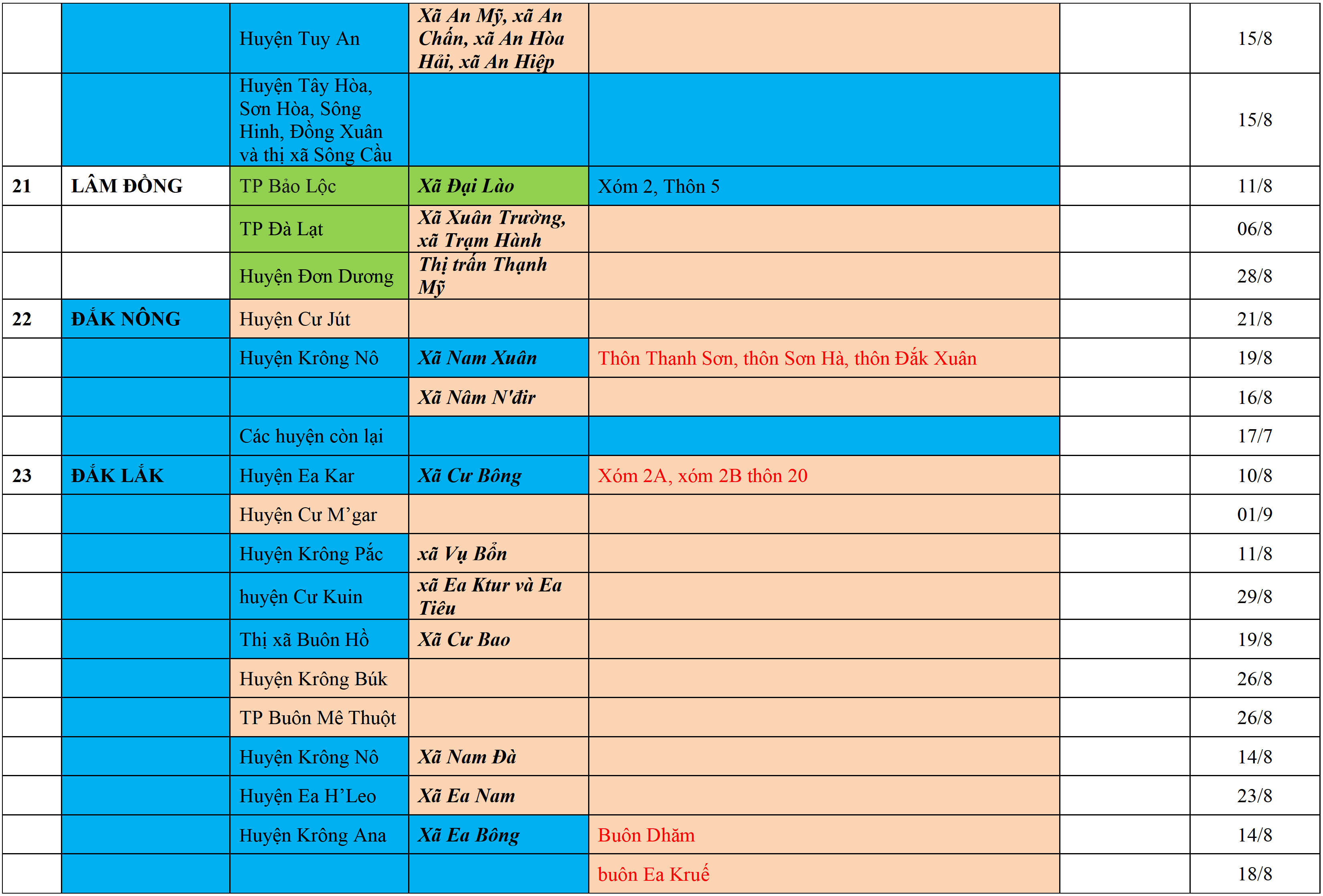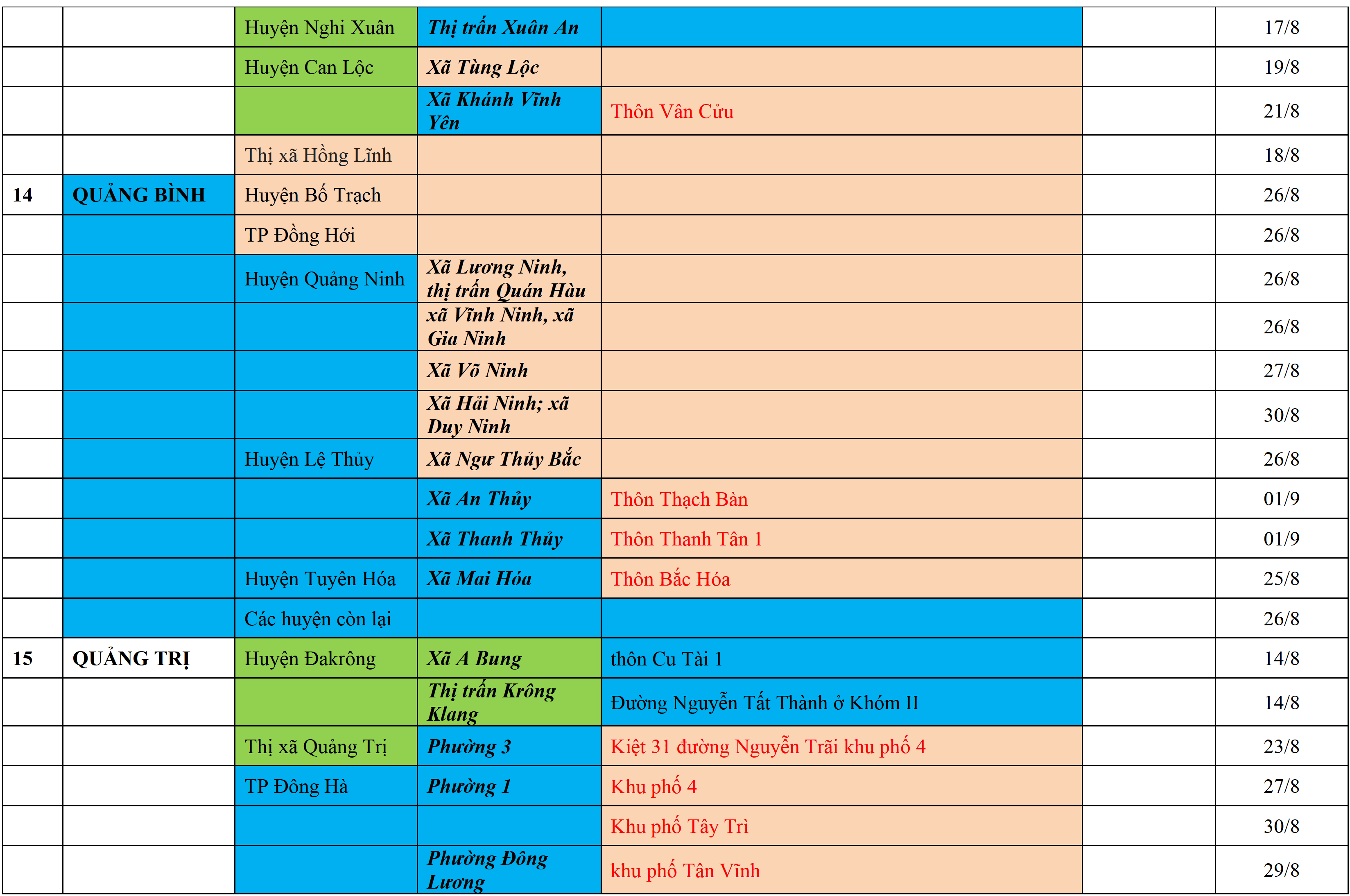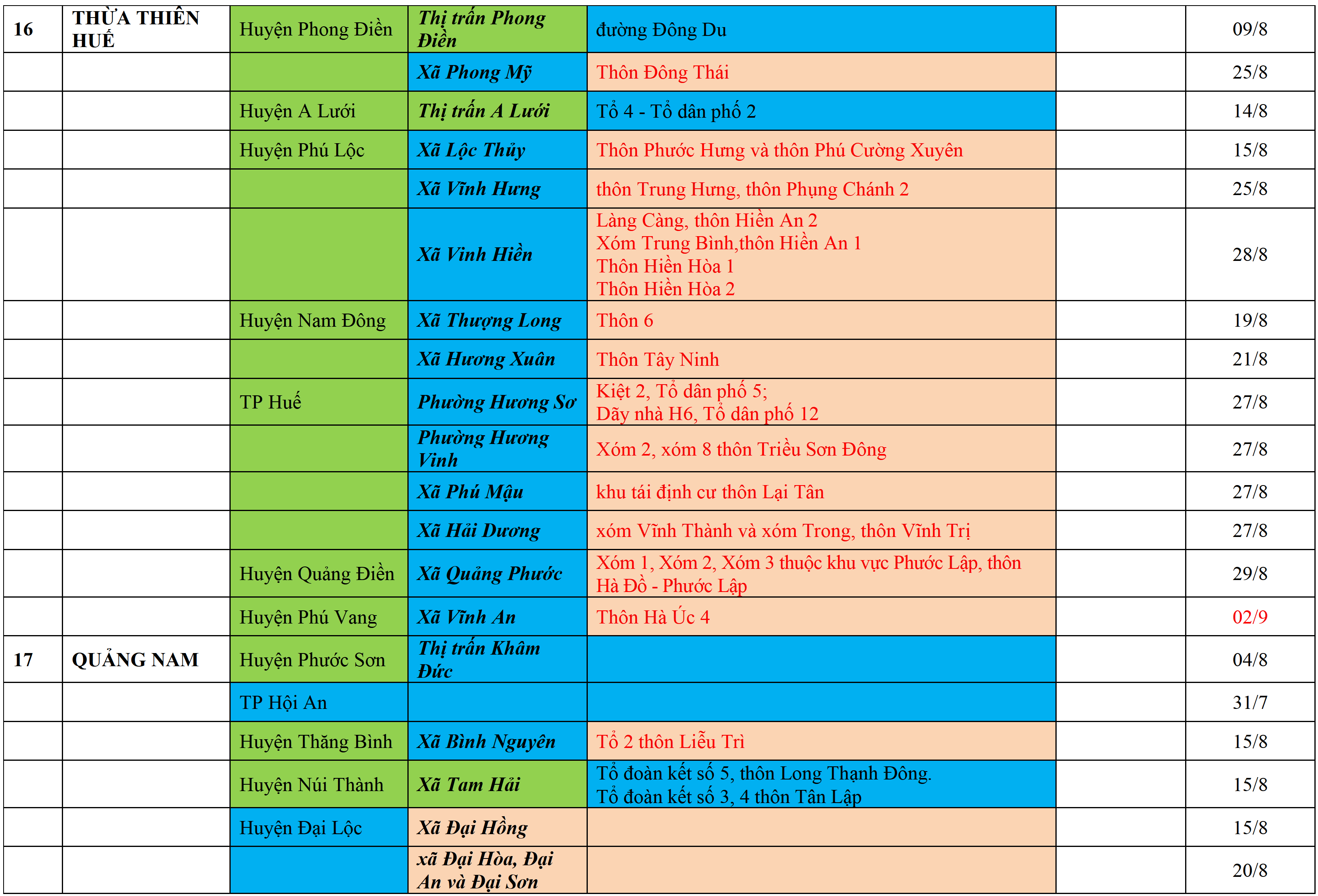 Màu nâu: TẠM DỪNG TIẾP NHẬN; Màu cam: CÁCH LY TẬP TRUNG 14 NGÀY; Màu xanh nước biển: CÁCH LY TẠI NHÀ 14 NGÀY; Màu xanh mạ: KHAI BÁO, GIÁM SÁT Y TẾ; Màu trắng: KHAI BÁO Y TẾ VÀ THỰC HIỆN 5K.