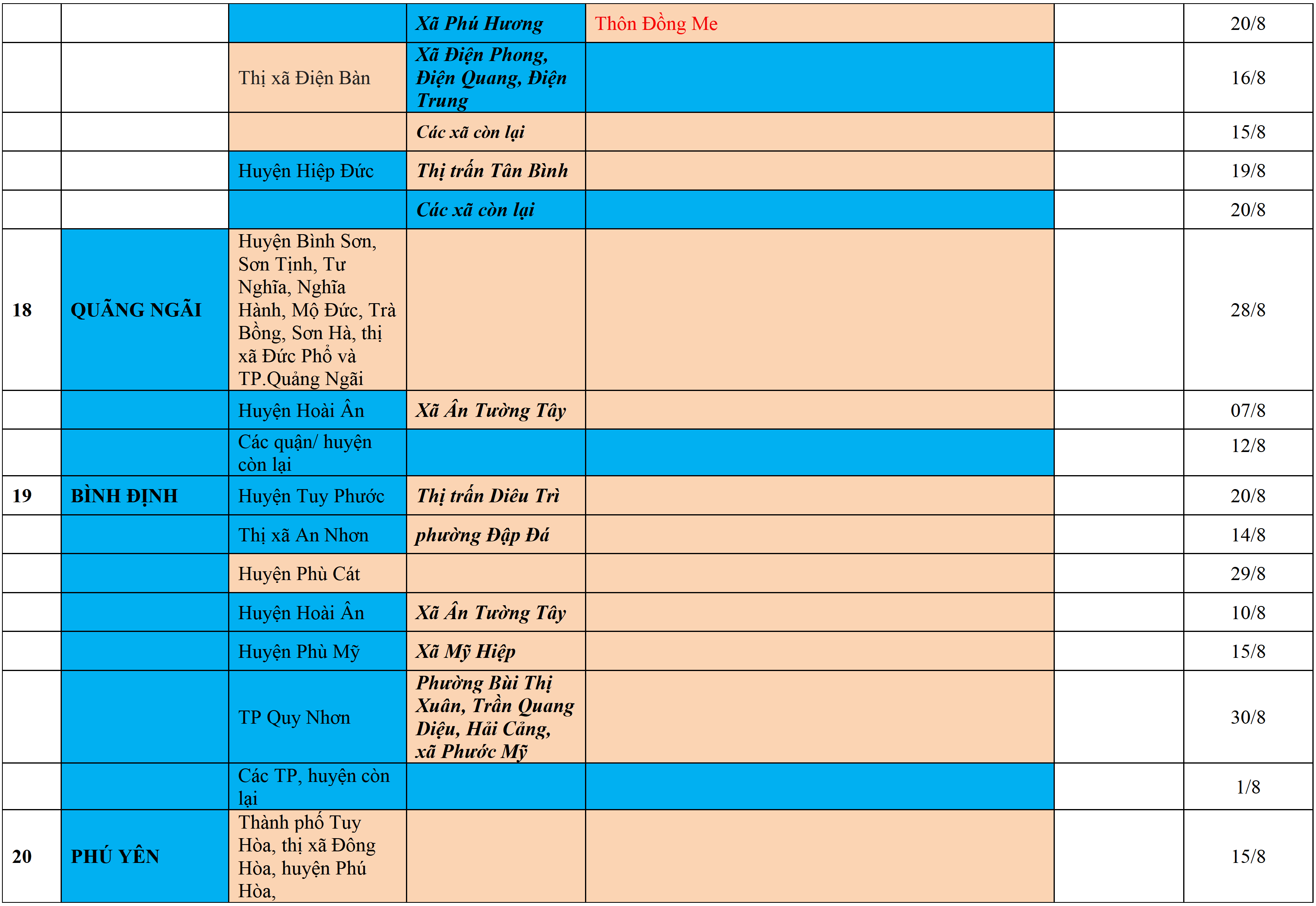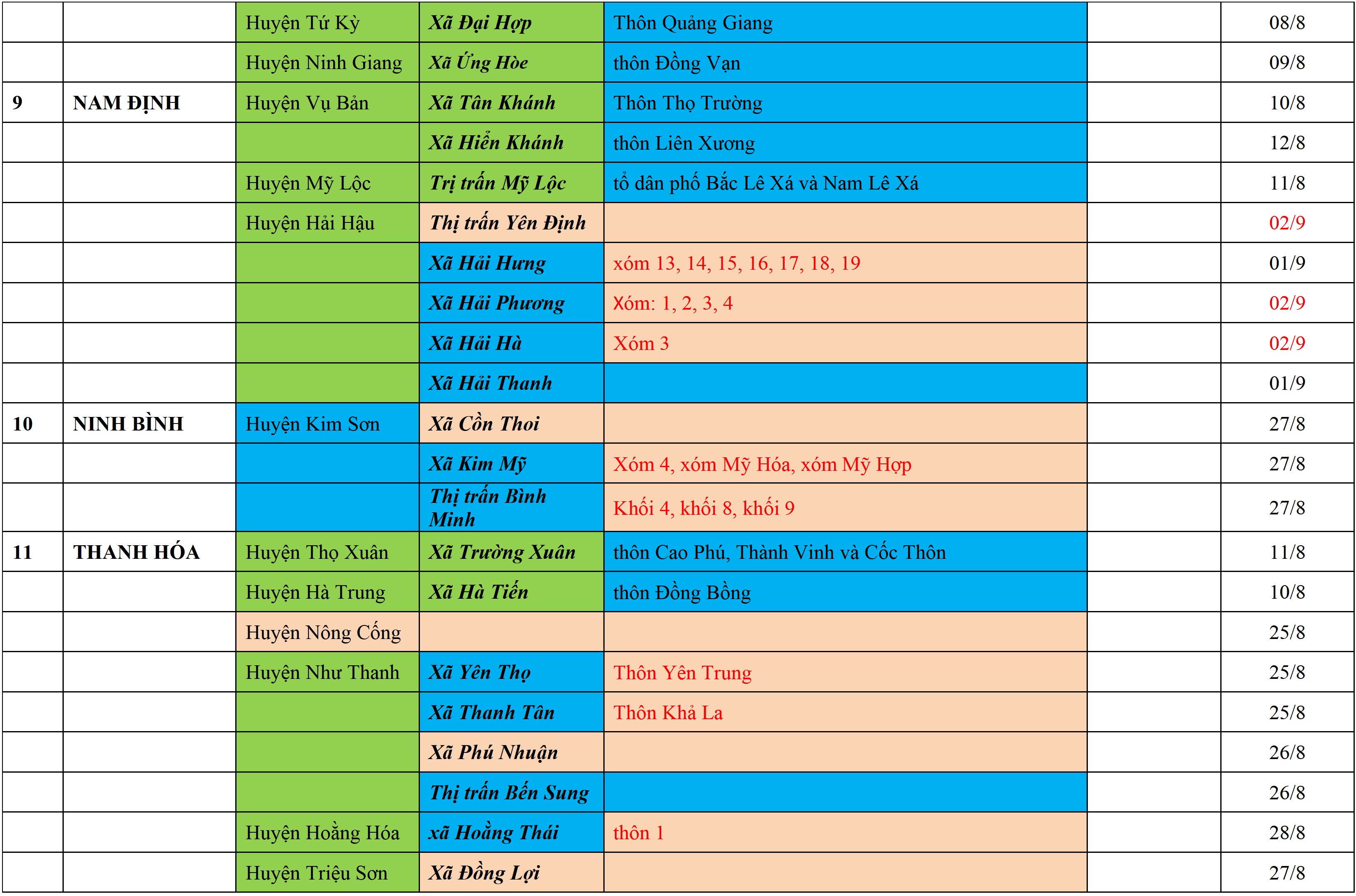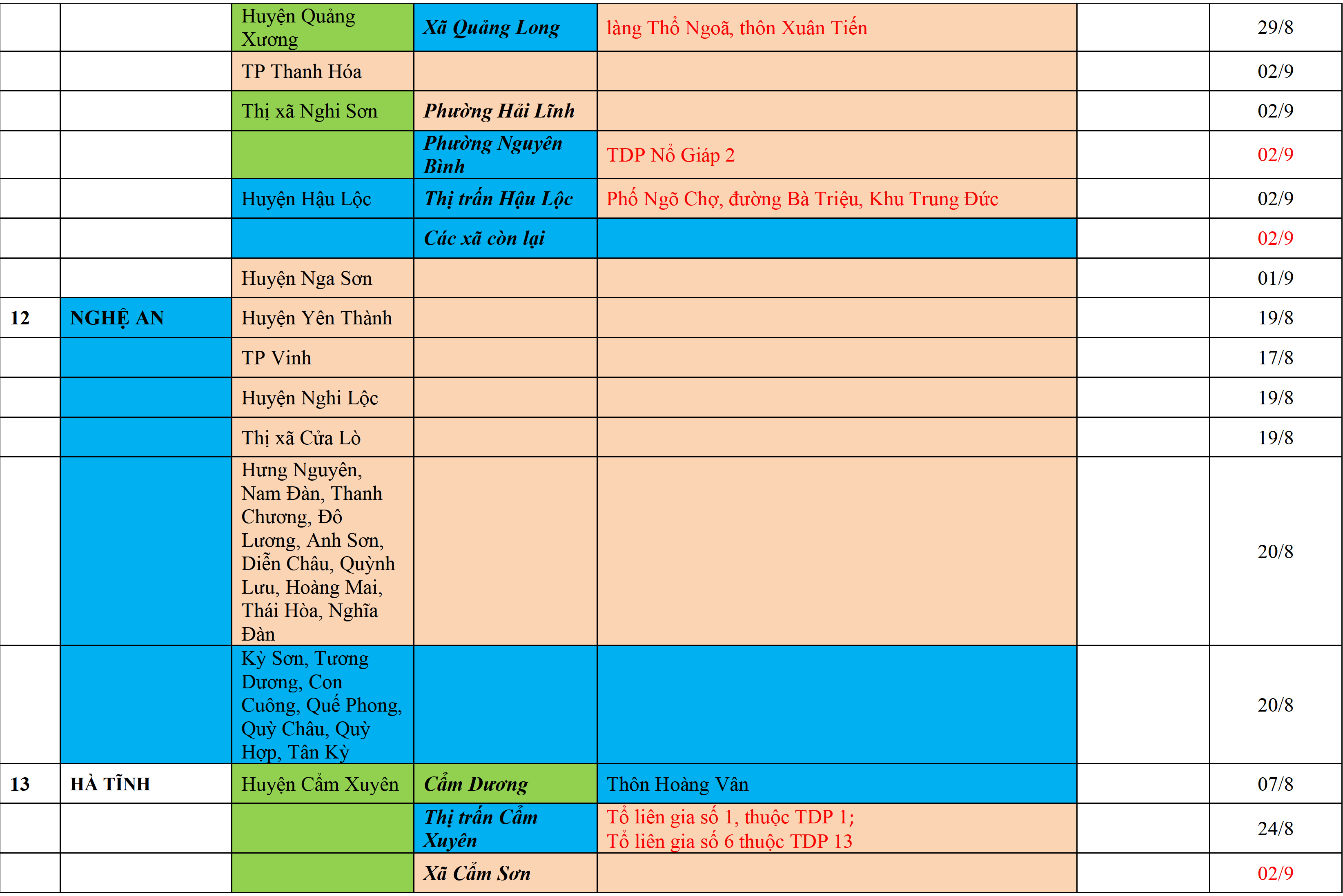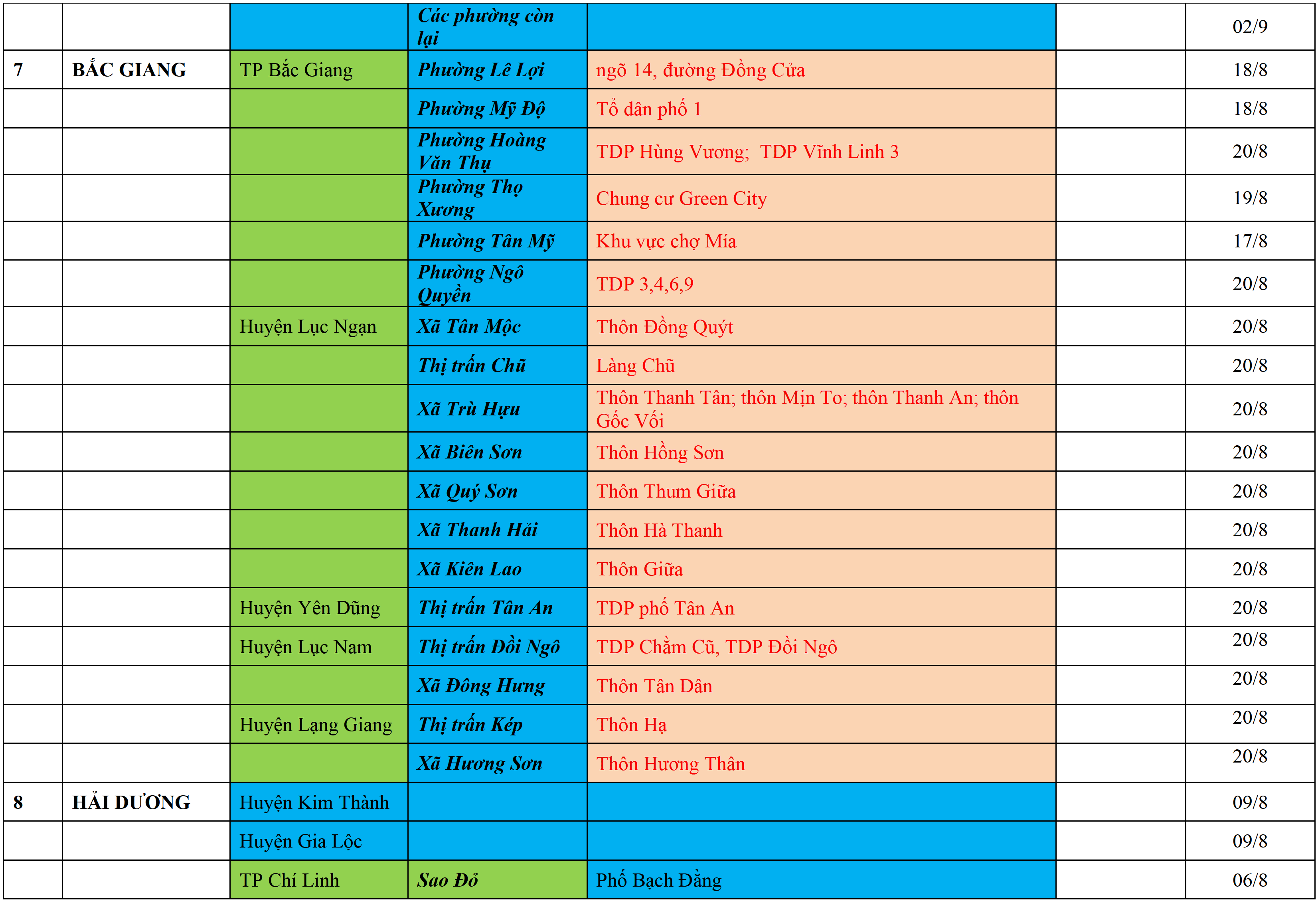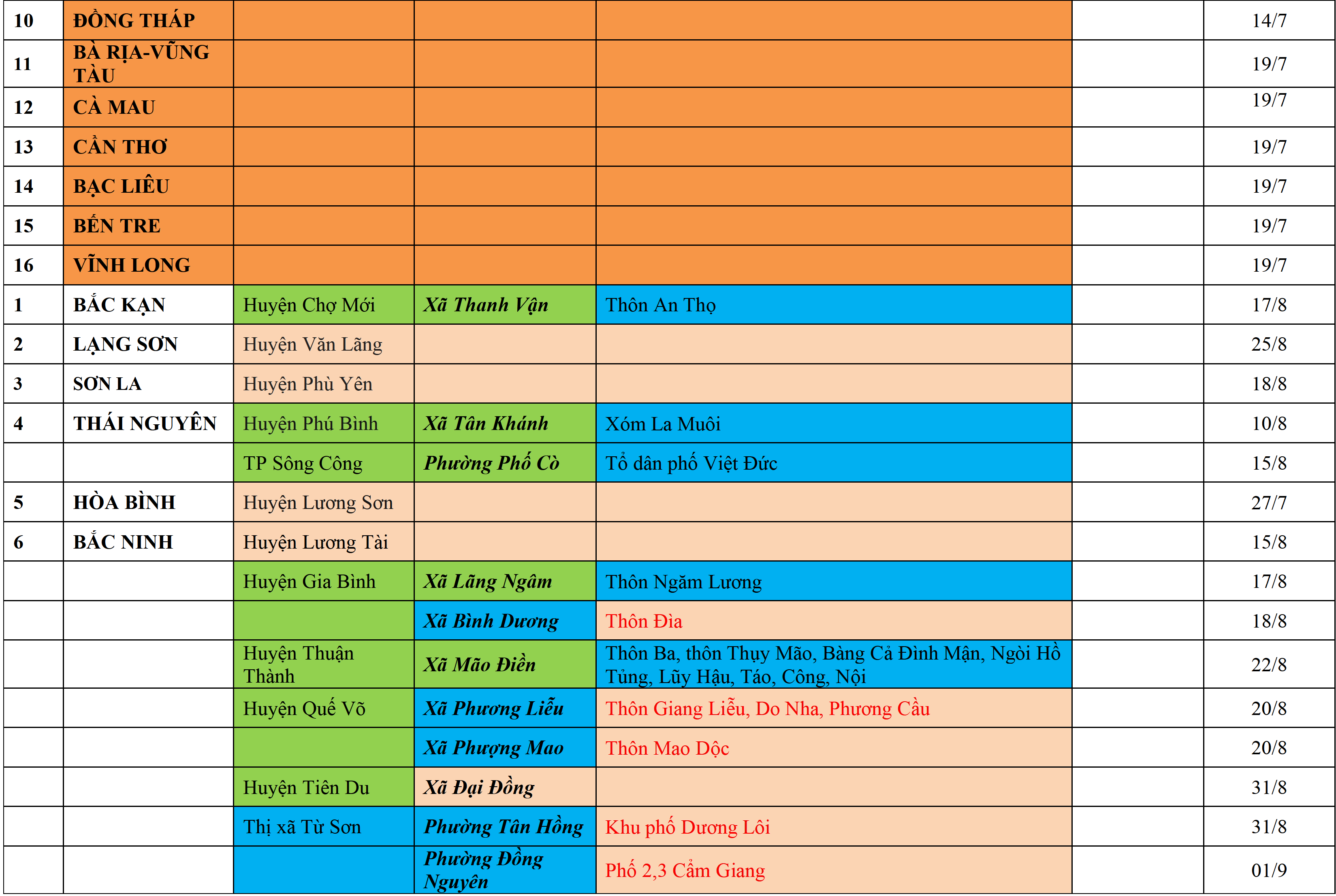 Biện pháp phòng chống dịch: Áp dụng biện pháp tương ứng màu sắc ô cột theo thôn xóm; xã phường; quận huyện; tỉnh thành phố. Cách ly y tế dựa vào việc tiếp xúc, đi đến địa điểm và nơi cư trú có ca bệnh, theo Thông báo của Bộ Y tế, các tỉnh thành phố.
