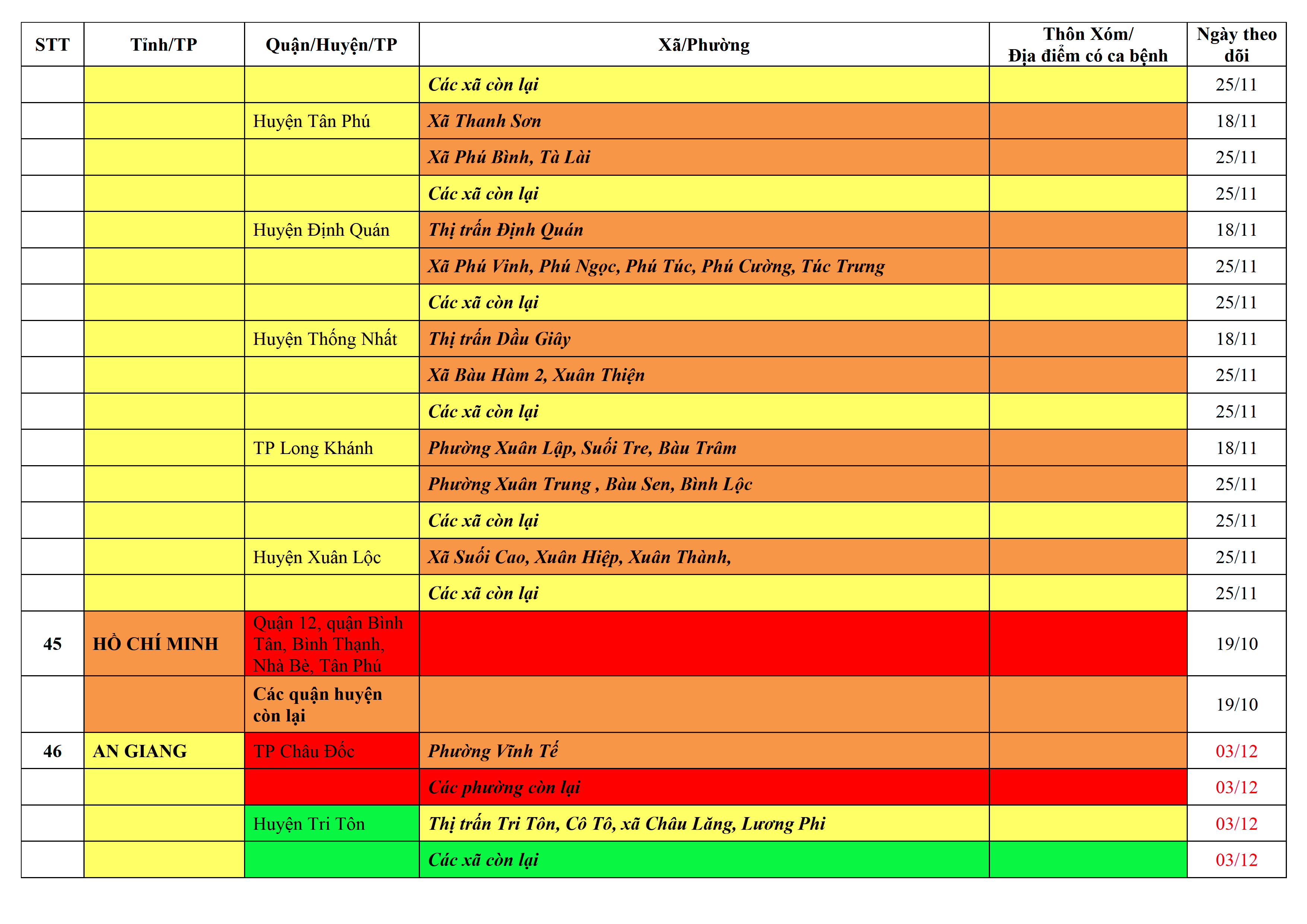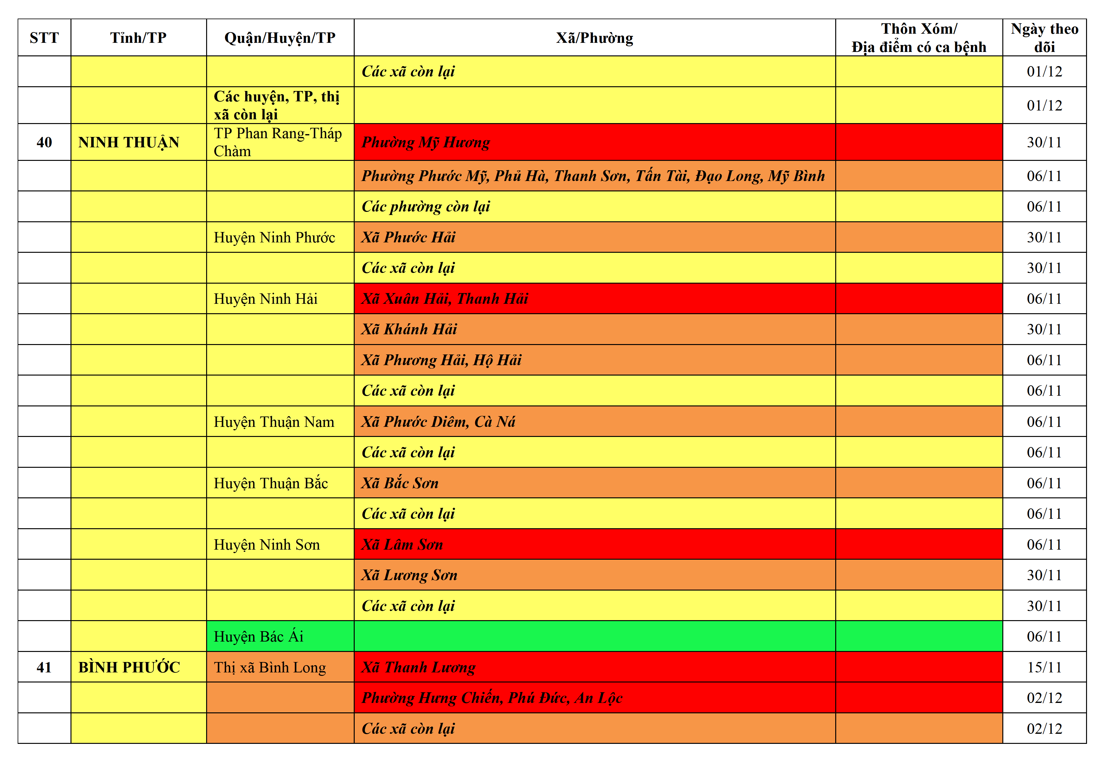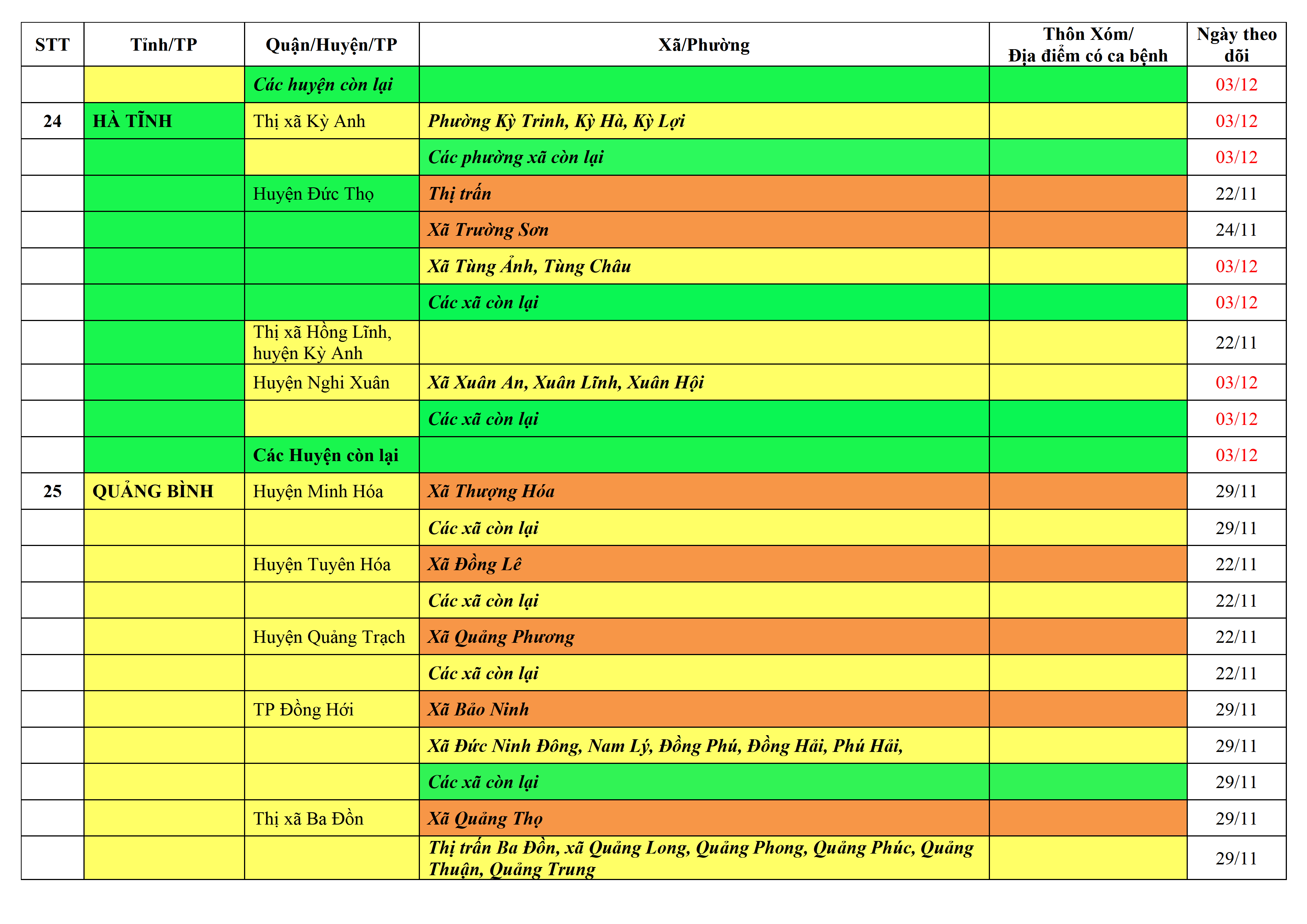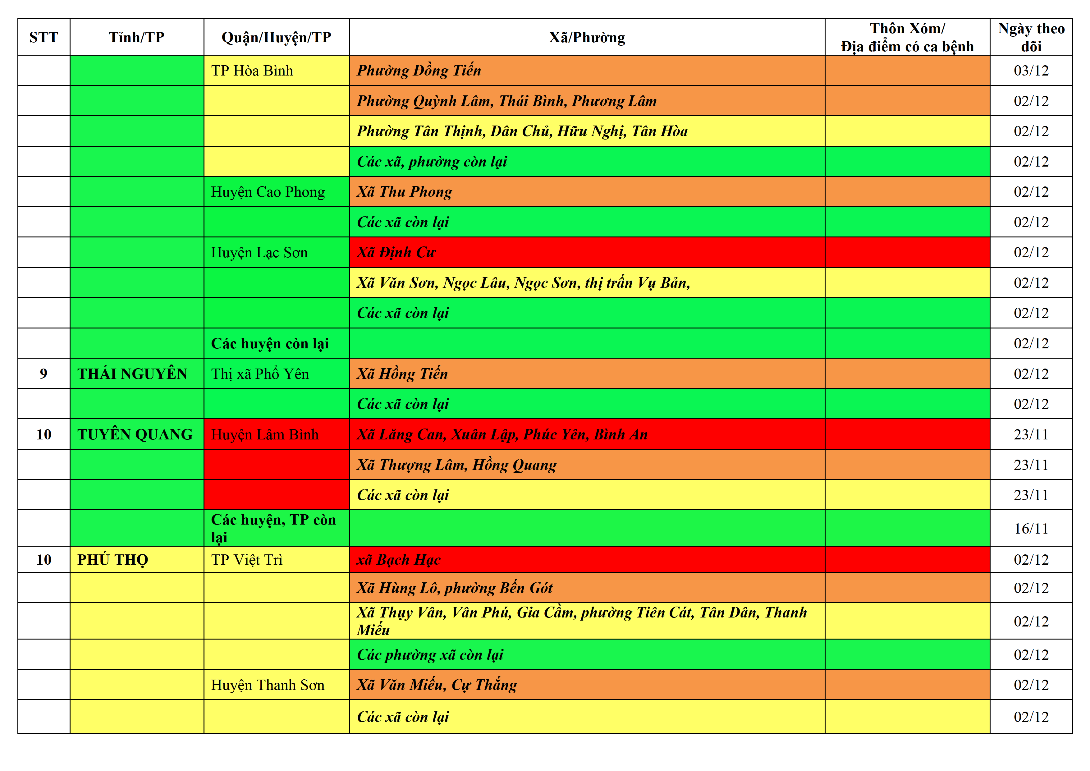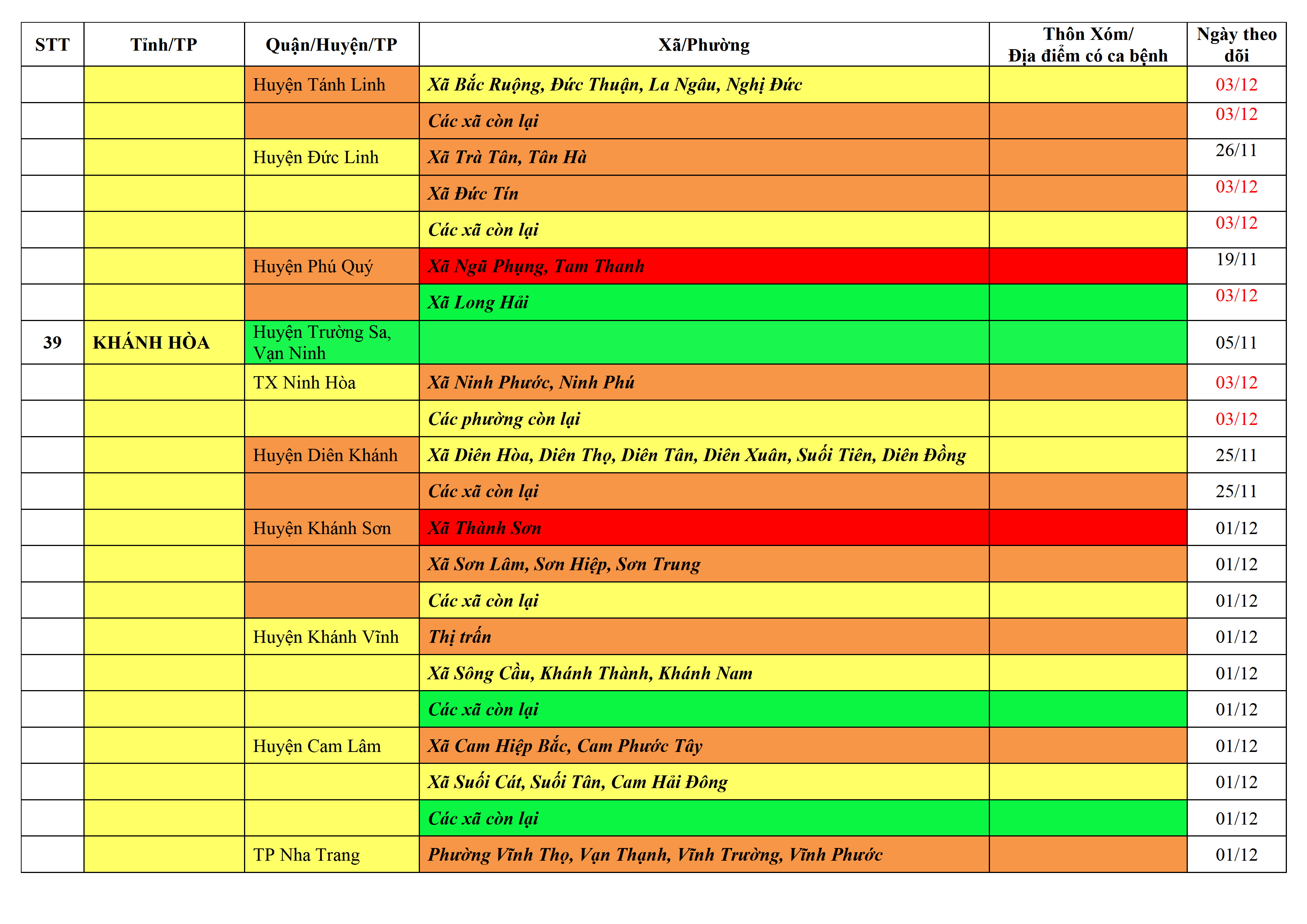 Lưu ý: Các tỉnh, thành phố không có tên trong bảng màu, đi lại bình thường, tuân thủ các biện pháp phòng chống dịch theo chỉ đạo của Bộ Y tế; khai báo y tế, thực hiện nghiêm 5K.