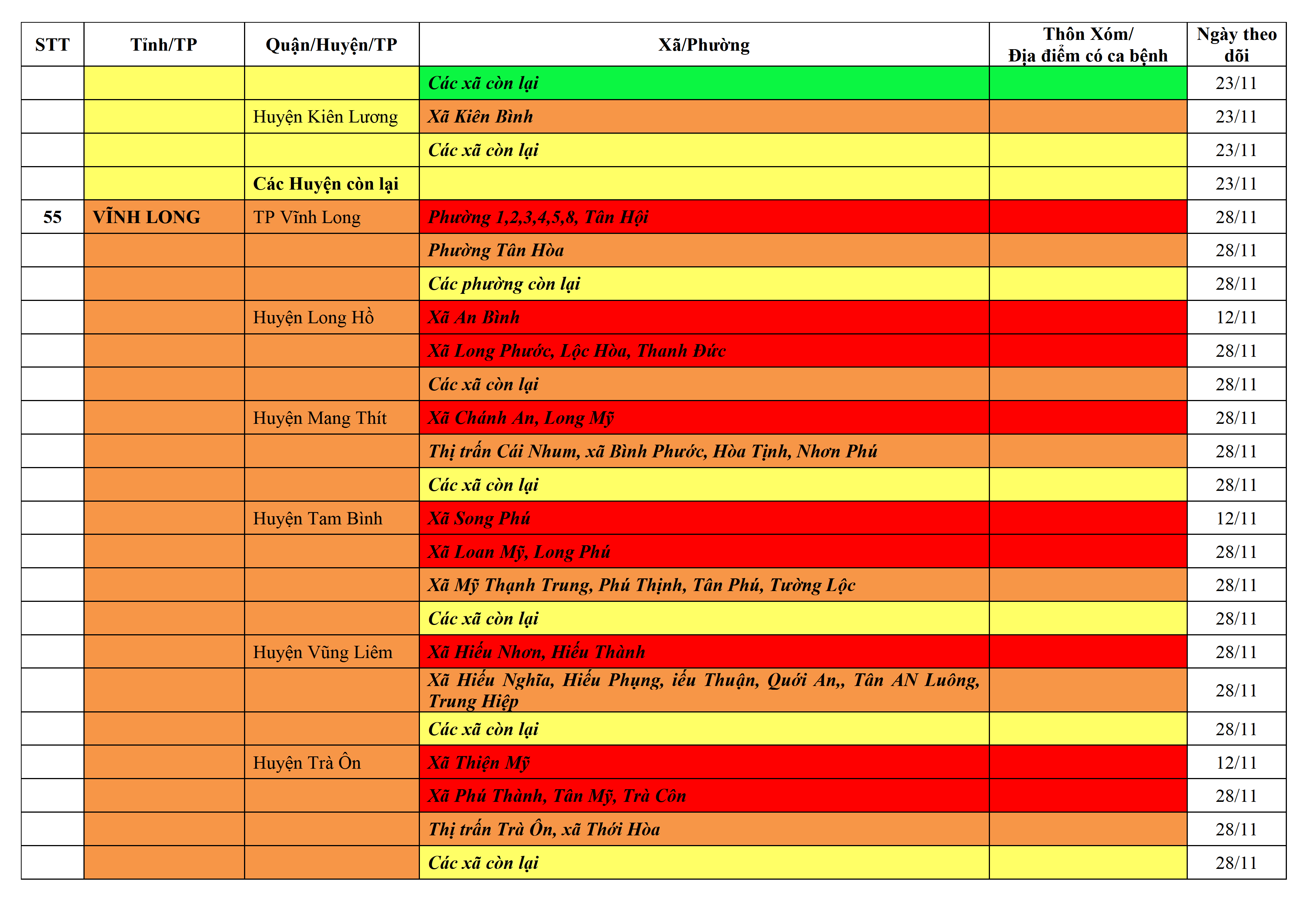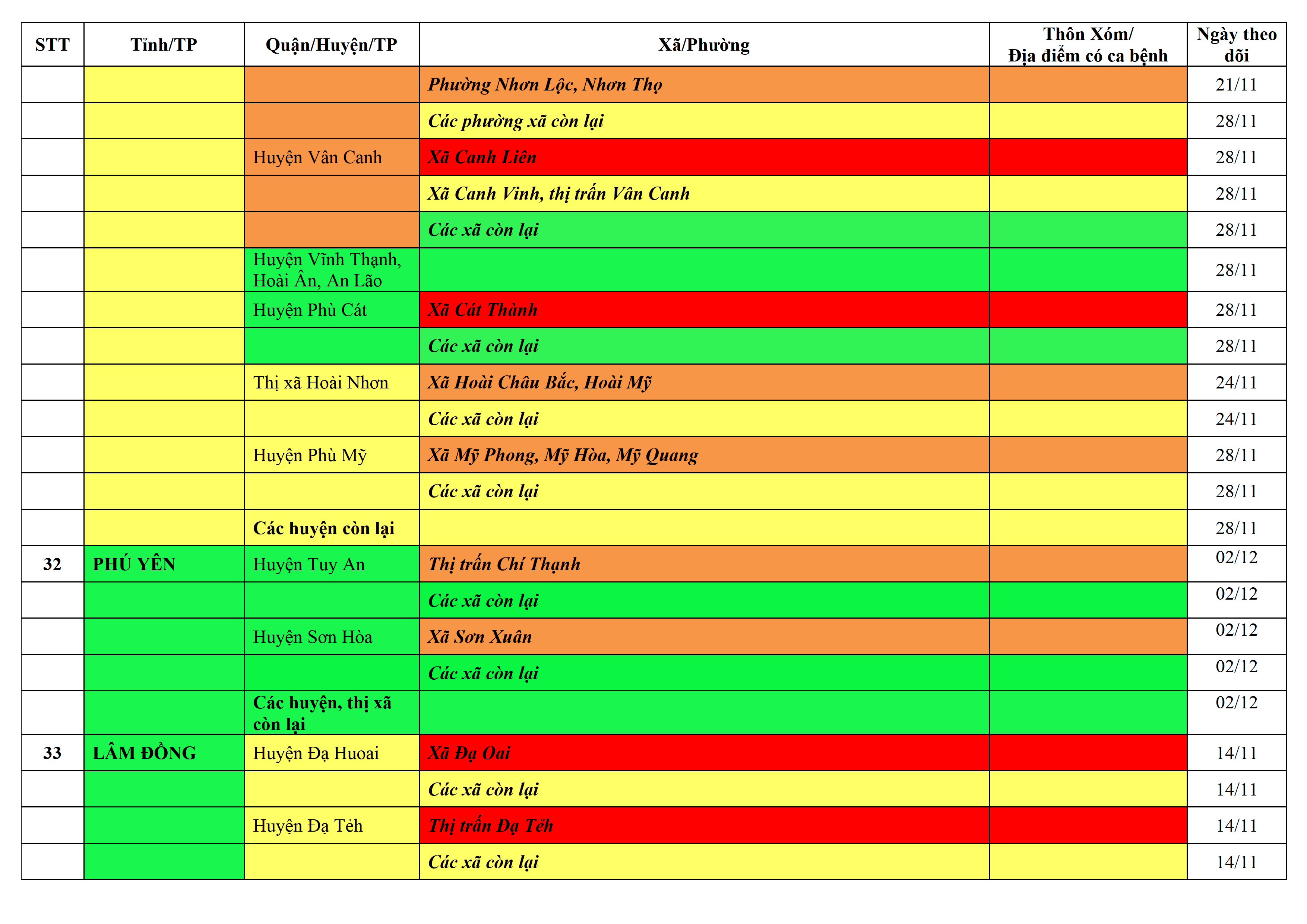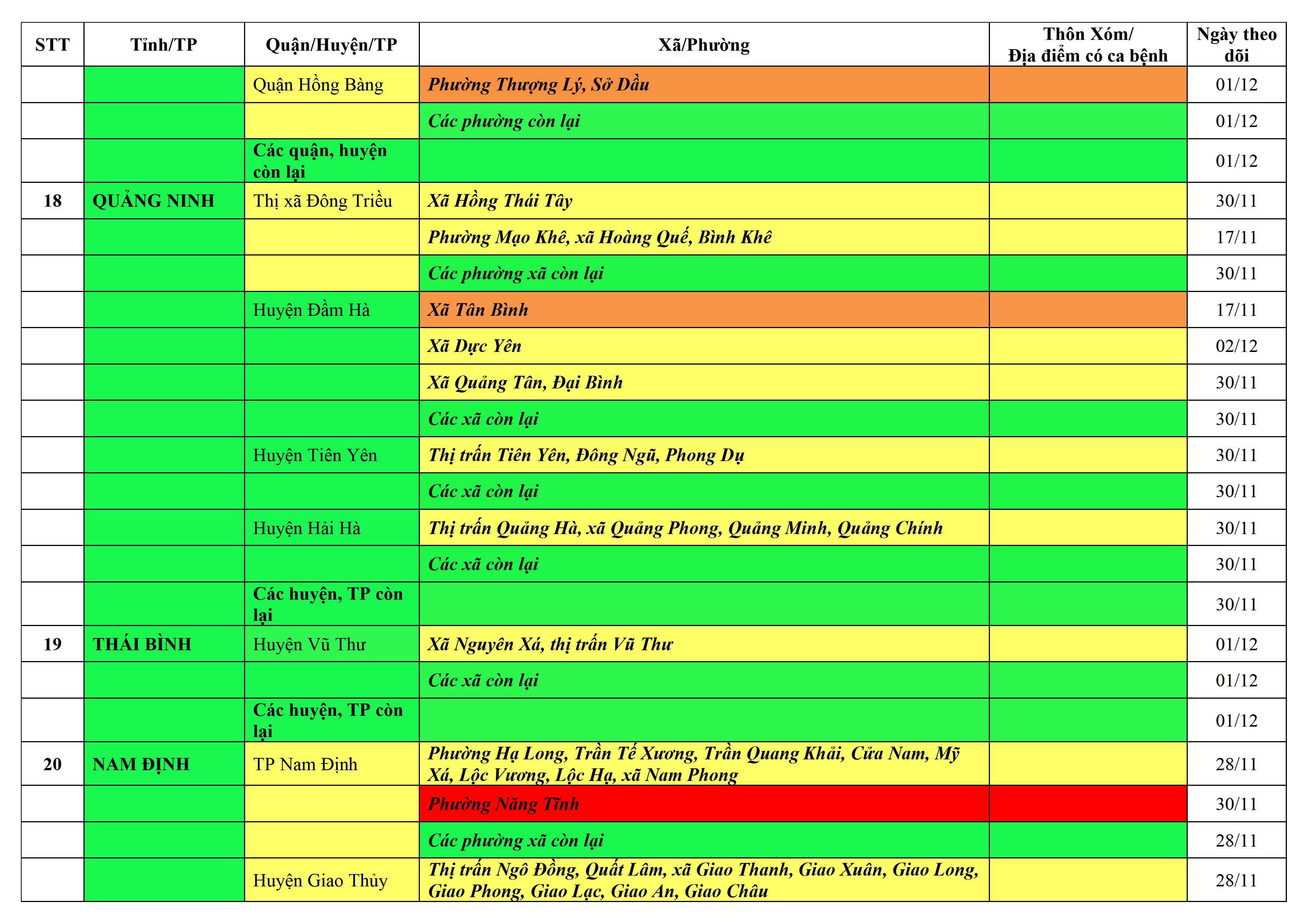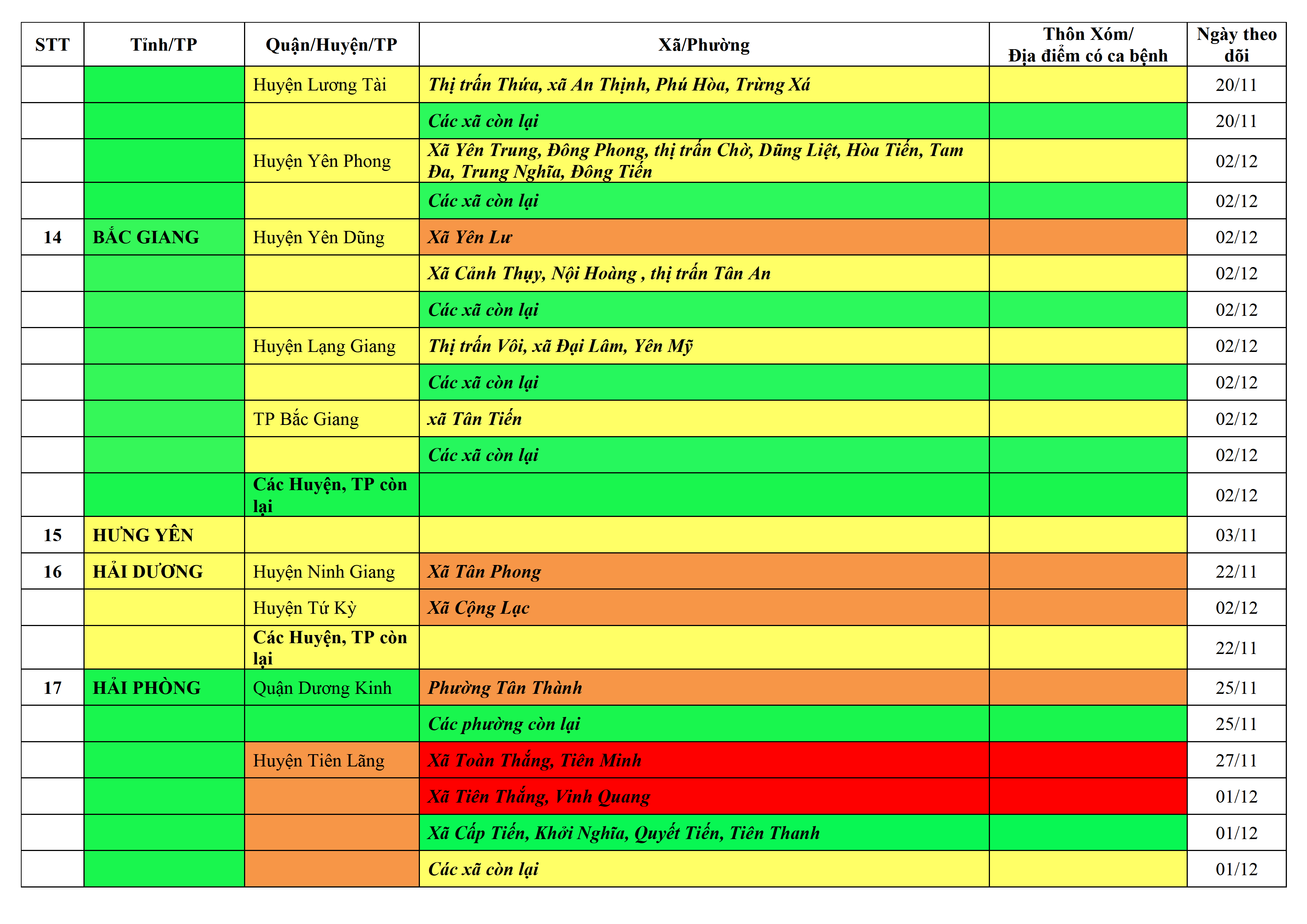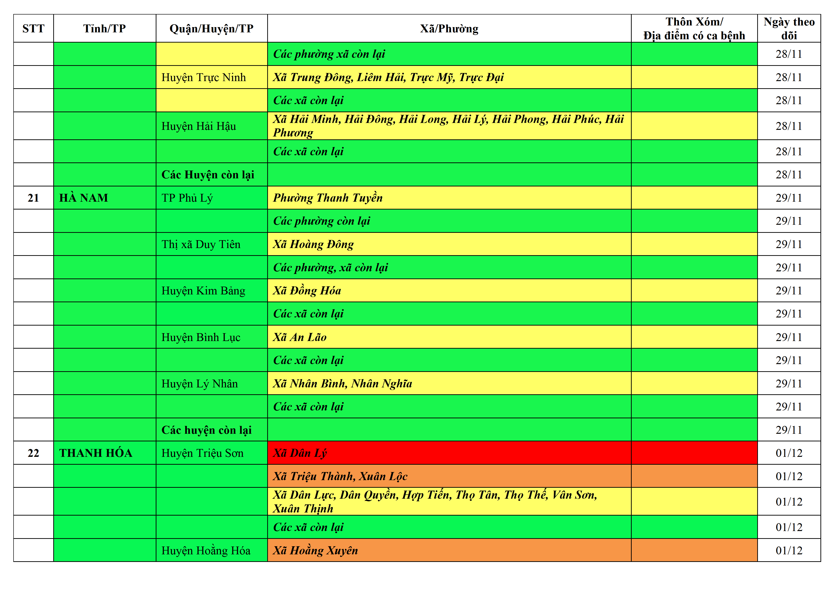 Lưu ý: Các tỉnh, thành phố không có tên trong bảng màu, đi lại bình thường, tuân thủ các biện pháp phòng chống dịch theo chỉ đạo của Bộ Y tế; khai báo y tế, thực hiện nghiêm 5K.