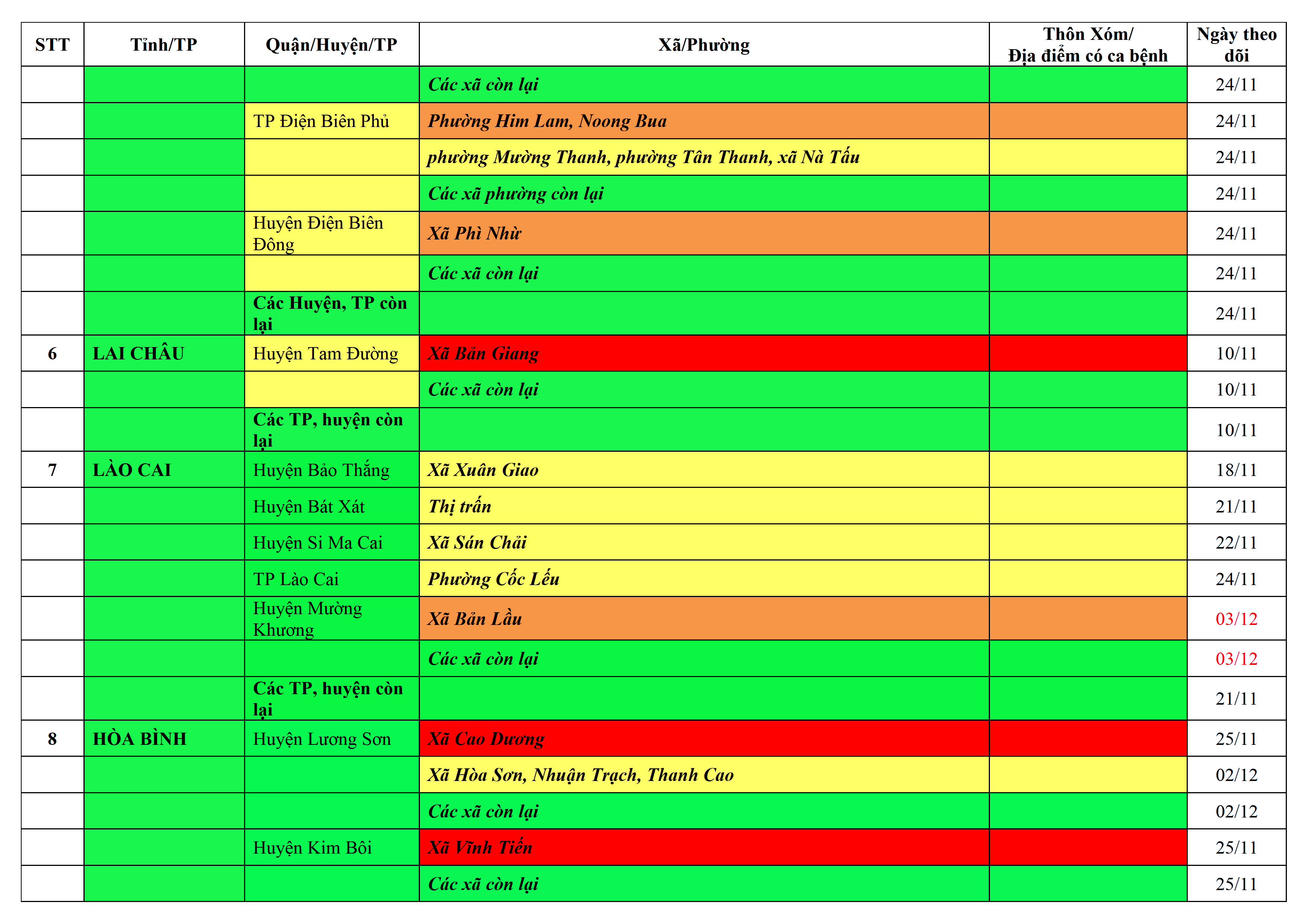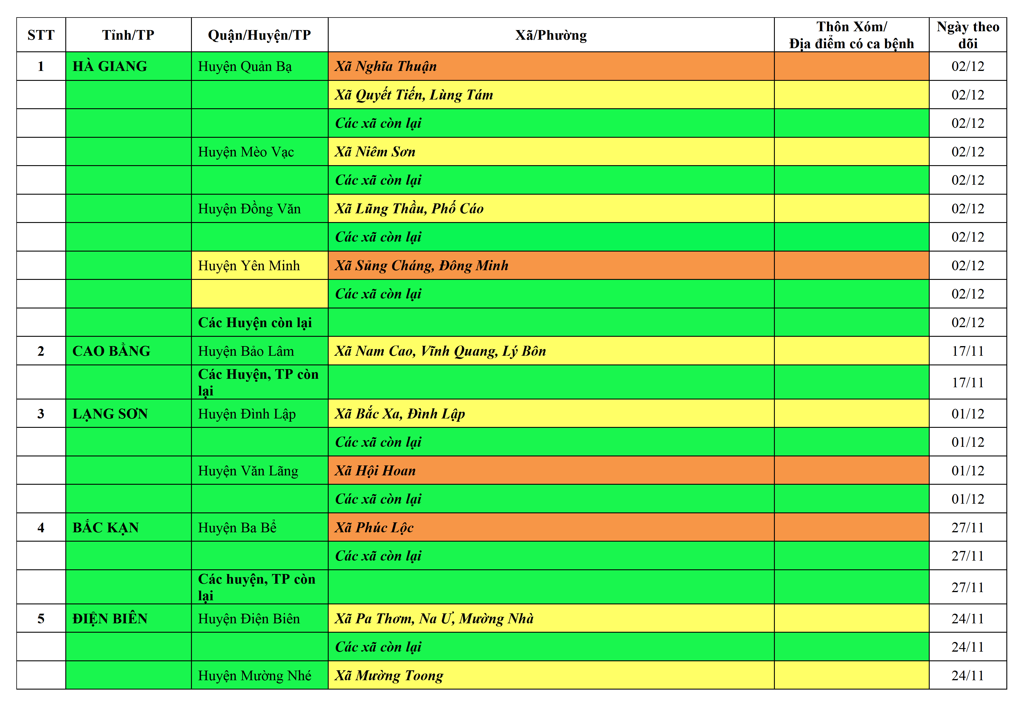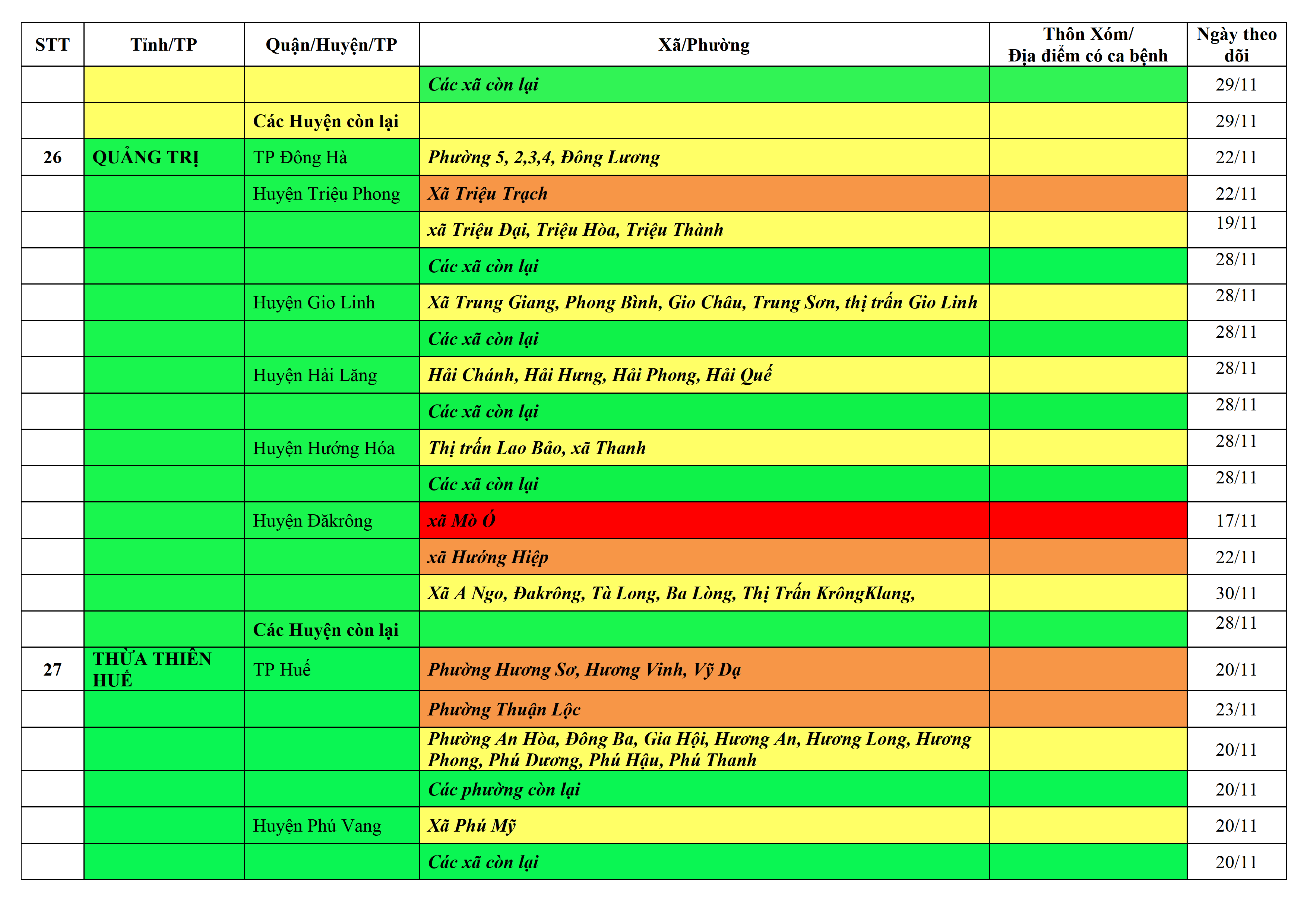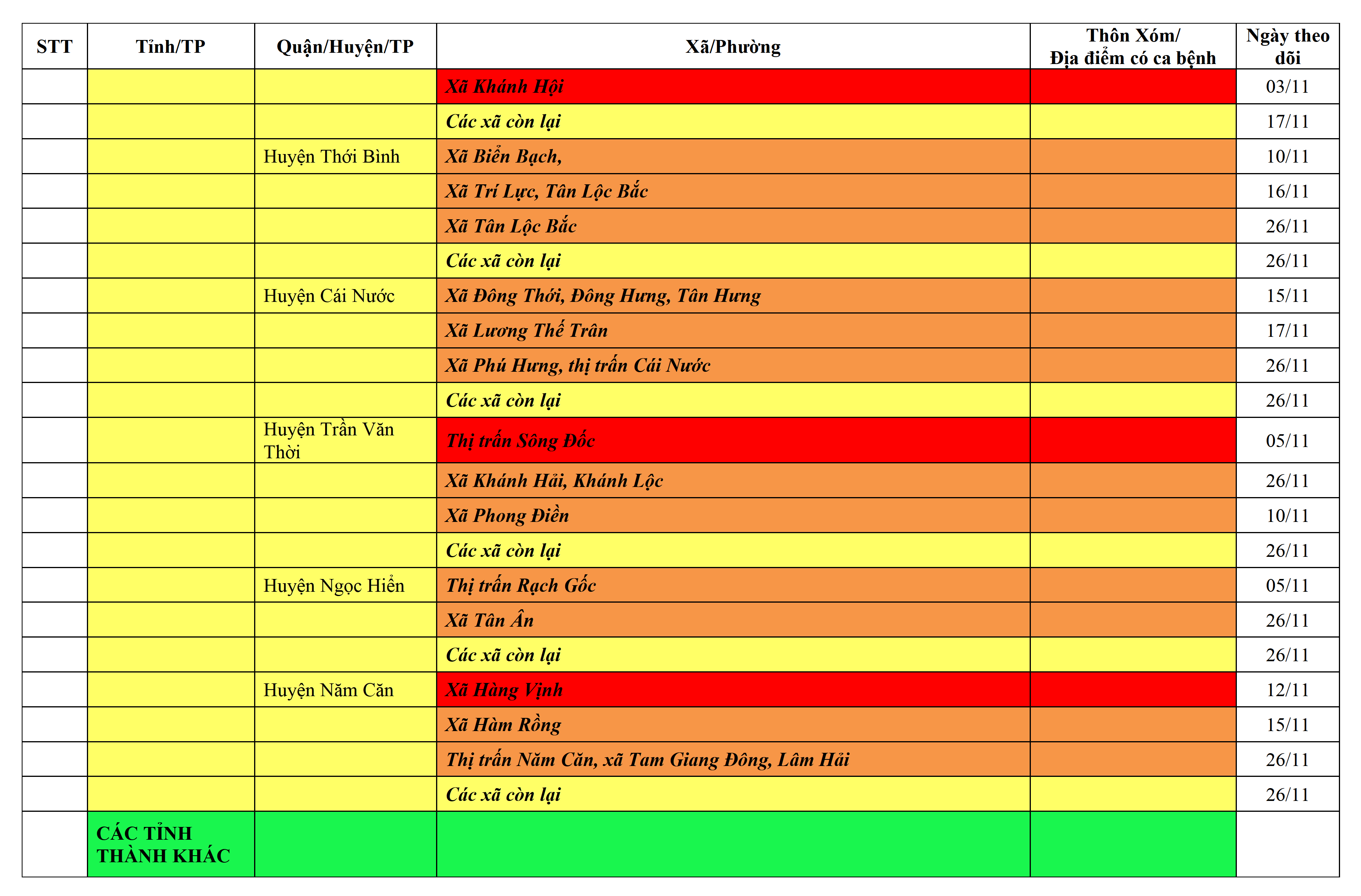 Lưu ý: Các tỉnh, thành phố không có tên trong bảng màu, đi lại bình thường, tuân thủ các biện pháp phòng chống dịch theo chỉ đạo của Bộ Y tế; khai báo y tế, thực hiện nghiêm 5K.