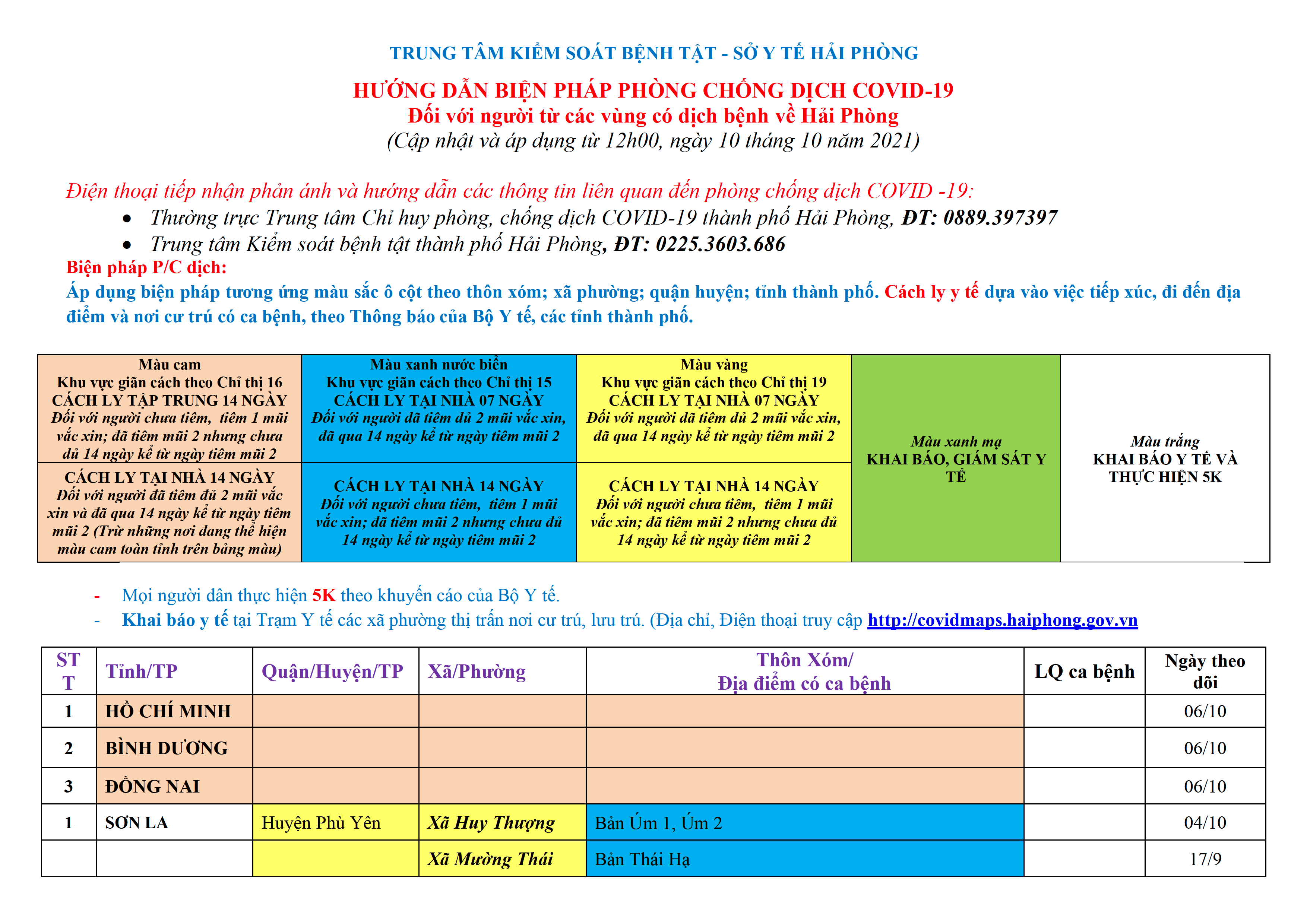 . Mọi người dân thực hiện 5K theo khuyến cáo của Bộ Y tế. Khai báo y tế tại Trạm Y tế các xã phường thị trấn nơi cư trú, lưu trú. (Địa chỉ, Điện thoại truy cập http://covidmaps.haiphong.gov.vn).