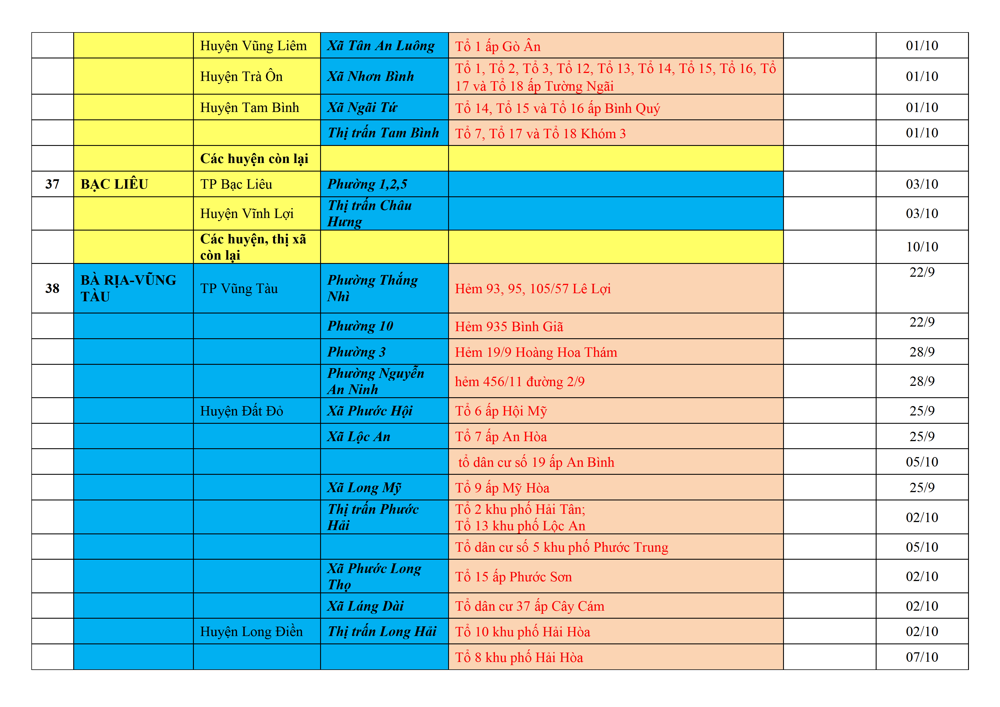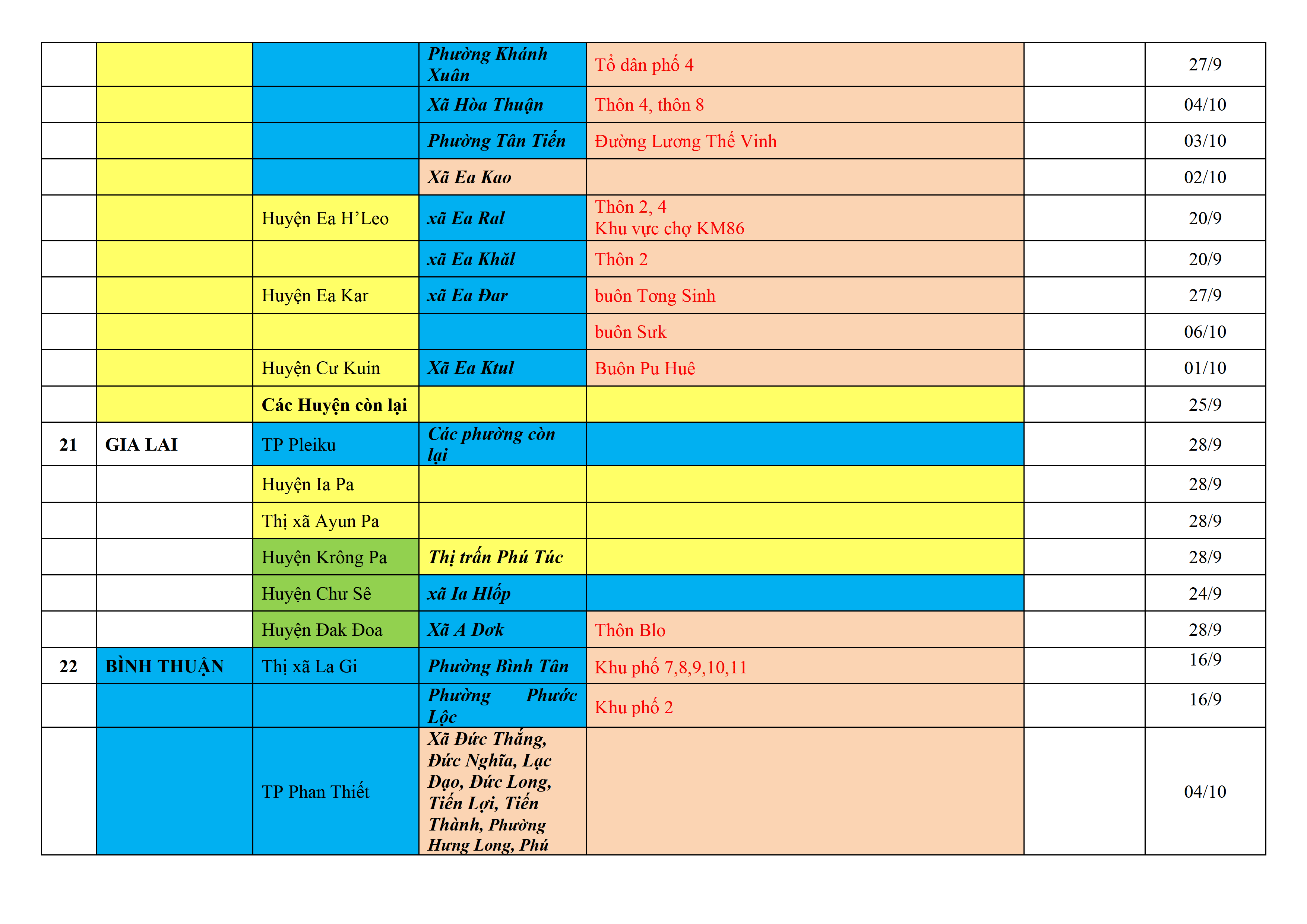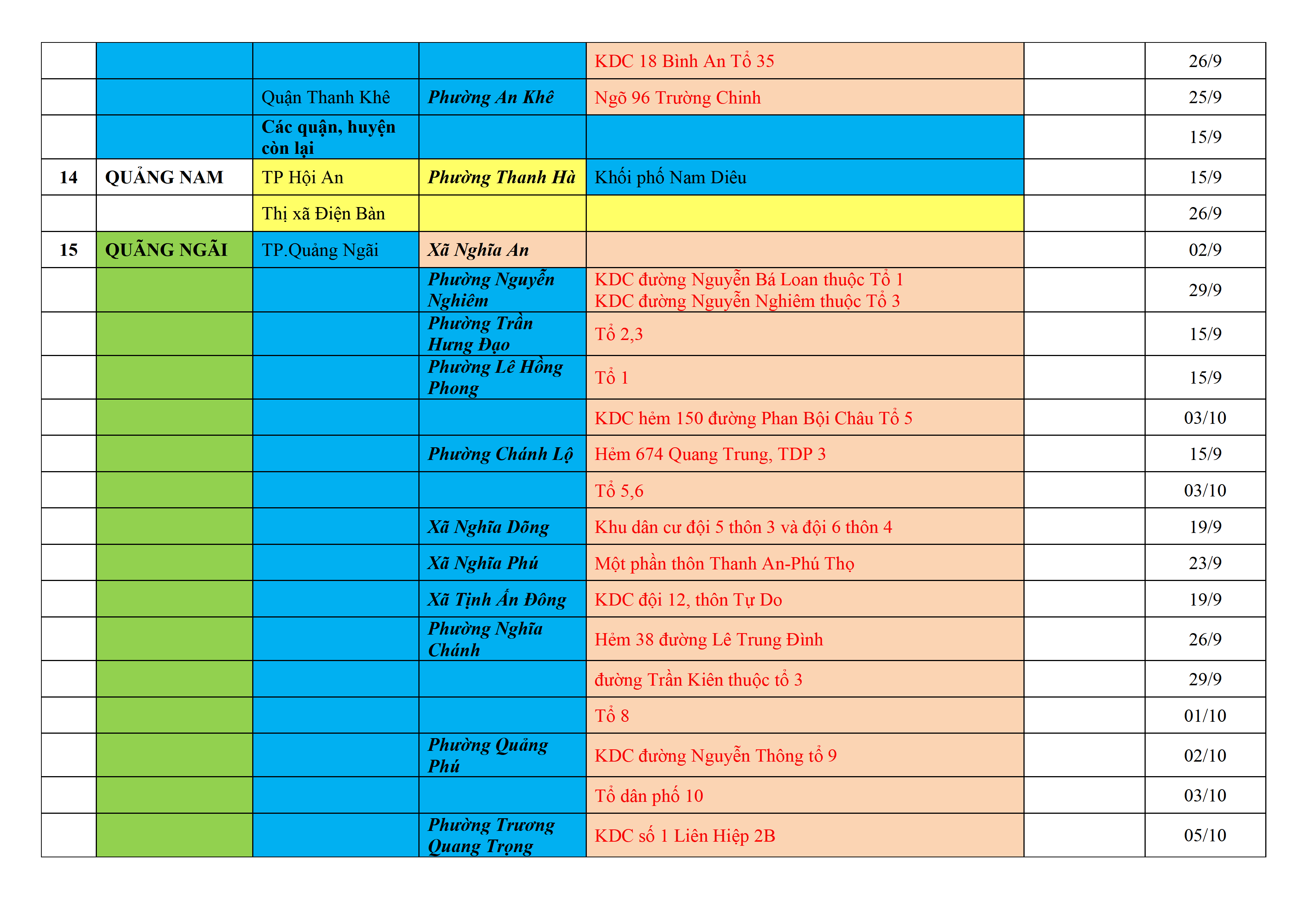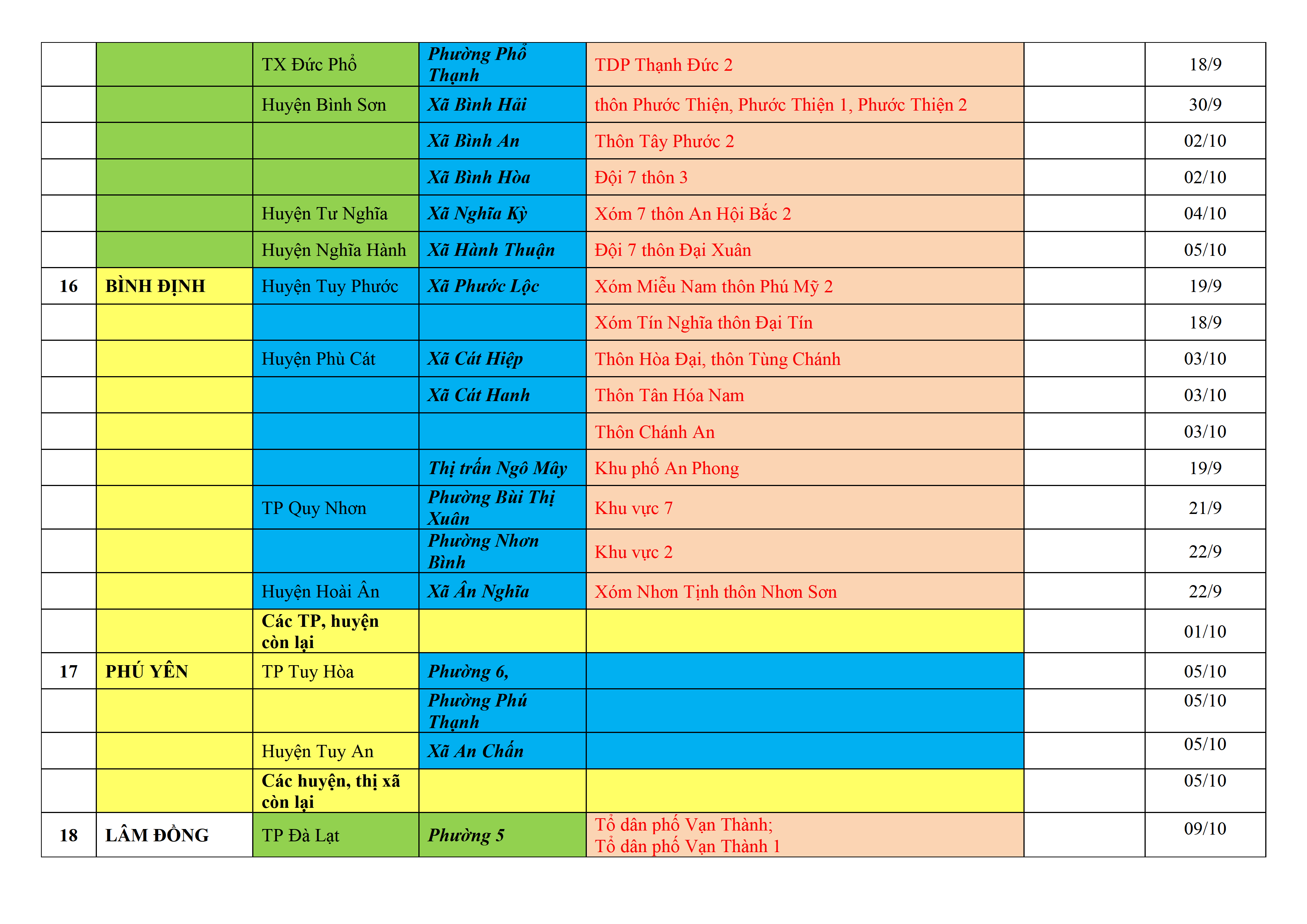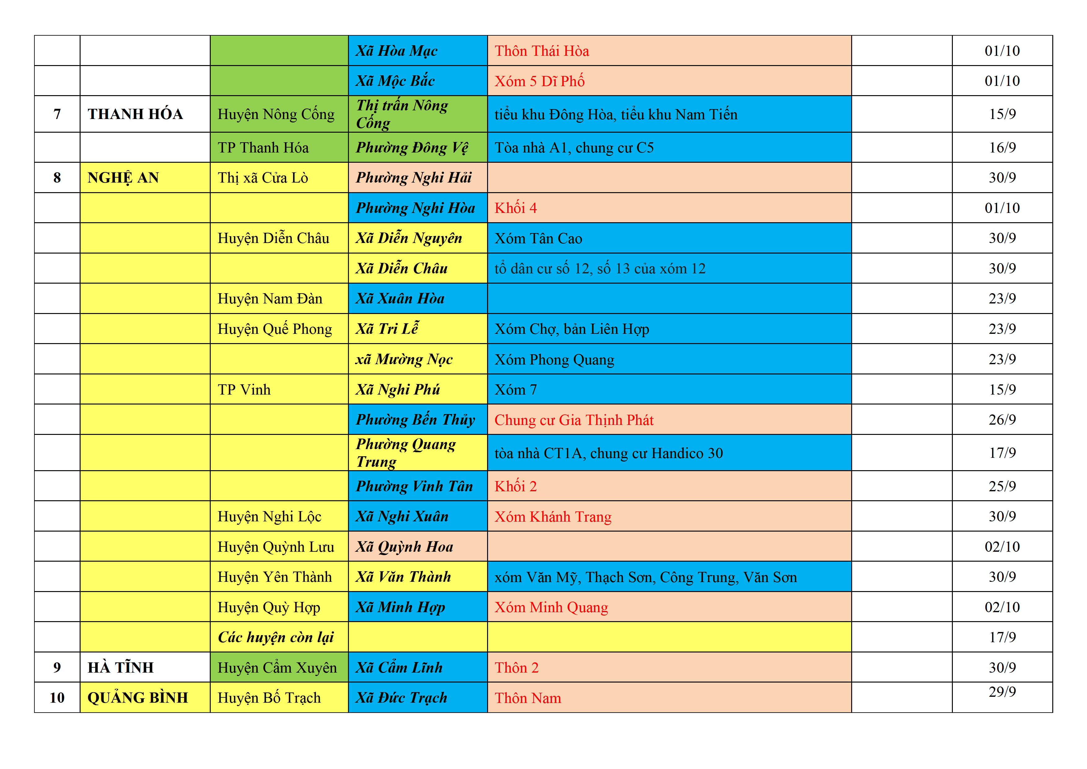 Biện pháp phòng, chống dịch COVID-19: Áp dụng biện pháp tương ứng màu sắc ô cột theo thôn xóm; xã phường; quận huyện; tỉnh thành phố. Cách ly y tế dựa vào việc tiếp xúc, đi đến địa điểm và nơi cư trú có ca bệnh, theo Thông báo của Bộ Y tế, các tỉnh thành phố.