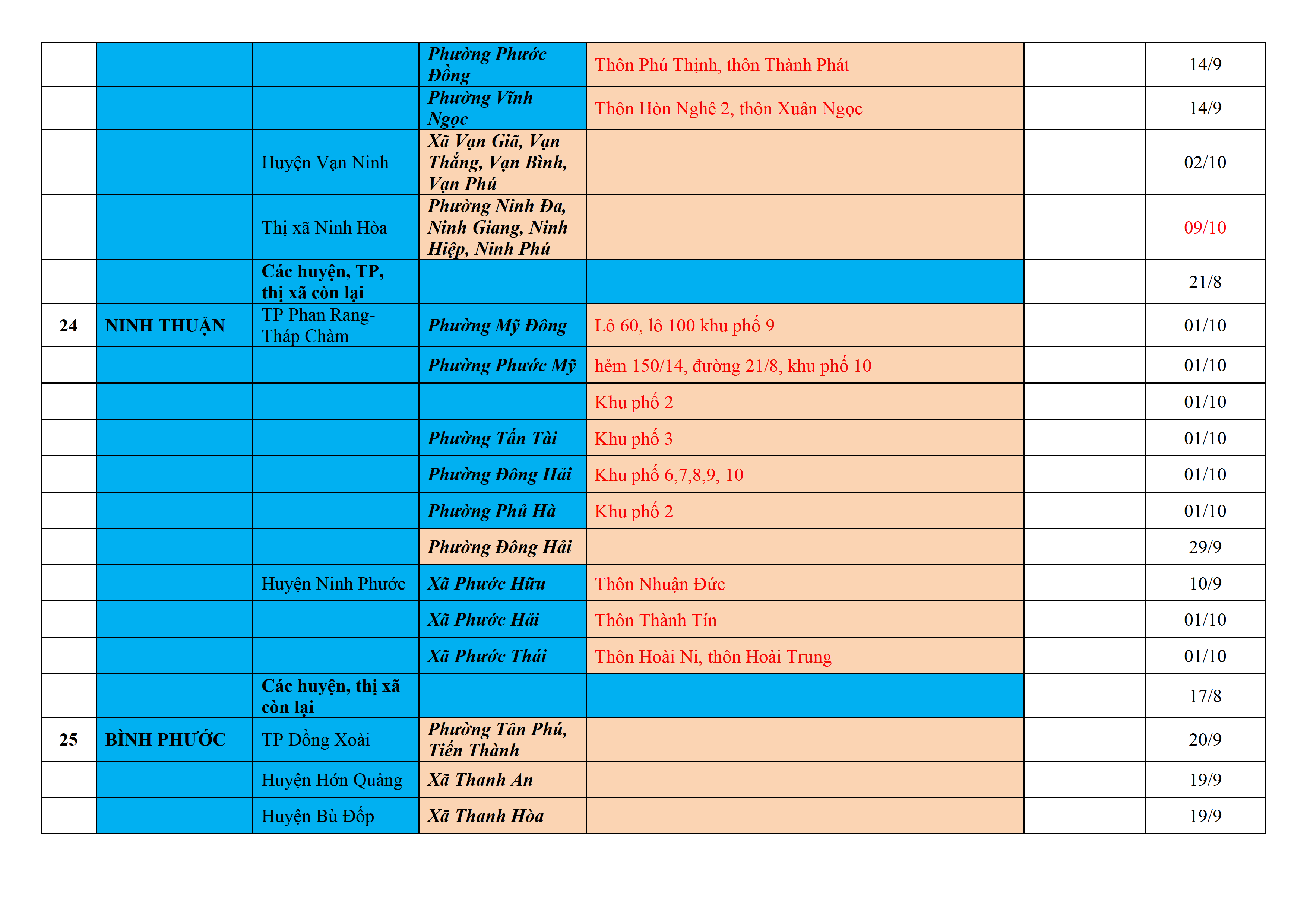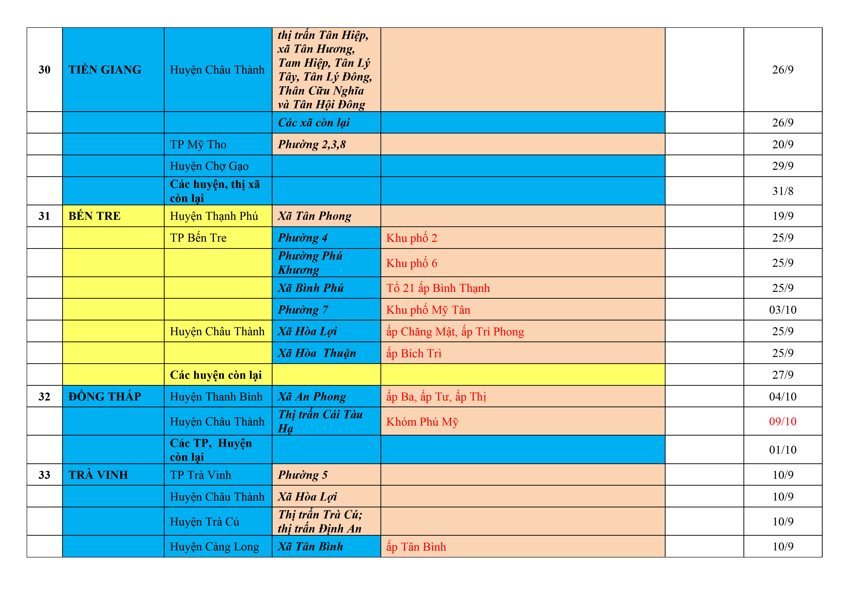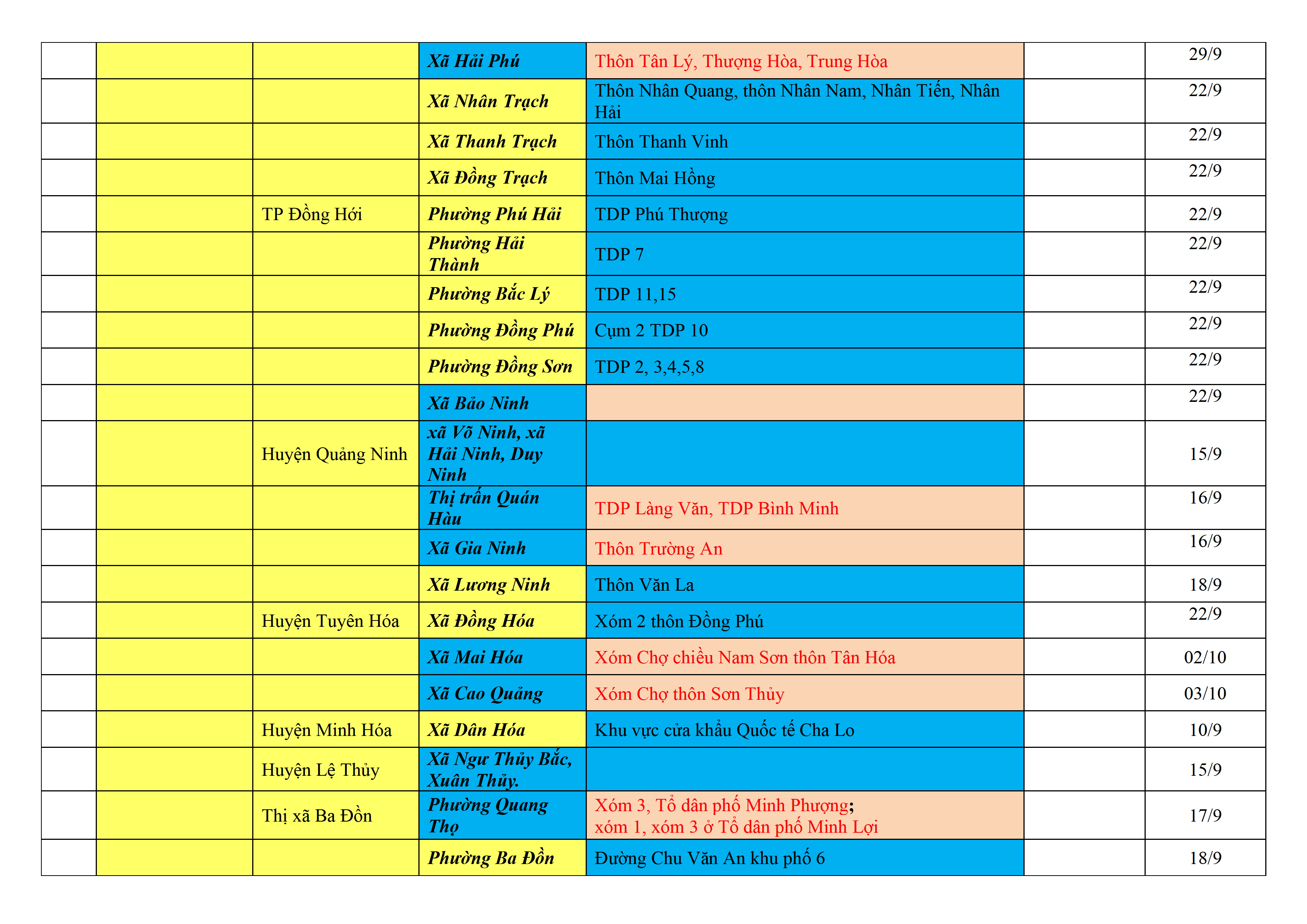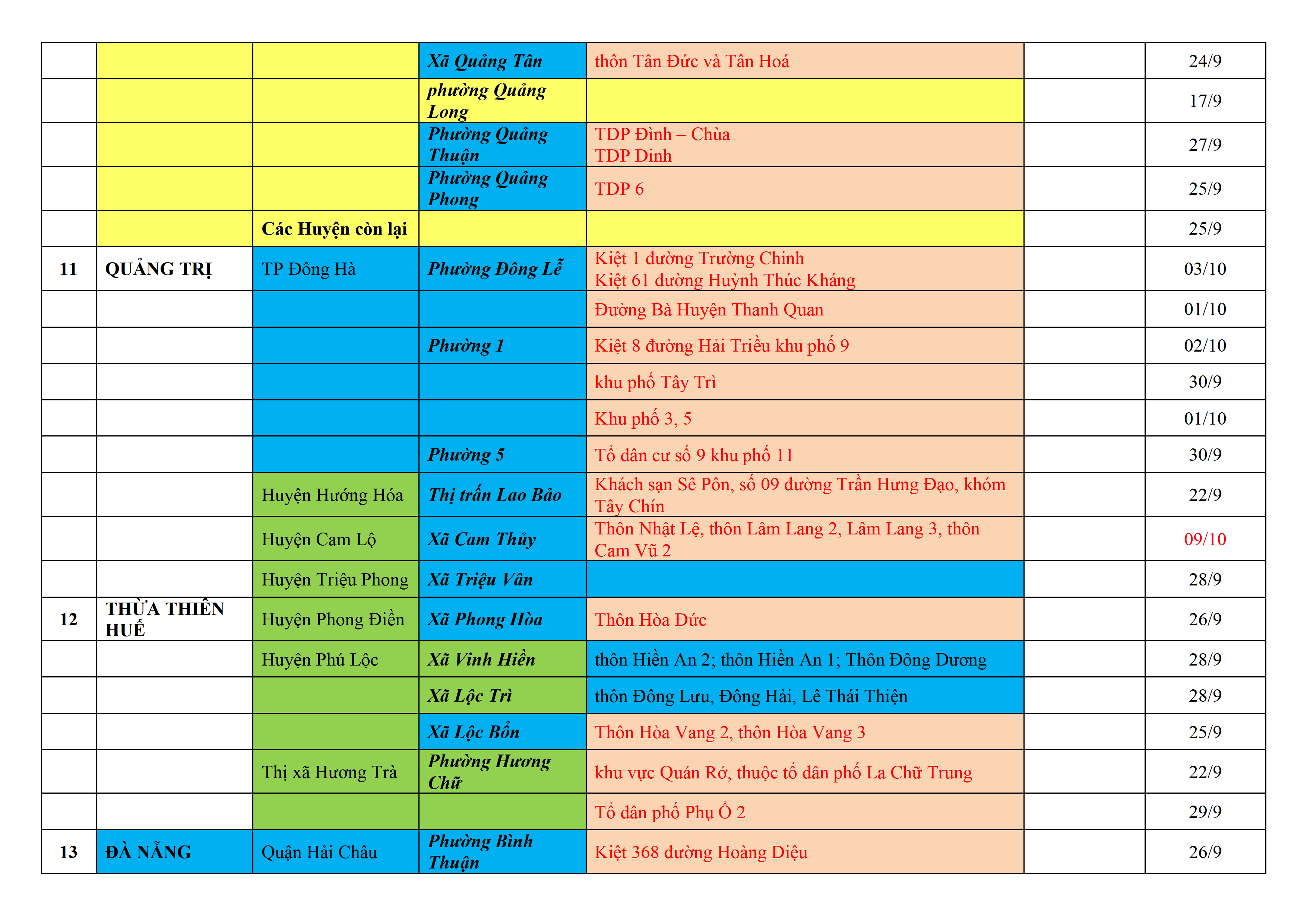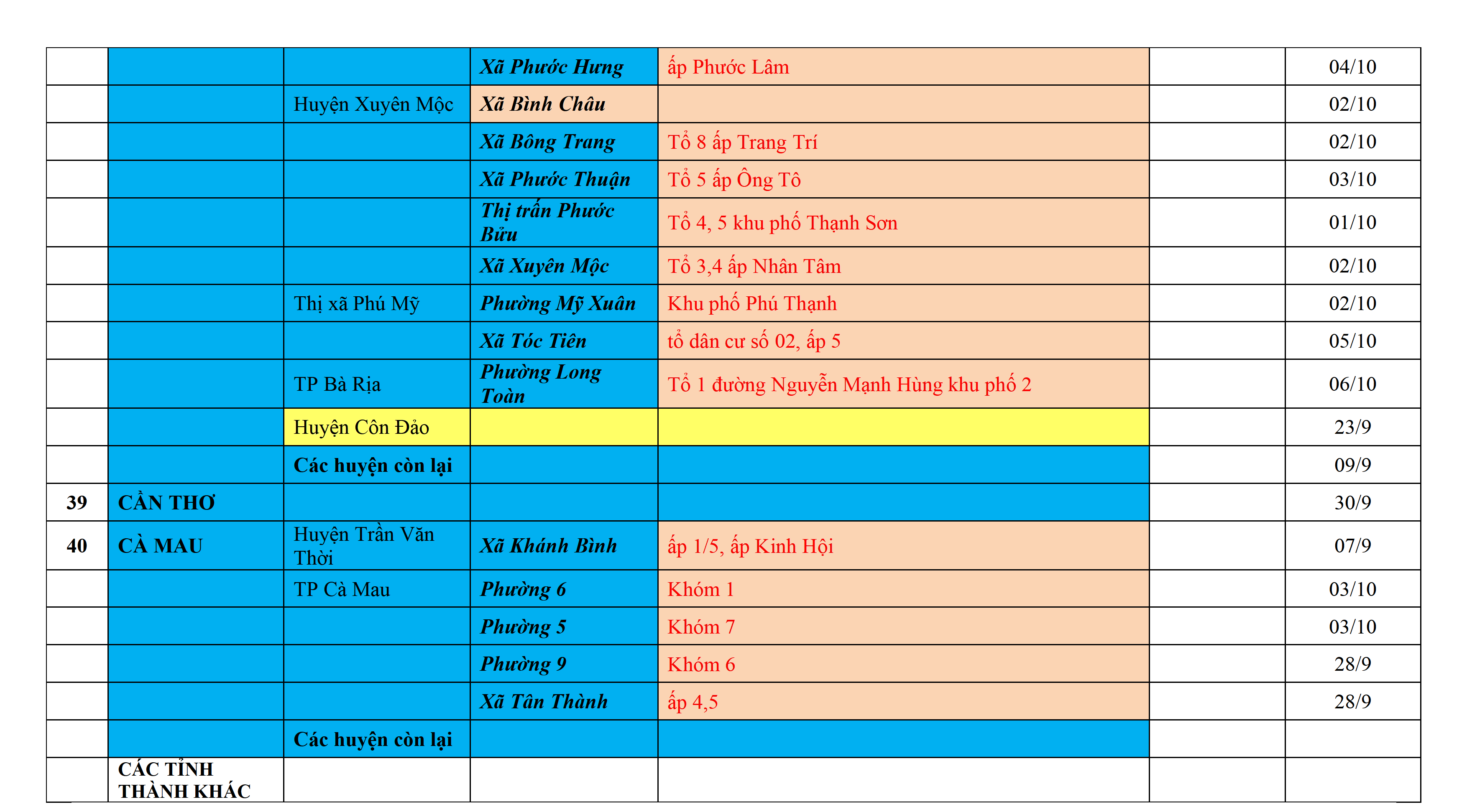 Biện pháp phòng, chống dịch COVID-19: Áp dụng biện pháp tương ứng màu sắc ô cột theo thôn xóm; xã phường; quận huyện; tỉnh thành phố. Cách ly y tế dựa vào việc tiếp xúc, đi đến địa điểm và nơi cư trú có ca bệnh, theo Thông báo của Bộ Y tế, các tỉnh thành phố.