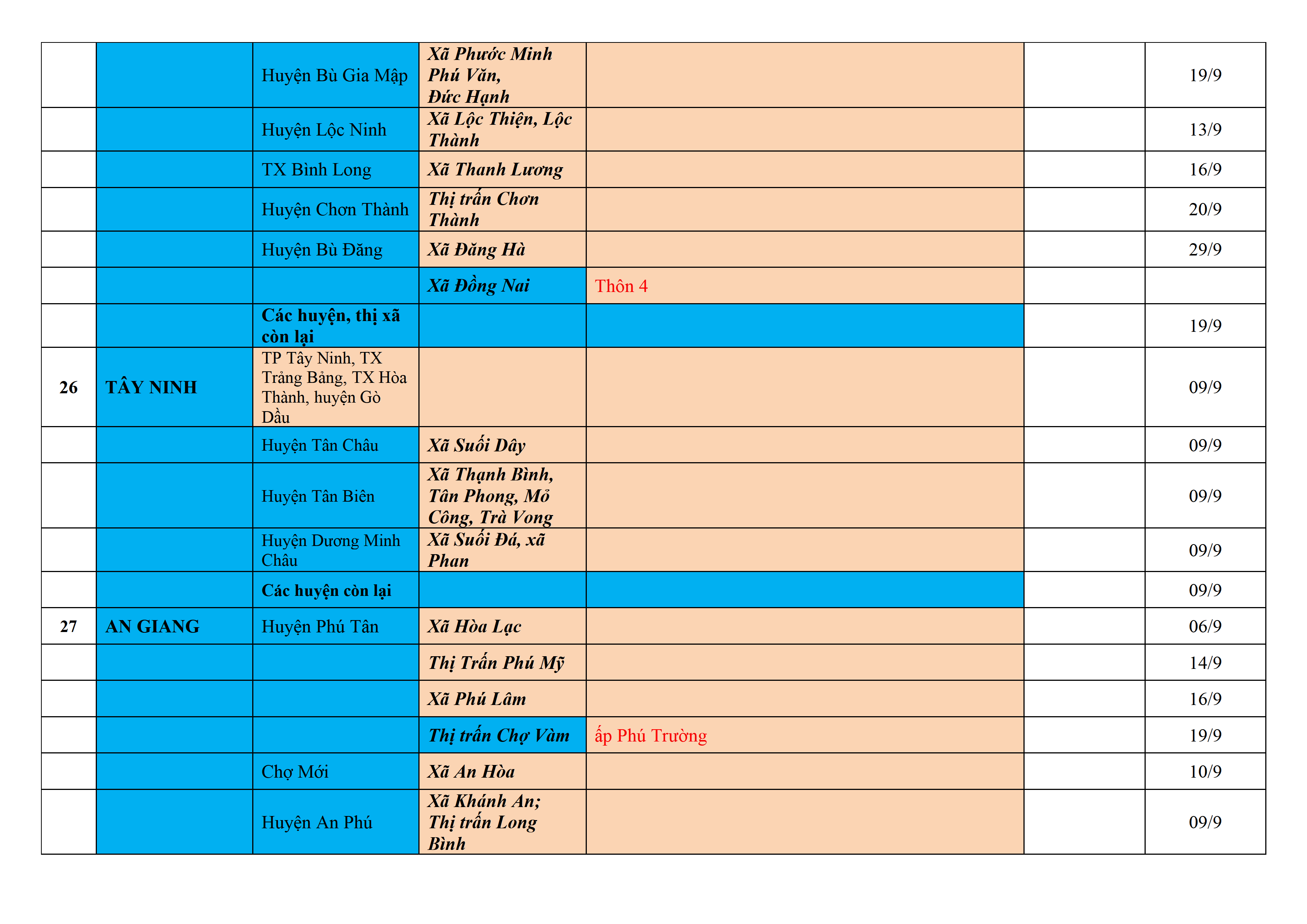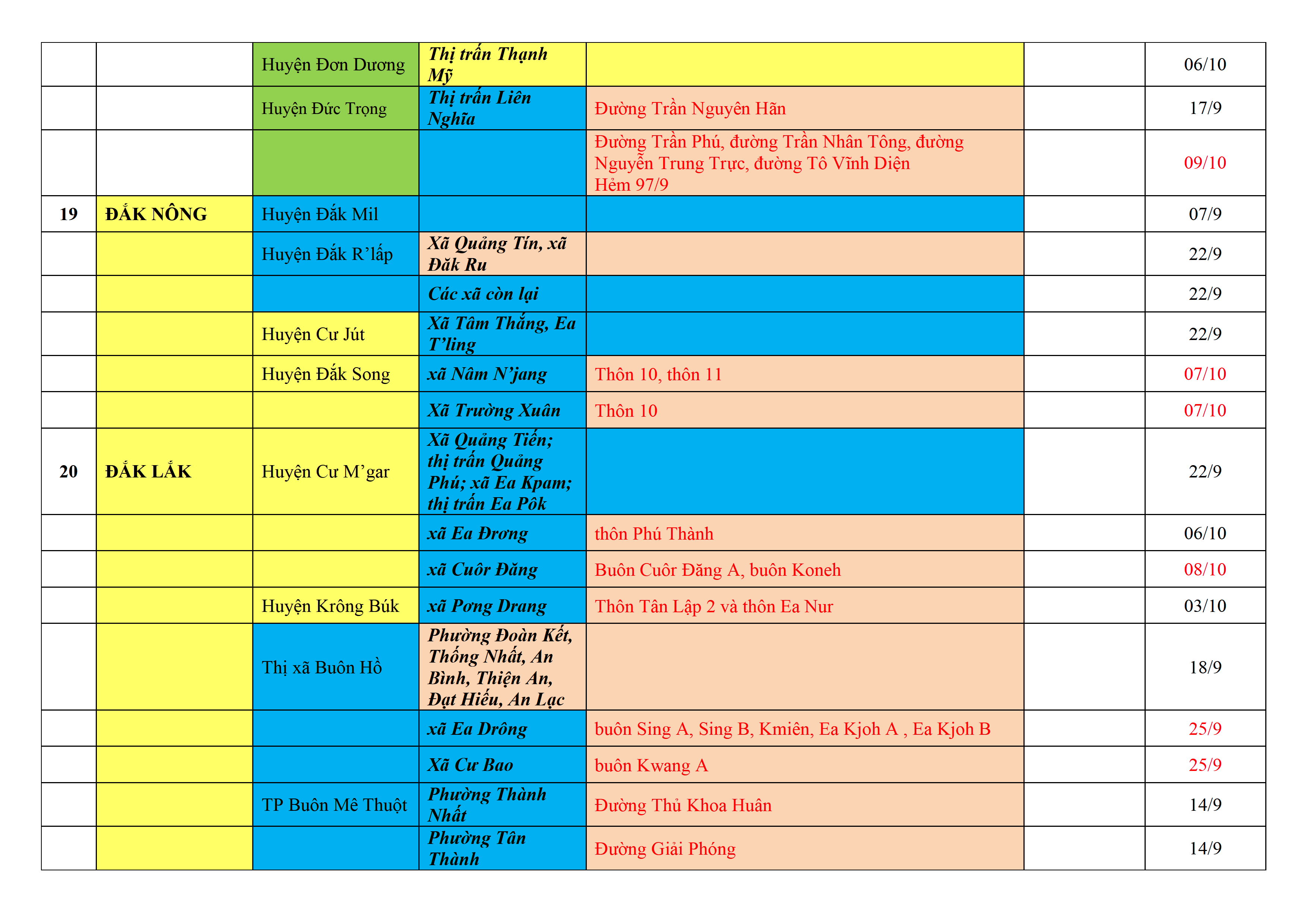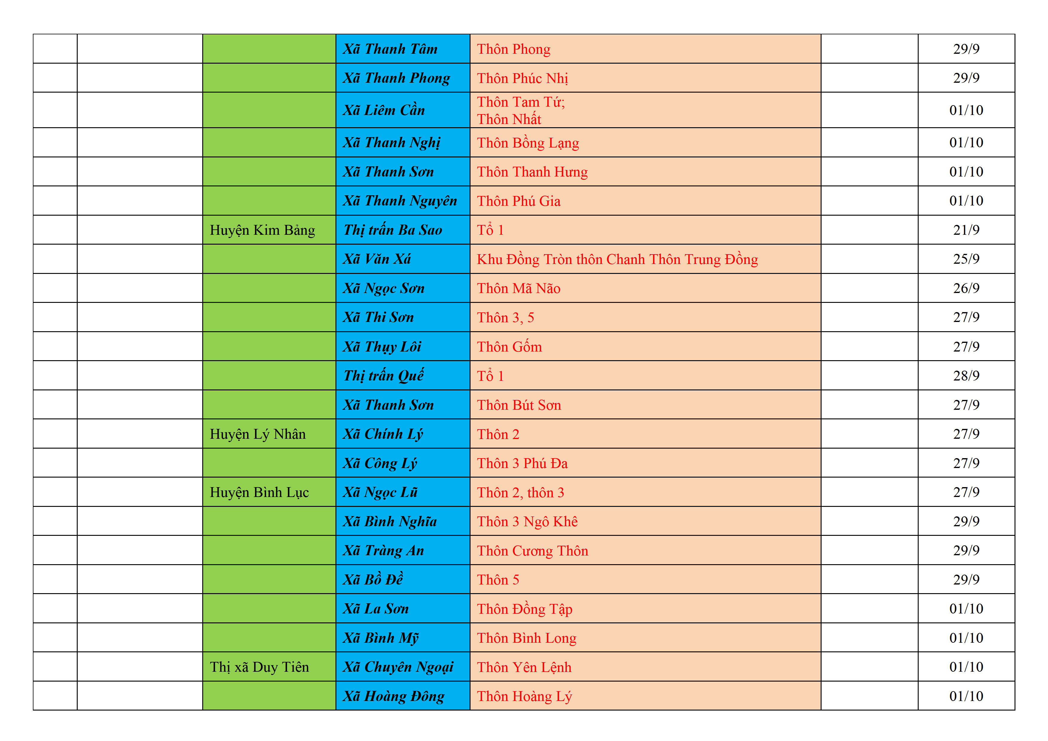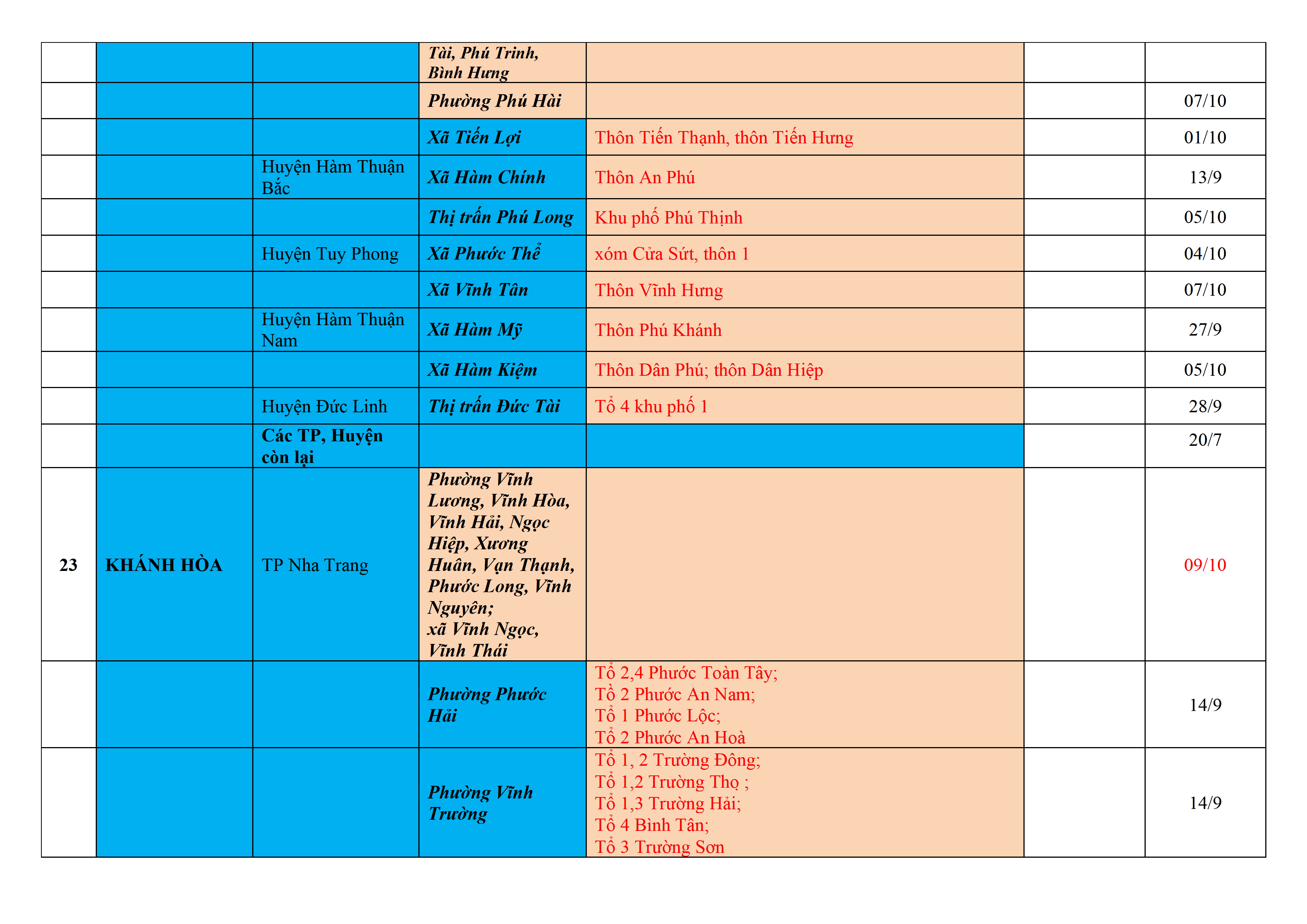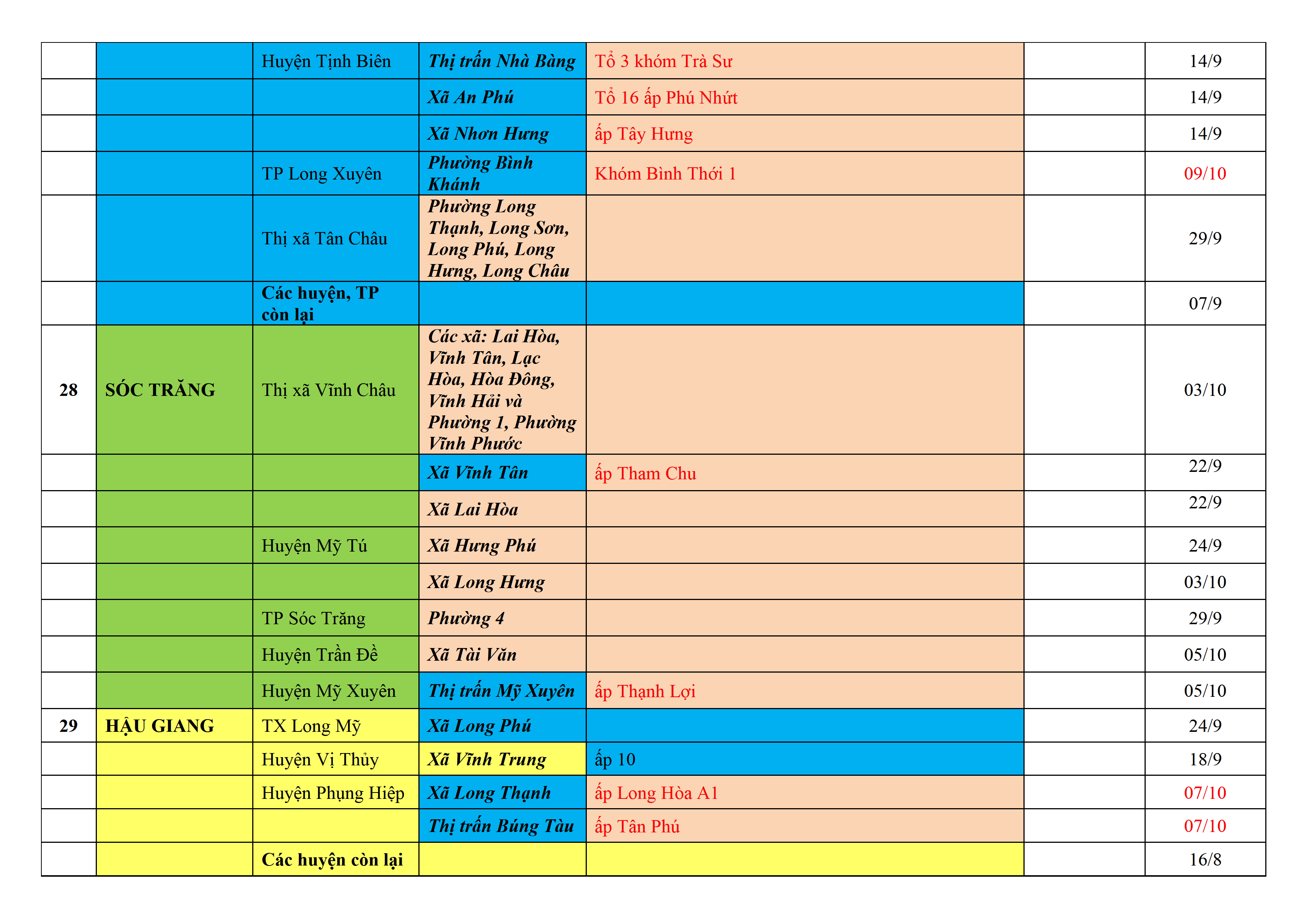 Biện pháp phòng, chống dịch COVID-19: Áp dụng biện pháp tương ứng màu sắc ô cột theo thôn xóm; xã phường; quận huyện; tỉnh thành phố. Cách ly y tế dựa vào việc tiếp xúc, đi đến địa điểm và nơi cư trú có ca bệnh, theo Thông báo của Bộ Y tế, các tỉnh thành phố.