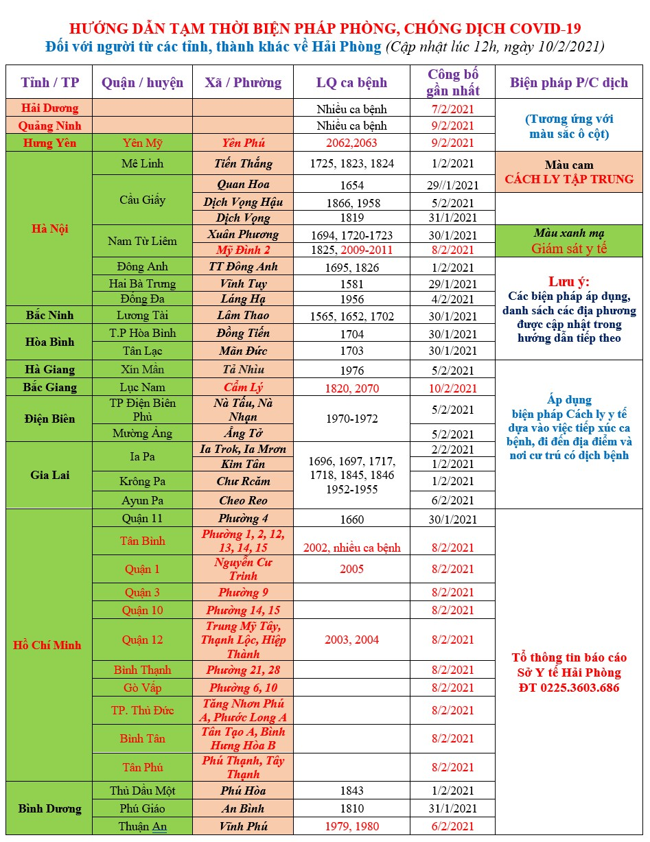 Sở Y tế Hải Phòng ban hành hướng dẫn tạm thời biện pháp phòng chống dịch COVID-19 đối với người từ các tỉnh, thành khác về thành phố như sau (thông tin cập nhật vào 12 giờ 00 phút ngày 10/2/2021).