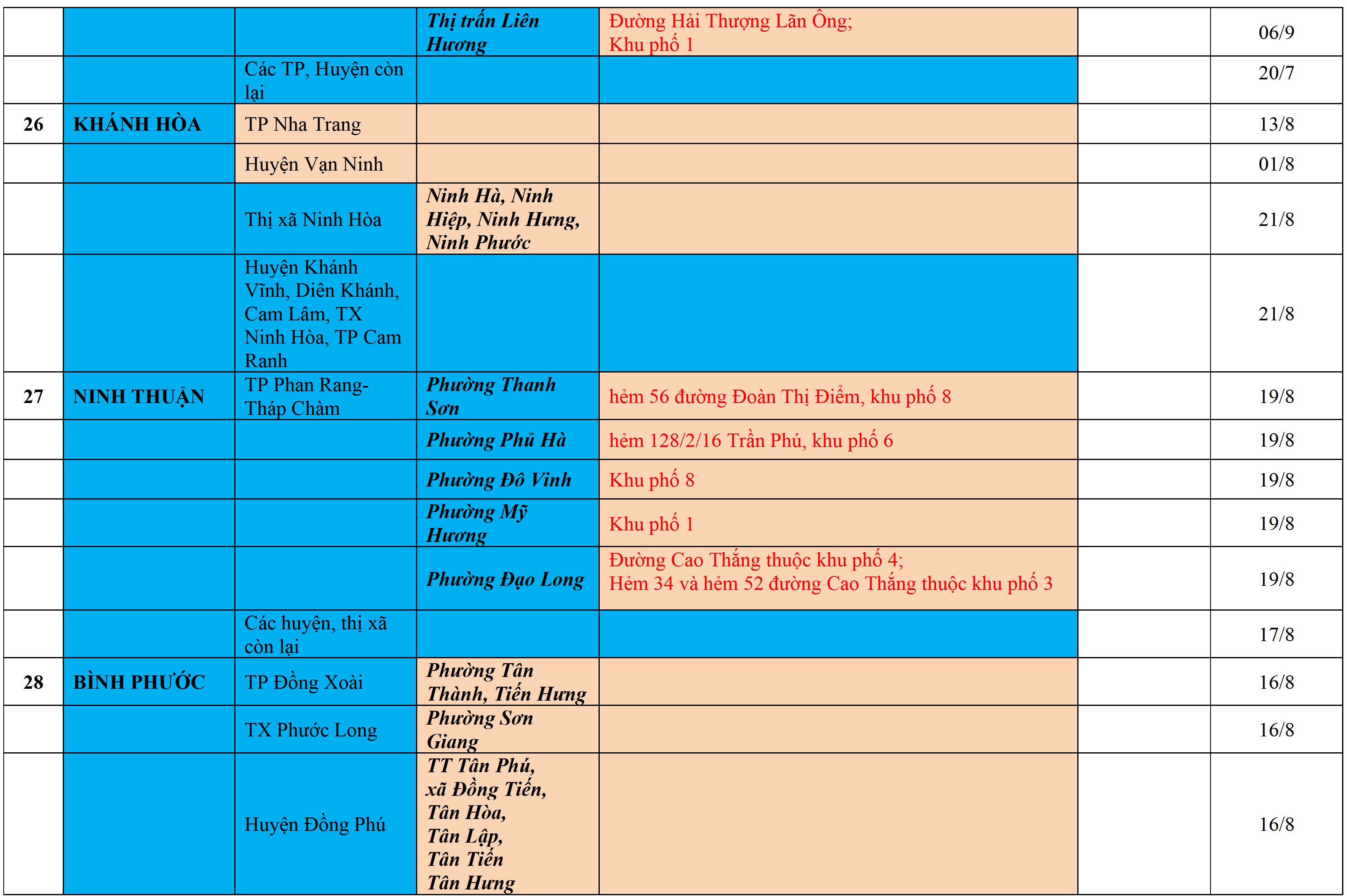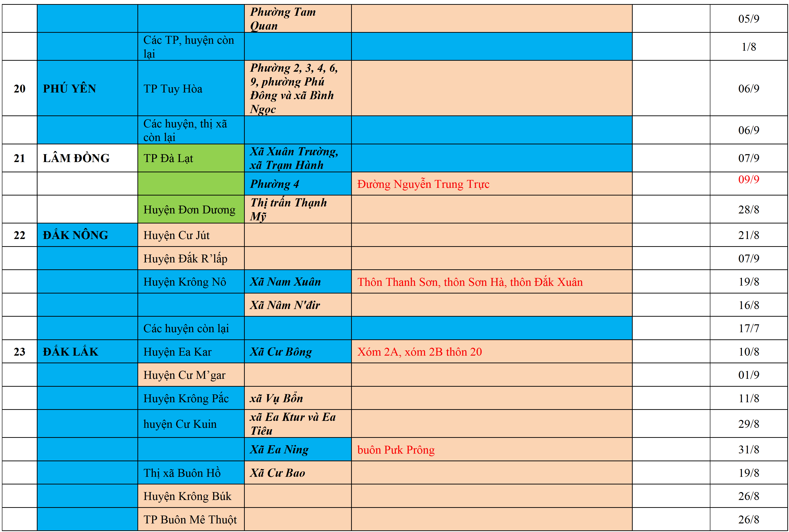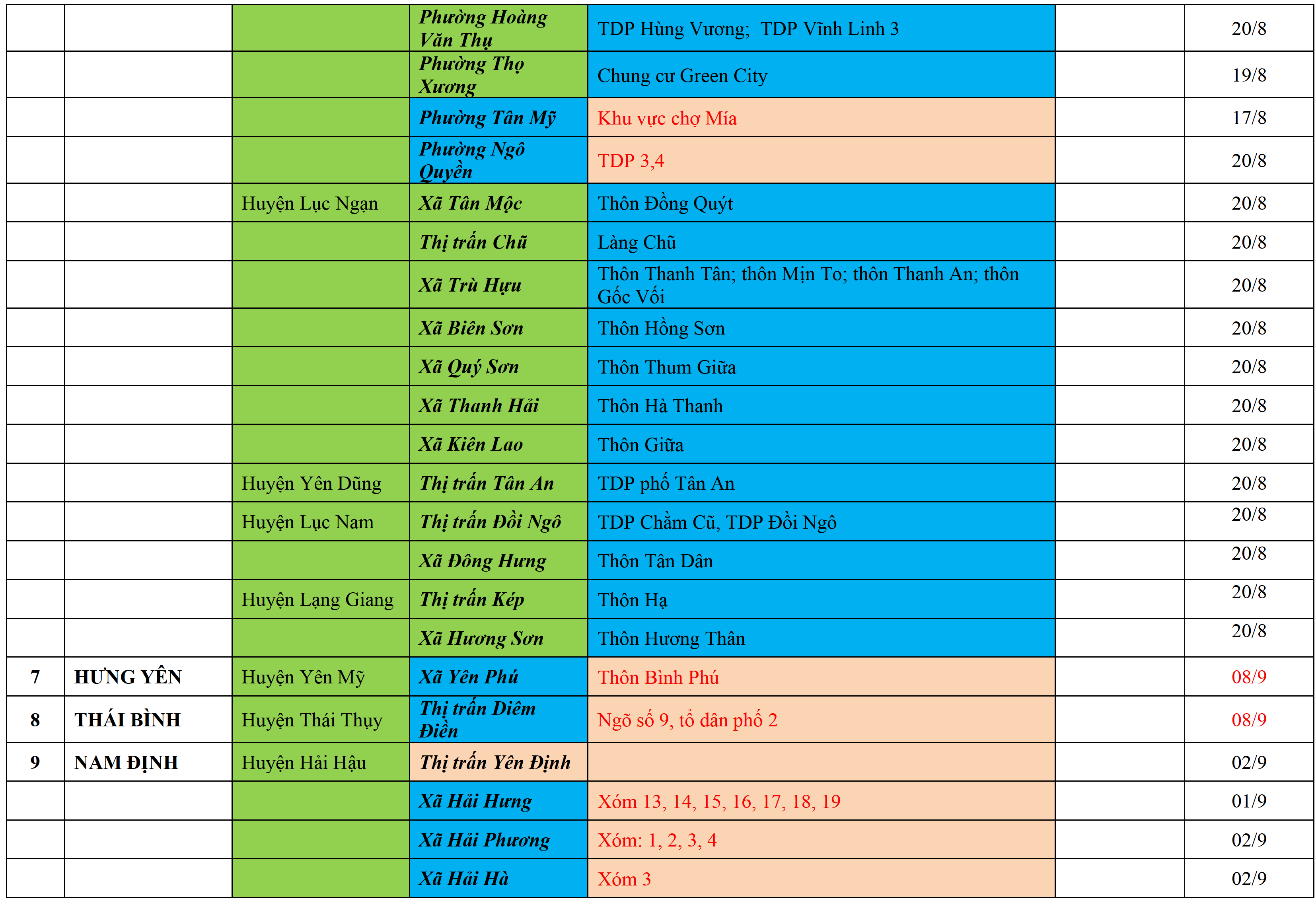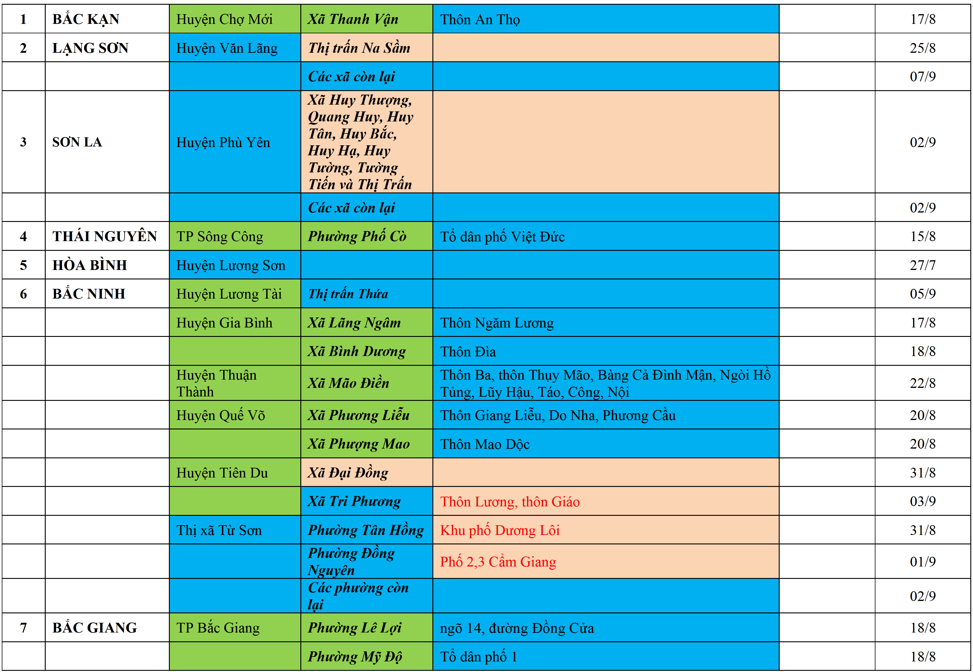 Màu nâu: TẠM DỪNG TIẾP NHẬN; Màu cam: CÁCH LY TẬP TRUNG 14 NGÀY; Màu xanh nước biển: CÁCH LY TẠI NHÀ 14 NGÀY; Màu xanh mạ: KHAI BÁO, GIÁM SÁT Y TẾ; Màu trắng: KHAI BÁO Y TẾ VÀ THỰC HIỆN 5K.