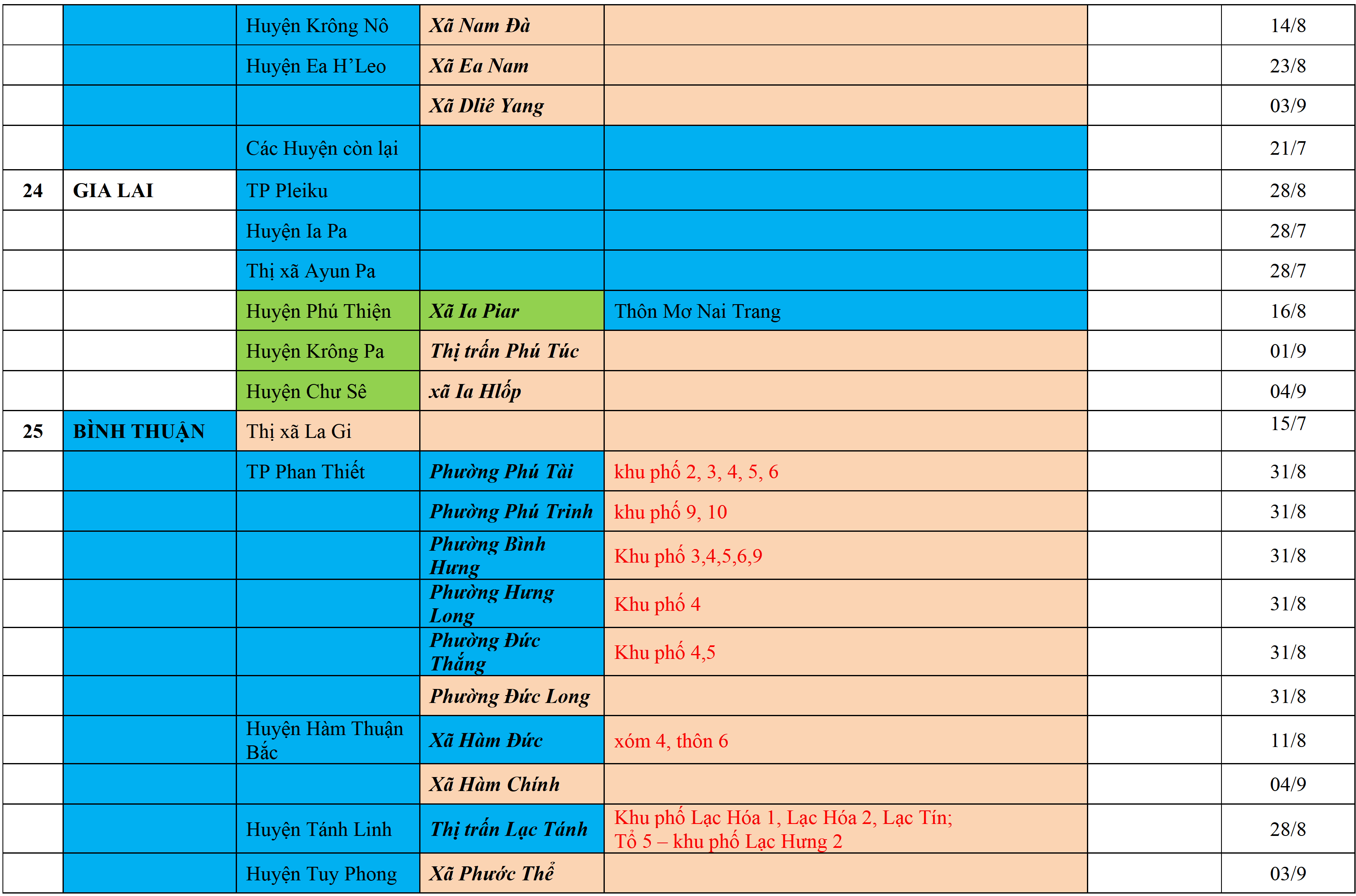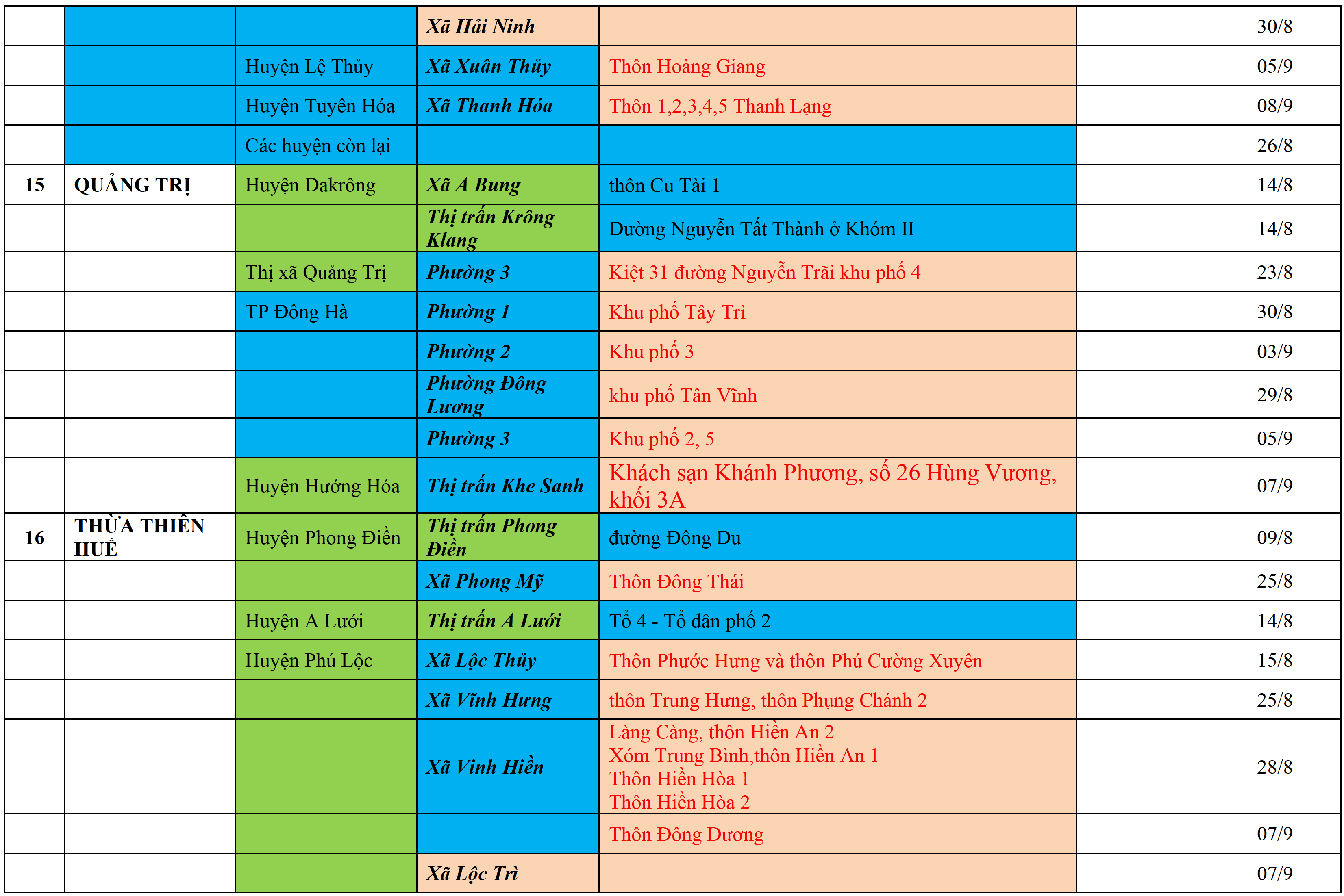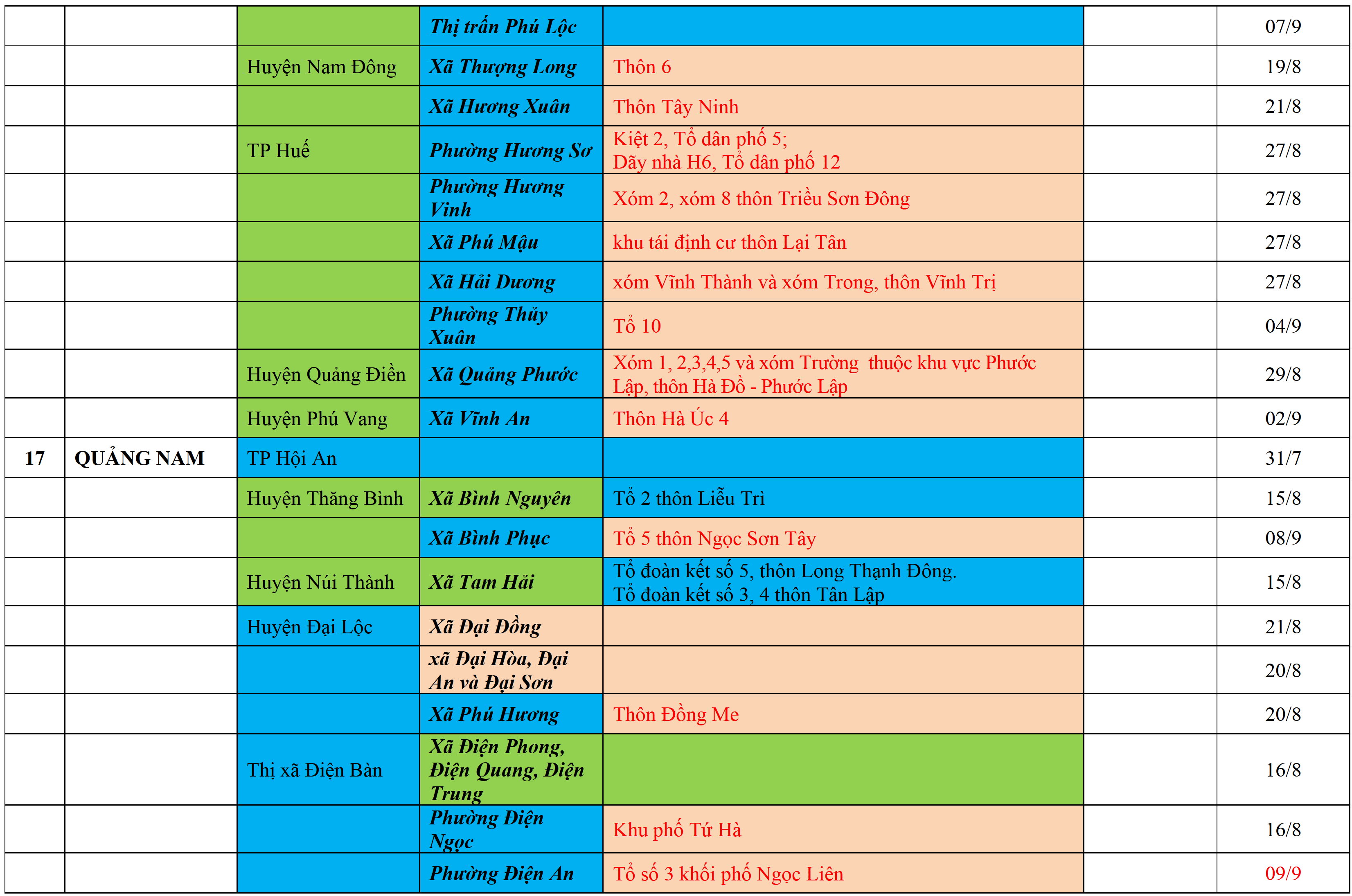 Màu nâu: TẠM DỪNG TIẾP NHẬN; Màu cam: CÁCH LY TẬP TRUNG 14 NGÀY; Màu xanh nước biển: CÁCH LY TẠI NHÀ 14 NGÀY; Màu xanh mạ: KHAI BÁO, GIÁM SÁT Y TẾ; Màu trắng: KHAI BÁO Y TẾ VÀ THỰC HIỆN 5K.