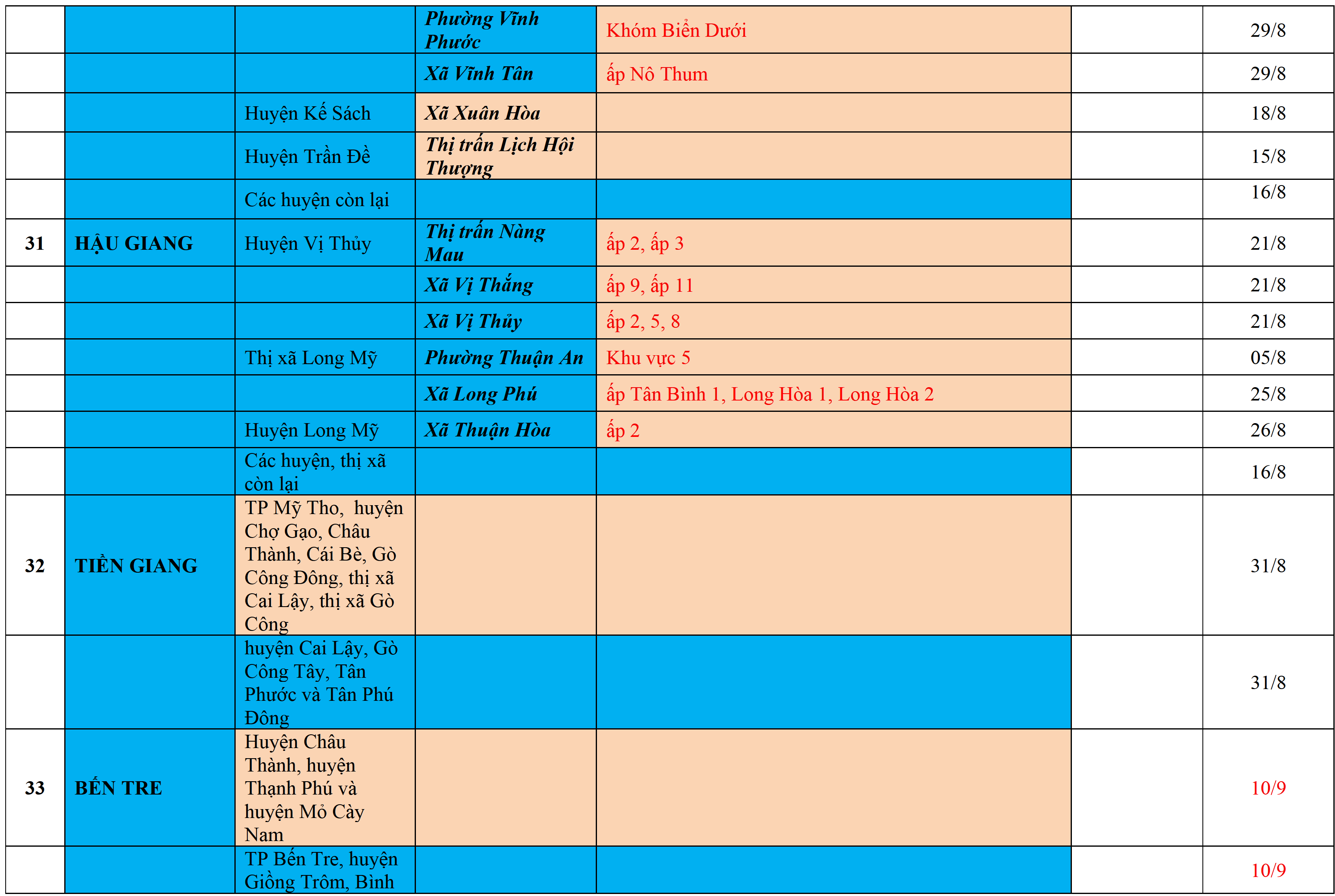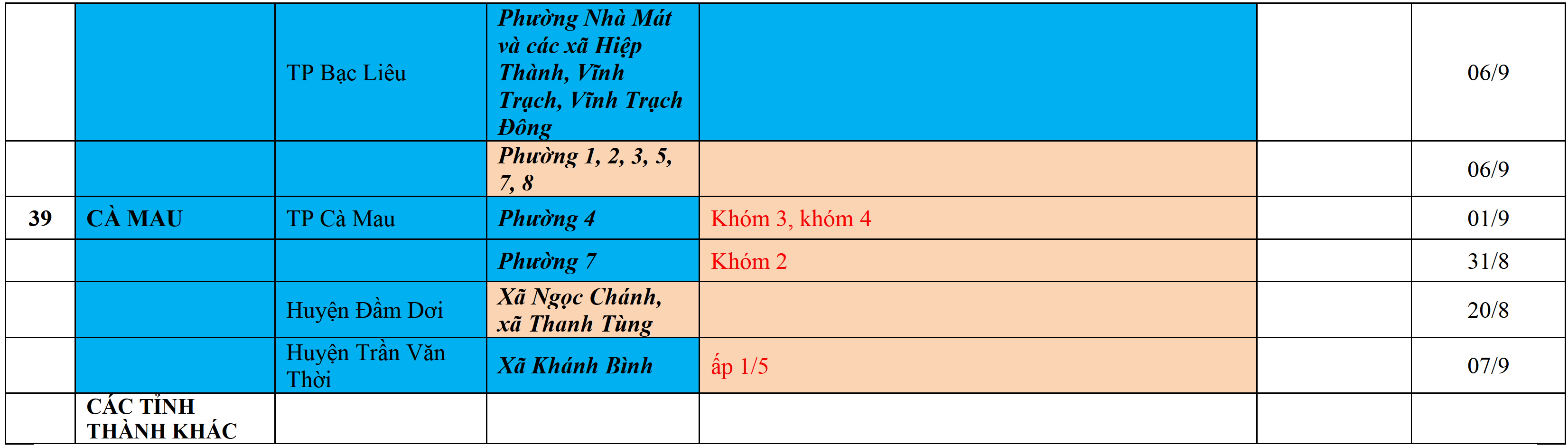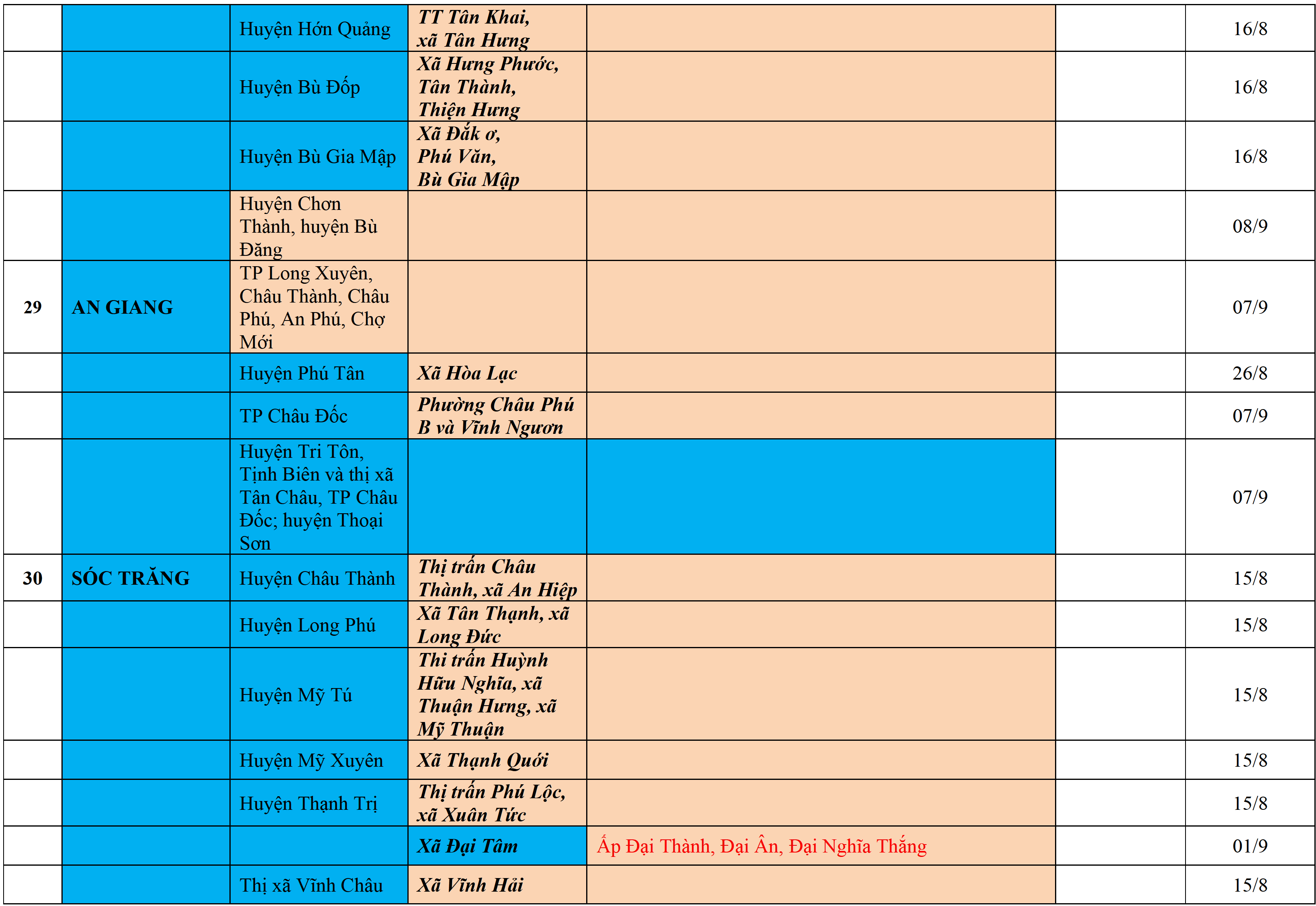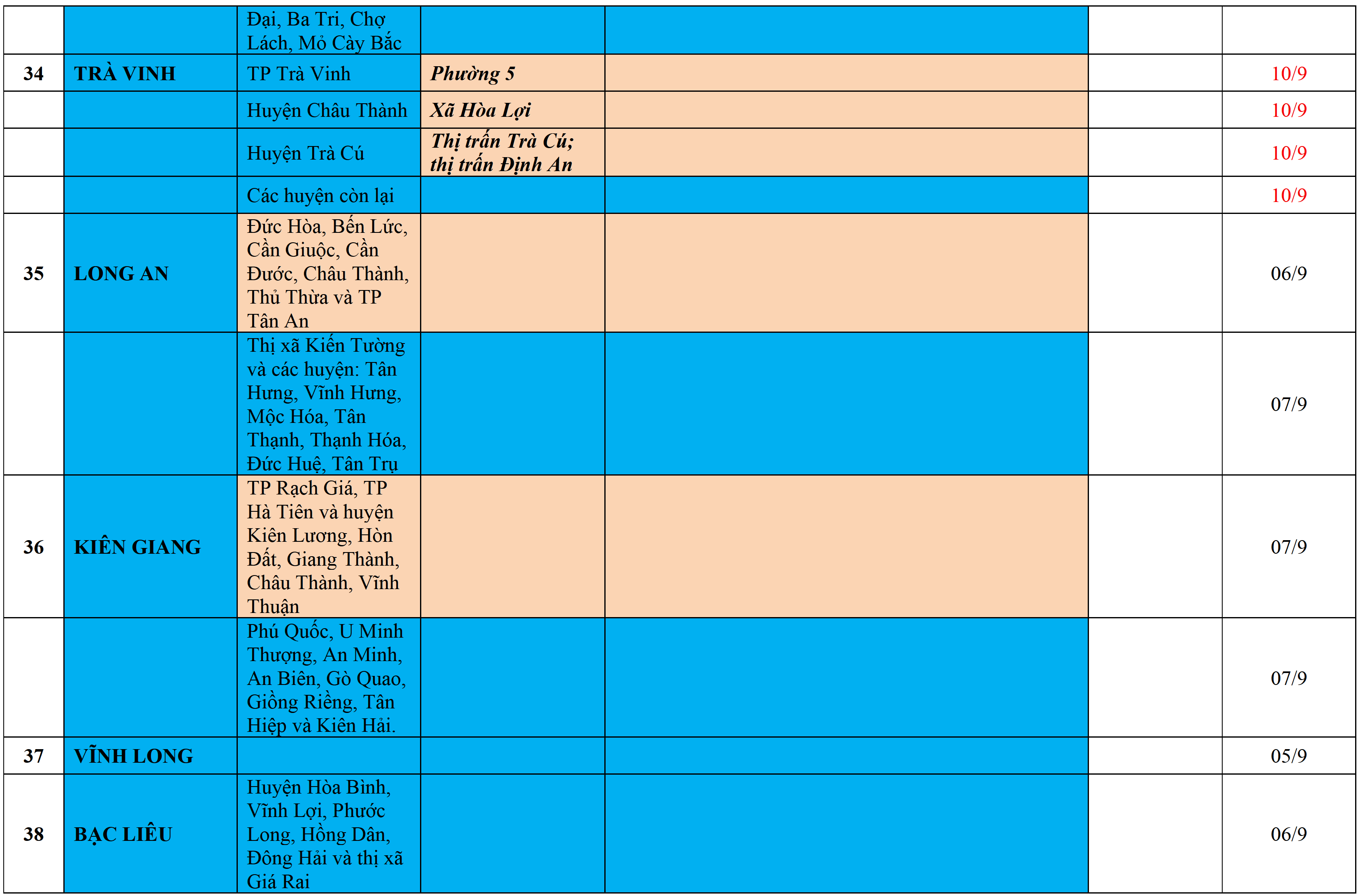Màu nâu: TẠM DỪNG TIẾP NHẬN; Màu cam: CÁCH LY TẬP TRUNG 14 NGÀY; Màu xanh nước biển: CÁCH LY TẠI NHÀ 14 NGÀY; Màu xanh mạ: KHAI BÁO, GIÁM SÁT Y TẾ; Màu trắng: KHAI BÁO Y TẾ VÀ THỰC HIỆN 5K.