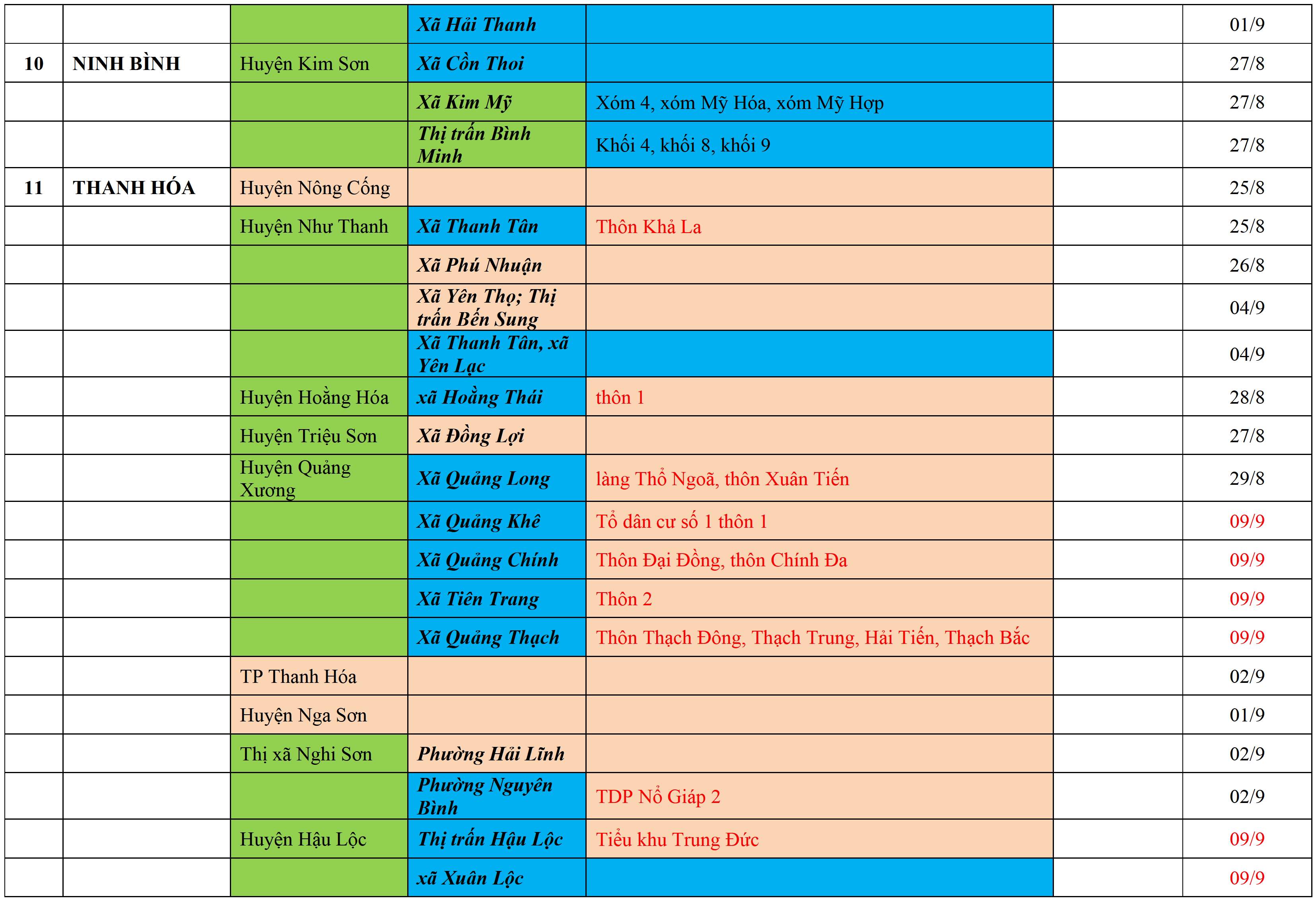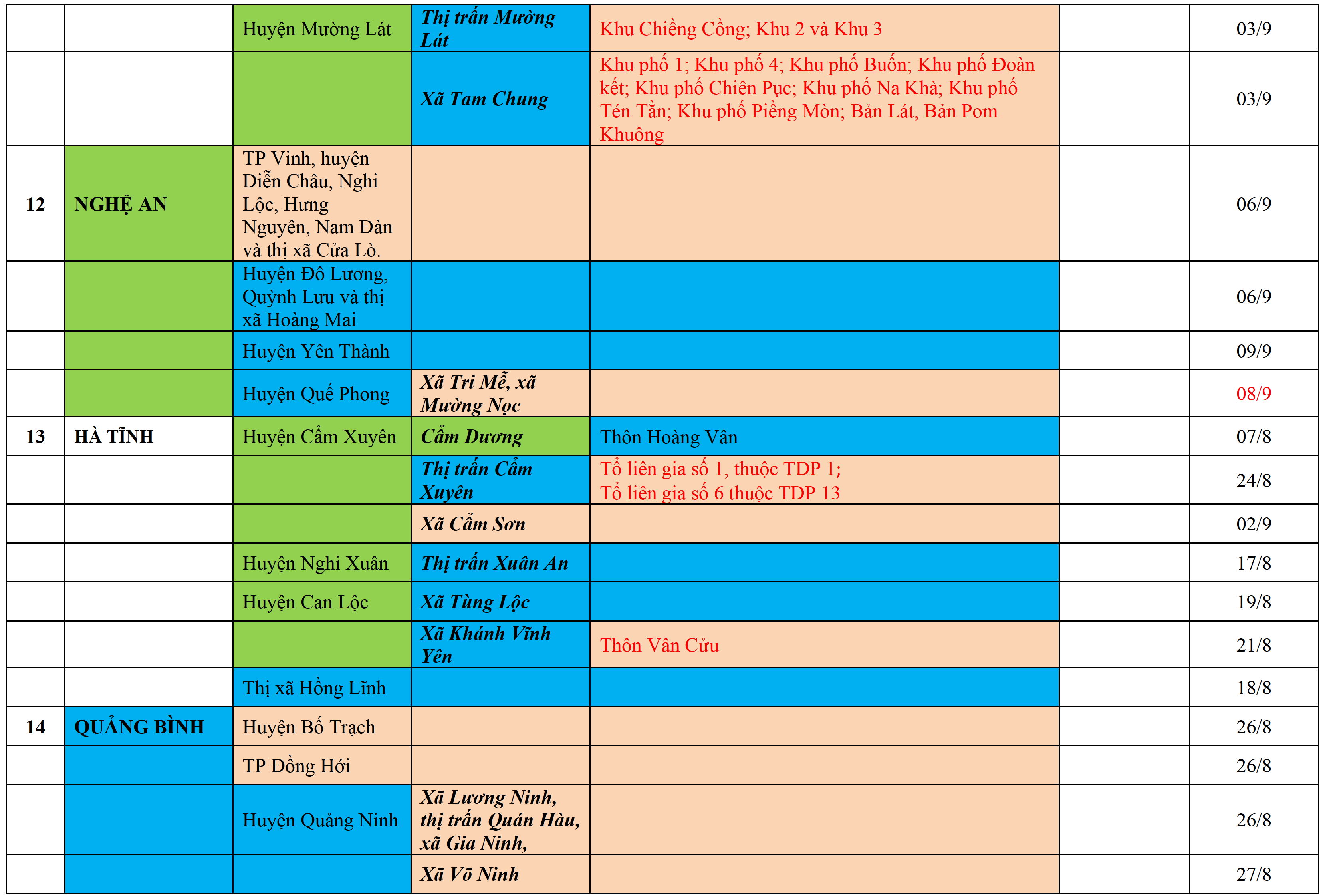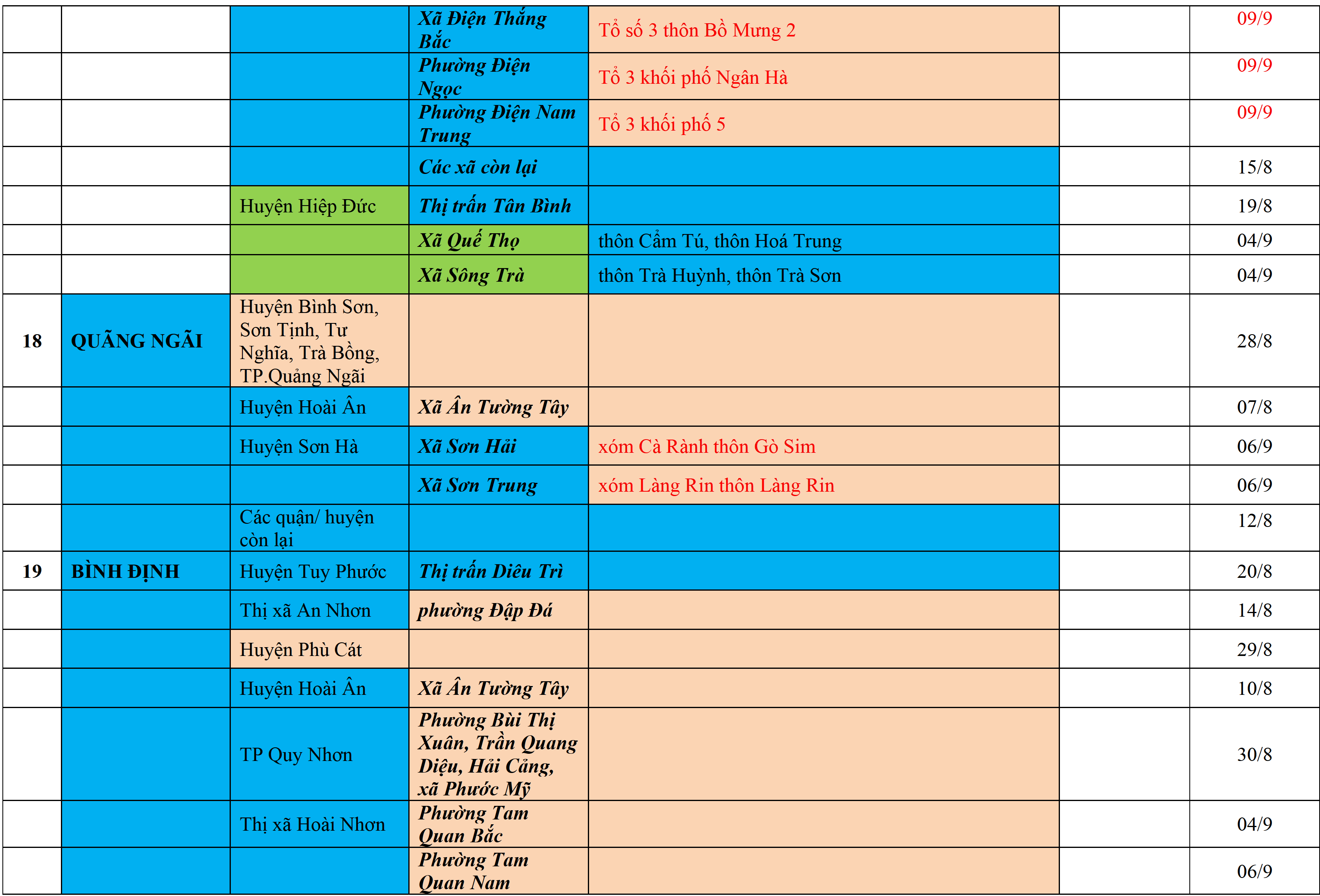 Biện pháp phòng chống dịch: Áp dụng biện pháp tương ứng màu sắc ô cột theo thôn xóm; xã phường; quận huyện; tỉnh thành phố. Cách ly y tế dựa vào việc tiếp xúc, đi đến địa điểm và nơi cư trú có ca bệnh, theo Thông báo của Bộ Y tế, các tỉnh thành phố.