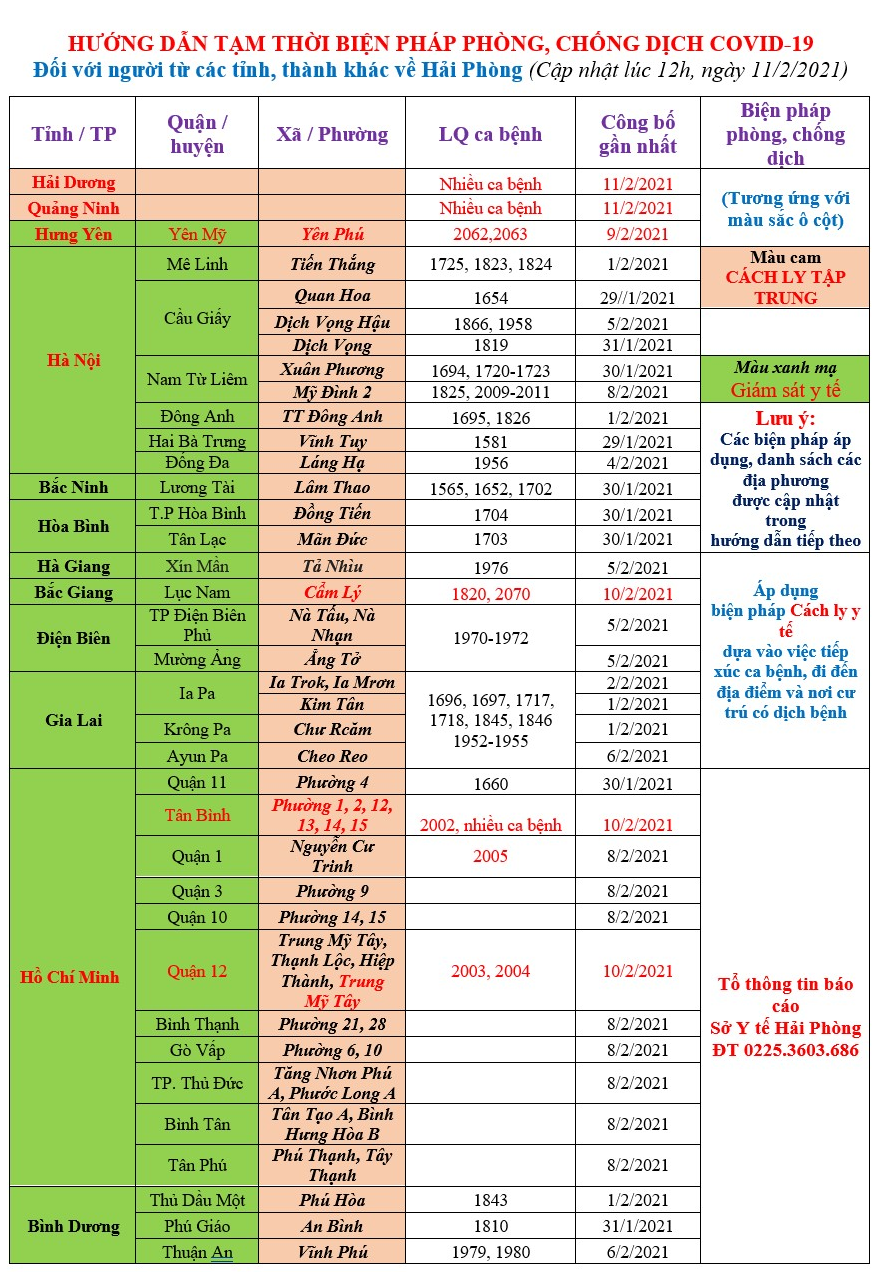Sở Y tế Hải Phòng ban hành hướng dẫn tạm thời biện pháp phòng chống dịch COVID-19 đối với người từ các tỉnh, thành khác về thành phố như sau (thông tin cập nhật vào 12h00’ ngày 11/2/2021):