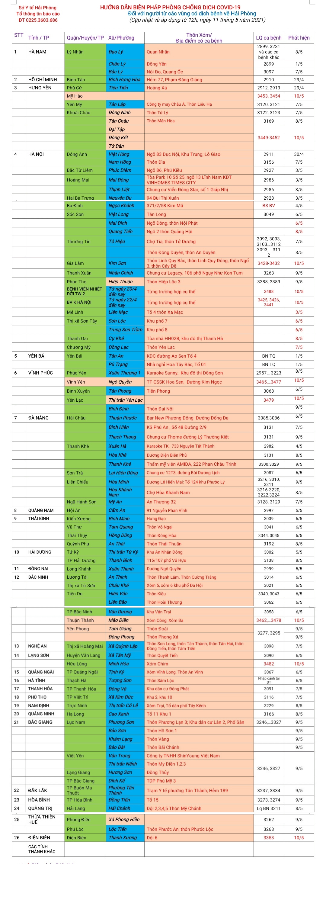 Sở Y tế Hải Phòng ban hành hướng dẫn tạm thời biện pháp phòng chống dịch COVID-19 đối với người từ các tỉnh, thành khác về thành phố như sau (thông tin cập nhật vào 12h00’ ngày 11/5/2021):