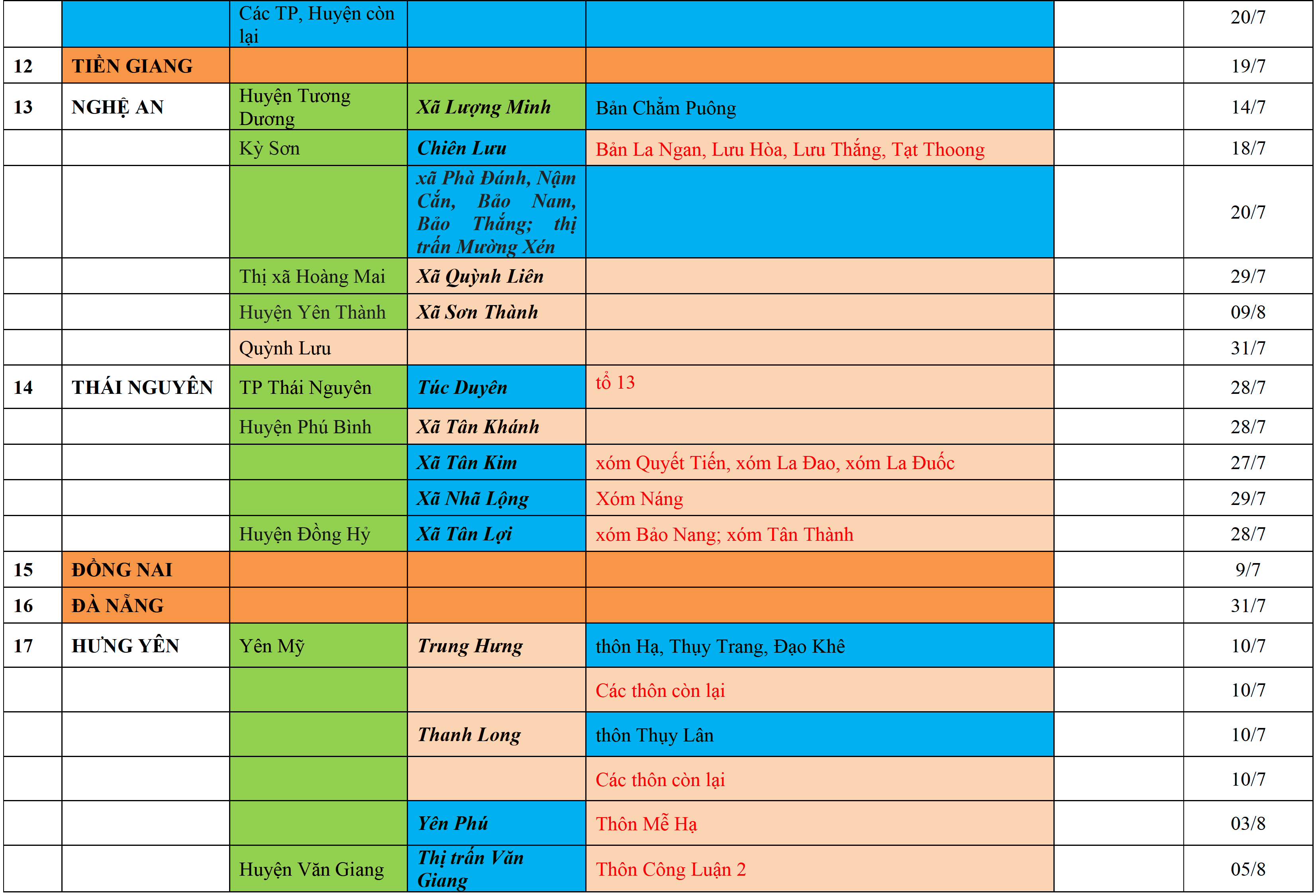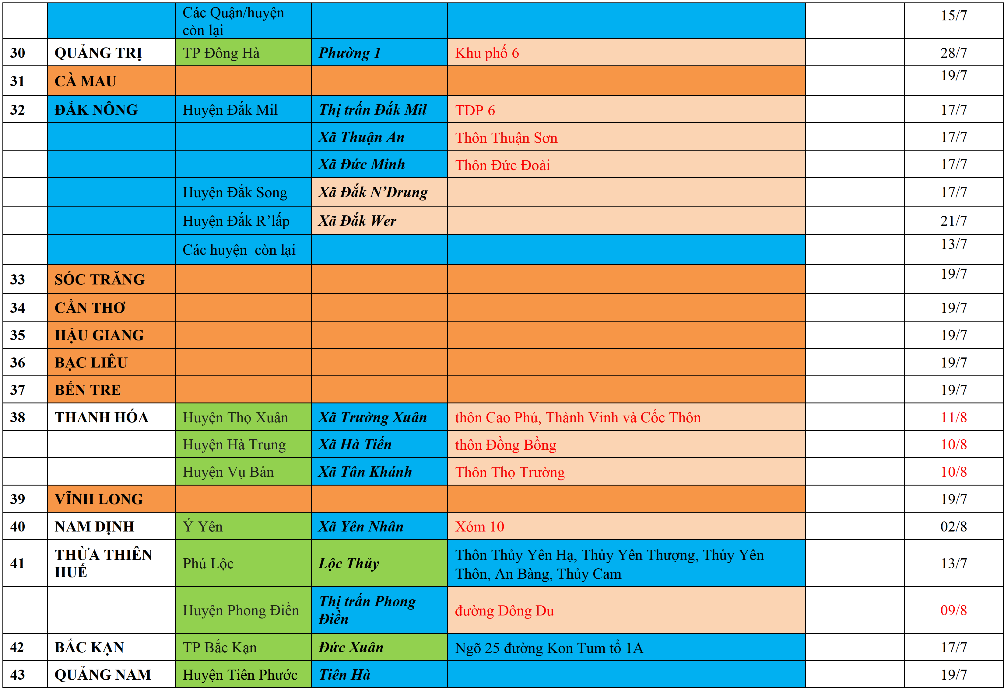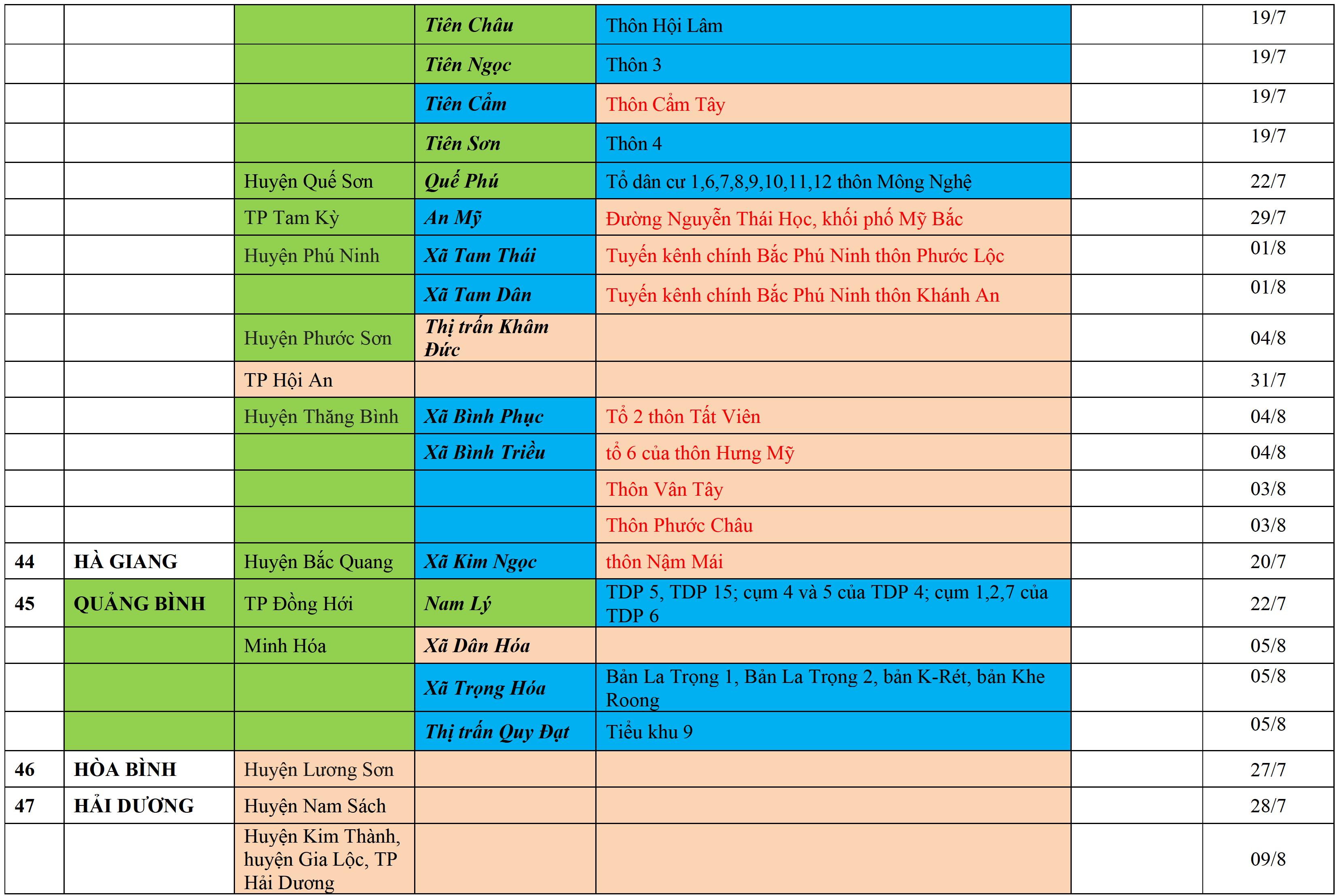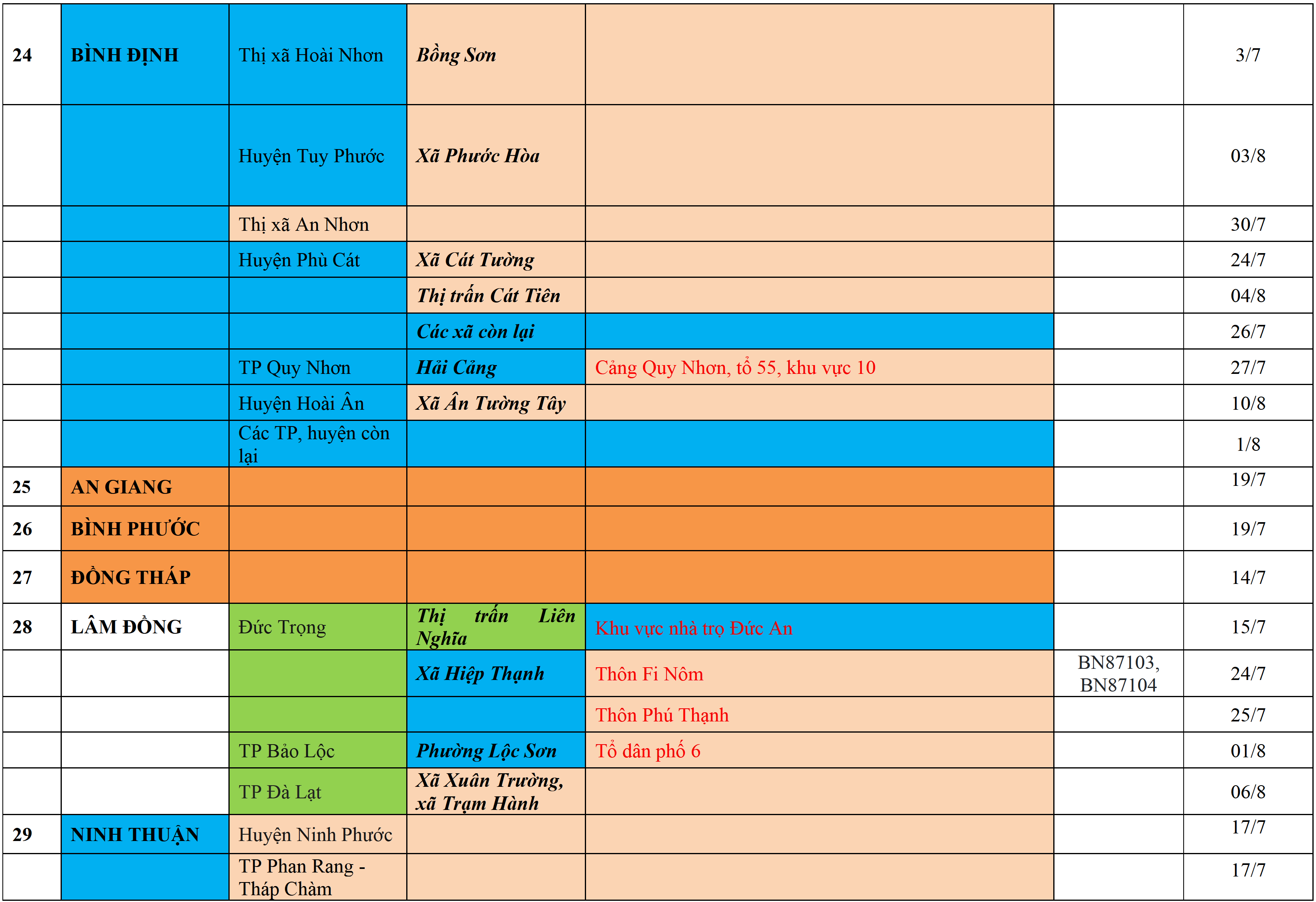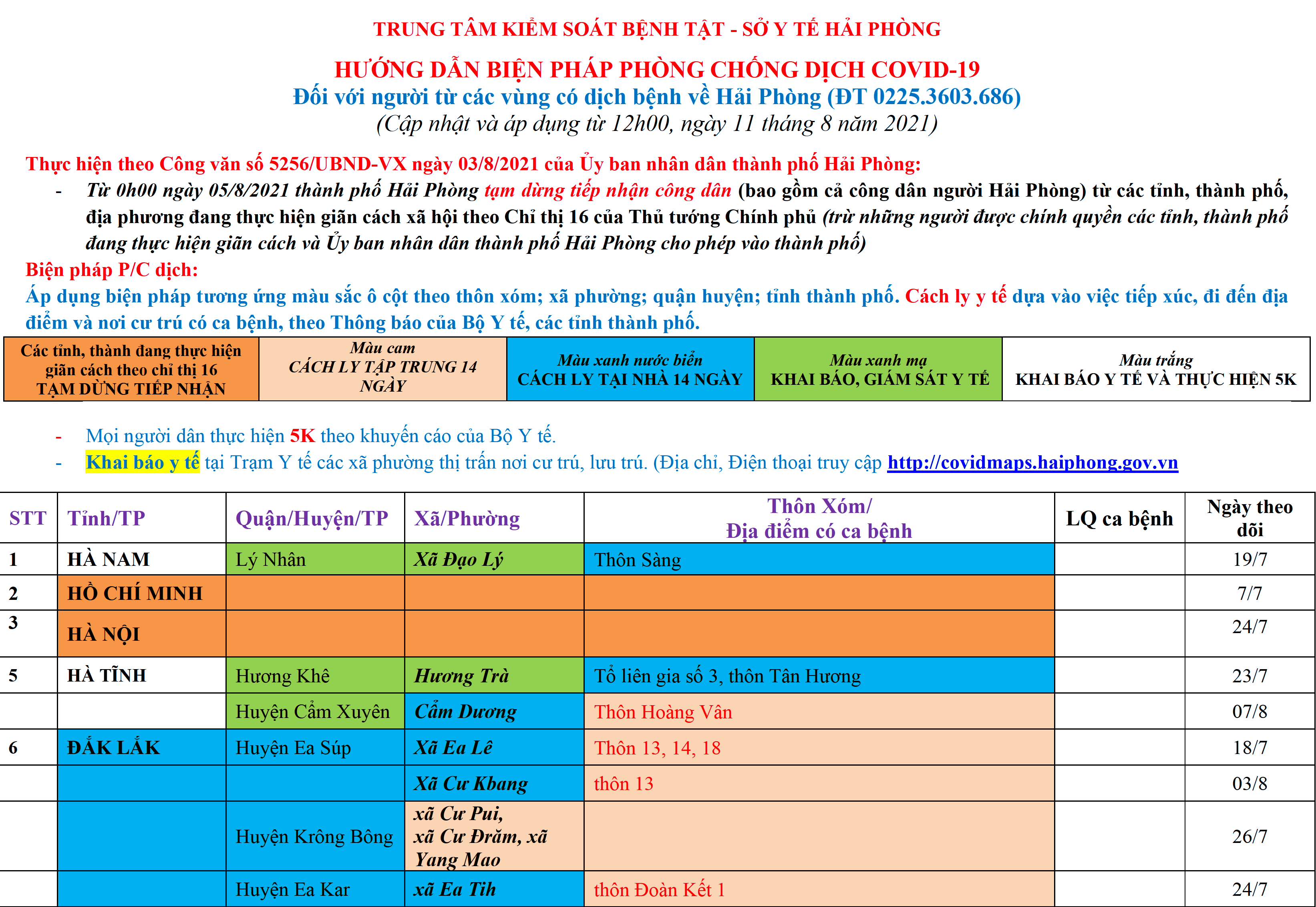 Màu nâu: TẠM DỪNG TIẾP NHẬN; Màu cam: CÁCH LY TẬP TRUNG 14 NGÀY; Màu xanh nước biển: CÁCH LY TẠI NHÀ 14 NGÀY; Màu xanh mạ: KHAI BÁO, GIÁM SÁT Y TẾ; Màu trắng: KHAI BÁO Y TẾ VÀ THỰC HIỆN 5K.