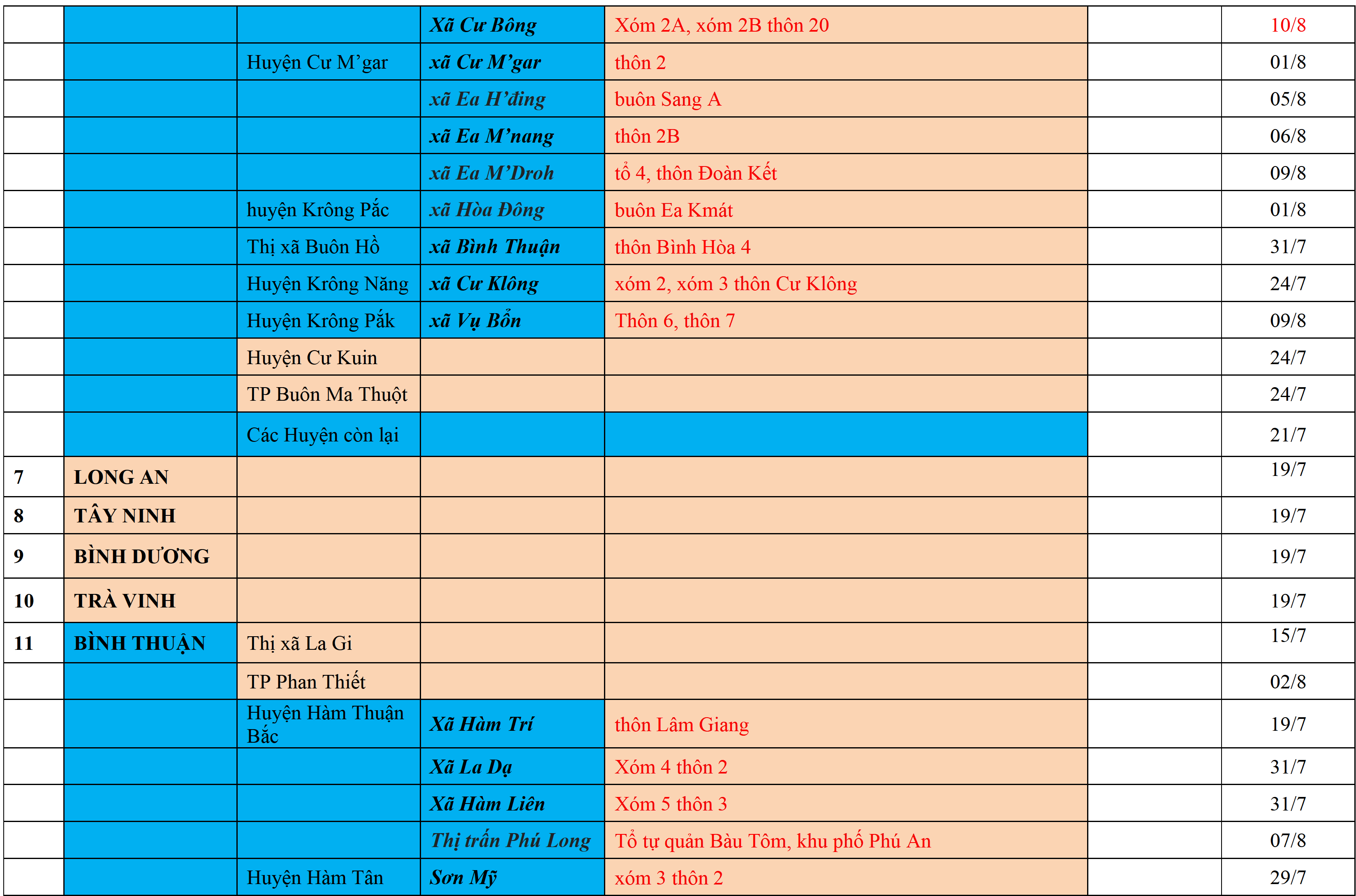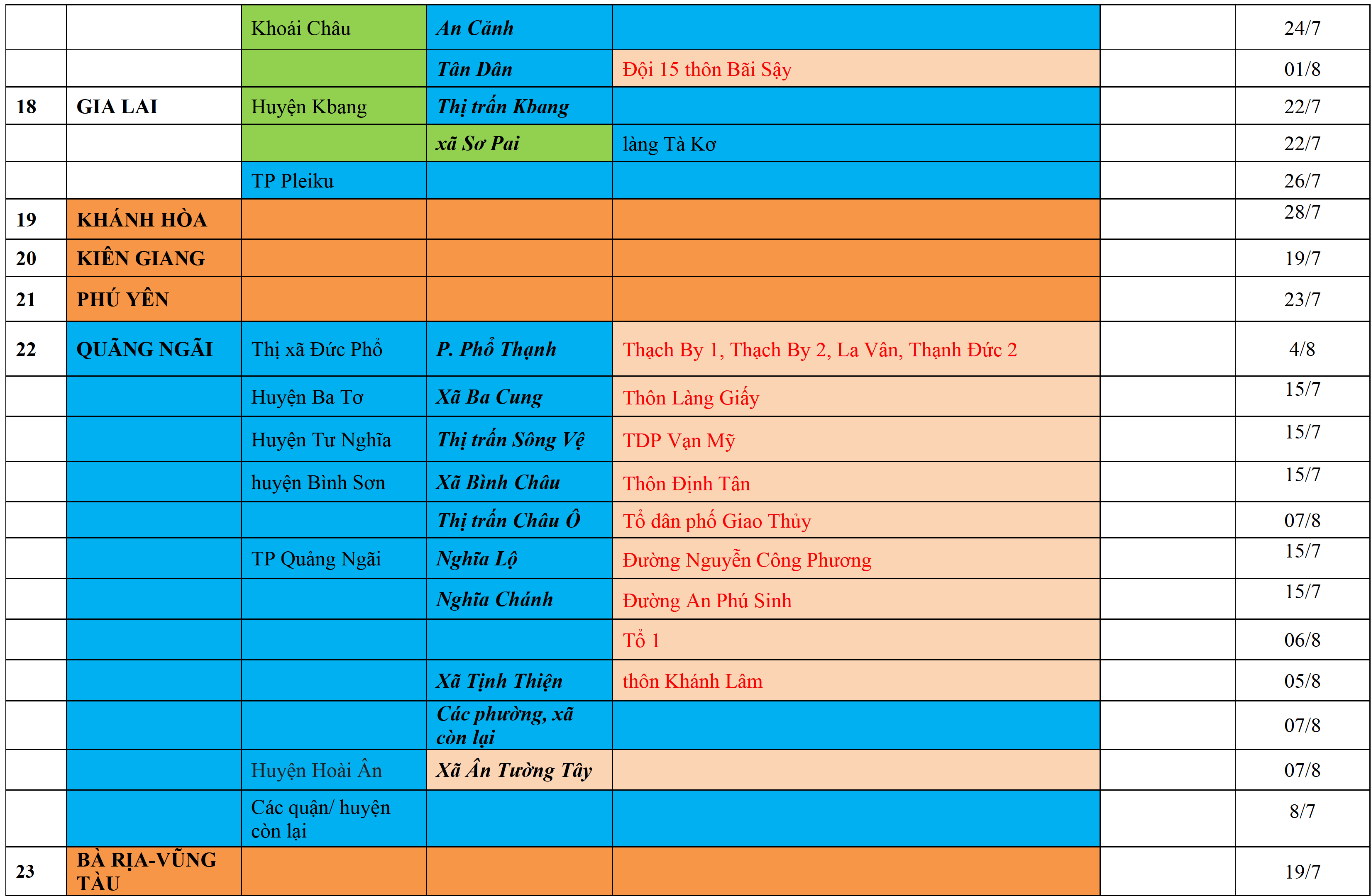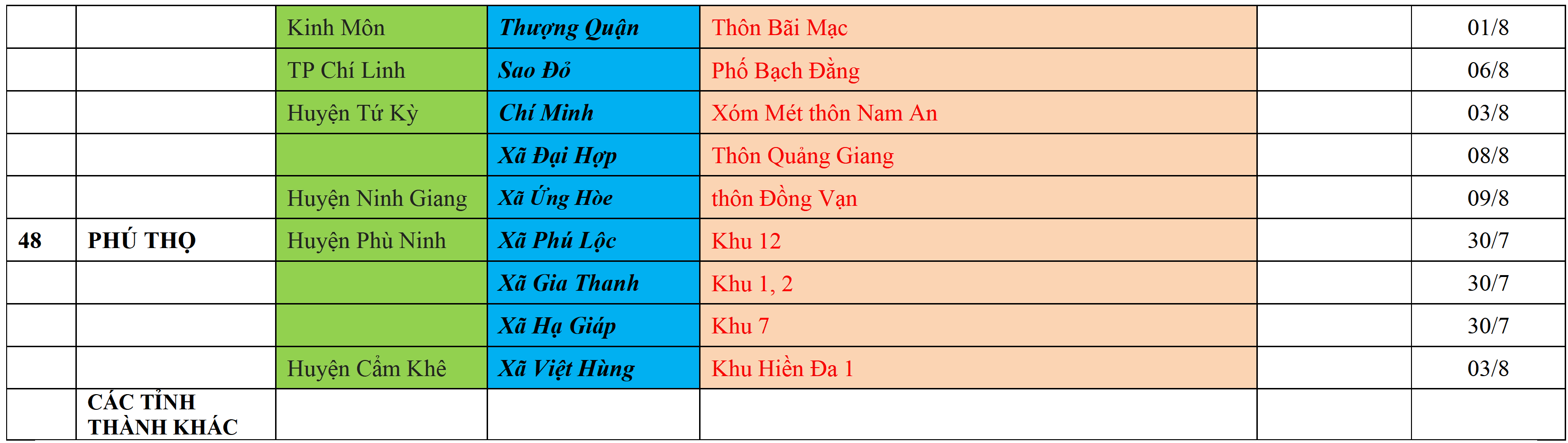 Biện pháp phòng chống dịch: Áp dụng biện pháp tương ứng màu sắc ô cột theo thôn xóm; xã phường; quận huyện; tỉnh thành phố. Cách ly y tế dựa vào việc tiếp xúc, đi đến địa điểm và nơi cư trú có ca bệnh, theo Thông báo của Bộ Y tế, các tỉnh thành phố.