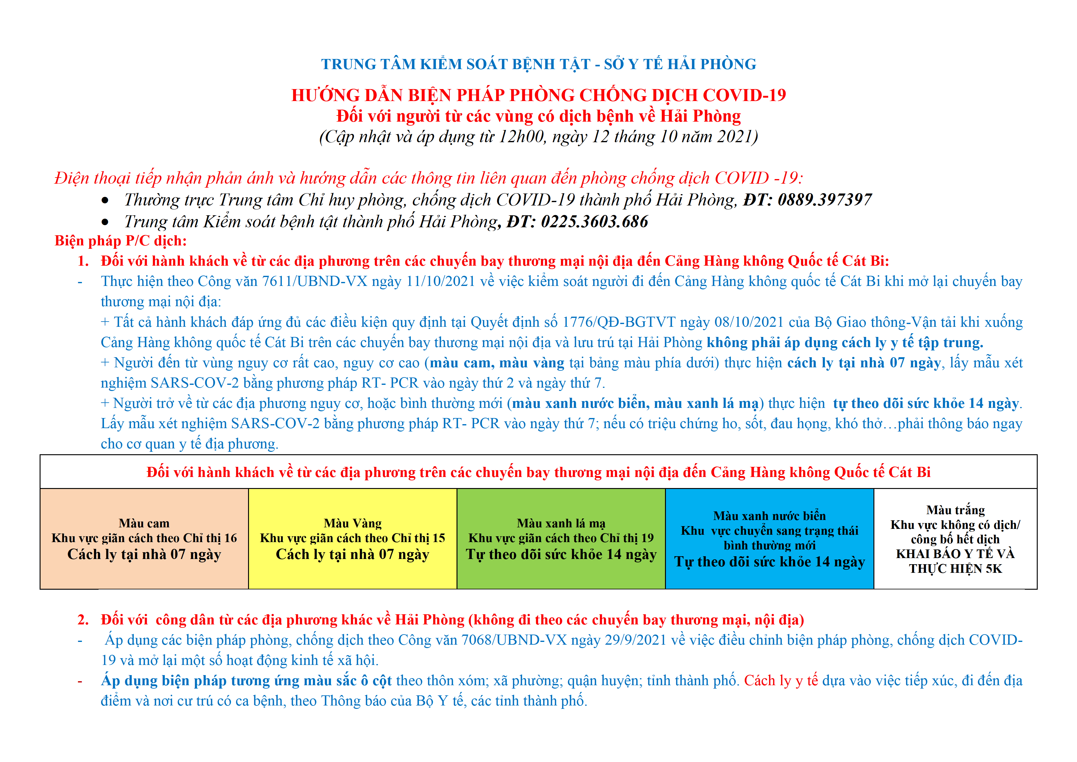 – Thực hiện theo Công văn 7611/UBND-VX ngày 11/10/2021 về việc kiểm soát người đi đến Cảng Hàng không quốc tế Cát Bi khi mở lại chuyến bay thương mại nội địa: