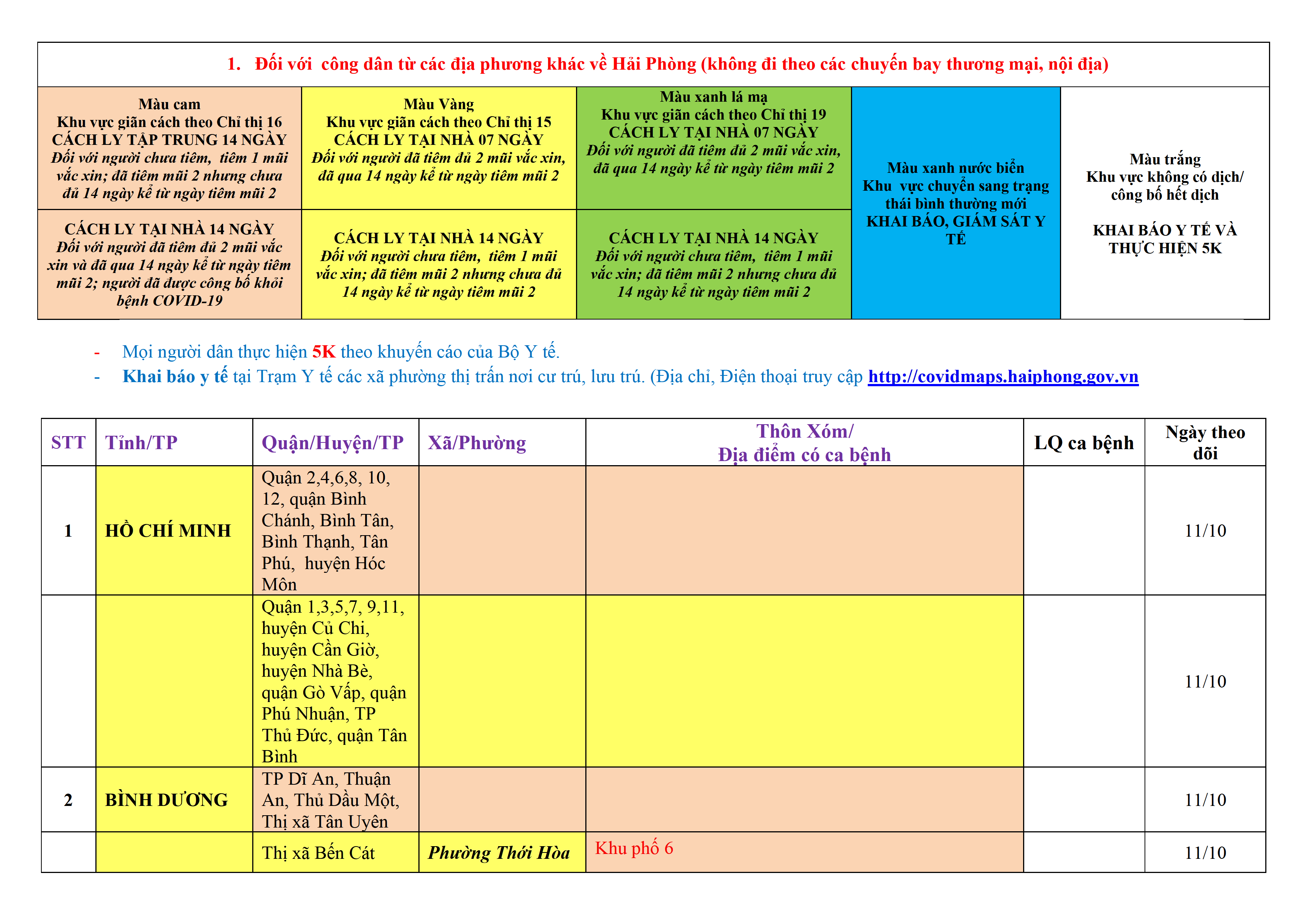 . Mọi người dân thực hiện 5K theo khuyến cáo của Bộ Y tế. Khai báo y tế tại Trạm Y tế các xã phường thị trấn nơi cư trú, lưu trú. (Địa chỉ, Điện thoại truy cập http://covidmaps.haiphong.gov.vn).
