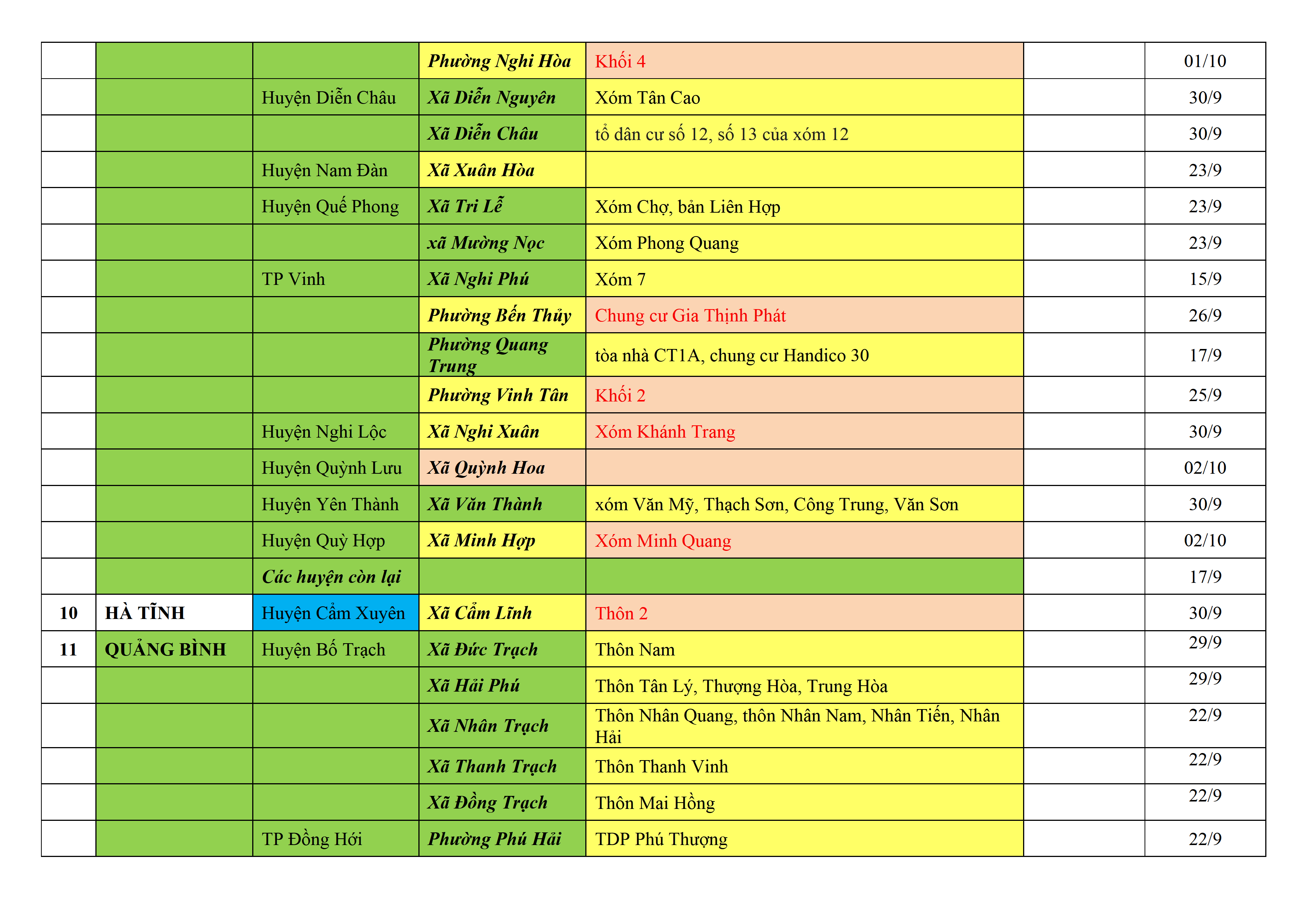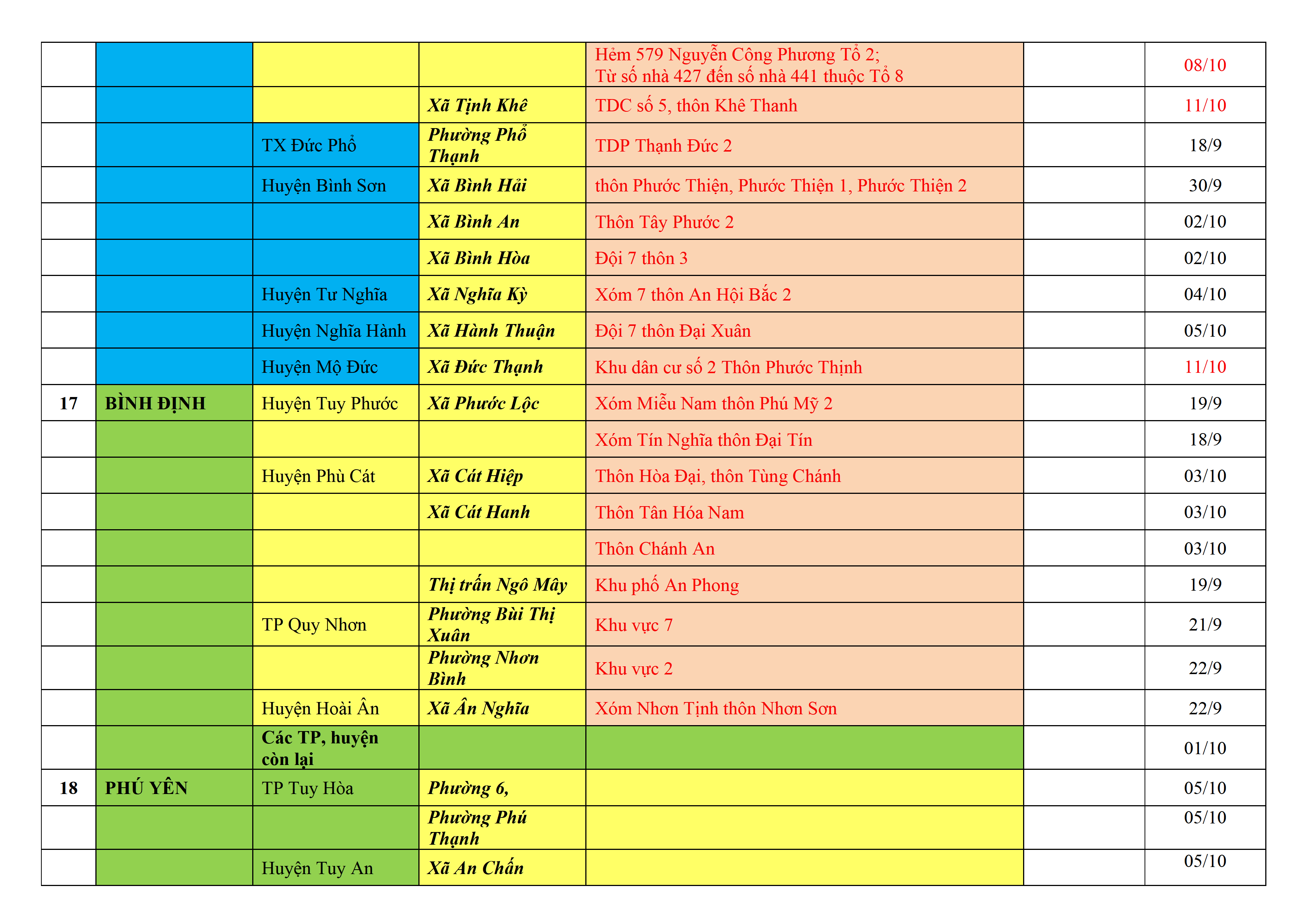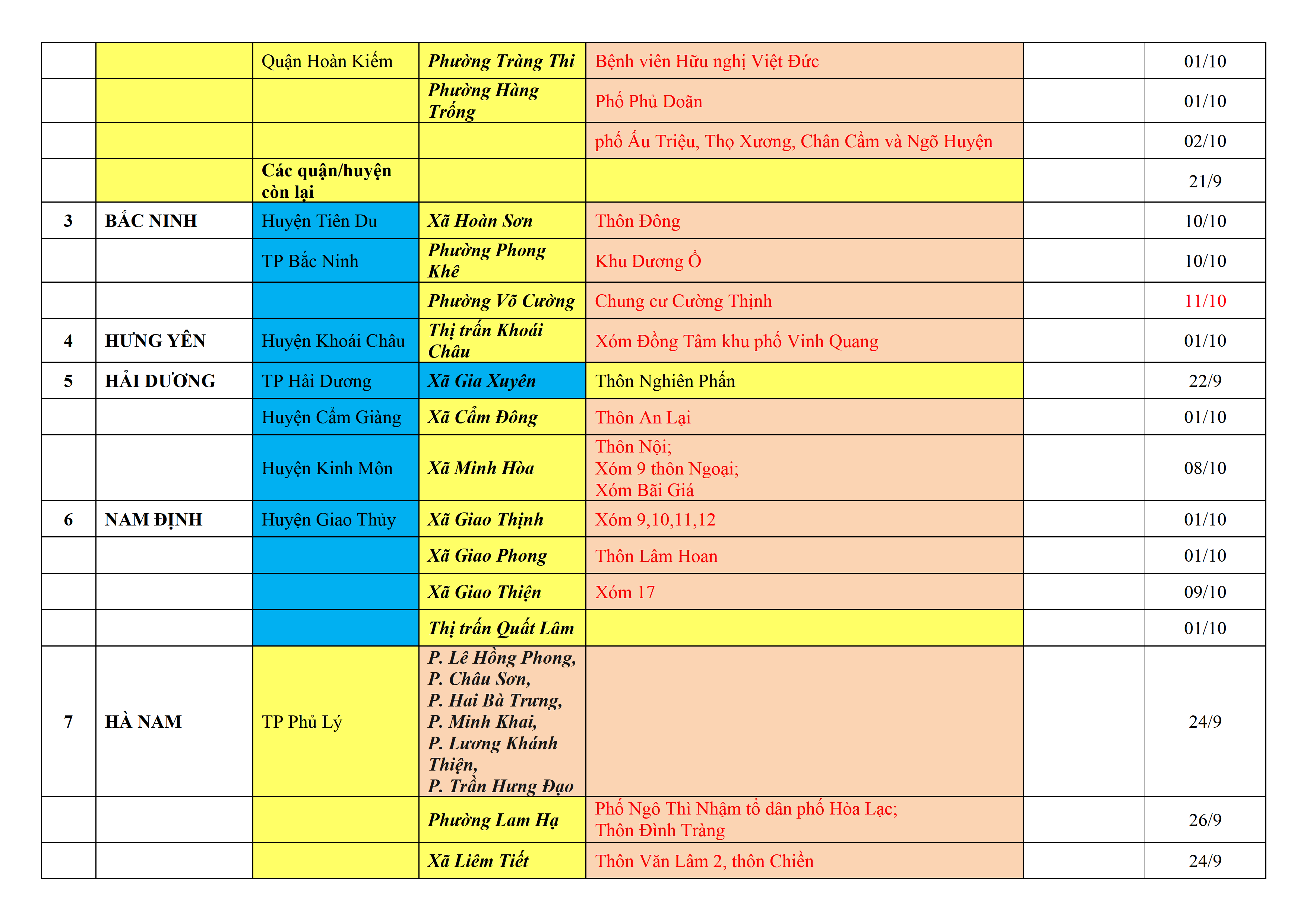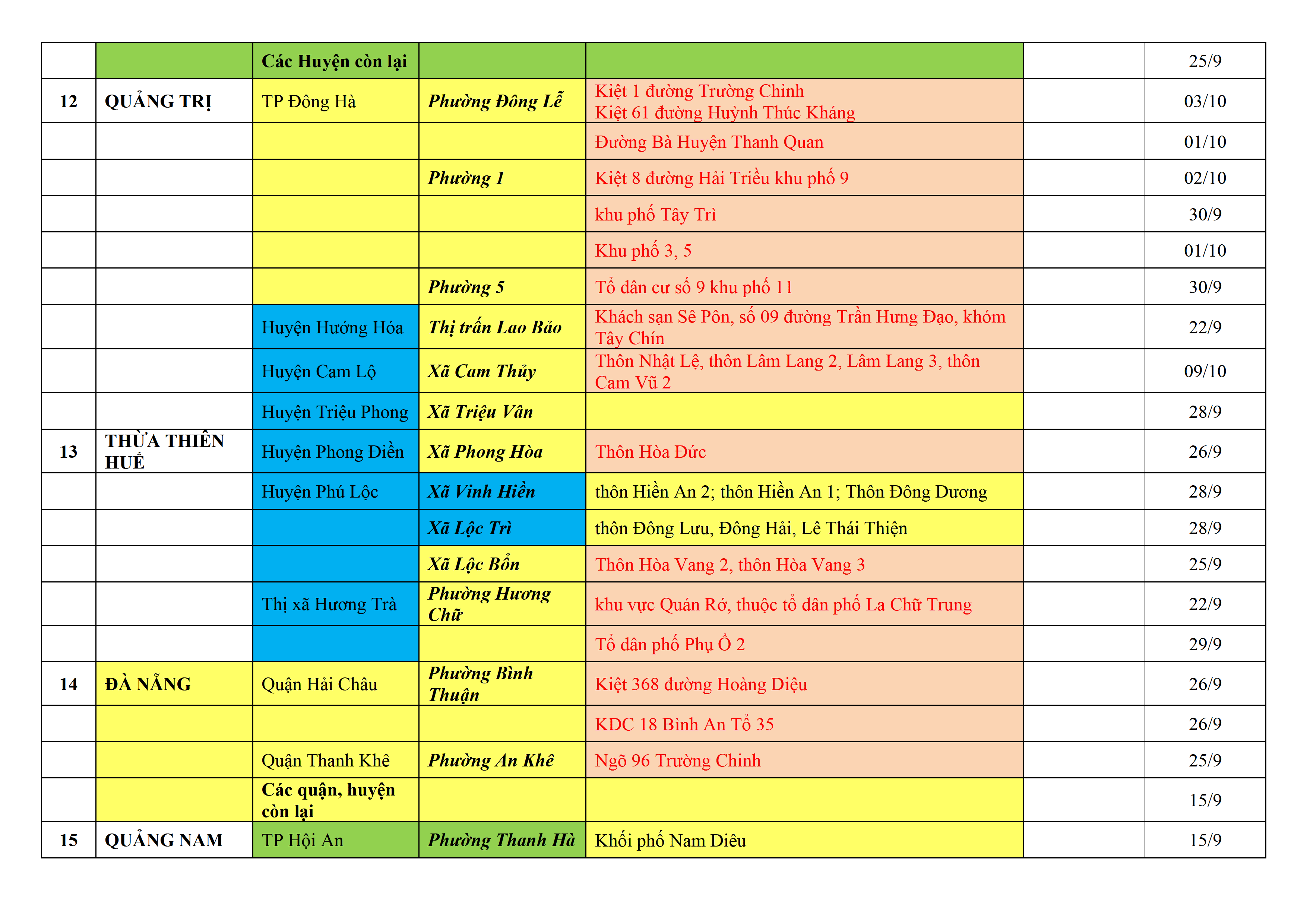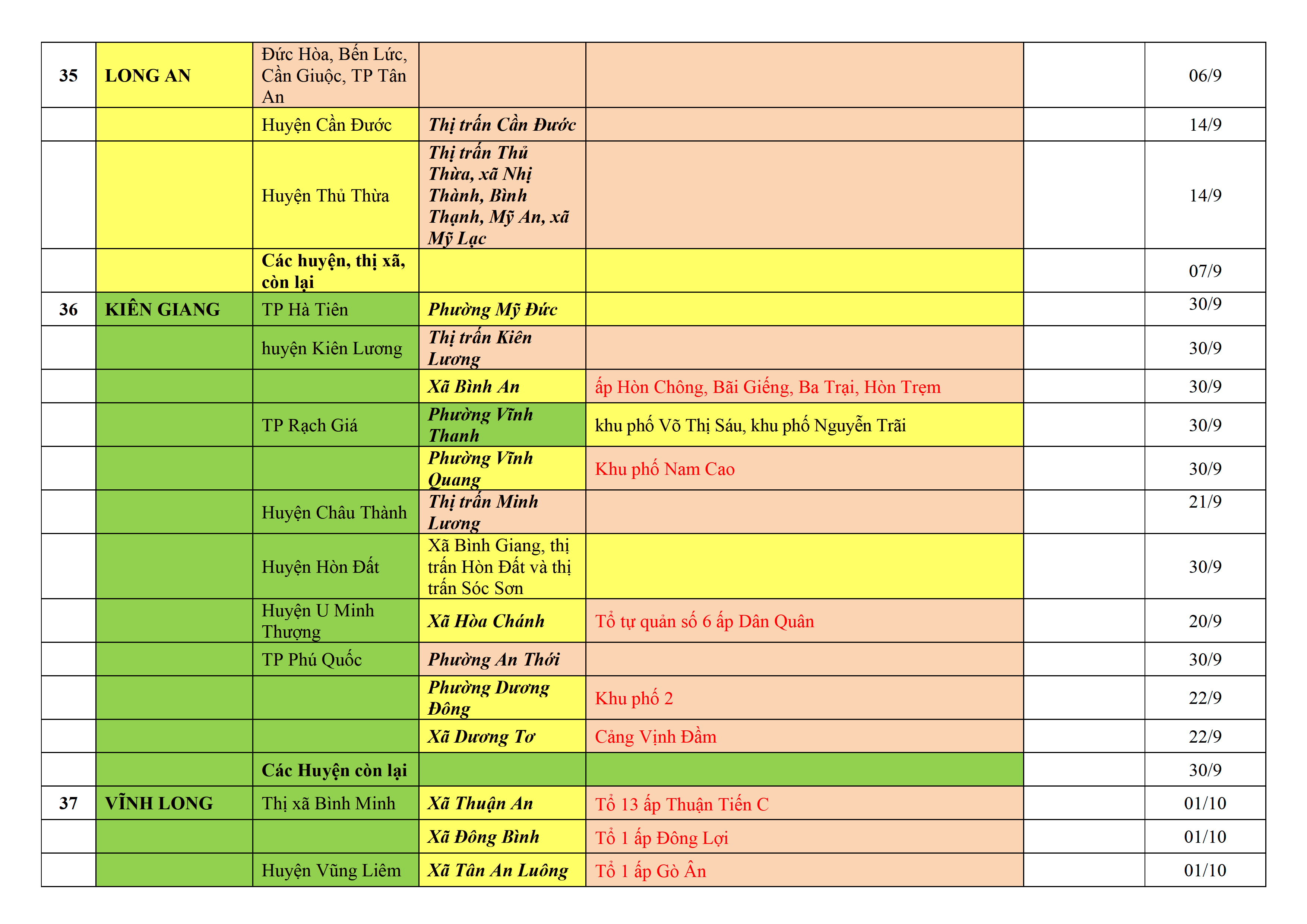 – Áp dụng biện pháp tương ứng màu sắc ô cột theo thôn xóm; xã phường; quận huyện; tỉnh thành phố. Cách ly y tế dựa vào việc tiếp xúc, đi đến địa điểm và nơi cư trú có ca bệnh, theo Thông báo của Bộ Y tế, các tỉnh thành phố.