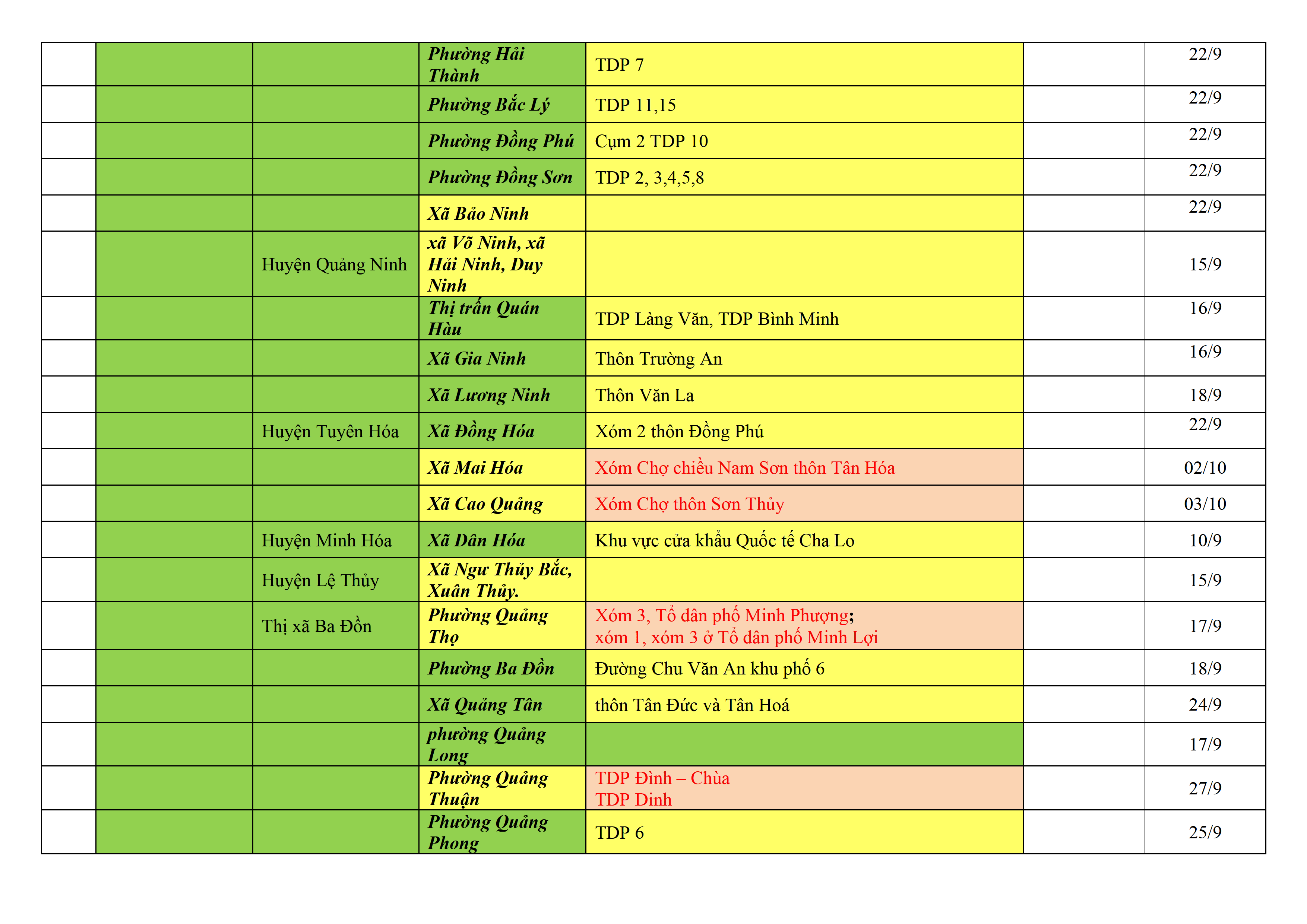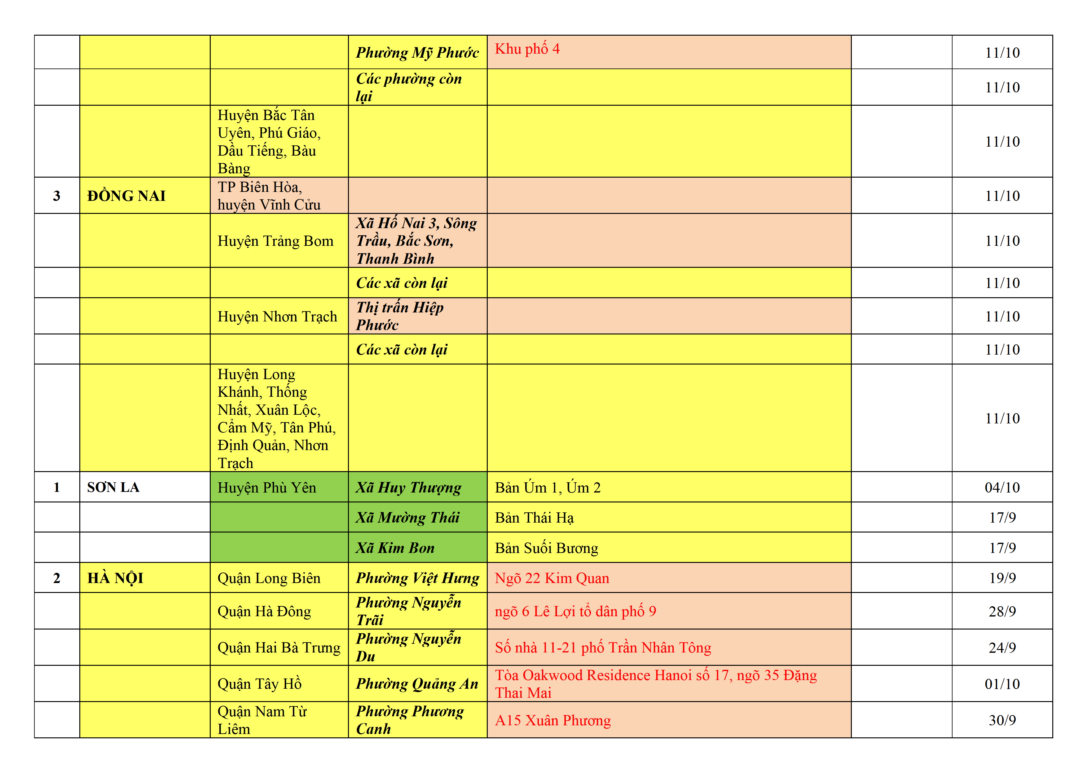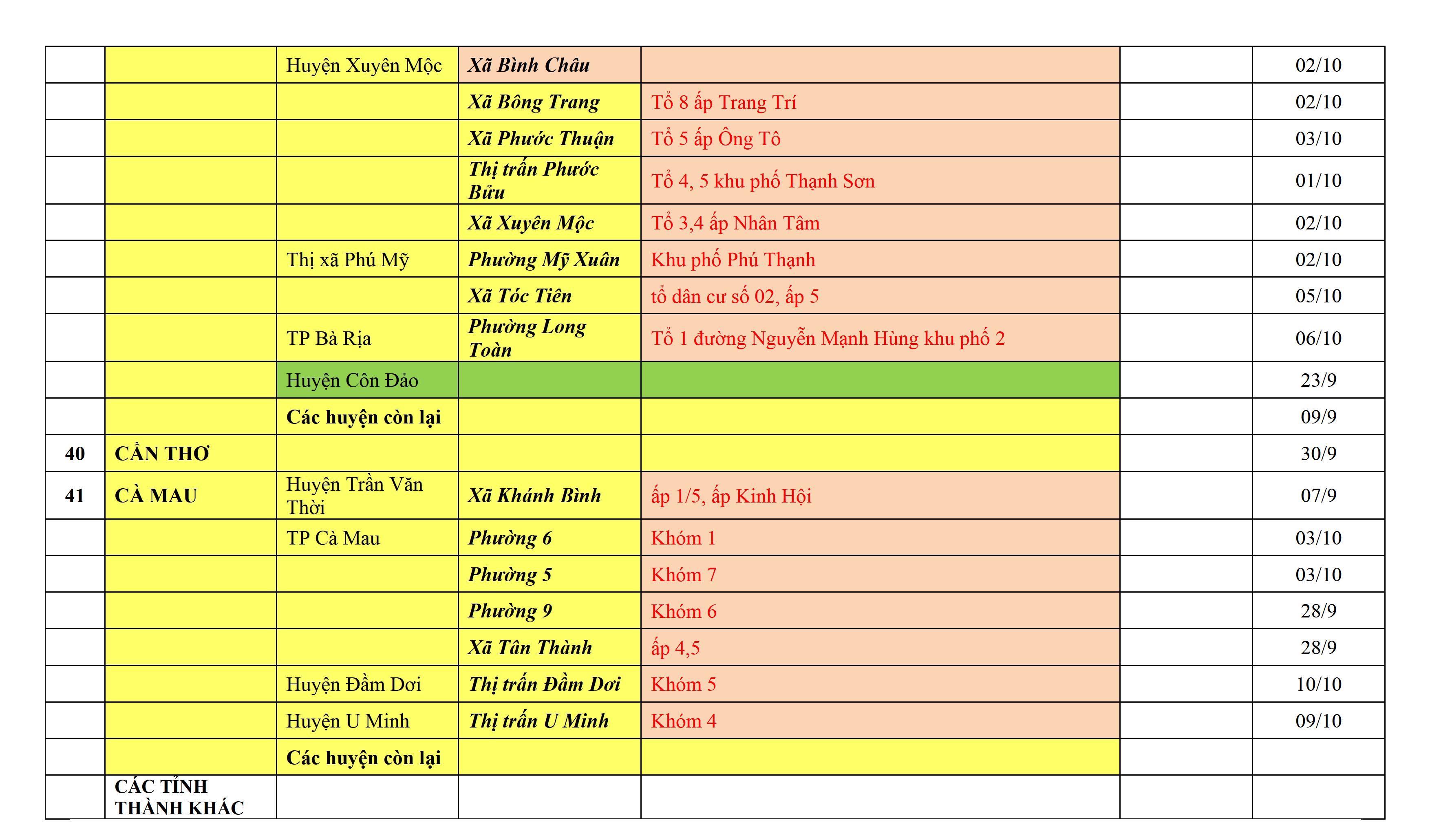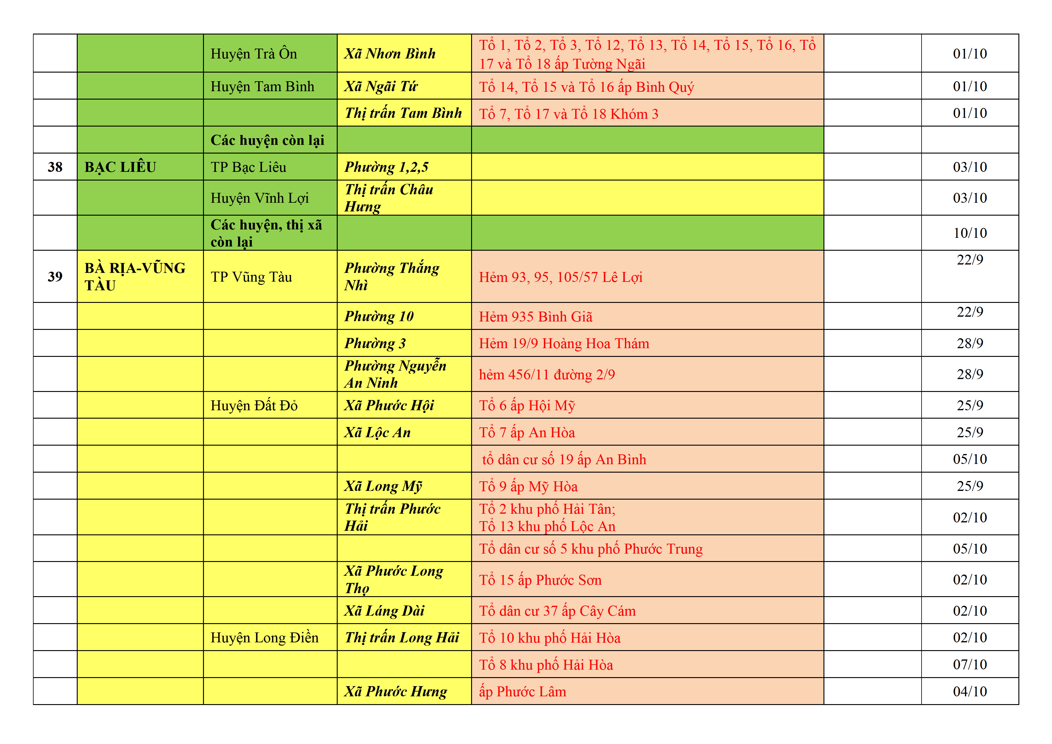 – Áp dụng biện pháp tương ứng màu sắc ô cột theo thôn xóm; xã phường; quận huyện; tỉnh thành phố. Cách ly y tế dựa vào việc tiếp xúc, đi đến địa điểm và nơi cư trú có ca bệnh, theo Thông báo của Bộ Y tế, các tỉnh thành phố.