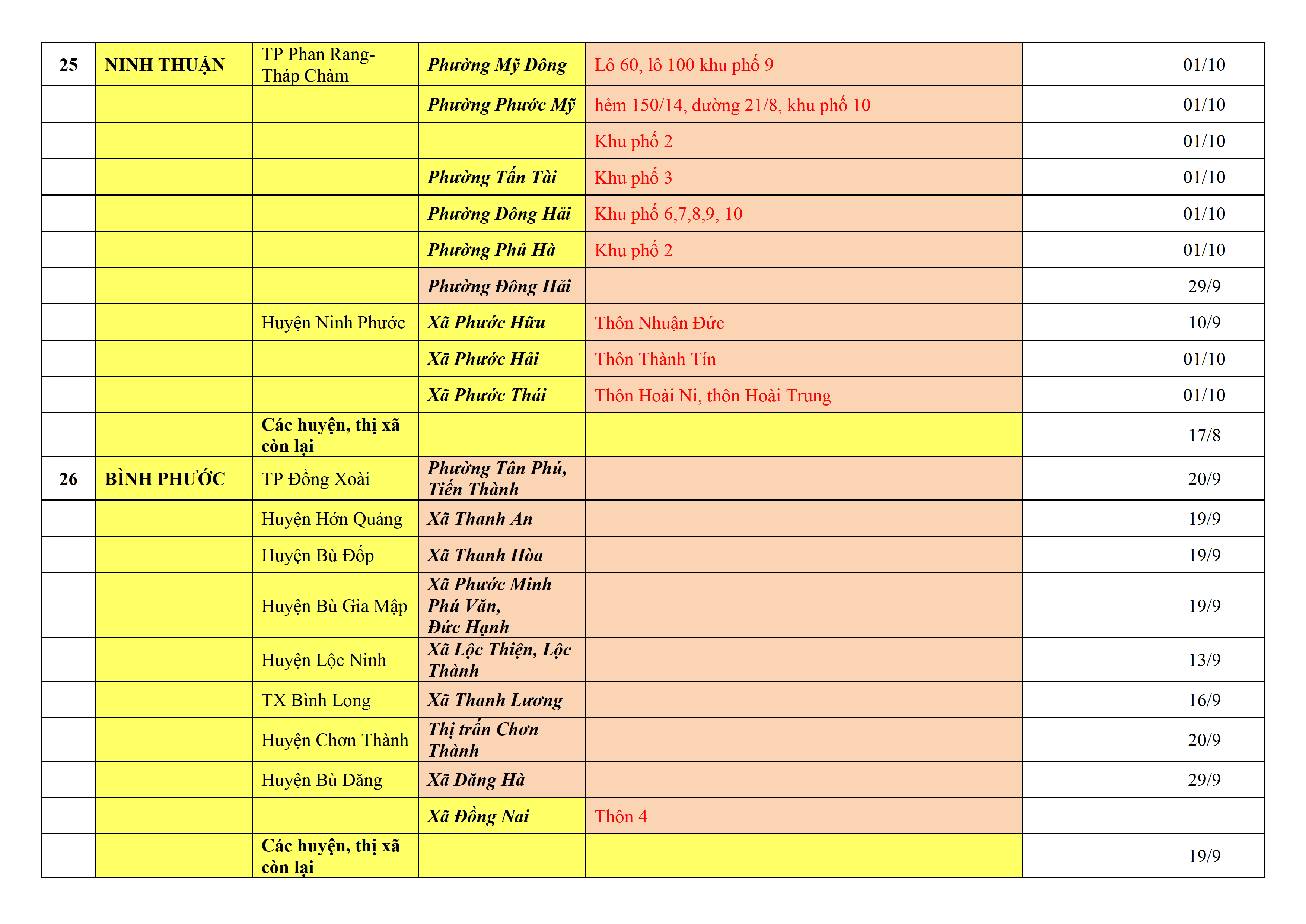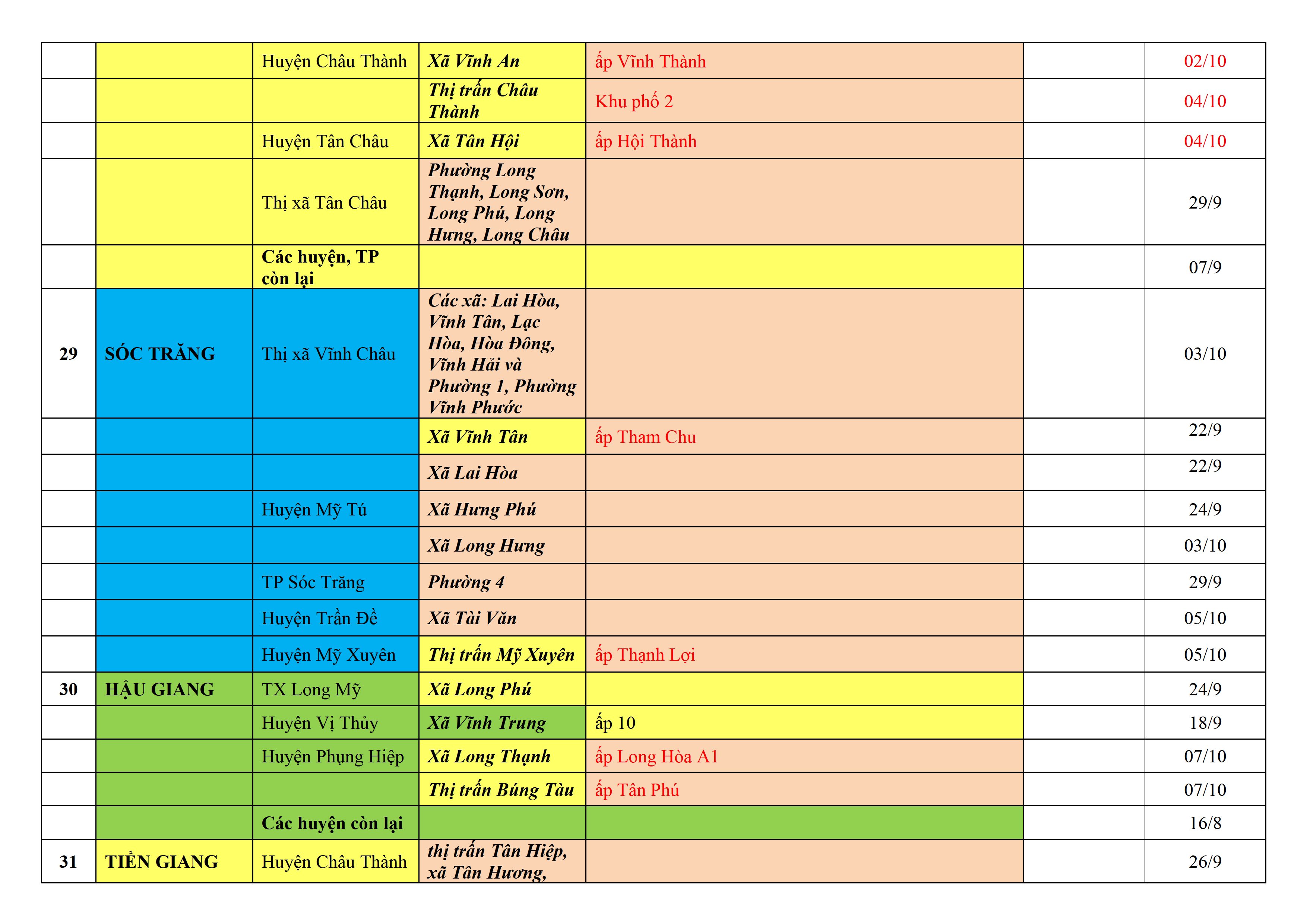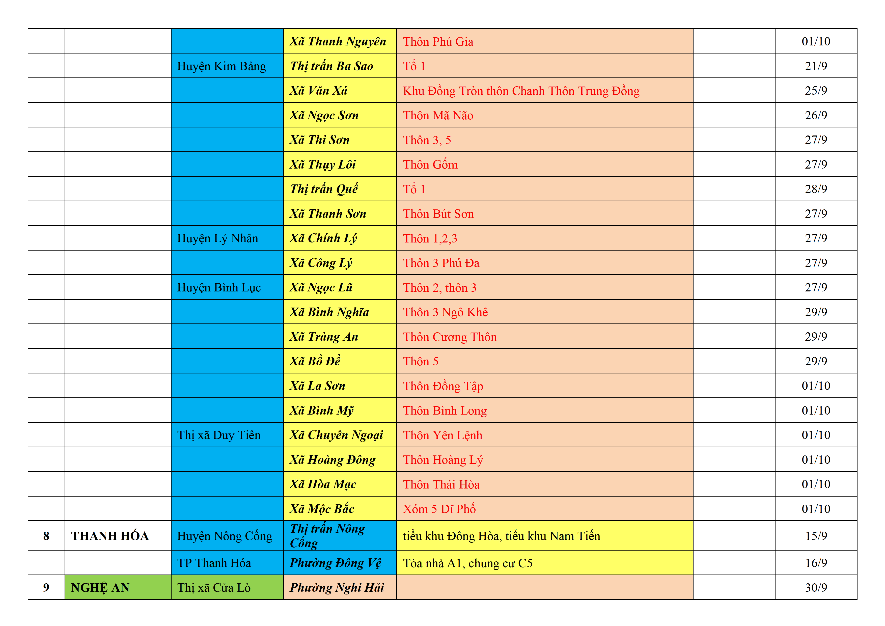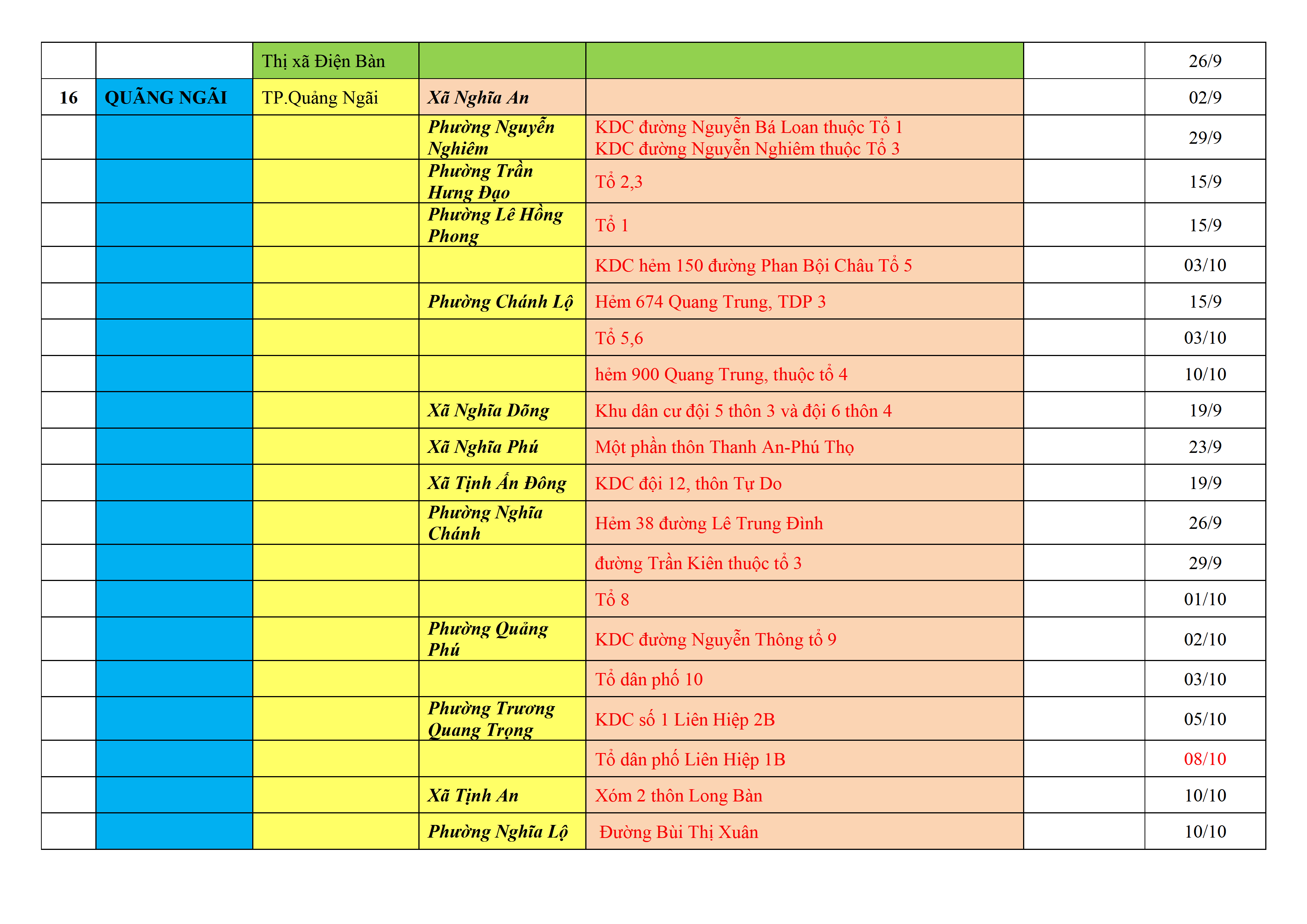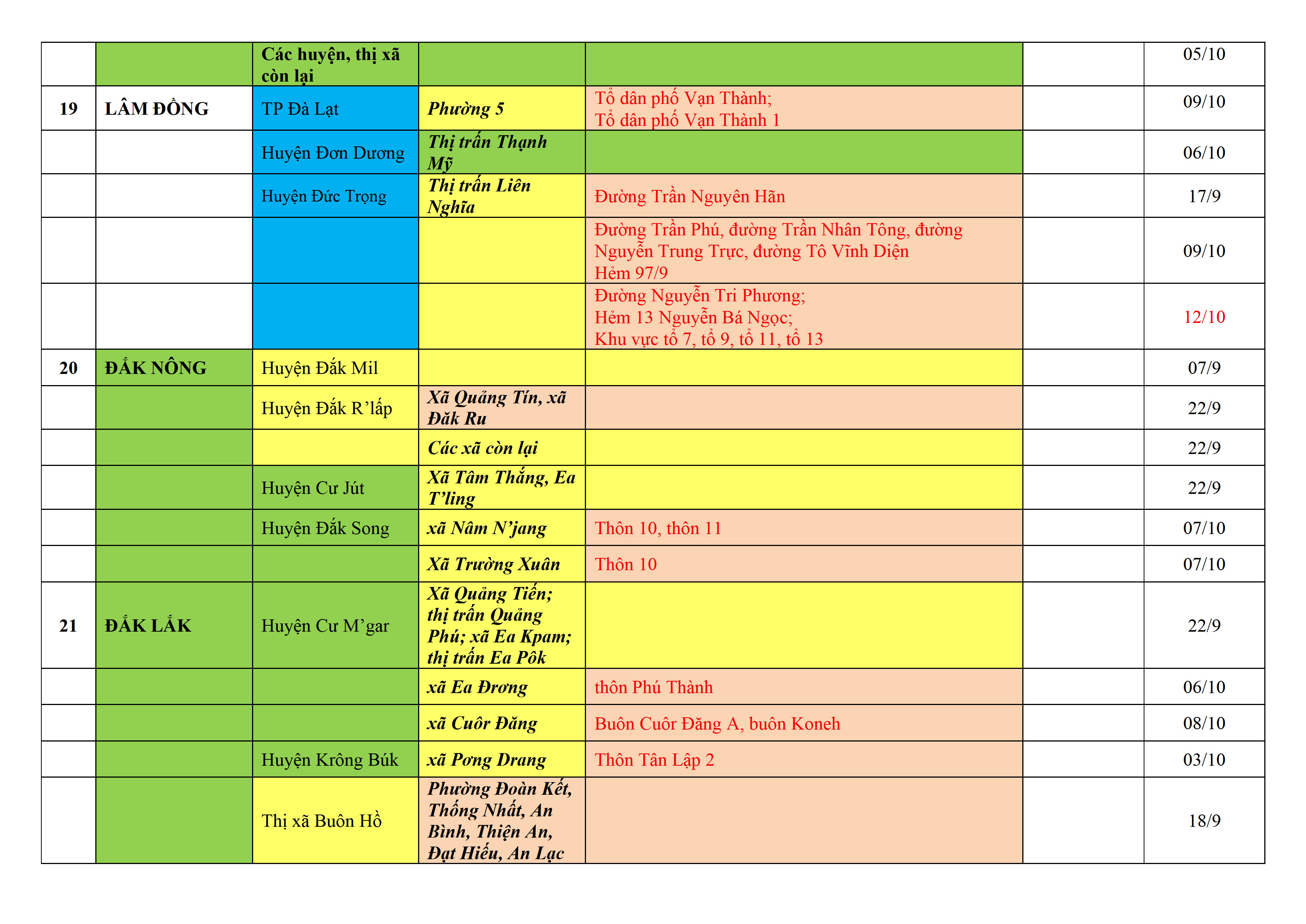 – Áp dụng biện pháp tương ứng màu sắc ô cột theo thôn xóm; xã phường; quận huyện; tỉnh thành phố. Cách ly y tế dựa vào việc tiếp xúc, đi đến địa điểm và nơi cư trú có ca bệnh, theo Thông báo của Bộ Y tế, các tỉnh thành phố.