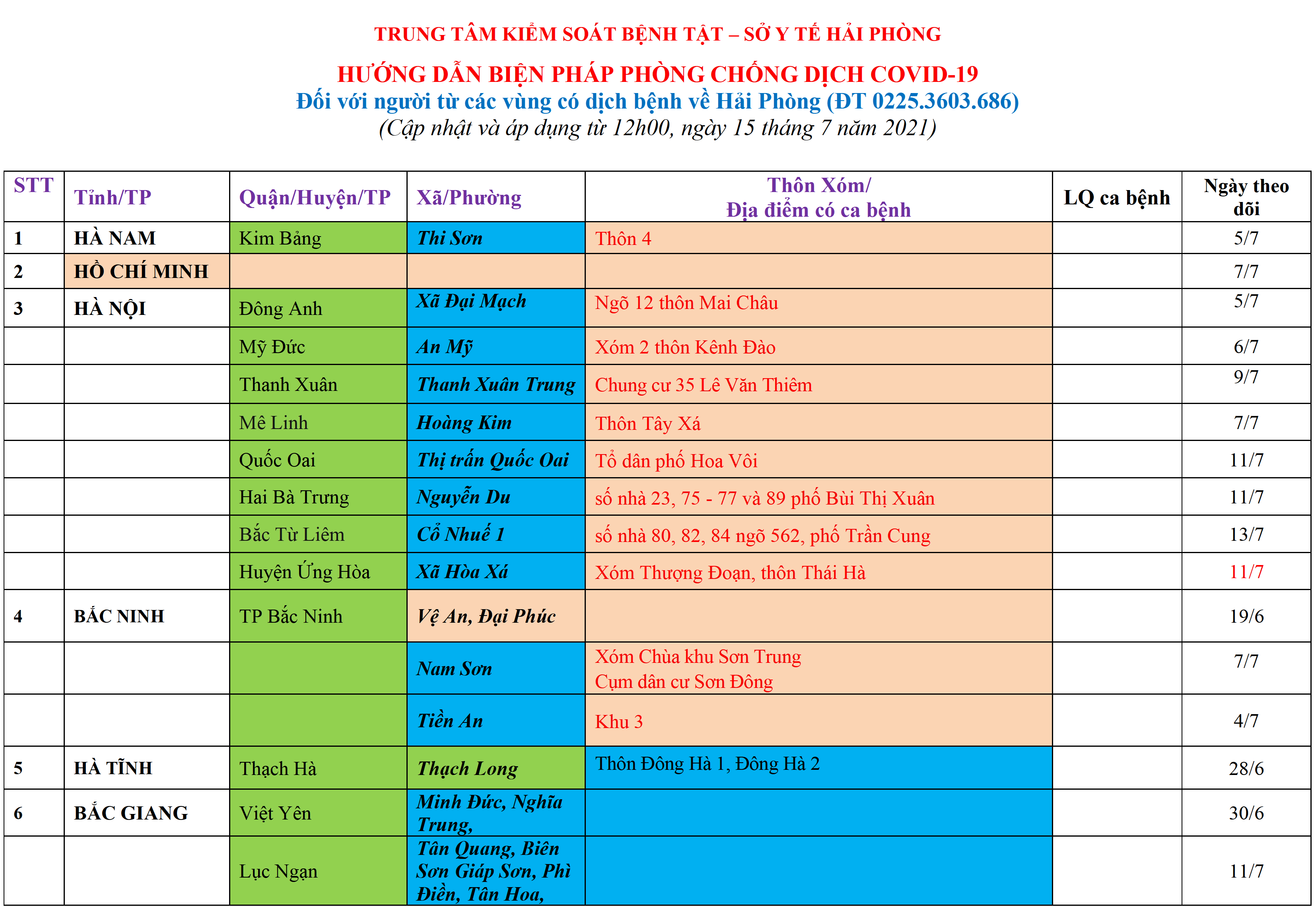 CDC Hải Phòng ban hành hướng dẫn tạm thời biện pháp phòng chống dịch COVID-19 đối với người từ các tỉnh, thành khác về thành phố như sau (thông tin cập nhật vào 12h00’ ngày 15/7/2021):
