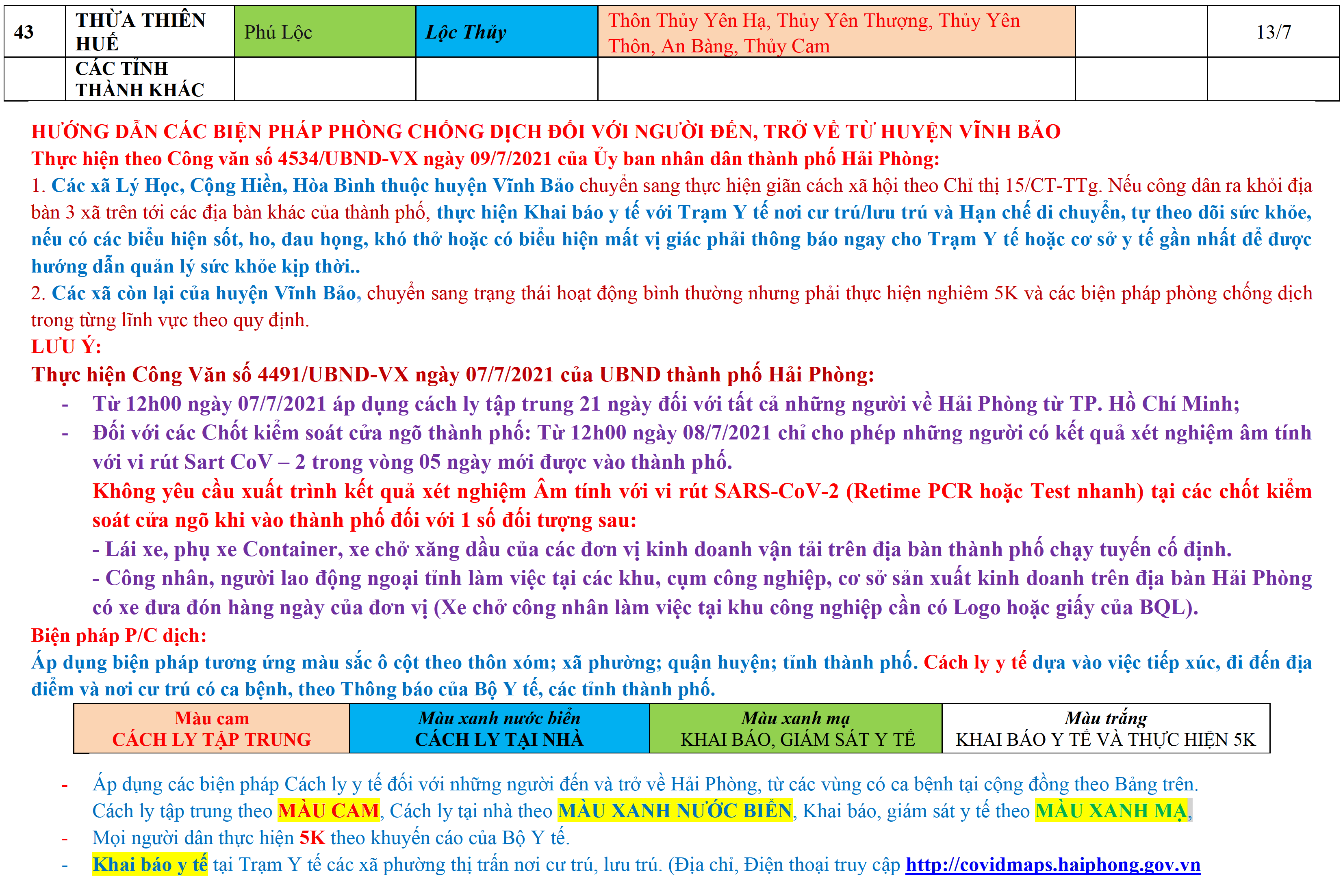 – Từ 12h00 ngày 07/7/2021 áp dụng cách ly tập trung 21 ngày đối với tất cả những người về Hải Phòng từ TP. Hồ Chí Minh;