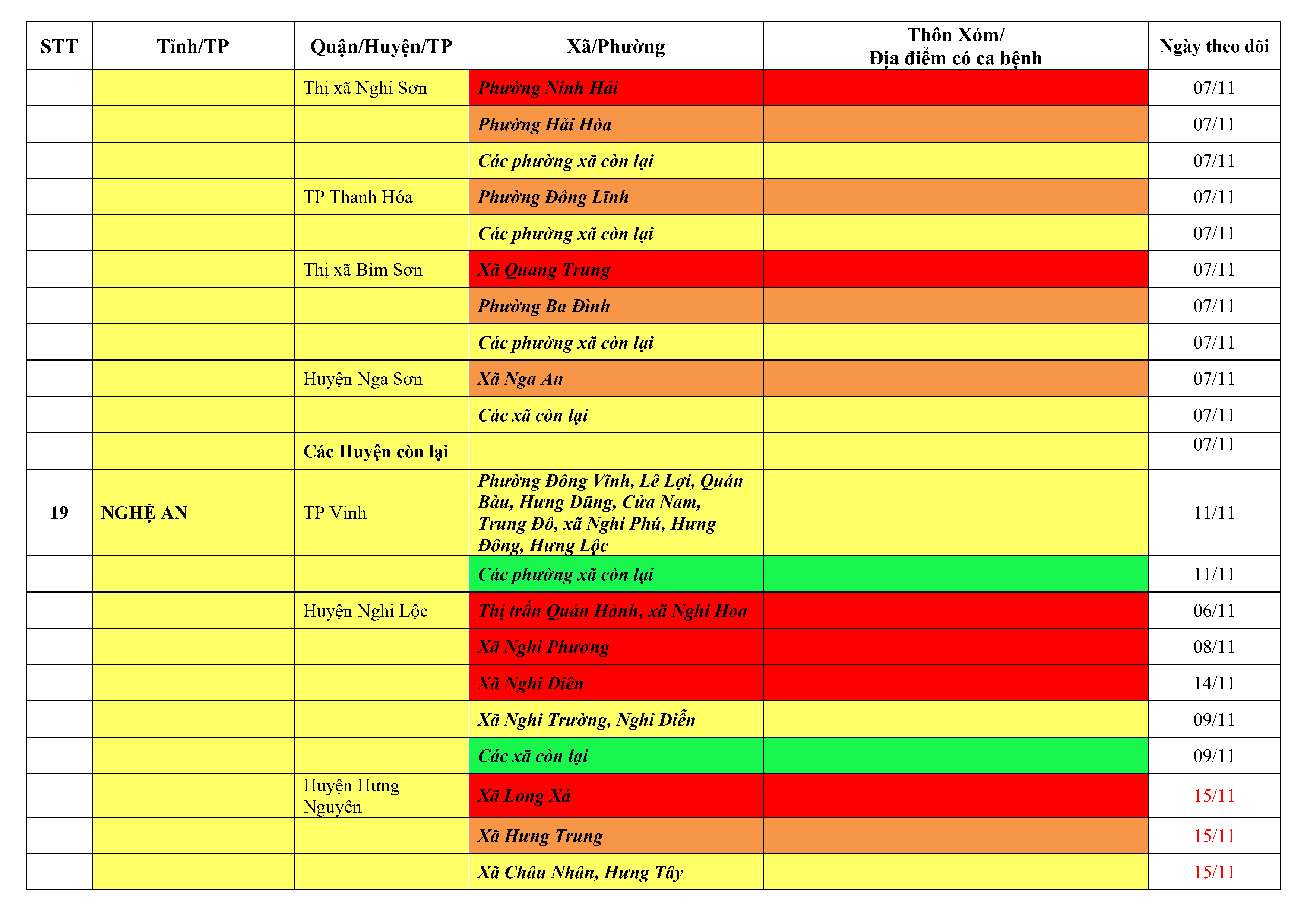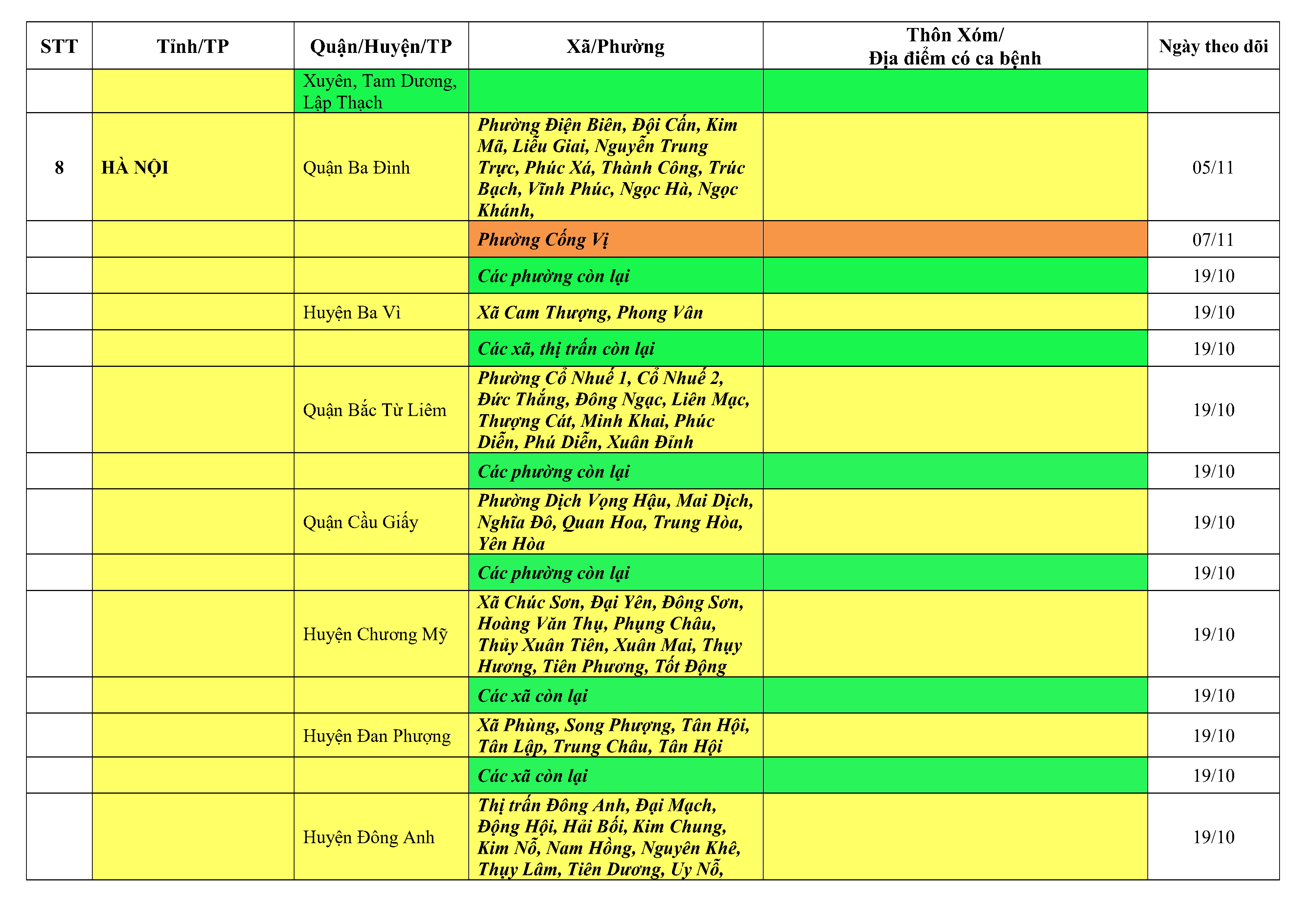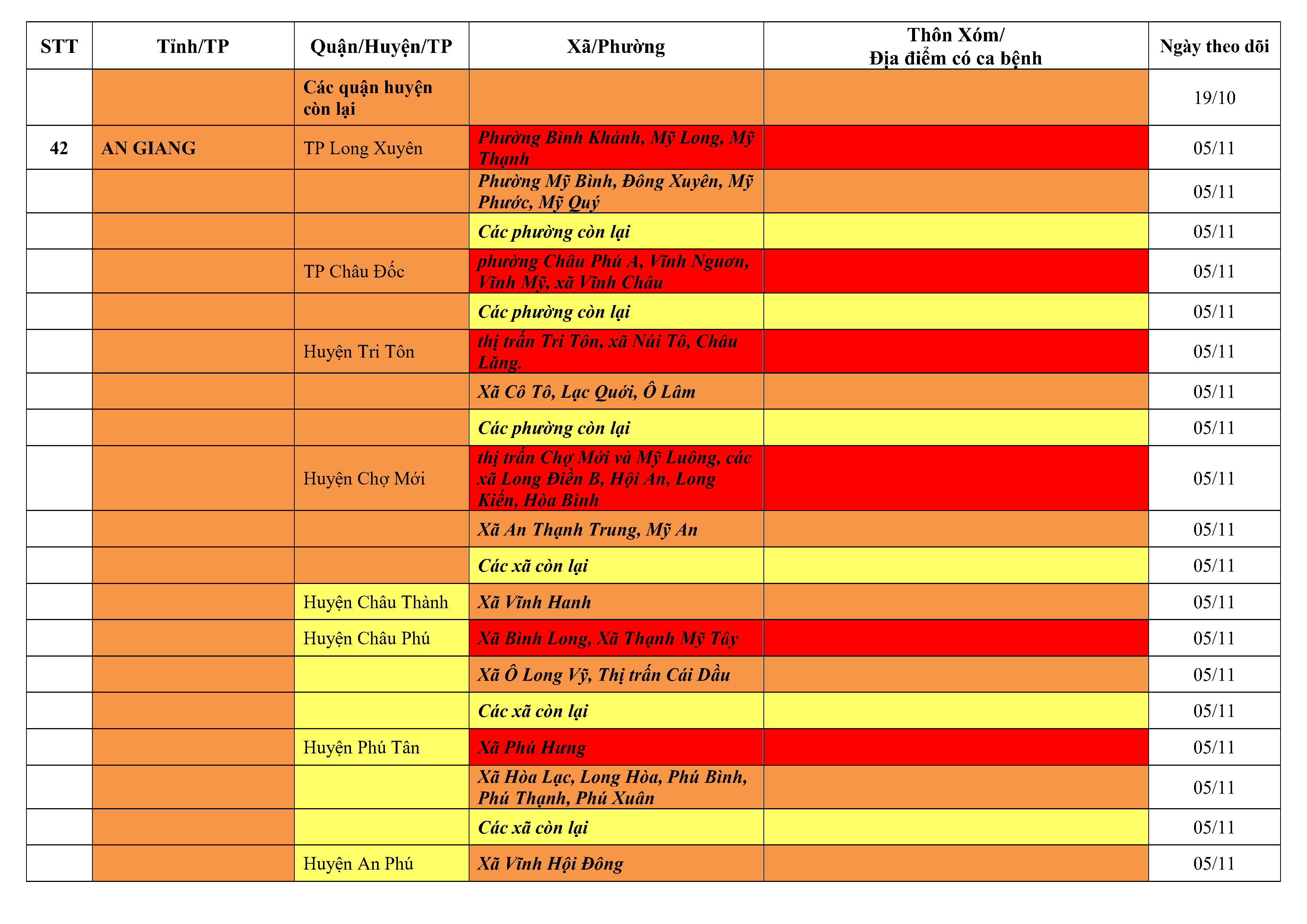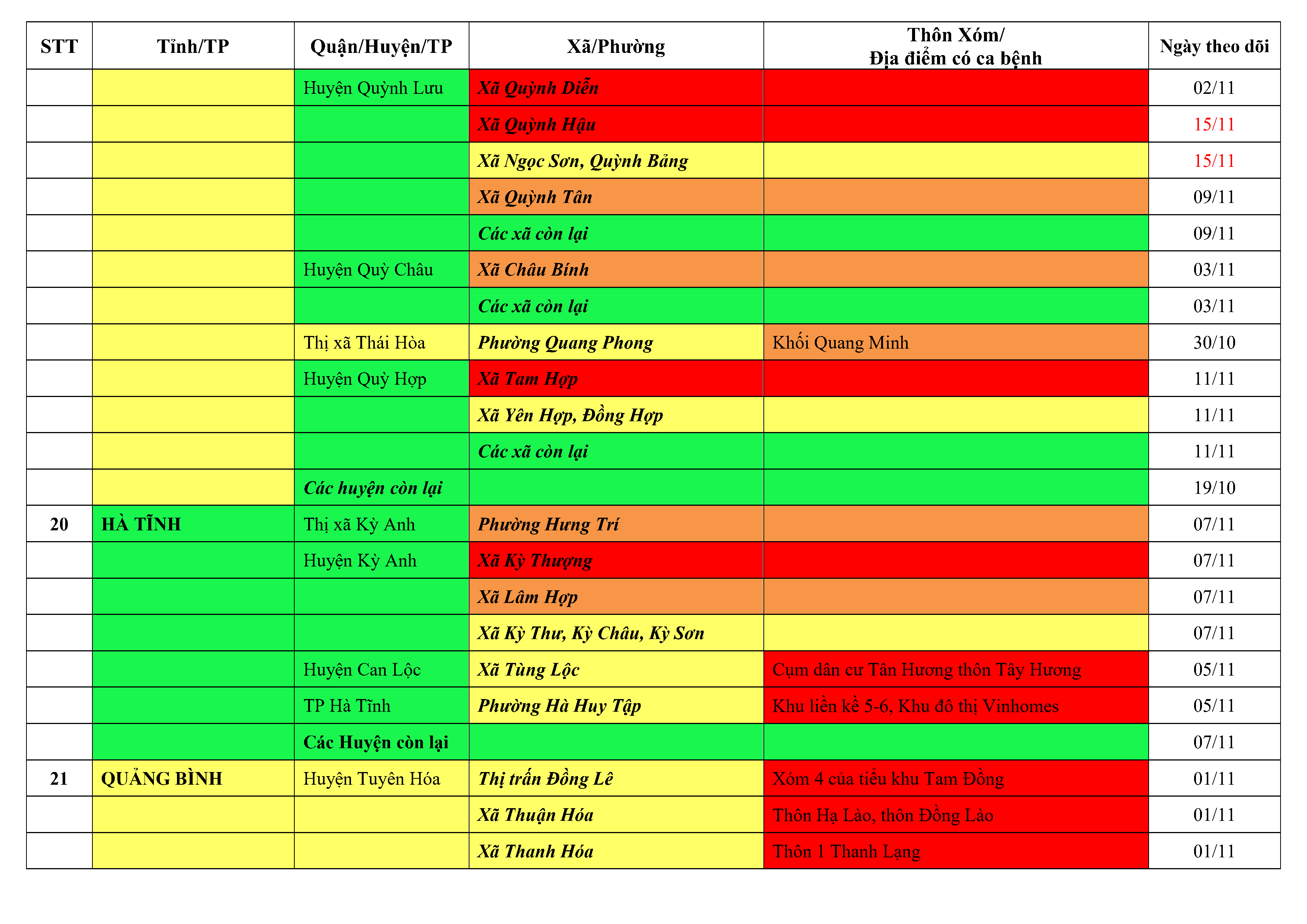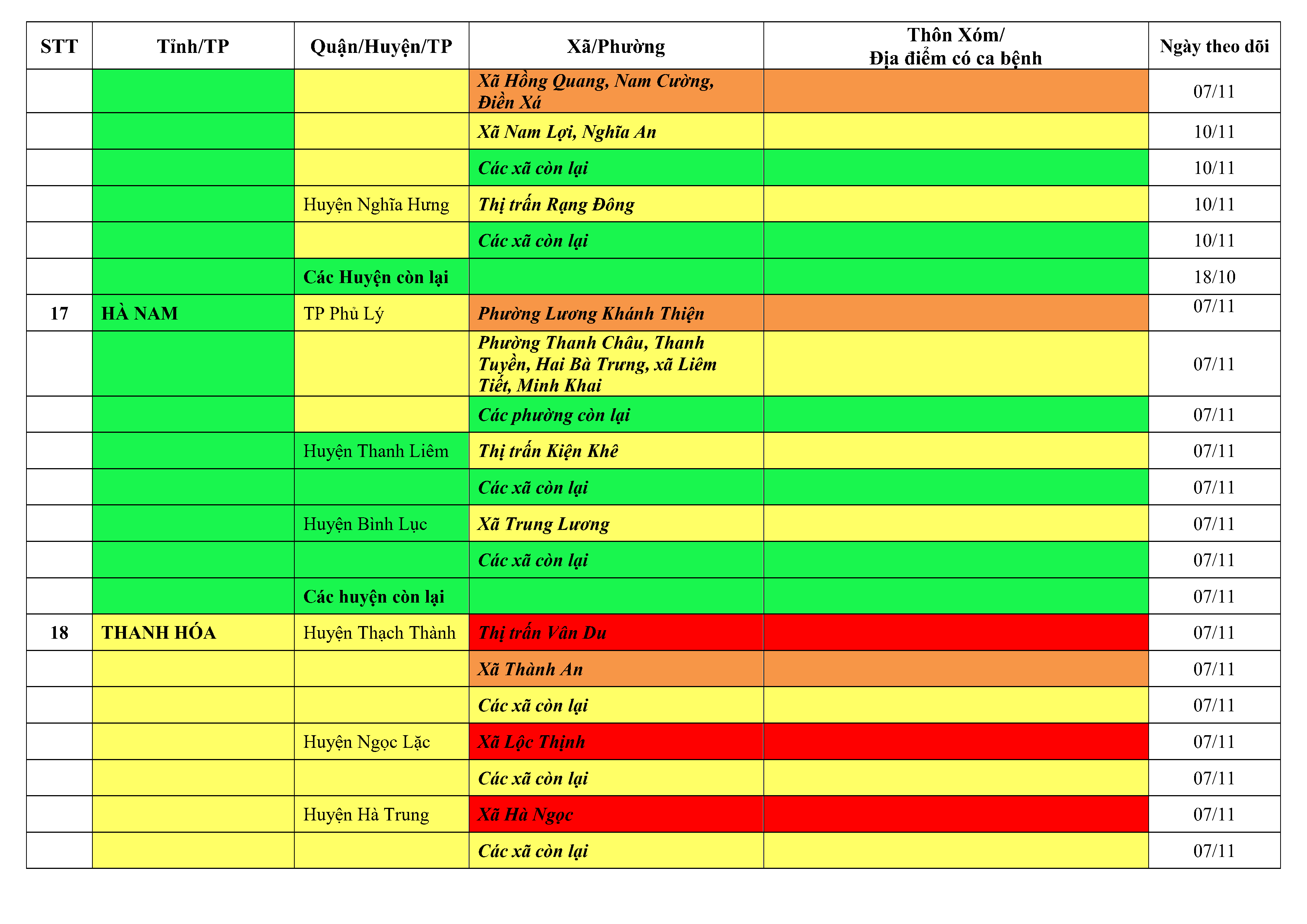 Lưu ý: Các tỉnh, thành phố không có tên trong bảng màu, đi lại bình thường, tuân thủ các biện pháp phòng chống dịch theo chỉ đạo của Bộ Y tế; khai báo y tế, thực hiện nghiêm 5K.
