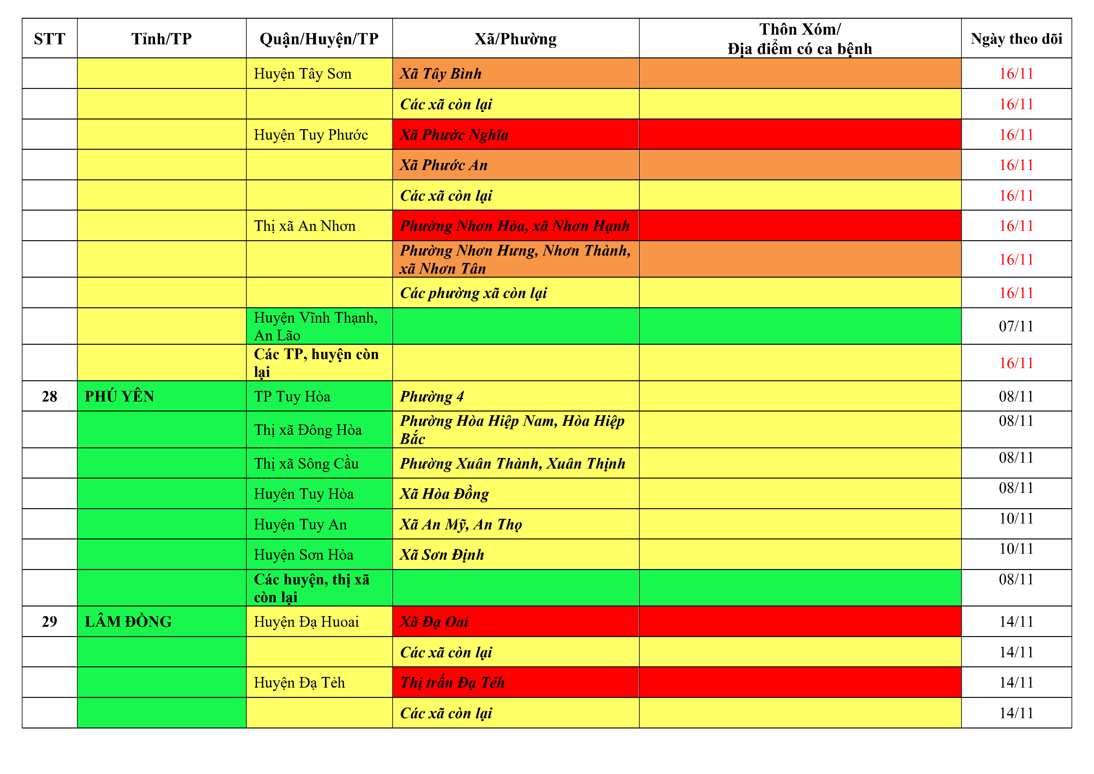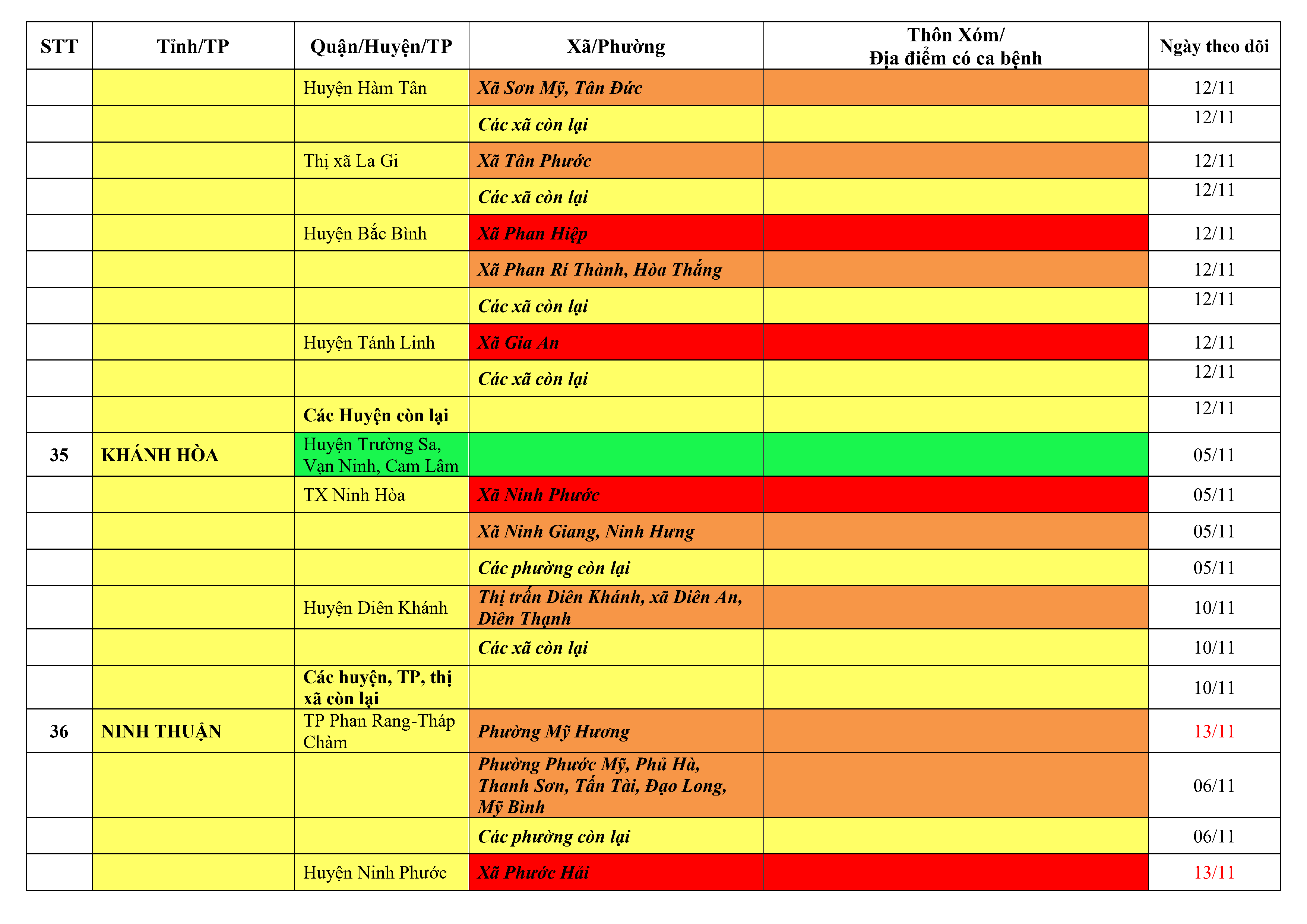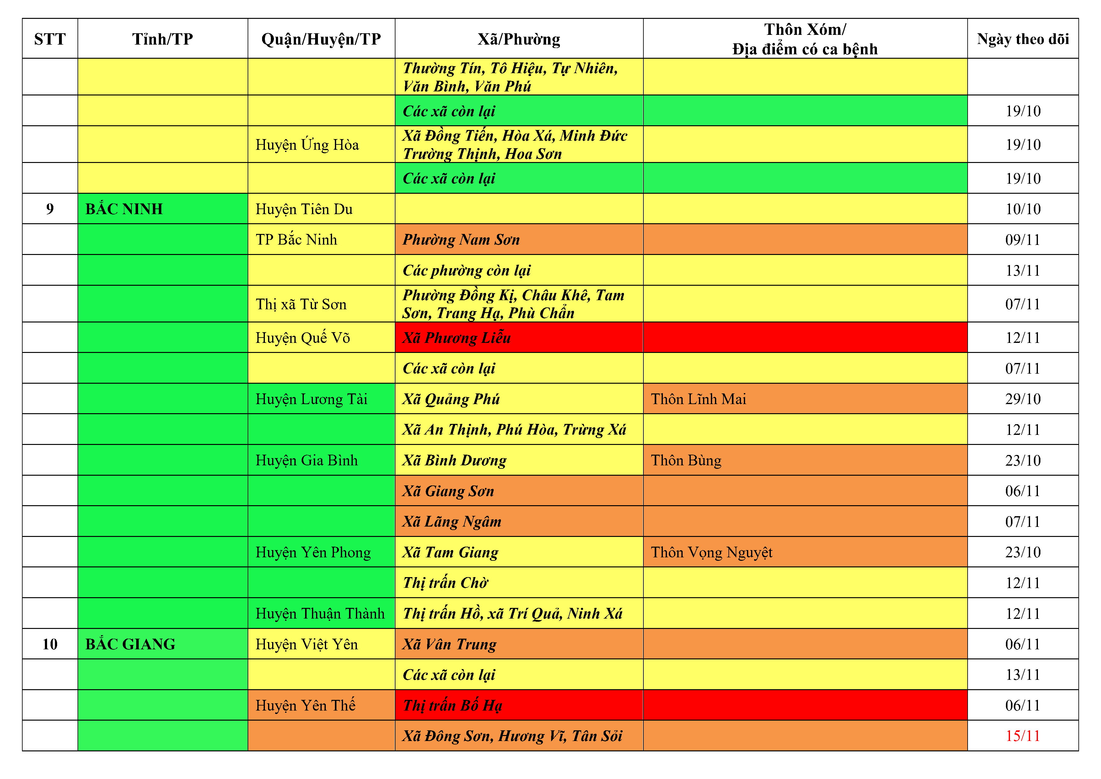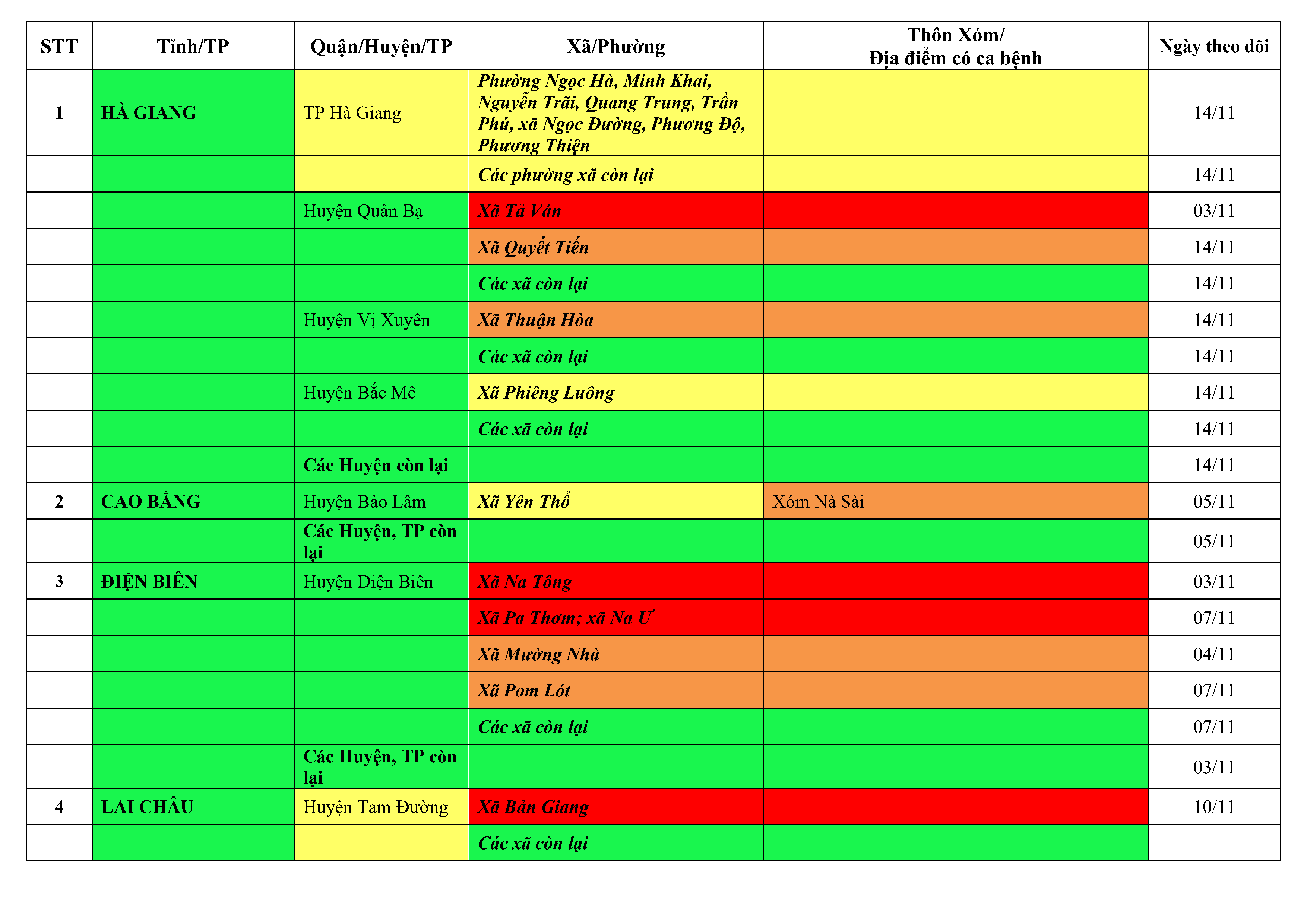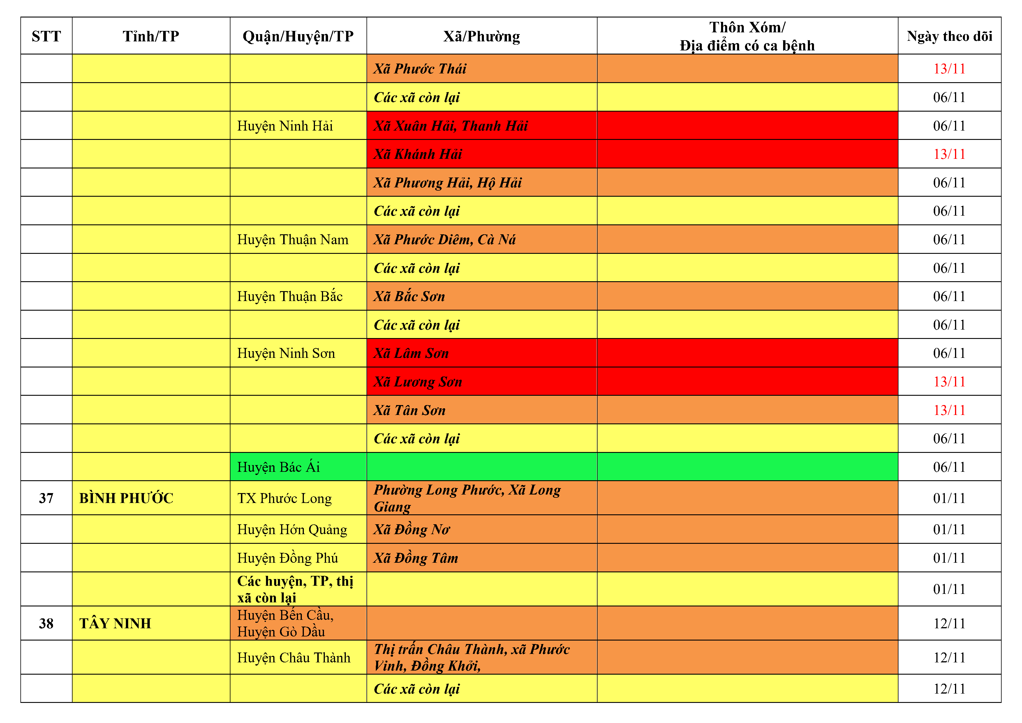 Lưu ý: Các tỉnh, thành phố không có tên trong bảng màu, đi lại bình thường, tuân thủ các biện pháp phòng chống dịch theo chỉ đạo của Bộ Y tế; khai báo y tế, thực hiện nghiêm 5K.
