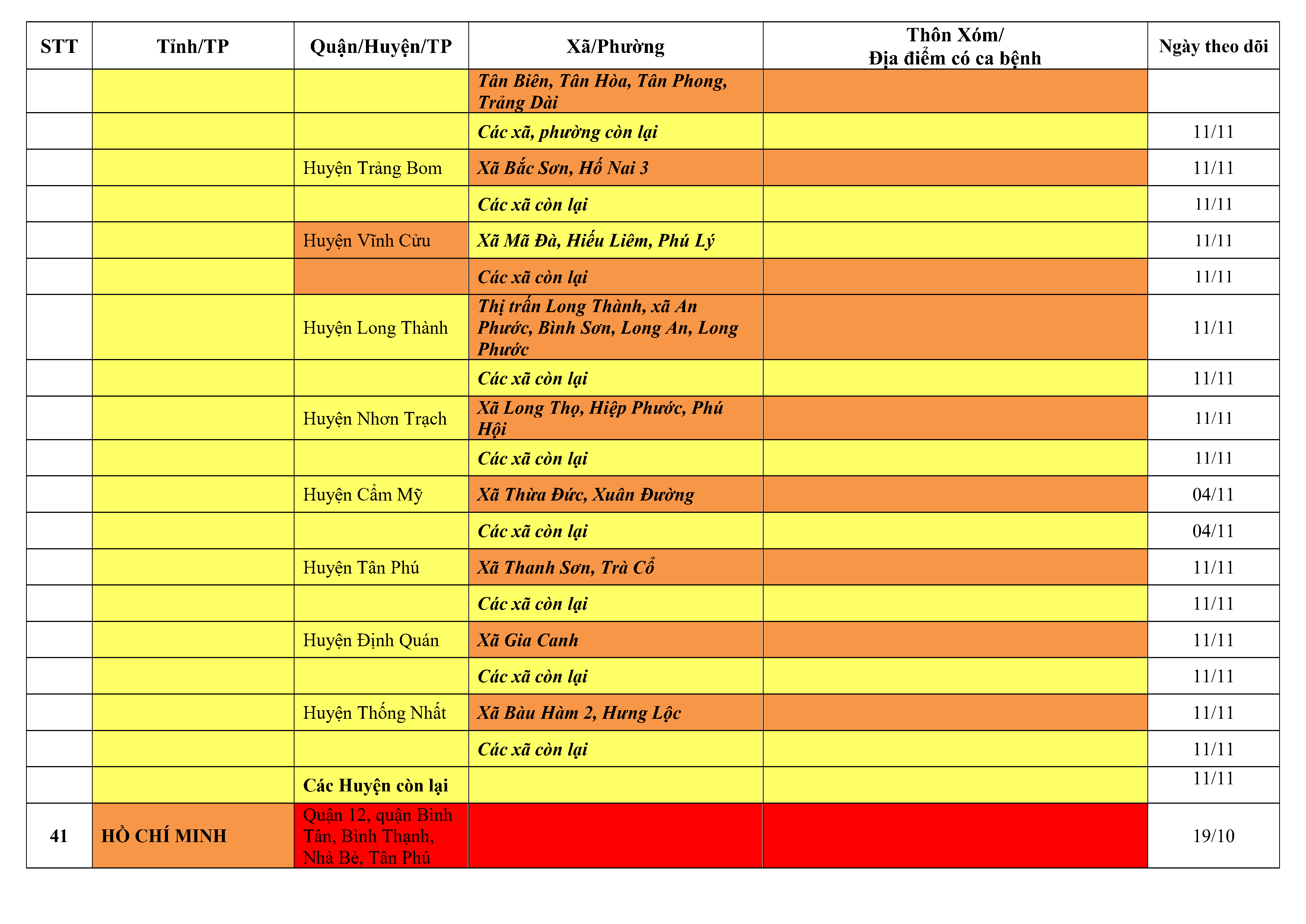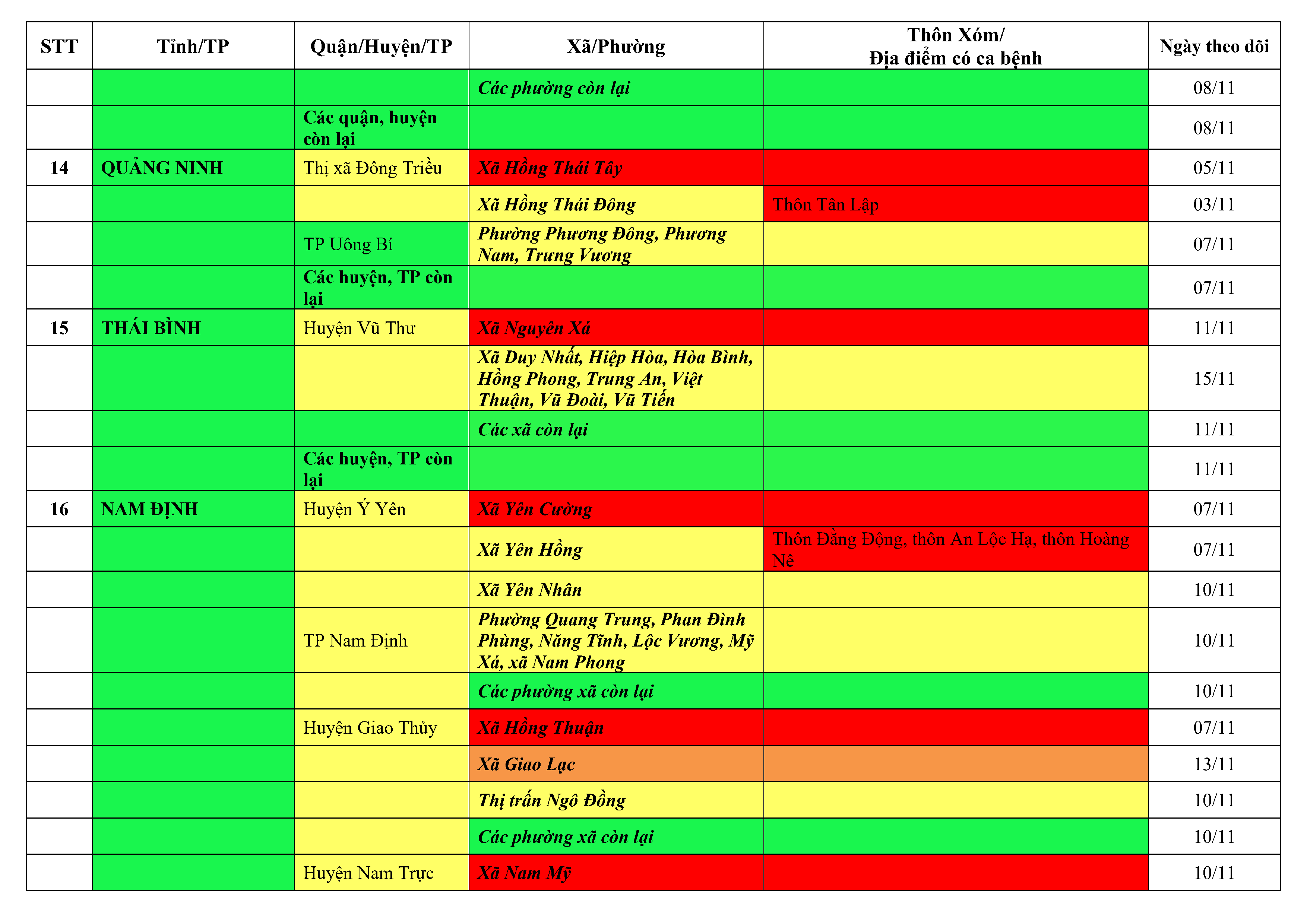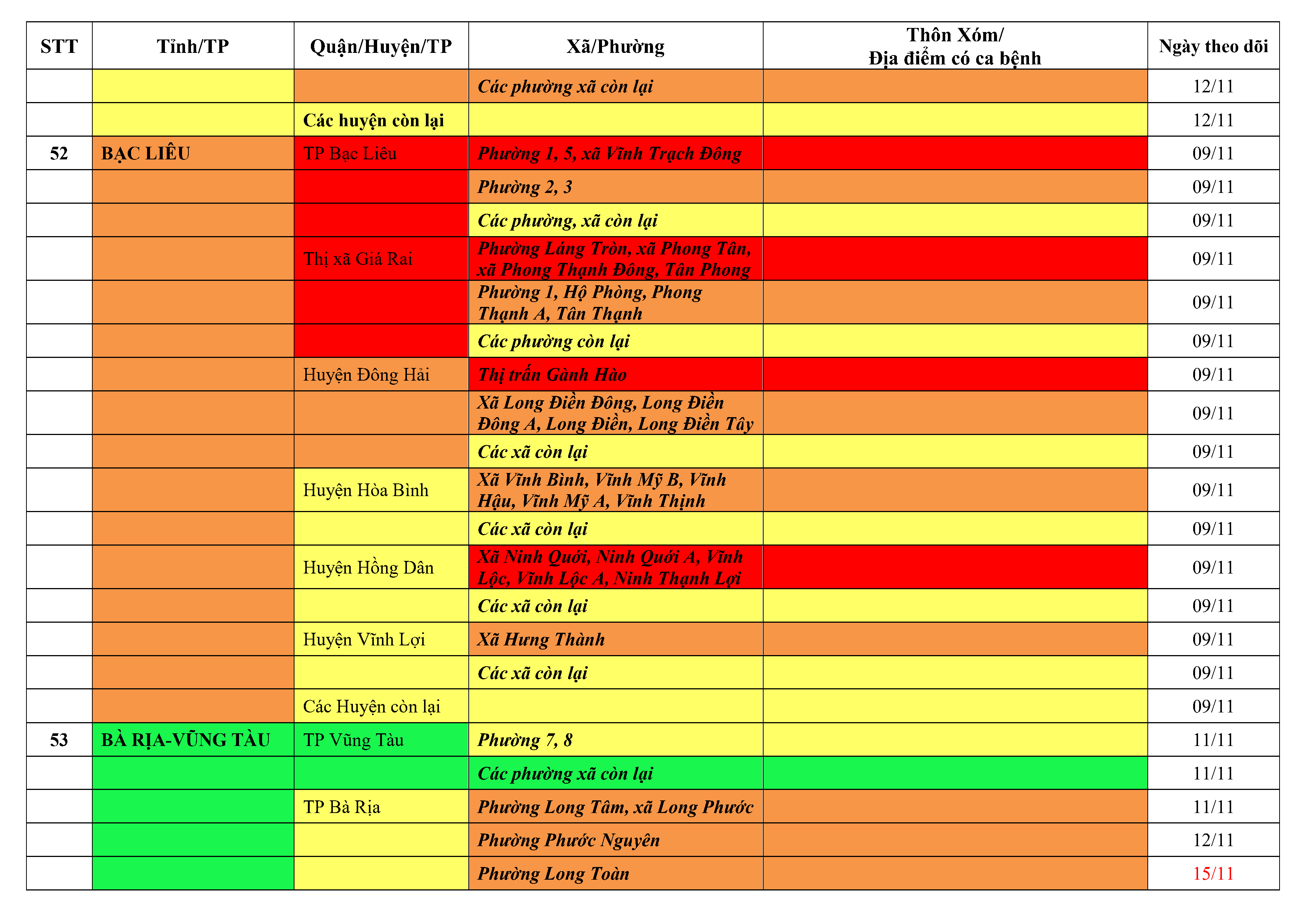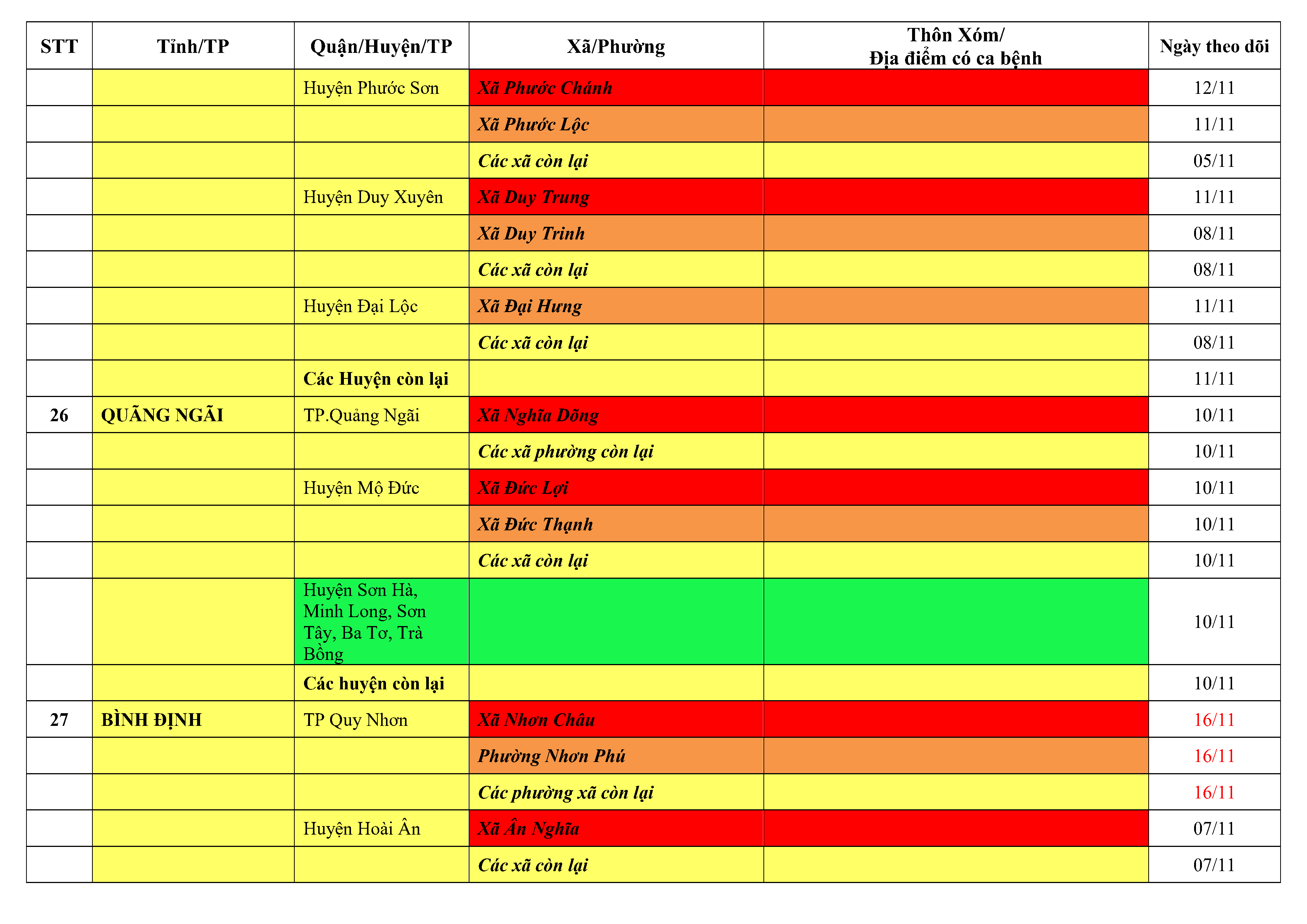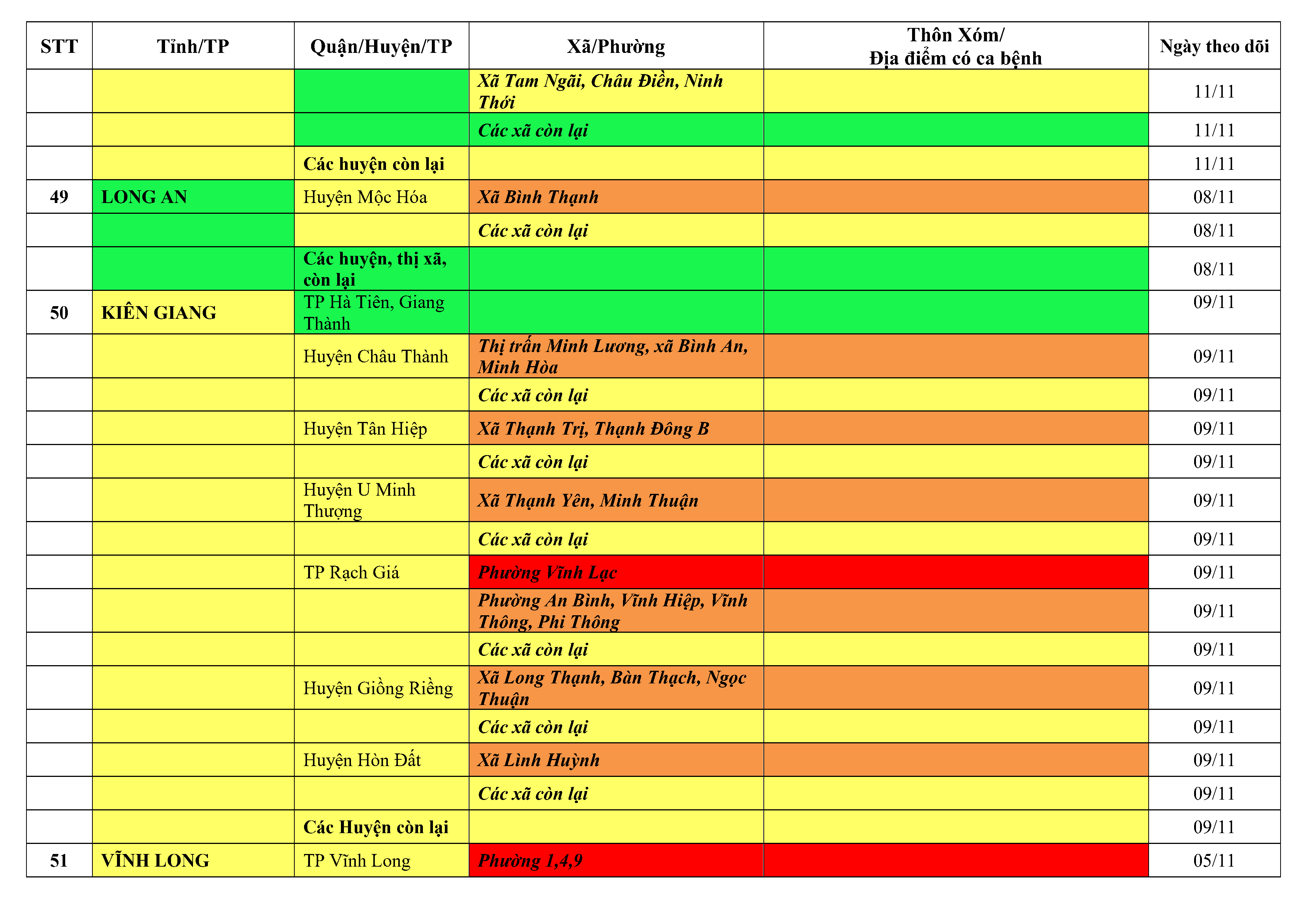 Lưu ý: Các tỉnh, thành phố không có tên trong bảng màu, đi lại bình thường, tuân thủ các biện pháp phòng chống dịch theo chỉ đạo của Bộ Y tế; khai báo y tế, thực hiện nghiêm 5K.