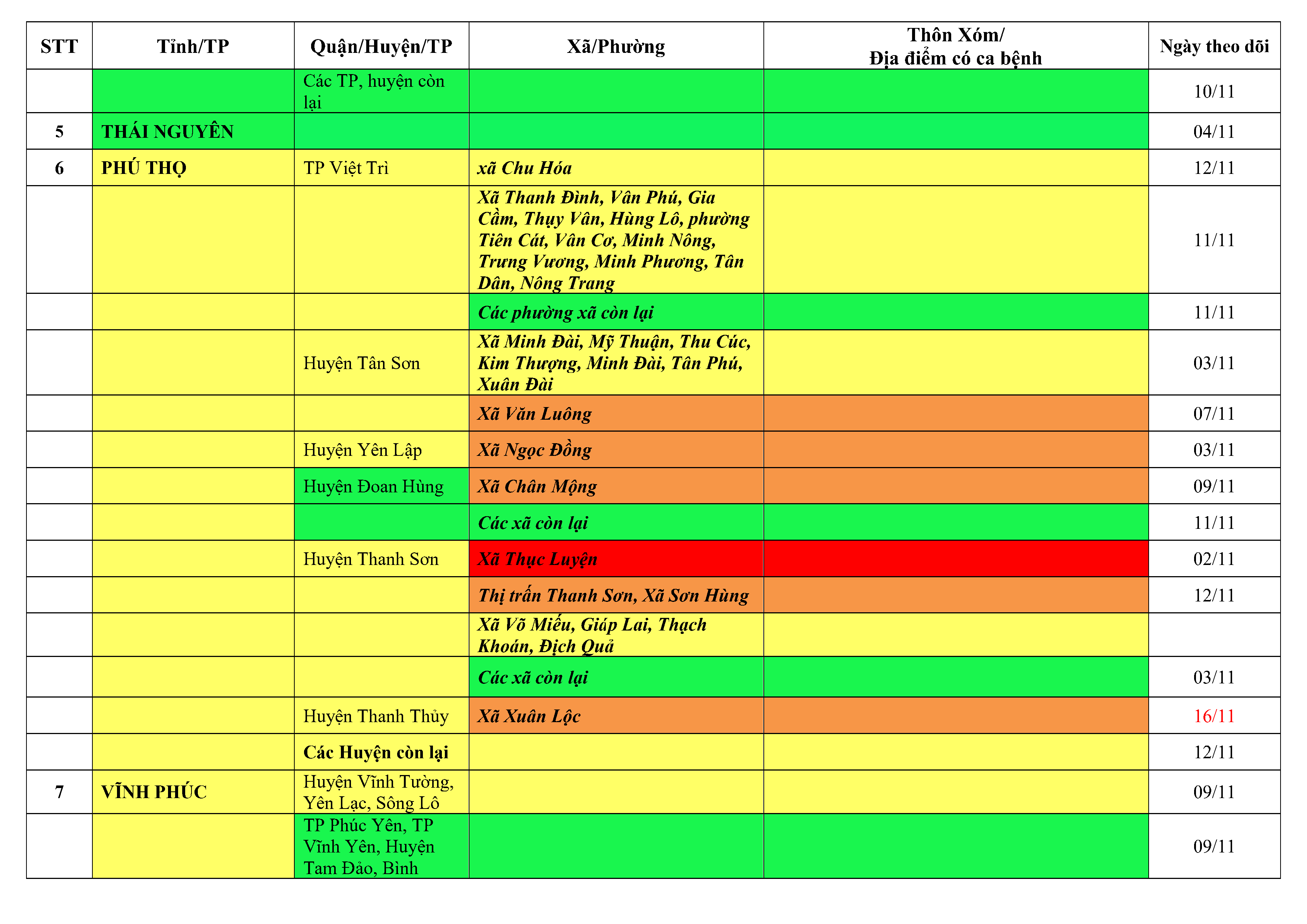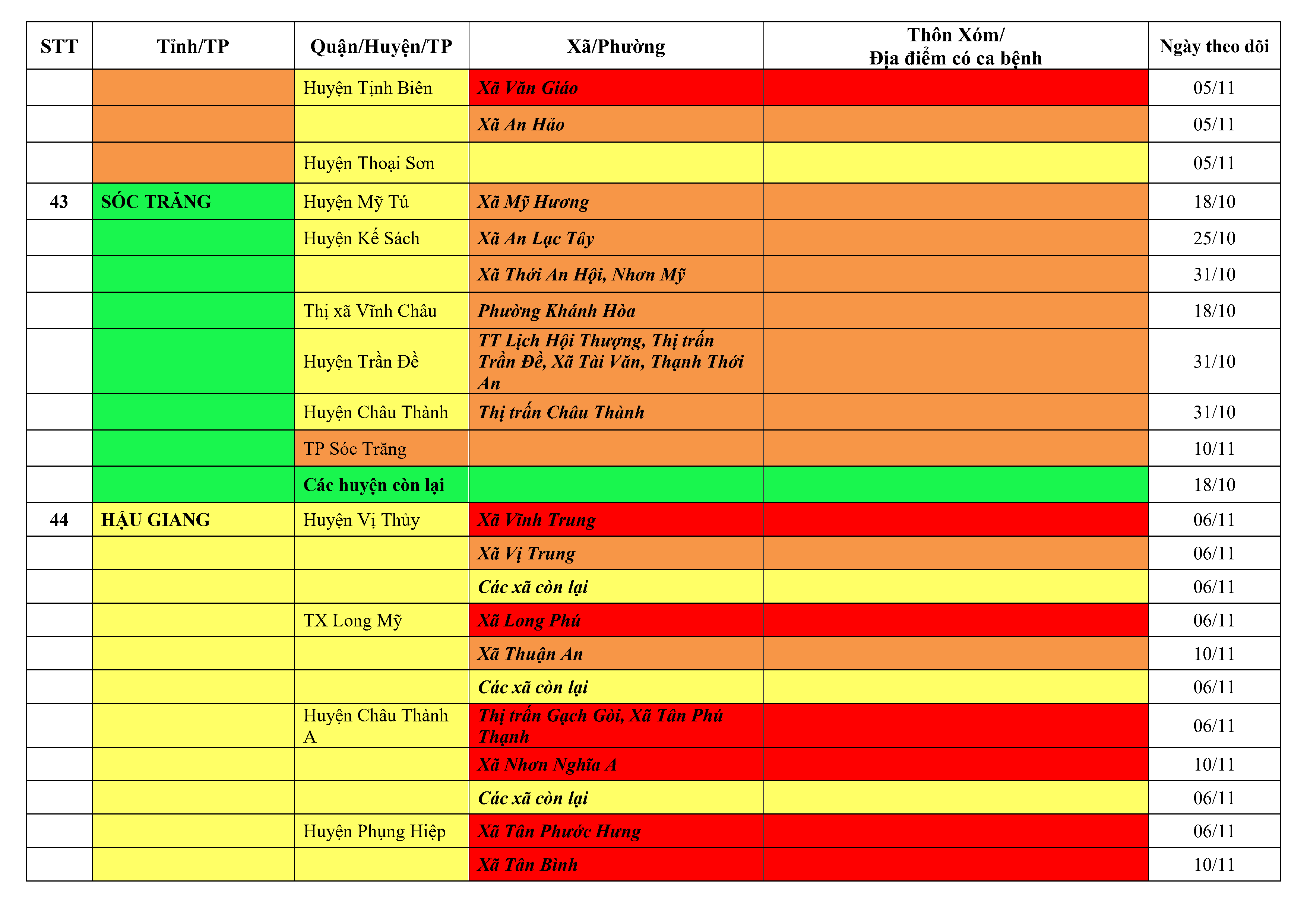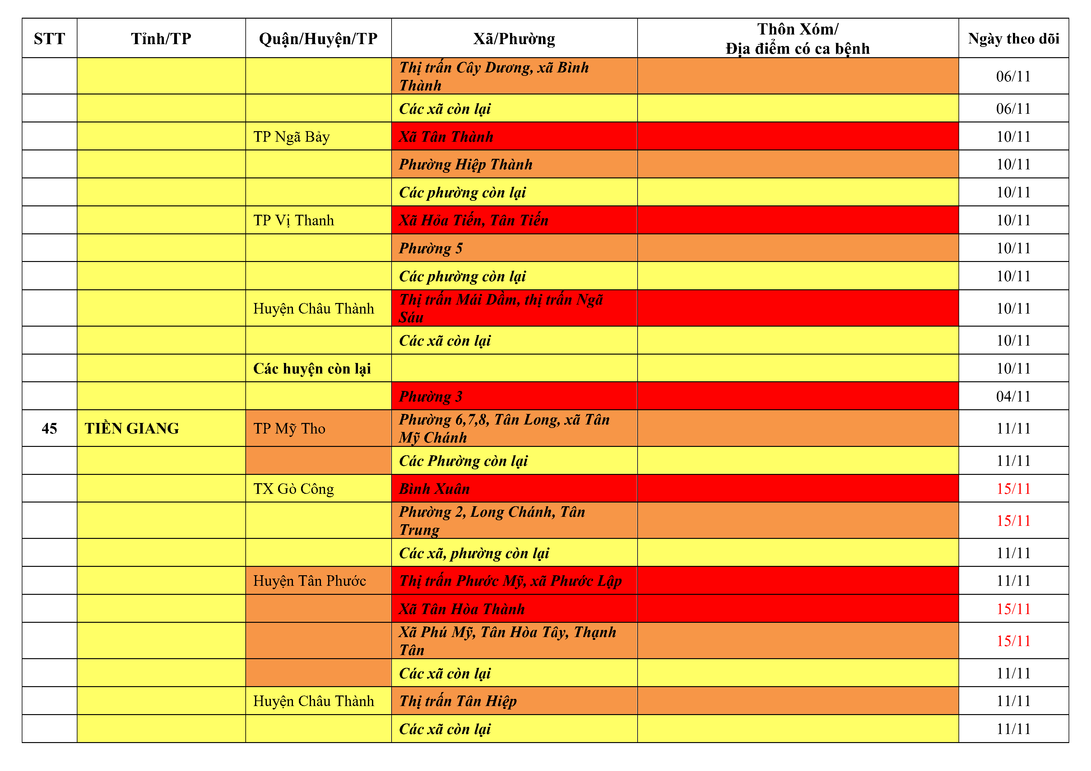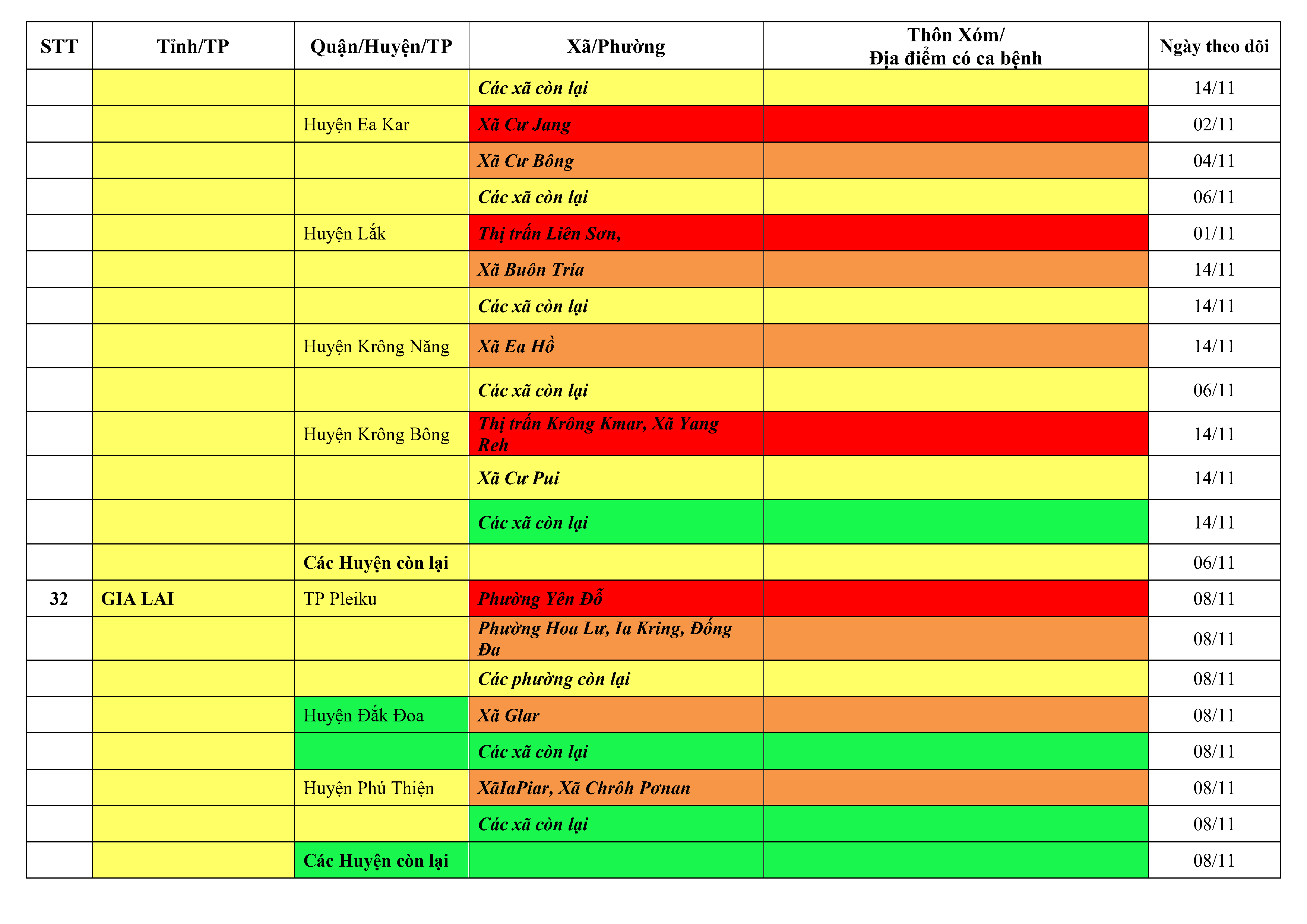 Lưu ý: Các tỉnh, thành phố không có tên trong bảng màu, đi lại bình thường, tuân thủ các biện pháp phòng chống dịch theo chỉ đạo của Bộ Y tế; khai báo y tế, thực hiện nghiêm 5K.